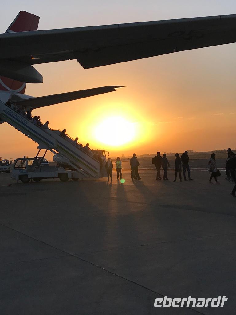 Unsere Reisegruppe war recht klein, fast familiär, eine freundliche Atmosphäre und Gäste voller Fragen und Interesse an einem Land, das uns kulturell sehr fern ist. Zunächst flogen wir von Berlin-Tegel nach Istanbul und später weiter nach Taschkent mit Turkish Airlines. Insgesamt fast 7 Stunden Flug mit Unterbrechung, Wartezeit und zum Schluss - die Uhren drei Stunden vorstellen, wir sind schließlich der Sonne entgegengeflogen.