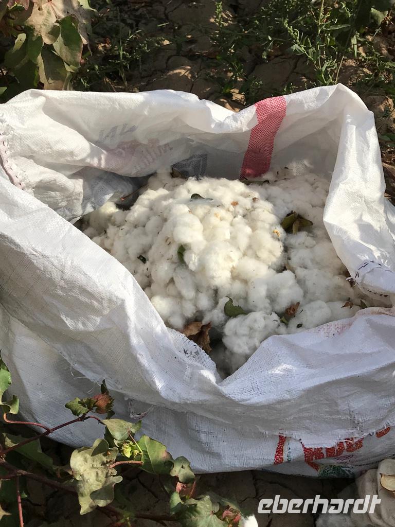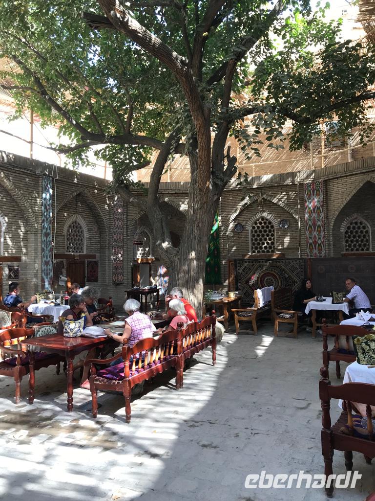 Am nächsten Tag ging es schon weiter. Dabei waren die Stunden ganz früh am kühlen Morgen, wenn das Leben noch nicht erwacht war, so beglückend und wir bedauerten, nicht länger bleiben zu können. Wir fuhren mit dem Bus durch die riesige Kizilkum-Wüste nach Buchara, vorbei an Halbwüsten- und Steppenlandschaften, entlang des Flusses Amudarya, auf autobahnähnlichen Straßen, durch Straßenbaustellen und auf Holperwegen. Zunächst jedoch interessierte uns die Baumwolle, denn unseren Weg säumten endlose Baumwollfelder, auf denen die Frauen ganztägig in gebückter Haltung die Baumwolle pflückten. Bei einem Stopp am Feld begrüßten uns die Frauen recht freundlich und in ihren Gesichtern konnten wir die schwere Arbeit ablesen. In unseren Gesprächen wollten wir alle Fragen los werden zum Anbau, zur Ernte und wie das so in früheren Zeiten war. Am Mittag hielten wir in einem Teehaus am Wegesrand und hatten eine kleine Mahlzeit mit Suppe, Fladenbrot und Schaschlik. Die Spatzen waren unsere Gäste und hatten auch genug zu picken. Am Abend erreichten wir unser Ziel, die Oase Buchara. Das Hotel Lyabi Haus befand sich genau in der Altstadt und wir konnten am Abend schon mal kurz das Treiben in der Fußgängerzone beobachten. Das Hotel war wunderbar, mit einem Innenhof, einem Aiwan und prachtvoll verzierten Wänden und Decken. Das Abendessen hatten wir dann in einer ganz bezaubernden Gaststätte, wo wir auf der Dachterrasse saßen und uns so mitten im Orient fühlten, irgendwie auch angekommen in dieser anderen Welt.