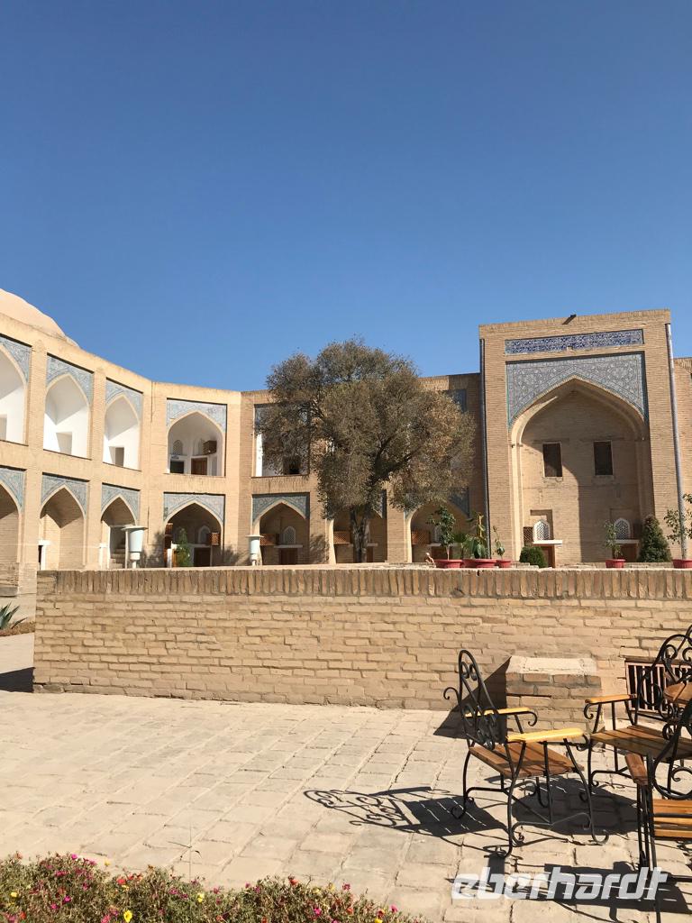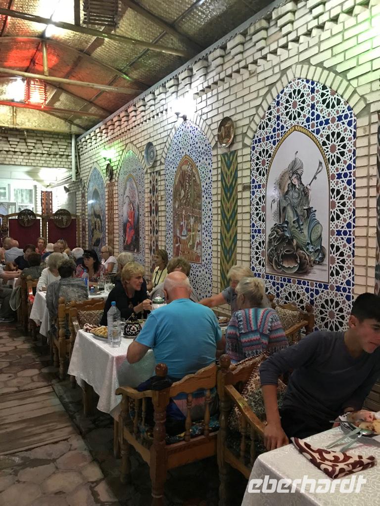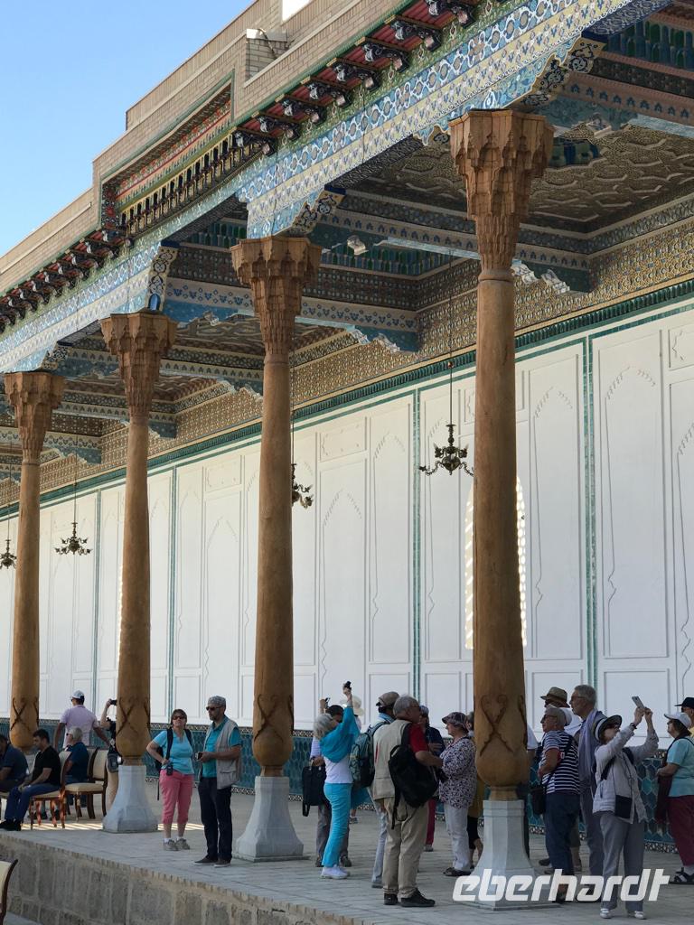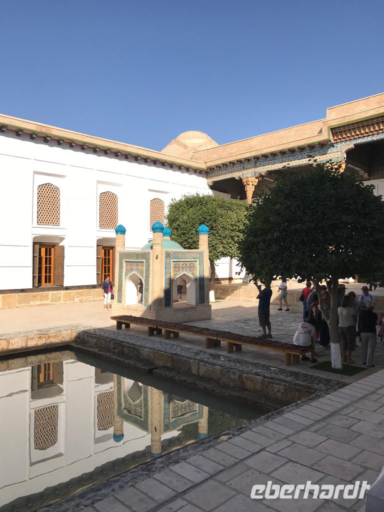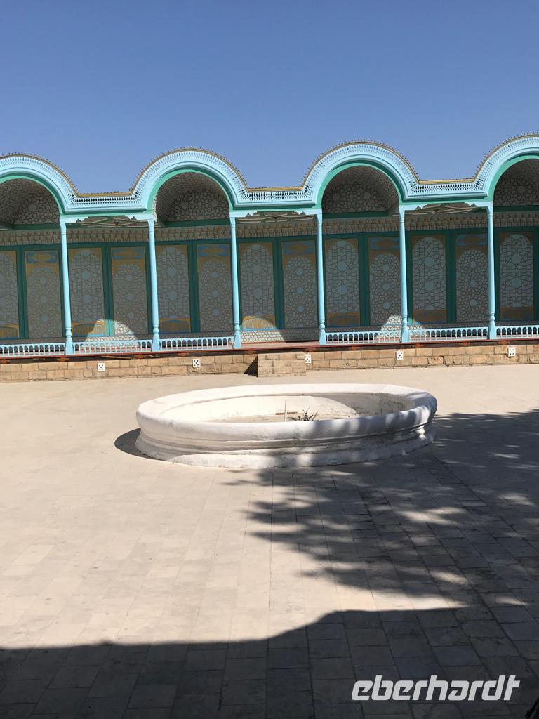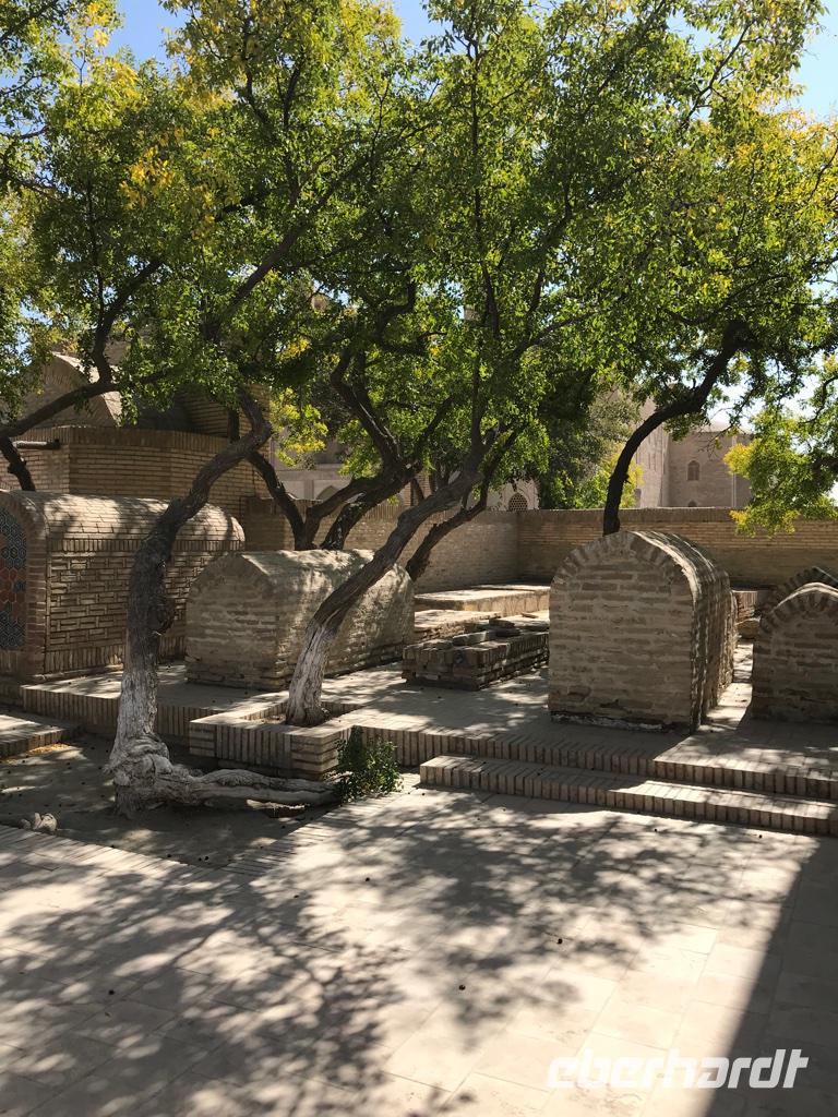 Auf unserem Programm stand eine Besichtigung von Sehenswürdigkeiten außerhalb von Buchara. Zunächst fuhren wir zum Nakschbandi-Mausoleum, östlich der Stadt im Vorort Kagan. Es ist ein Mausoleum für Bucharas Stadtheiligen Bahauddin Nakschband, einen islamischen Führer und Gründer eines Ordens. Man gelang zunächst in einen großen Innenhof der Sommermoschee mit Wasserbecken und umlaufenden Kolonnaden. Es stockte uns irgendwie der Atem, als wir die wunderschönen, sich nicht wiederholenden Deckenverzierungen bewundern konnten. Im Innenhof steht ein sehr alter großer Maulbeerbaum und hier erfuhren wir auch mehr über denn „Fahnenmast" mit dem Rosshaarwimpel. Zum Mausoleum gehören auch eine Wintermoschee und ein kleines Minarett sowie ein wunderschöner Garten. Noch heute kommen viele Pilger an diesen Ort und auch hochrangige Staatsgäste. Wir besuchten anschließend den Sommerpalast Sitorai Mohi Xosa des letzten Emirs, wenige Kilometer außerhalb der Stadt. Hier konnten wir ein wenig vom Leben des Emirs und seiner Flucht in das Exil erfahren und einige Gebäude besichtigen. Im Dorf Sumitan besuchten wir die große Nekropole Tschor Bakr (vier Nachkommen des Propheten, die Ende des 10. Jh. hier ihre letzte Ruhestätte fanden). Die Gräberstätte entwickelte sich zum Wallfahrtsort und immer mehr Gläubige wollten hier in der Nähe der Heiligen beerdigt werden. Das Ensemble besteht aus Chanaka, Moschee und Medrese und vielen Grablegungen. Es ist ein geheimnisvoller Ort, ein Ort zum Innehalten unter den großen Bäumen und wir nutzten den Moment der Stille. Mittags kehrten wir nach Buchara zurück, fanden eine Medrese mit einem wunderschönen Innenhof und konnten zum ersten Mal bei dieser Reise den usbekischen Plov, das Nationalgericht, das bei allen wichtigen Angelegenheiten eine Rolle spielt, probieren. Am Nachmittag besuchten wir noch die Synagoge der Juden im Jüdischen Viertel von Buchara. Und das Abendessen genossen wir in einem Innenhof bei einer usbekischen Großfamilie, 17 Personen aus drei Generationen in einem Haus und alles wird gemeinsam gemacht, kochen, die Mahlzeiten einnehmen, Freude und Leid teilen. Wir waren schon beeindruckt von dieser Lebensform, bei uns schier undenkbar. Ein wunderbarer, erlebnisreicher Tag ging am späten Abend zu Ende.
