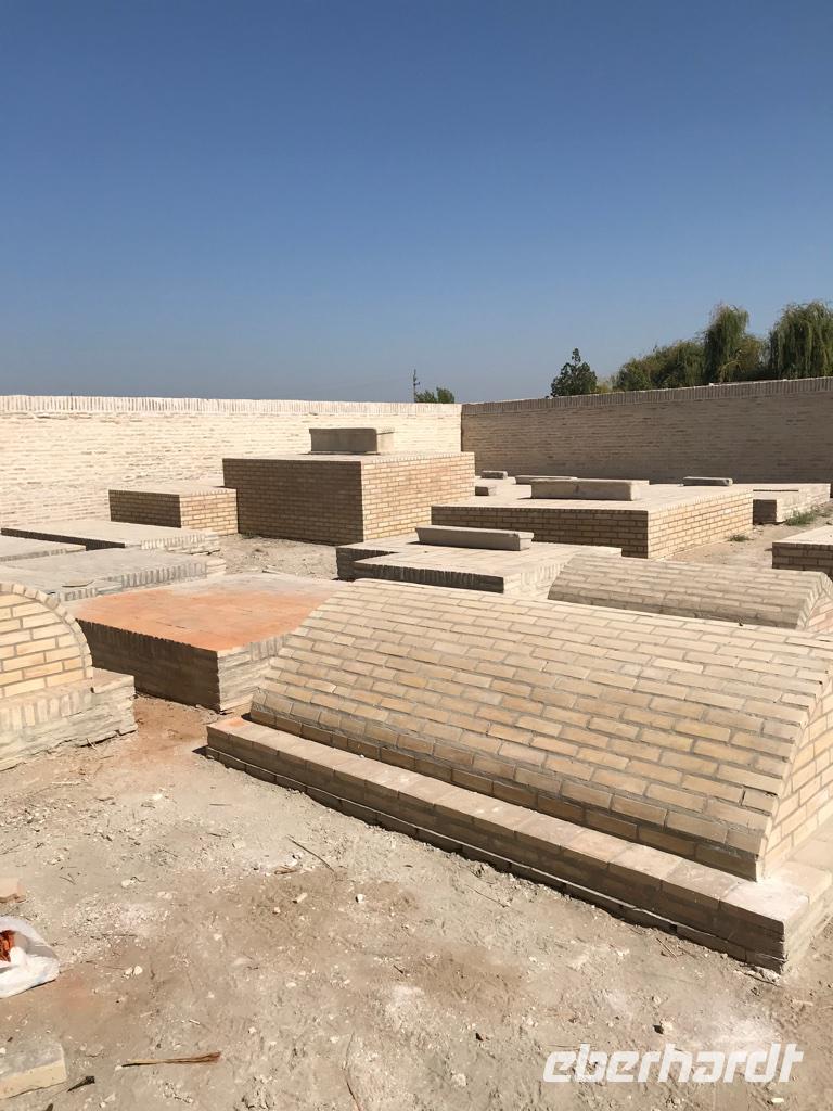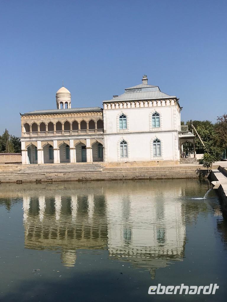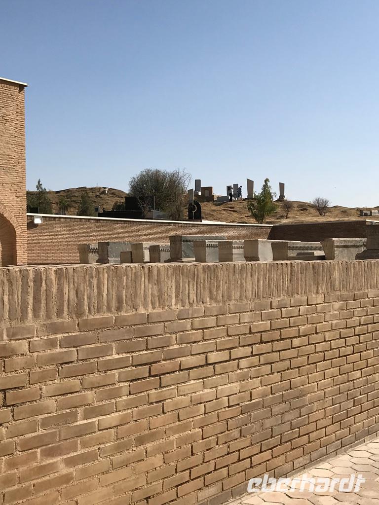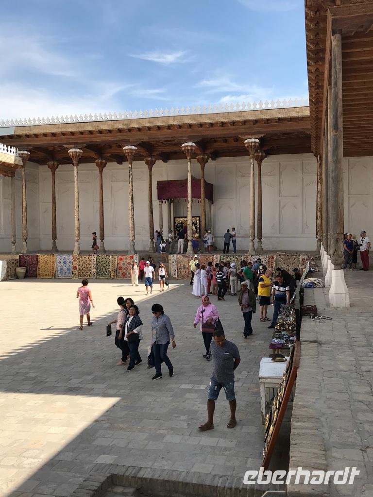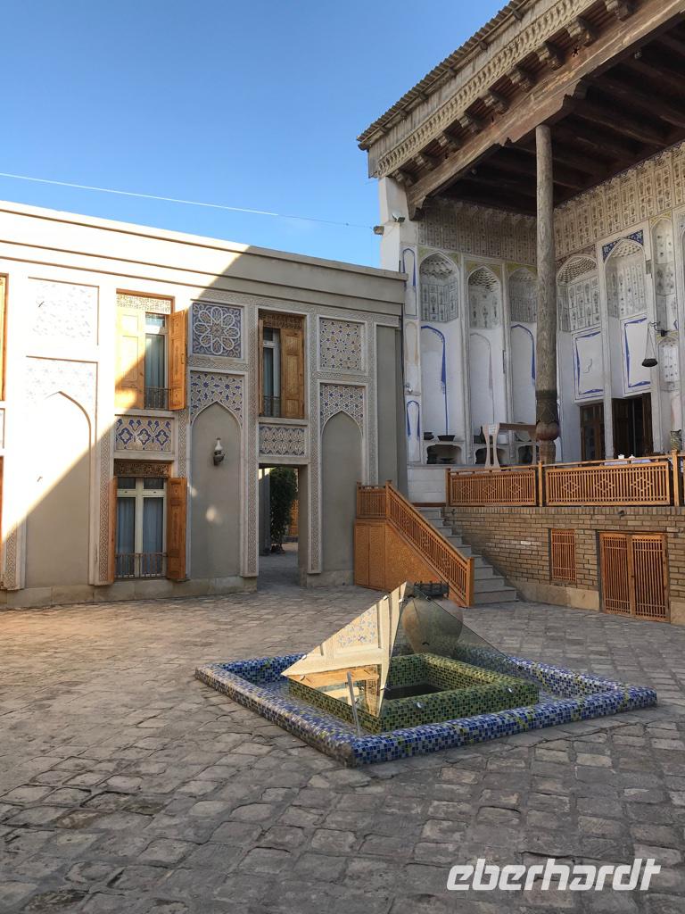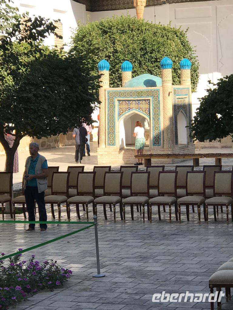 Auf unserem Programm stand eine Besichtigung von Sehenswürdigkeiten außerhalb von Buchara. Zunächst fuhren wir zum Nakschbandi-Mausoleum, östlich der Stadt im Vorort Kagan. Es ist ein Mausoleum für Bucharas Stadtheiligen Bahauddin Nakschband, einen islamischen Führer und Gründer eines Ordens. Man gelang zunächst in einen großen Innenhof der Sommermoschee mit Wasserbecken und umlaufenden Kolonnaden. Es stockte uns irgendwie der Atem, als wir die wunderschönen, sich nicht wiederholenden Deckenverzierungen bewundern konnten. Im Innenhof steht ein sehr alter großer Maulbeerbaum und hier erfuhren wir auch mehr über denn „Fahnenmast" mit dem Rosshaarwimpel. Zum Mausoleum gehören auch eine Wintermoschee und ein kleines Minarett sowie ein wunderschöner Garten. Noch heute kommen viele Pilger an diesen Ort und auch hochrangige Staatsgäste. Wir besuchten anschließend den Sommerpalast Sitorai Mohi Xosa des letzten Emirs, wenige Kilometer außerhalb der Stadt. Hier konnten wir ein wenig vom Leben des Emirs und seiner Flucht in das Exil erfahren und einige Gebäude besichtigen. Im Dorf Sumitan besuchten wir die große Nekropole Tschor Bakr (vier Nachkommen des Propheten, die Ende des 10. Jh. hier ihre letzte Ruhestätte fanden). Die Gräberstätte entwickelte sich zum Wallfahrtsort und immer mehr Gläubige wollten hier in der Nähe der Heiligen beerdigt werden. Das Ensemble besteht aus Chanaka, Moschee und Medrese und vielen Grablegungen. Es ist ein geheimnisvoller Ort, ein Ort zum Innehalten unter den großen Bäumen und wir nutzten den Moment der Stille. Mittags kehrten wir nach Buchara zurück, fanden eine Medrese mit einem wunderschönen Innenhof und konnten zum ersten Mal bei dieser Reise den usbekischen Plov, das Nationalgericht, das bei allen wichtigen Angelegenheiten eine Rolle spielt, probieren. Am Nachmittag besuchten wir noch die Synagoge der Juden im Jüdischen Viertel von Buchara. Und das Abendessen genossen wir in einem Innenhof bei einer usbekischen Großfamilie, 17 Personen aus drei Generationen in einem Haus und alles wird gemeinsam gemacht, kochen, die Mahlzeiten einnehmen, Freude und Leid teilen. Wir waren schon beeindruckt von dieser Lebensform, bei uns schier undenkbar. Ein wunderbarer, erlebnisreicher Tag ging am späten Abend zu Ende.