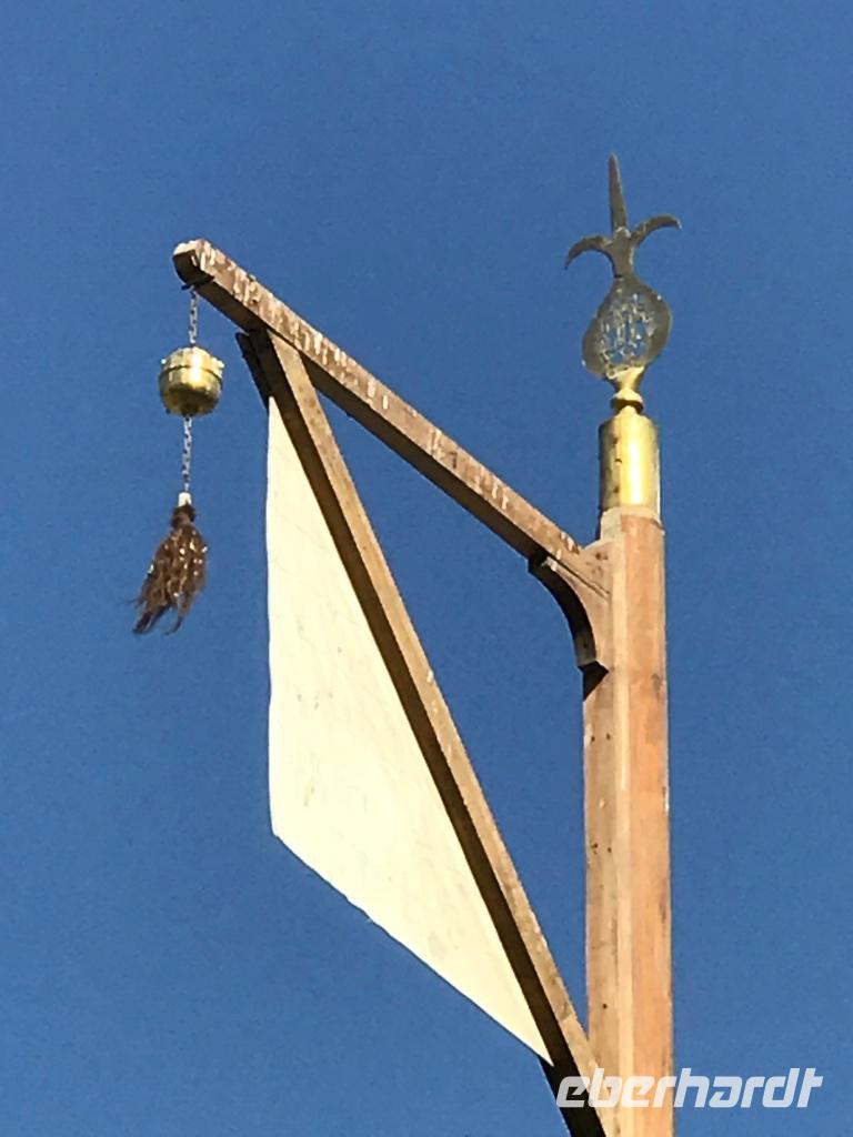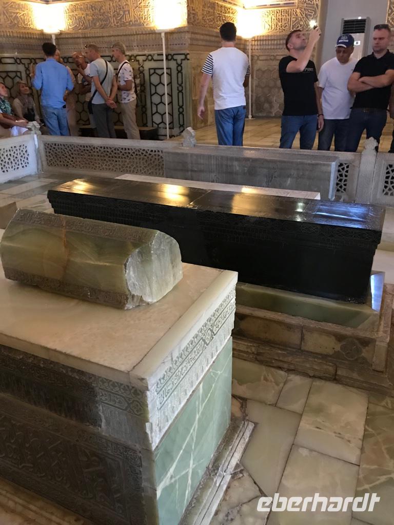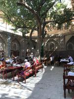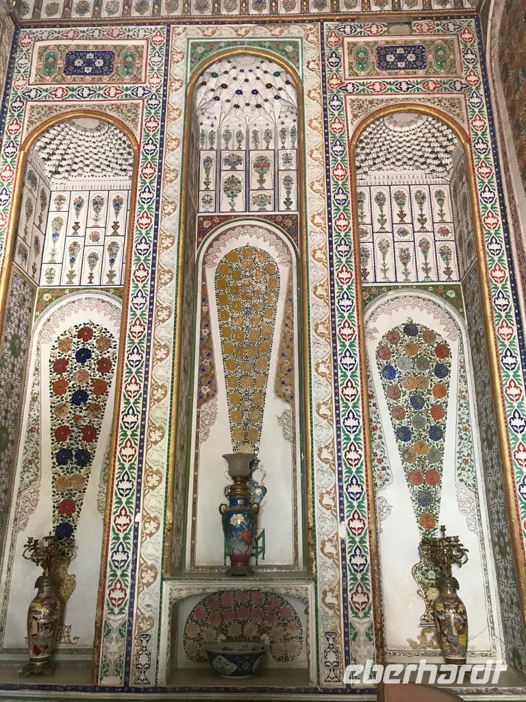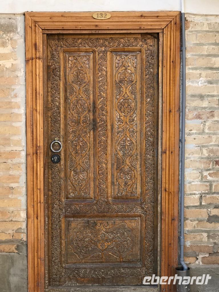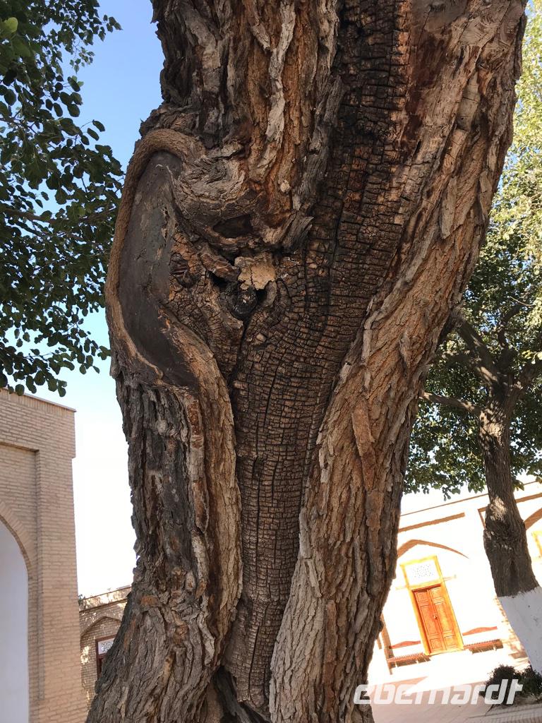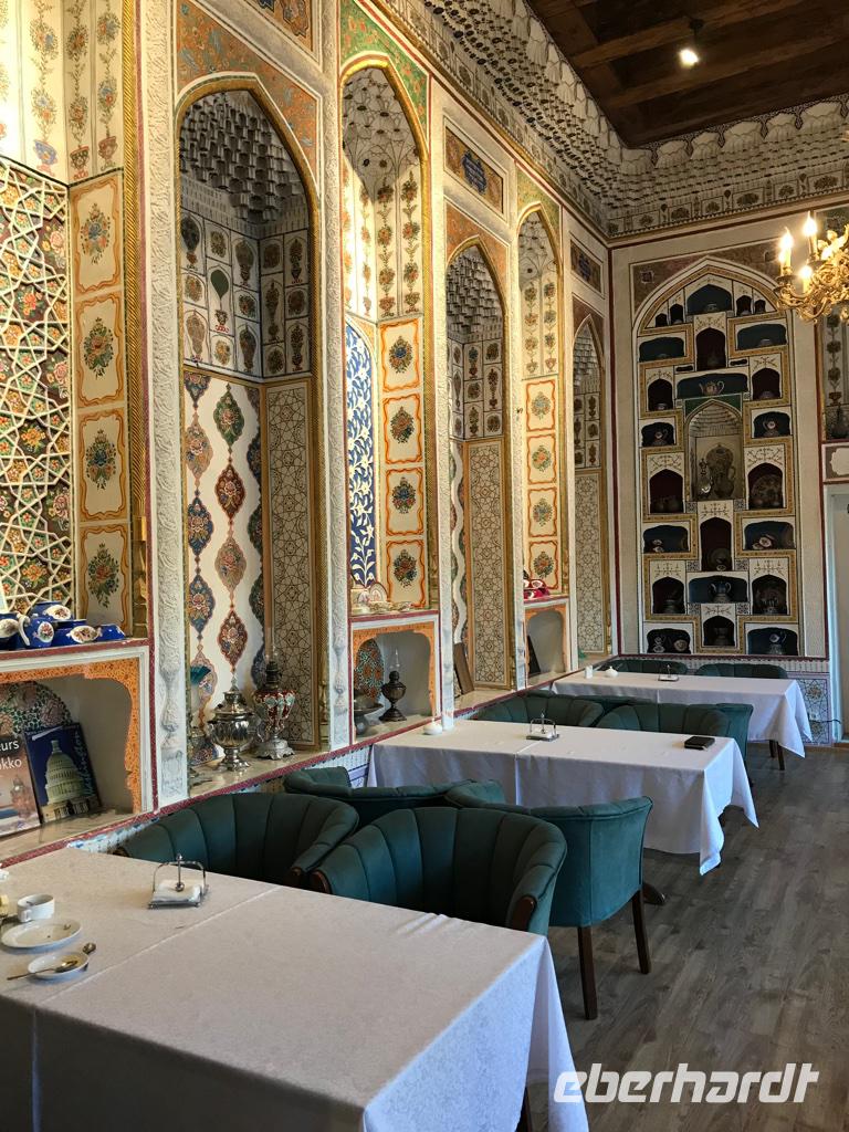 Auf unserem Programm stand eine Besichtigung von Sehenswürdigkeiten außerhalb von Buchara. Zunächst fuhren wir zum Nakschbandi-Mausoleum, östlich der Stadt im Vorort Kagan. Es ist ein Mausoleum für Bucharas Stadtheiligen Bahauddin Nakschband, einen islamischen Führer und Gründer eines Ordens. Man gelang zunächst in einen großen Innenhof der Sommermoschee mit Wasserbecken und umlaufenden Kolonnaden. Es stockte uns irgendwie der Atem, als wir die wunderschönen, sich nicht wiederholenden Deckenverzierungen bewundern konnten. Im Innenhof steht ein sehr alter großer Maulbeerbaum und hier erfuhren wir auch mehr über denn „Fahnenmast" mit dem Rosshaarwimpel. Zum Mausoleum gehören auch eine Wintermoschee und ein kleines Minarett sowie ein wunderschöner Garten. Noch heute kommen viele Pilger an diesen Ort und auch hochrangige Staatsgäste. Wir besuchten anschließend den Sommerpalast Sitorai Mohi Xosa des letzten Emirs, wenige Kilometer außerhalb der Stadt. Hier konnten wir ein wenig vom Leben des Emirs und seiner Flucht in das Exil erfahren und einige Gebäude besichtigen. Im Dorf Sumitan besuchten wir die große Nekropole Tschor Bakr (vier Nachkommen des Propheten, die Ende des 10. Jh. hier ihre letzte Ruhestätte fanden). Die Gräberstätte entwickelte sich zum Wallfahrtsort und immer mehr Gläubige wollten hier in der Nähe der Heiligen beerdigt werden. Das Ensemble besteht aus Chanaka, Moschee und Medrese und vielen Grablegungen. Es ist ein geheimnisvoller Ort, ein Ort zum Innehalten unter den großen Bäumen und wir nutzten den Moment der Stille. Mittags kehrten wir nach Buchara zurück, fanden eine Medrese mit einem wunderschönen Innenhof und konnten zum ersten Mal bei dieser Reise den usbekischen Plov, das Nationalgericht, das bei allen wichtigen Angelegenheiten eine Rolle spielt, probieren. Am Nachmittag besuchten wir noch die Synagoge der Juden im Jüdischen Viertel von Buchara. Und das Abendessen genossen wir in einem Innenhof bei einer usbekischen Großfamilie, 17 Personen aus drei Generationen in einem Haus und alles wird gemeinsam gemacht, kochen, die Mahlzeiten einnehmen, Freude und Leid teilen. Wir waren schon beeindruckt von dieser Lebensform, bei uns schier undenkbar. Ein wunderbarer, erlebnisreicher Tag ging am späten Abend zu Ende.