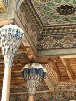 Am nächsten Tag ging unsere Fahrt weiter über Sharisabz, wo wir eigentlich nur kurz anhielten, nach Samarkand. Bevor wir Buchara verließen, hatten wir noch die Medrese Tschor Minor besucht (vier Minarette, die auf die vier Töchter eines Kalifs aus Turkmenistan hinweisen). Sharisabz ist von Samarkand durch steile Berge getrennt und liegt in einer Ebene. Unter den Timuriden war es eine bedeutende Stadt, denn es ist die Geburtsstadt von Amir Timur. Amir Timur ließ später an diesem Ort einen riesigen Palast erbauen. Die Altstadt besteht inzwischen nur noch aus einer großen Parkanlage mit Springbrunnen und Fußgängerpromenaden und den wichtigsten Sehenswürdigkeiten aus der Zeit Amir Timurs - Ak Sarai (das Weiße Schloss), Daras Saodat und Darat Tilowat. Unser Weg führte zunächst zum Darat-Tilawat-Komplex mit der Kok-Gumbas-Moschee und dann zum Komplex Daras Saodat, den Resten der Mausoleen, die Amir Timur für seinen Vater, seinen ältesten Sohn Dschahangir und wohl auch für sich selbst errichten ließ. Von Ak Sarai (der Bau wurde am Ende des 14. Jh. begonnen) sind nur noch Teile des Portals erhalten und man kann sich nur vage den Prachtbau vorstellen und den Größenwahn, der diesen Herrscher erfasst haben muss. Weiter ging unsere Fahrt durch bergisches Gelände, vorbei an lehmhaltigen Böden ohne Grün - eine ärmliche Gegend, wo sicher nur Ziegen und Schafe noch etwas Verwertbares finden. Auf unserer Reise hielten wir an einem Bauernhof. Der männliche Vorstand der Großfamilie (11 Kinder, 41 Enkel) begrüßte uns ganz freundlich und lud zum Tee. Wir durften auch die Gebäude besichtigen, sahen den jungen Frauen an den Webstühlen zu und erfuhren aus dem Leben dieser Menschen. Und die besondere Erkenntnis war dann der Kinderwiege gewidmet, die uns die Hausfrau im Detail erklärte. Schon bald führte uns der Weg weiter nach Samarkand. Für die Übernachtung stand das Hotel Samarkand City bereit. Wir waren müde von der langen Fahrt und hatten dann doch noch ein recht schönes Abendessen im Restaurant Platan.