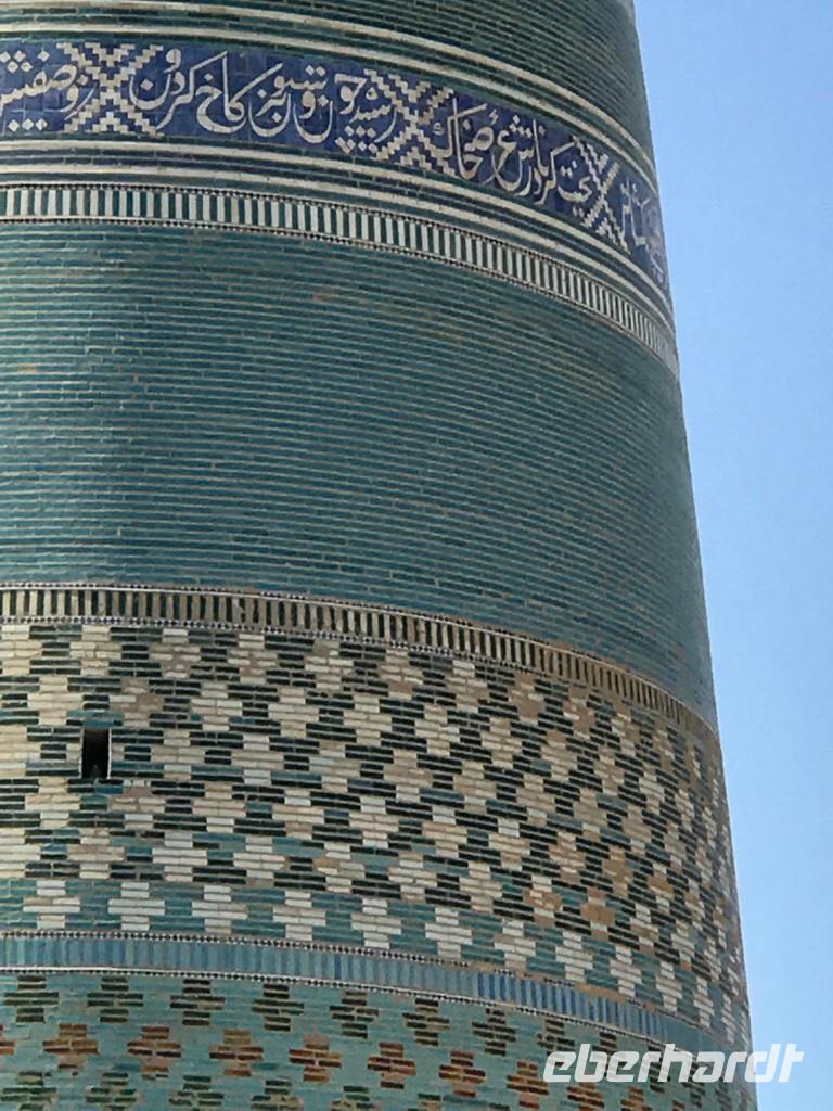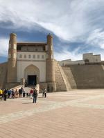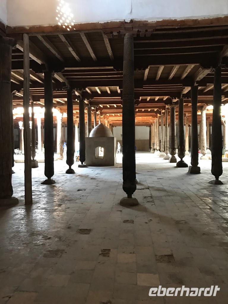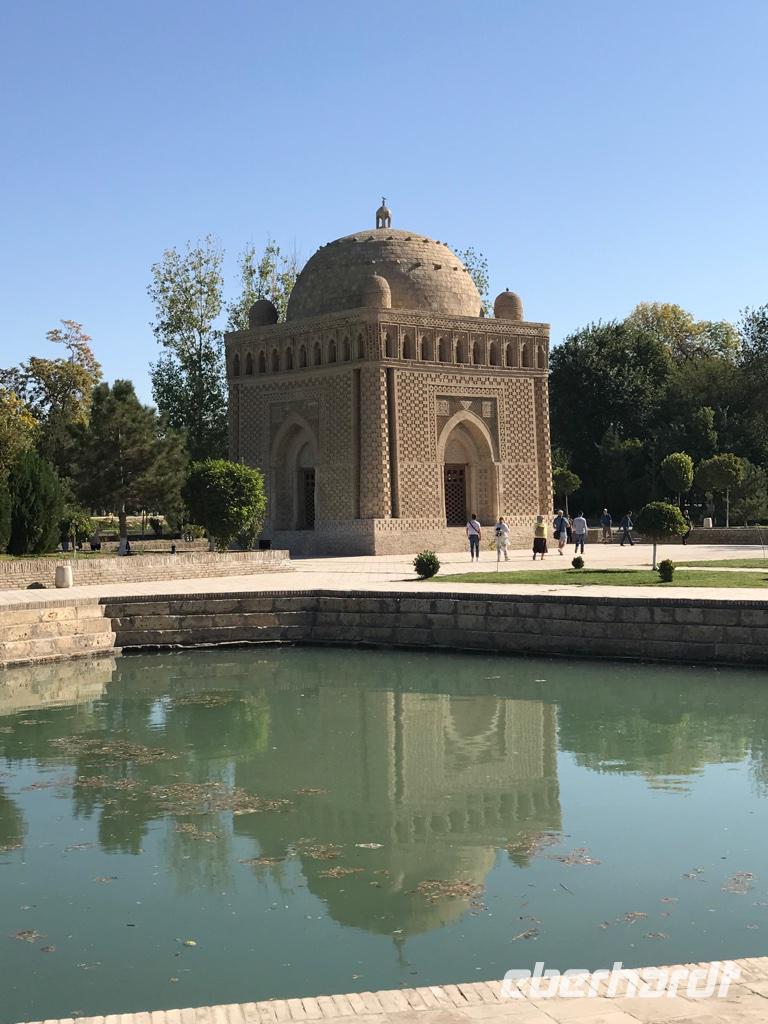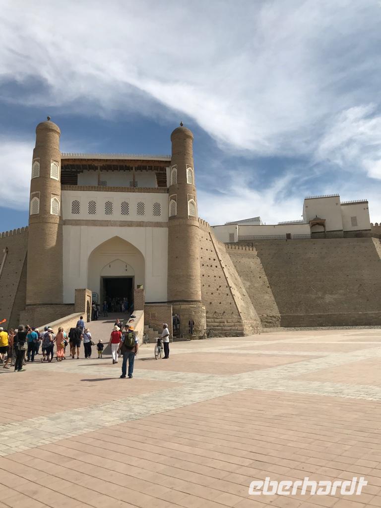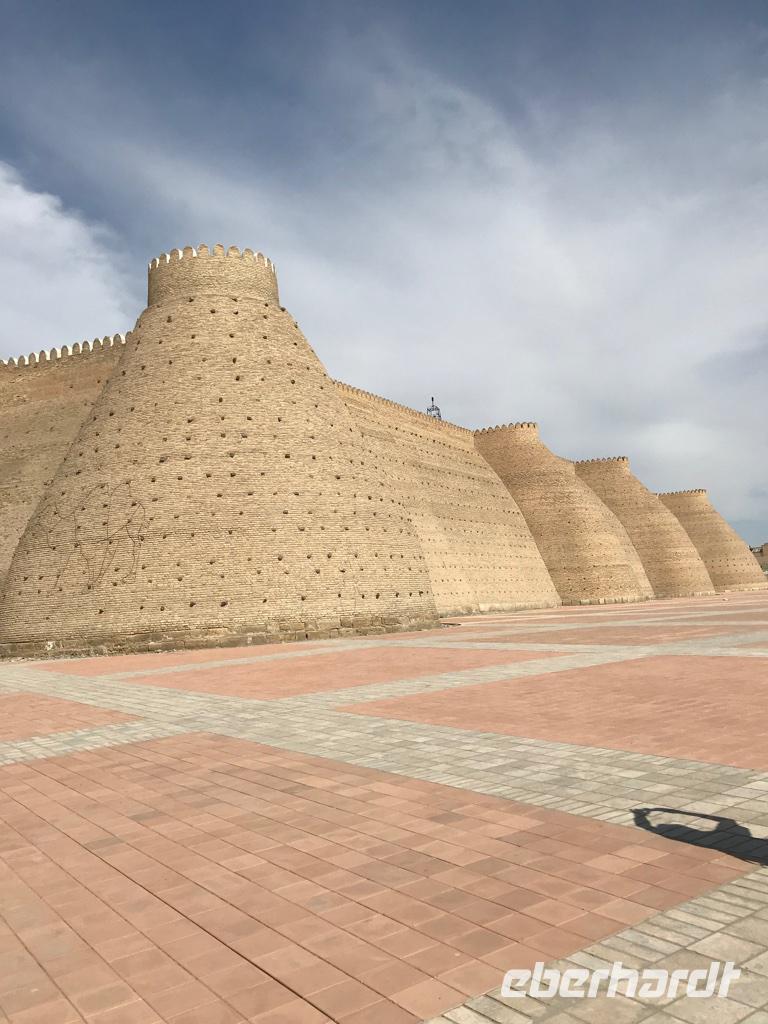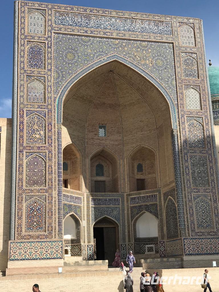 Ein neuer Tag, eine neue wundervolle orientalische Stadt, Buchara stand auf dem Programm. Wir begannen die Besichtigungen mit dem Samaniden-Mausoleum. Die Samaniden war die erste nichtarabische Herrscherdynastie nach der Eroberung durch die Araber im 1. Jh. Das Mausoleum ist eines der wenigen noch erhalten Baudenkmäler, die Dschingis Khan und seine Horde nicht verwüsteten. Wir staunten über den außergewöhnlich schönen Ziegelbau, wo die Ziegel untereinander versetzt sind und sich dadurch wunderschöne Muster ergeben. Nicht weit vom Samaniden-Mausoleum befindet sich die Hiobsquelle (Chashma Ayub), wo der biblische Hiob auf Gottes Geheiß seinen Stab in die Erde gestoßen haben soll, worauf Wasser sprudelte. In einem kleinen Museum wird über Wasserquellen und Verteilung des Wassers in der Wüste berichtet. Und dann wurde uns ganz klar, wie wichtig das Süßwasser für die Menschen hier und wohl auch in unserer Zukunft sein kann. Von der Hiobsquelle gingen wir weiter über den Basar mit all den Köstlichkeiten zur Bolo-Chaus-Moschee, die aus der Moschee, dem Minarett und einem Wasserbecken besteht. Ein echter Blickfang ist der hohe und reich verzierte Aiwan der Sommermoschee mit den Holzschnitzarbeiten, den Holzsäulen und der reichen Malerei. Anschließend führte uns der Weg hinauf zur Zitadelle (Ark) auf einem künstlich aufgeschütteten Hügel, vor dem sich der Registan-Platz befindet. Die Zitadelle war bis in das 20. Jh. Regierungssitz des Herrschers von Buchara, so auch des letzte Emirs, bevor Usbekistan zur Sowjetunion kam. Die Zitadelle stellt ein mächtiges Bauwerk dar. Wir besichtigten im Innenhof die Freitagsmoschee, den Hof und die Gebäude des Premierministers, den Thronhof, die Stallungen und die Museen für Geschichte der Oase und des Khanats. Am Nachmittag dann widmeten wir uns dem Kalon-Komplex und sahen das bekannteste Wahrzeichen von Buchara, das Kalon-Minarett. Mit ca. 46 m ist es das höchste Minarett Zentralasiens, fertig gestellt im Jahr 1127. Selbst Dschingis Kahn hat es nicht zerstört. Zum Minarett gehört die Kalon-Moschee aus dem 16. Jh., es ist eine Vier-Aiwan-Anlage mit großem Innenhof und umlaufender überkuppelter Galerie. Es gehört auch die Mir-Arab-Medrese zum Ensemble, die noch heute eine Lehranstalt ist. Auf dem Rückweg zu unserem Hotel gingen wir durch die vielen Handelshöfe der Stadt - den Schmuckmarkt, den Basar der Geldwechsler, den Basar der Mützenverkäufer und der Juweliere. Hier werden Souvenirs verkauft, aber wir fühlten uns auch wie die ehemaligen Händler an der Seidenstraße und das übliche Handeln ging schon bald von ganz allein, besonders bei den Keramikverkäufern mit den wunderschönen farbigen Teeschalen. Zum Abendessen waren wir dann in der Nadir-Divan-Beg-Medrese, einer ehemaligen Karawanserei. Hier gab es Souvenirgeschäfte und eine Modenschau mit viel Folklore.