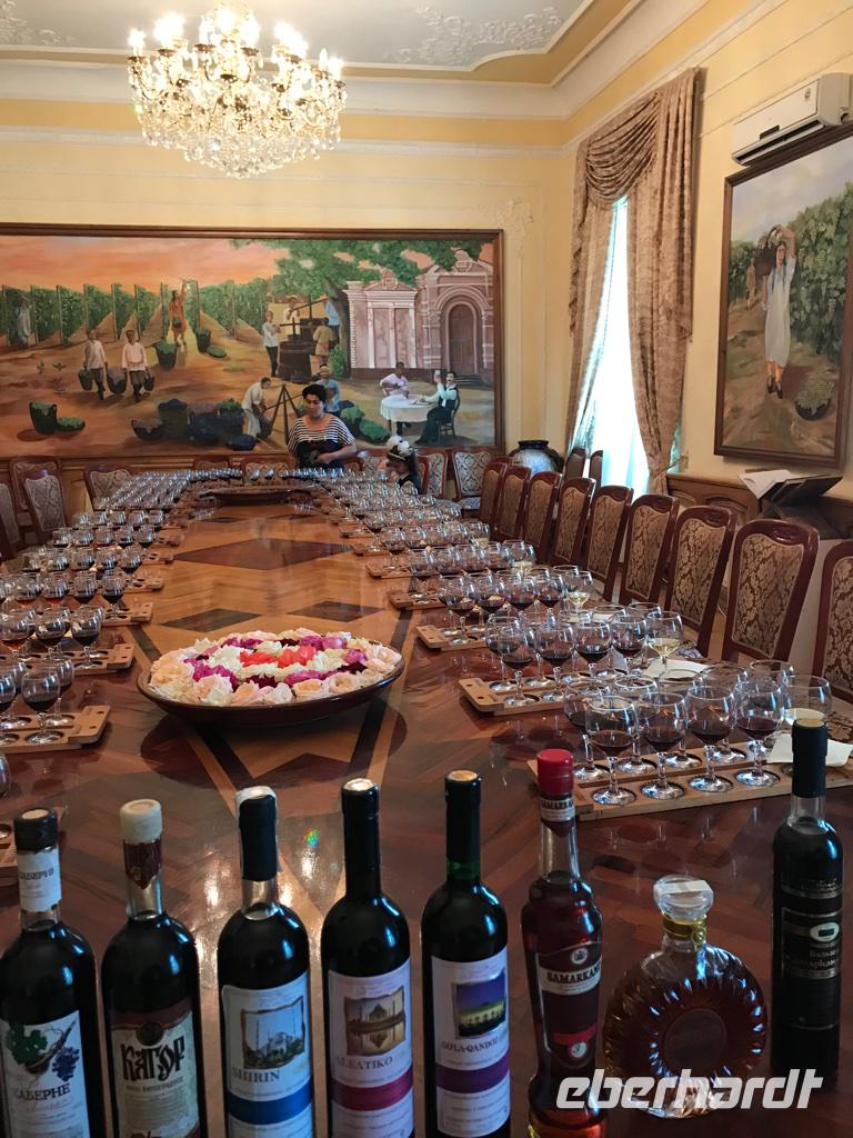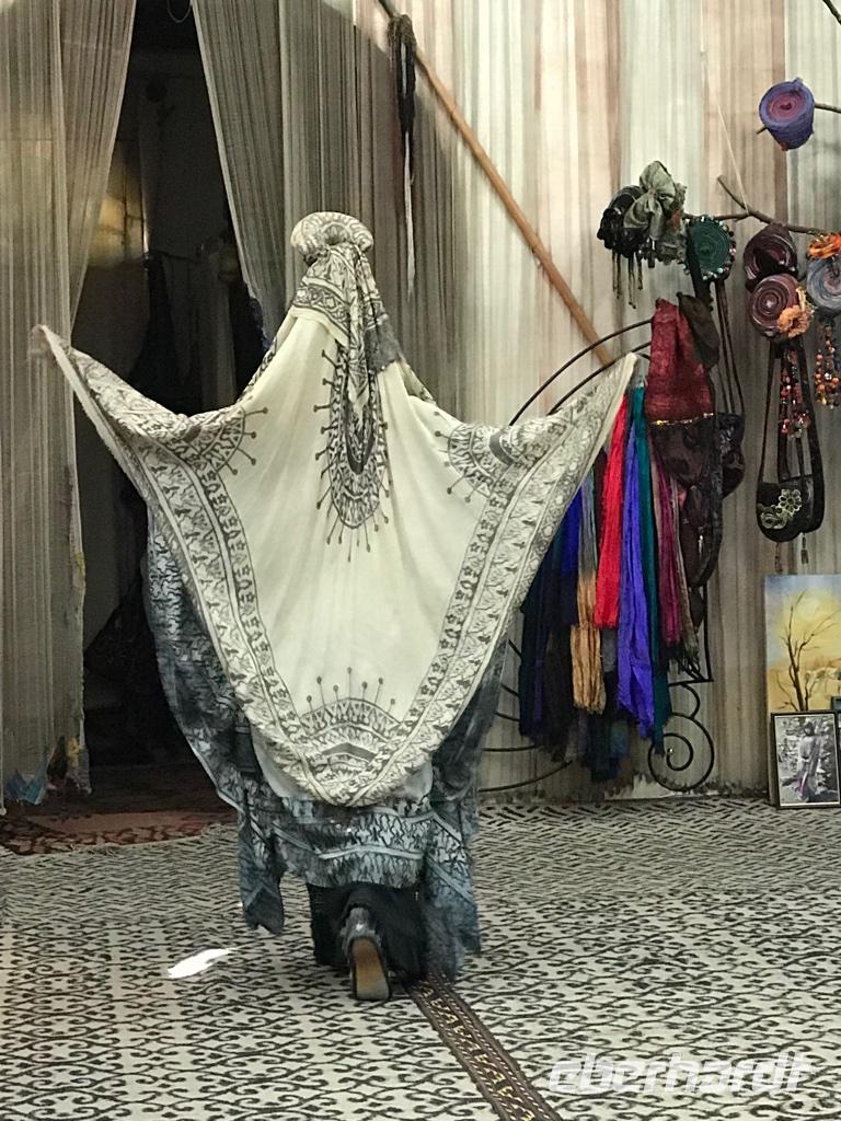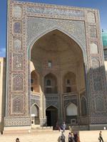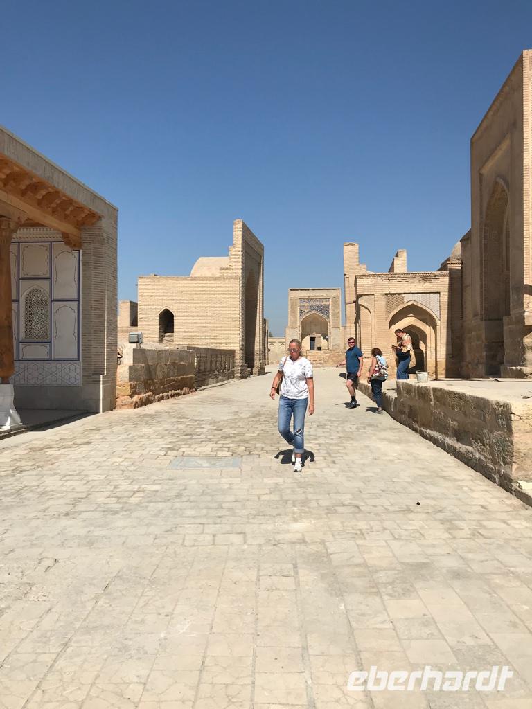 Es stand das Highlight auf dem Programm, Besuch des Registan-Platzes. Aber vorher besichtigten wir das Gur-Emir-Mausoleum, auch bezeichnet als Amir-Timur-Mausoleum. Die Anlage ist beeindruckend. Im Innenraum sind die Gräber von Amir Timur, von seinem geistigen Führer, Scheich Baraka, und weiterer männlicher Nachkommen aus der Familie von Amir Timur. Besonders gefiel uns die prächtige Kuppel des Gebäudes. Sie gleicht dem Himmelsgewölbe mit leuchtend blauen Fliesen und sie ist doppelschalig. Dann der Registan-Platz, der Sandige Platz, wo man einfach gewesen sein muss. Wie auf einem Tablett lag er von uns mit seinen drei Medresen - Ulugbek-Medrese, Schirdor-Medrese, Tillya-Kari-Medrese. Alle drei unterschiedlich alt, alle drei prächtig verziert. Wir konnten uns für keine entscheiden und besichtigten sie alle drei. Die Minarette und auch die Wände stehen etwas schief, es ist keine Täuschung, sondern der sandige Untergrund des Platzes, der den festen Stand verhindert. Lange blieben wir an diesem Ort wegen seiner Schönheit, es war schwer sich zu trennen. Gleich hinter dem Platz liegt die Fußgängerpassage Taschkent Straße, die wir weitergingen zum Basar und zur Bibi-Chanum-Moschee. Es sollte die prächtigste Freitagsmoschee werden, die sich Amir Timur nach seinem Indienfeldzeug gewünscht hatte und die er seiner Hauptfrau Saray Mulk Chanum, einer direkten Nachfahrin von Dschingis Khan widmete. Sie hatte ihm die Verbindung zum mongolischen Adel ermöglicht. Auch dieses Bauprojekt war überdimensioniert und tatsächlich wurden die Gebäude mehrfach restauriert. Am Nachmittag dann fuhren wir in das Atelier von Valentina Romanenko. Sie ist weltbekannt und stellt aus Seide und Baumwolle Bekleidung her, die mit Naturfarben handbemalt ist. In einer kleinen Modenschau wurde uns die usbekische Folklore in moderner Form nahegebracht. Wir fühlten und wie bei den Tänzerinnen im Harem. Es war wunderschön - welche Farbenpracht. Anschließend ging es zu einer Weinkellerei, wo wir einer Verkostung von Süßweinen, Brandy und Kräuterlikör erlebten. Na wenn da nicht die Wärme des Abends zuschlägt. Aber nein, es ging alles gut. Das Abendessen fand dann in einem Restaurant mit Tanzmusik statt. Für uns war es erneut ein Aha-Erlebnis, wie die Großfamilien ihren Abend feiern. Da waren die Babys, Kleinkinder und Großeltern dabei, da tanzten die Frauen (die Männer essen lieber) und die Lebenslust steckte an. Da wären wir gern noch geblieben.
