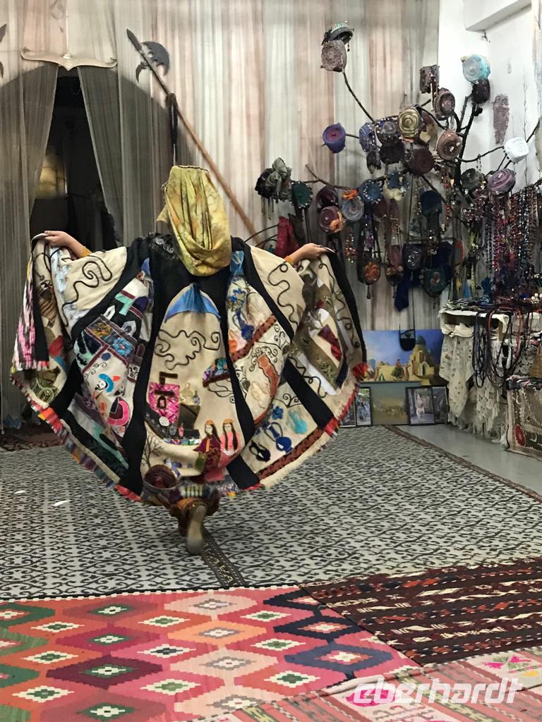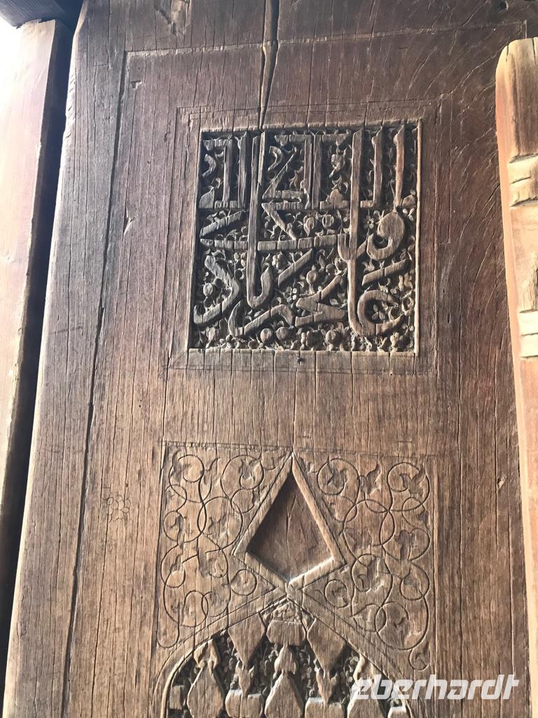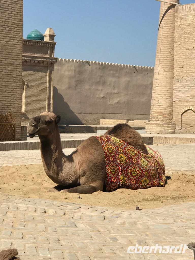 Am nächsten Tag mussten wir erneut früh aus dem Bett. Das Flugzeug nach Urgentsch mit Uzbekistan Airways wartete nicht. Wir kamen schon am frühen Vormittag in Chiwa an und fuhren zum Hotel Malika Khiva, einem kleinen Hotel mitten in der Altstadt, auch Itschan Kala genannt, landestypisch eingerichtet und mit einem recht schönen Innenhof. Bis zum Mittag hatten wir Freizeit und fanden unter schattigen Bäumen direkt beim Hotel ein Plätzchen, um alle in gemütlicher Runde, die Ruhe und das orientalische Ambiente zu genießen. Am Nachmittag dann der Stadtrundgang. Ein paar Meter und wir tauchten ein in eine andere Welt. Die ummauerte Altstadt ist in den ersten Jahrhunderten nach Christi entstanden, genau weiß man es nicht. Die Stadt liegt im Schwemmland des Flusses Amudarya, mitten in der Wüste und mit einem Brunnen, der Süßwasser spendet, was sicherlich die Menschen zur Ansiedlung bewegte. Chiwa war Hauptstadt des Khanats Choresmien. Wir hatten ein Freilichtmuseum vor uns und es fiel schwer, die Menge an Architekturschönheiten vergangener Zeiten in ihrer Gesamtheit zu erfassen. Hier eine kurze Zusammenfassung: Unser Rundgang begann auf der Hauptstraße vom Westtor zum Osttor mit den vielen Händlern, wo wir uns auch an den warmen Pelz- und Schaffellmützen erfreuten. Bei über 30°C schon recht schwierig zu probieren. Dann gingen wir vorbei an den Kamelen zur Mohammed-Rahim-Khan-Medrese, wo wir uns die Traditionen der Seiltänzer aus der Familie Darbozchi ansehen konnten. Das jüngste Familienmitglied war auch dabei. Anschließend gingen wir zum Westtor der Stadtmauer der Altstadt Itschan Kala, die fast vollständig erhalten ist und ein gewaltiges Bauwerk darstellt. Dyior erzählte uns von der Seidenstraße und wir staunten über die Menschen, die sich auf diesen Handelswegen durch riesige Landschaften bewegt hatten und vielen Gefahren ausgesetzt waren. Unmittelbar am Westtor liegt die Amin-Khan-Medrese (erbaut Mitte des 19.Jh.) mit dem kurzen Minarett, Kalta Minor. Im Innenhof der Medrese ist heute ein Hotel untergebracht. Wir nutzten die Möglichkeit für eine kurze Pause und um die Schönheit und Ruhe dieses Ortes zu genießen. Dann gingen wir zur anderen Seite der Straße, um die Zitadelle Kunja Ark zu besichtigen. Zurückgehend auf Reste aus dem 5. Jh. wurde dieses Bauwerk im 19. Jh. errichtet und diente als Wohnsitz der Khane von Chiwa. Vom Eingang aus kommt man über einen großen Hof mit Freilichtbühne zum Thronsaal. Dieser Thronsaal bestand aus einem kleinen Innenhof, einer runden Plattform, auf der im Winter die Jurte stand, und einem Aiwan, wo der Khan Audienz hielt. Bei all diesen Bauten beeindruckten uns stets die so kunstvollen Dekorationen an den Gebäuden und Minaretten, reich verziert mit Majolikafliesen in den Farben Türkis, Blau und Weiß sowie die Holzsäulen, reich verziert mit Schnitzereien und die Bemalungen an den Wänden und Decken. Welch eine Pracht. Von der Zitadelle führt uns der Weg zur Dschuma-Moschee mit den 213 geschnitzten Säulen, die teilweise auf das 10. Jh. zurückgehen. Licht gelangt nur durch zwei Öffnungen in der Decke. Schließlich besichtigten wir noch den Tasch-Hauli-Palast aus dem 19. Jh. Hier gab es einen Repräsentationshof, den Gerichtshof und den Harem zu besichtigen. Mit Fragen löcherten wir Diyor, um aus dem Leben des Khans, seines Gefolges und seines Harems noch mehr zu erfahren. Den Abschluss unseres Rundgangs bildete das Pachlawan-Machmud-Mausoleum, welches das Grab von Chiwas Schutzheiligem Pachlawan Machmud (1247-1326) beherbergt, der ein ungemein starker Ringkämpfer war. Den Tag, der so voller Eindrücke gebracht hatte, beendeten wir im orientalischen Restaurant Zerafshan unter freiem Himmel. Irgendwie waren wir verzaubert und in unserer Phantasie waren da die endlosen Karawanen auf der Seidenstraße, die jahrelang unterwegs und so voller Vorfreude auf eine kurze Erholung waren, wenn sie die Minarette von Chiwa in der Wüste sahen, die nicht nur religiösen Zwecken dienten, sondern vor allem auch Leuchttürme waren. Waren werden in den Straßen noch heute angeboten und es fiel schwer, eine kleine Auswahl als Mitbringsel zu finden, zu verlockend sind die Kunstwerke, die Farben und Miniaturen.
