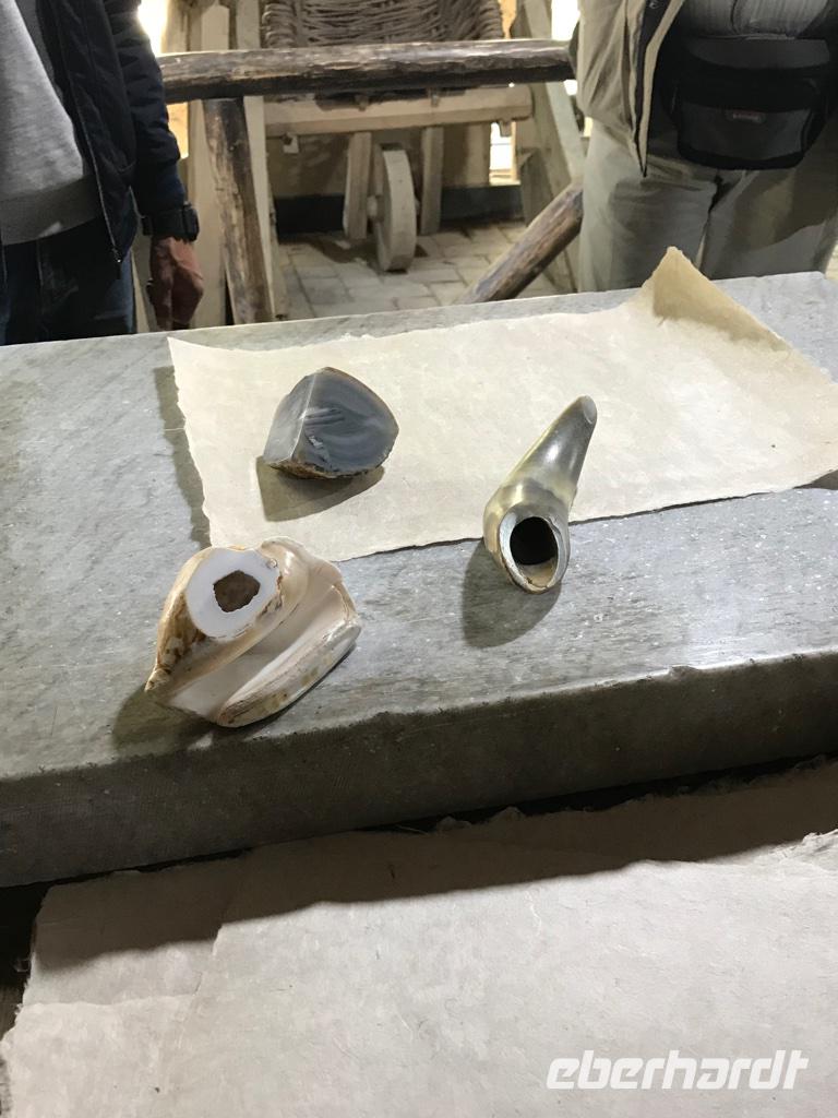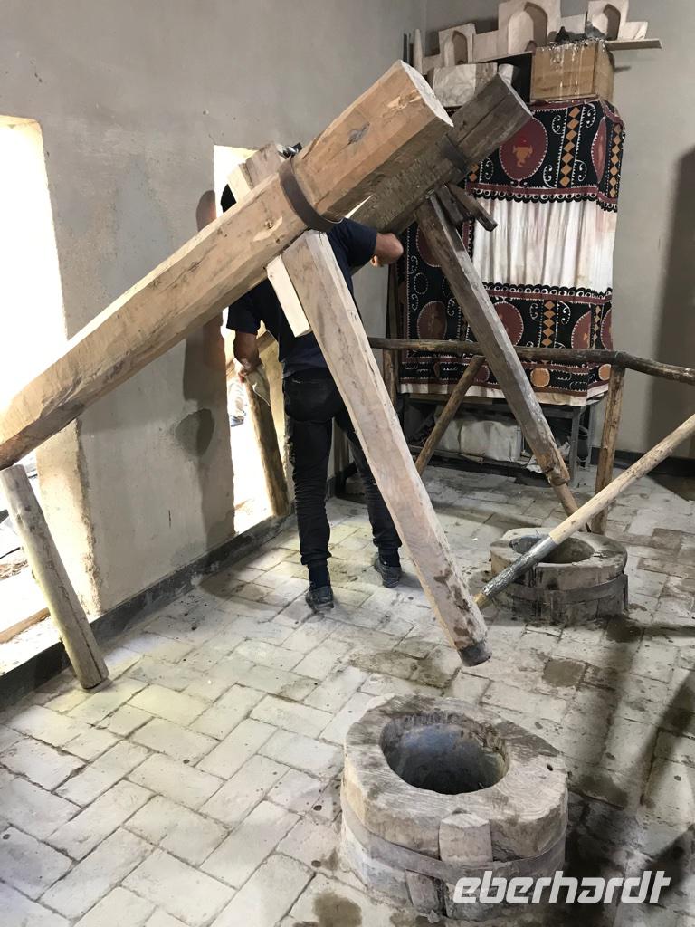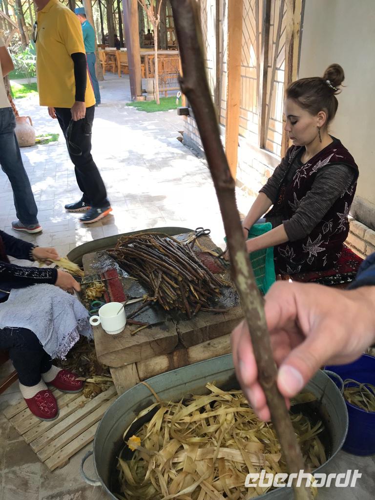 Es war unser letzter Tag in diesem schönen, so farbenfreudigen Land angebrochen. Wir fuhren hinaus aus der Stadt Samarkand. Zunächst führte uns der Weg zu einer neu erbauten Moschee, wo selbst am Sonnabend eifrig gebaut wird. Unsere kurze Besichtigung führte teilweise über die Baustelle, aber dennoch - man gewinnt einen Eindruck von einer modernen Moschee, die doch in ihrer Schönheit die alten Moscheen nicht erreichen kann. Weiter ging es zur kleinen Fabrik für Seidenpapierherstellung, Koghos Fabrika. Hier konnten wir den ganzen Prozess der Papierherstellung aus der Rinde des Maulbeerbaums nachverfolgen, alles mühevolle Handarbeit. Der nächste Höhepunkt unserer Besichtigungstour war der Hügel am Stadtrand, auf dem ursprünglich das Observatorium von Mirza Ulugbek stand. Leider sind nur noch die unterirdischen Reste des Sextanten mit einem ursprünglichen Durchmesser von etwa 40 m vorhanden, die uns in Erstaunen über die Technik jener Zeit versetzen. Hier gibt es auch ein kleines Museum, in dem uns eine Menge Informationen über Amir Timur und seinen Enkel, den Astronomen Ulugbek, und die astronomischen Apparate und Berechnungen jener Zeit nahegebracht wurden. Vom Hügel aus hat man eine wunderbare Aussicht auf die Umgebung und in der Ferne sahen wir die Sehenswürdigkeiten in Samarkand, die wir am Vortag besichtigt haben. An diesen Ort kommen auch viele Hochzeitspaare. Heiraten ist für die Usbeken wohl ein überaus wichtiges Ereignis von hohem Stellenwert. Irgendwie kamen wir wieder auf das Thema Plov zu sprechen und Diyor meint, dass man unbedingt Samarkander Plov probiert haben muss. Also nahmen wir das Mittagessen bei einem richtigen Plov-Koch ein, gerade noch rechtzeitig, denn 13 Uhr wird das kleine Restaurant wieder geschlossen. Plov gibt es nur mittags und er hat wunderbar geschmeckt. Ein besonderes Erlebnis, wir wollen es wohl auch zu Hause probieren.