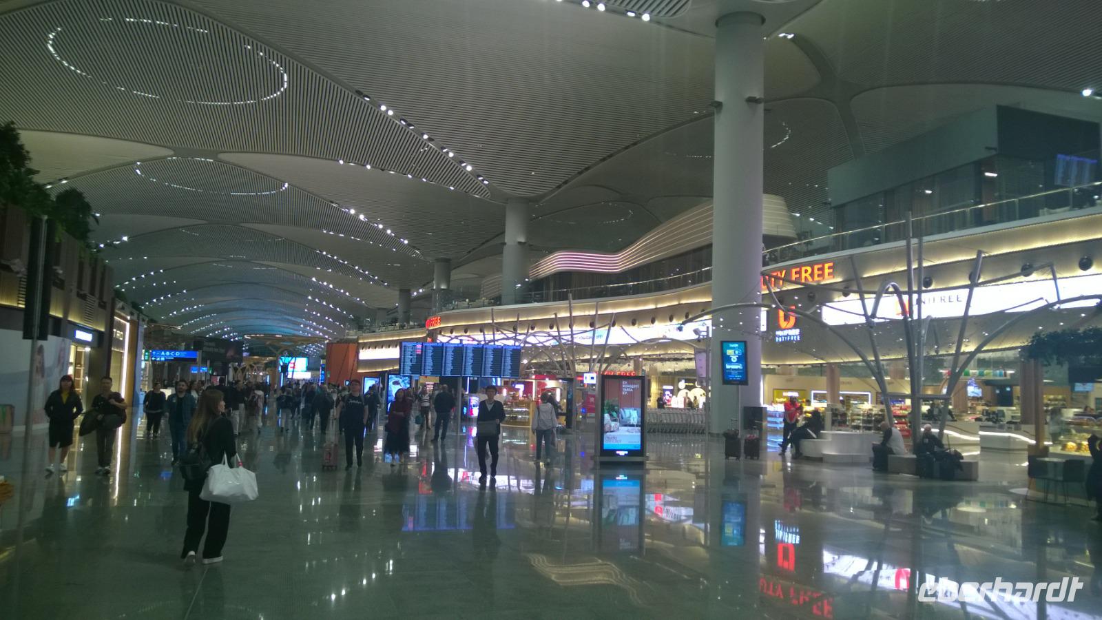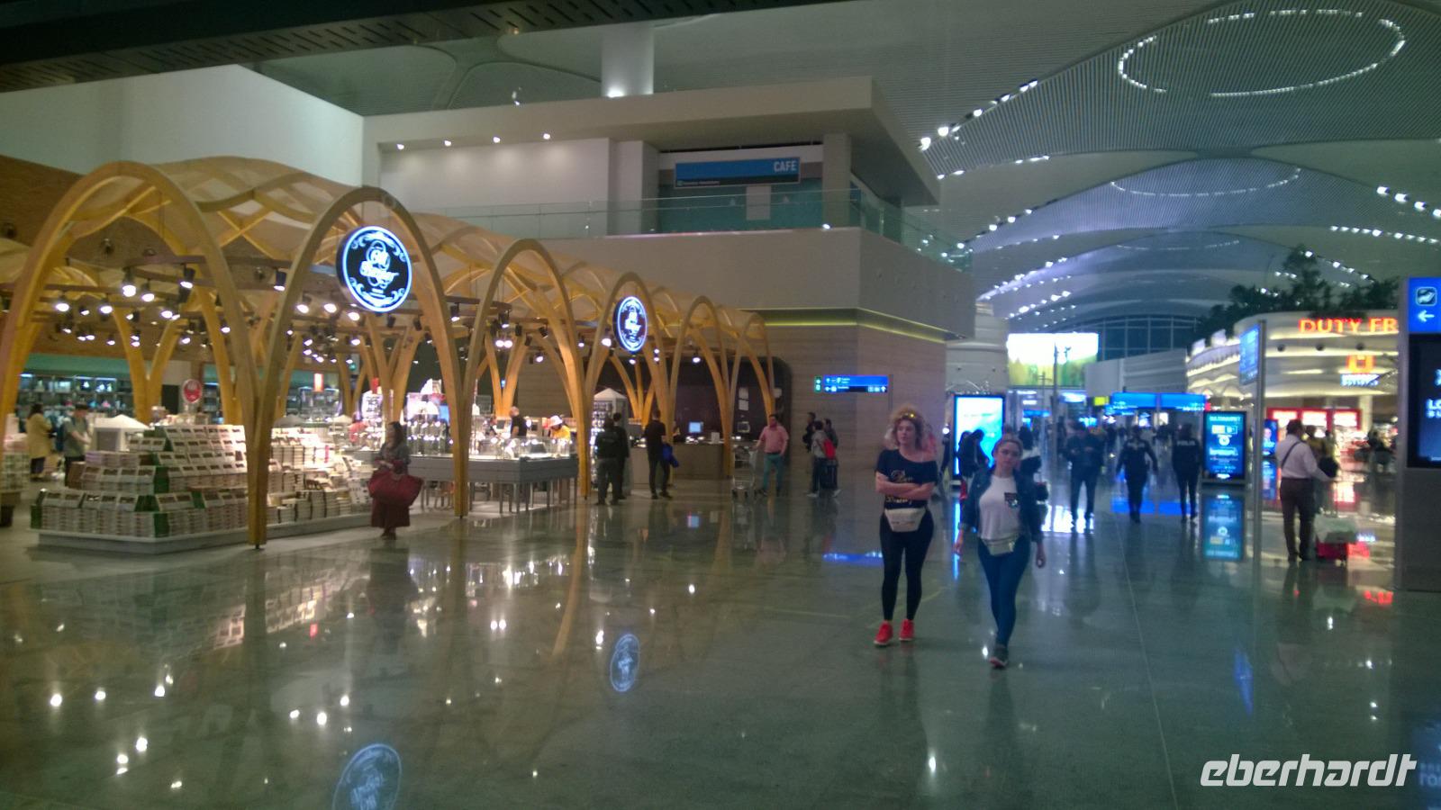 Ein Großteil unserer Gruppe (10 Personen) traf sich am Flughafen Leipzig kurz nach 16 Uhr. Nach dem gemeinsamen Check-In und Gepäckabgabe gab es ein leckeres Snack in der Flughafen-Bar mit einem eberhardt-Gutschein: der Urlaub kann beginnen! Der Flug mit Türkisch Airlines nach Istanbul dauerte ca. 3 Stunden. Dort warteten schon auf uns die anderen 6 Reisegäste aus Berlin. Nun ist unsere Reisegruppe komplett. Der neue Flughafen in Istanbul ist riesig und sehr weitläufig. Man findet sich aber gut zu Recht dank der guten Ausschilderung. Zur Not kann man auch Flughafenmitarbeiter befragen, die ein T-Short mit dem Aufdruck „ask me" tragen.