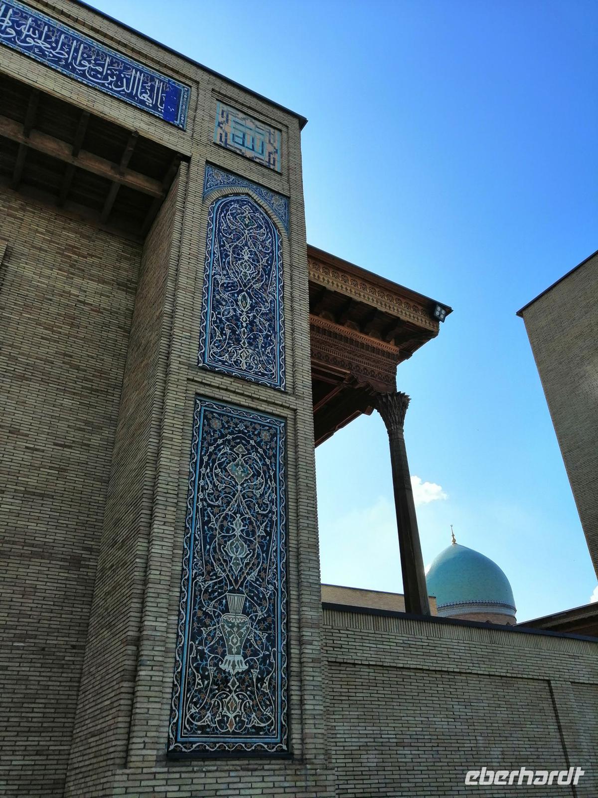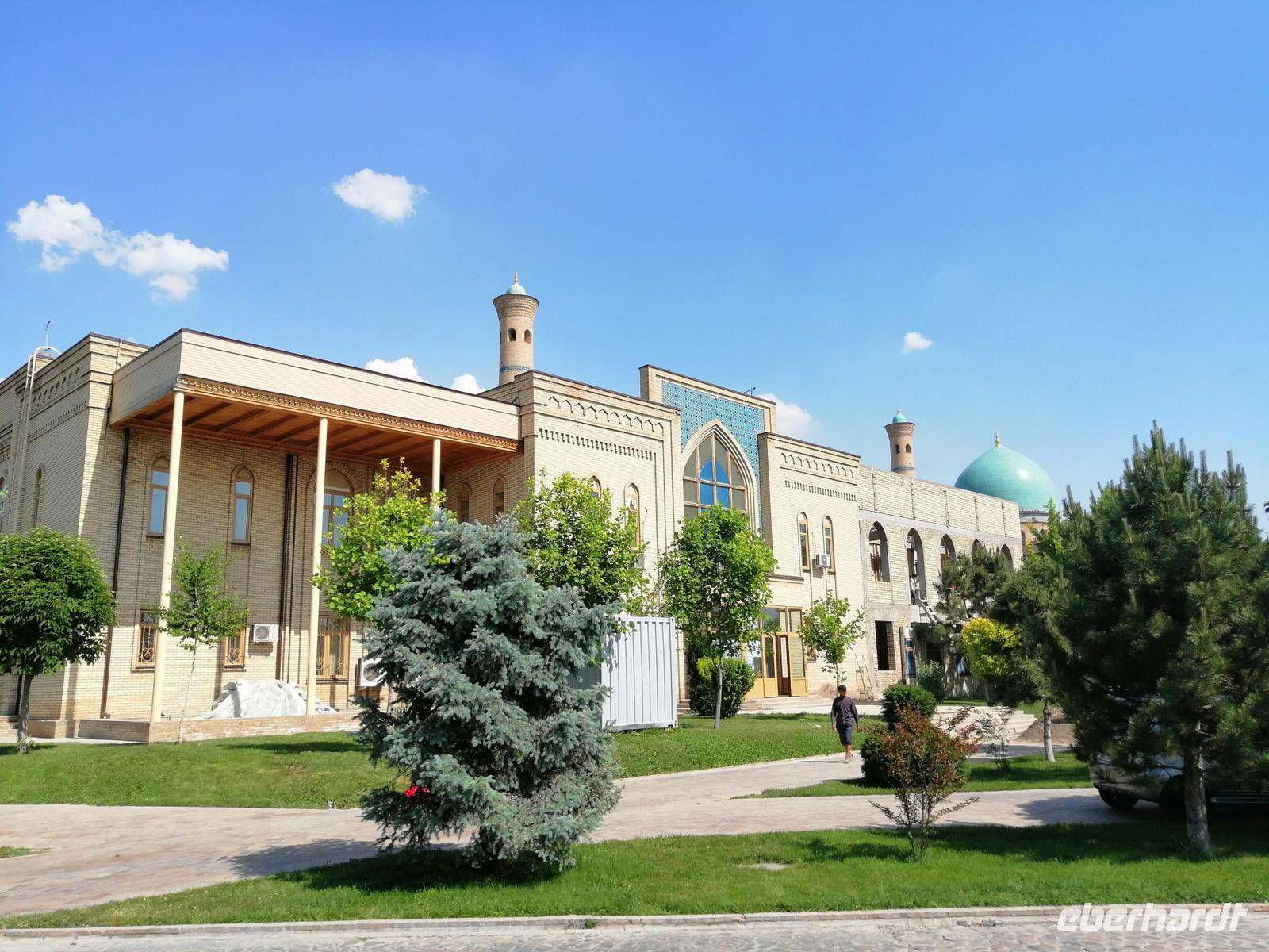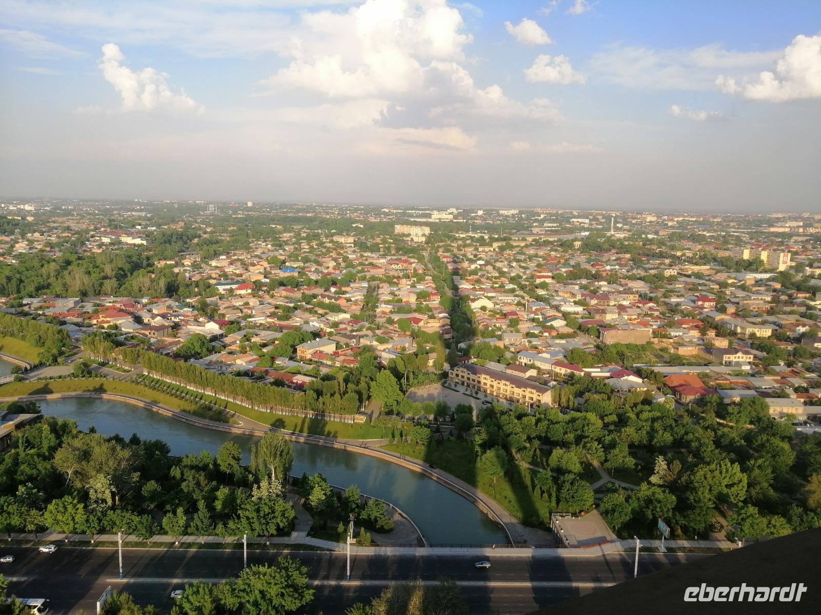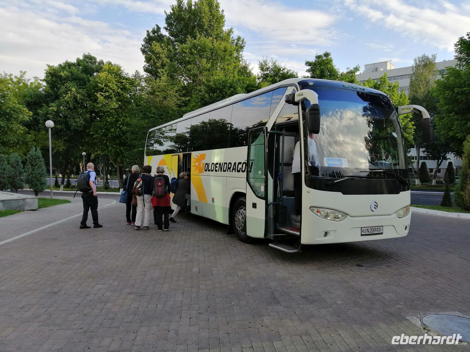 Die Hauptstadt von Usbekistan hat uns am frühen Morgen mit dem sonnigen Wetter empfangen. Am Flughafen begrüßte uns Ilhom, unser sehr erfahrener örtlicher Reiseleiter, der bereits seit 1992 sein Land ausländischen Touristen zeigt. Wir fuhren gemeinsam in einem großen Bus zum Hotel City Palace im Zentrum von Taschkent, wo auf uns noch ein reichhaltiges Frühstück wartete. Direkt im Hotel gab es ein Wechselservice der Transtbank, wo wir das usbekische Geld „Sum" bekommen haben. Nach einer guten Erholungspause im Hotel, begann gegen 14 Uhr unsere Stadtrundfahrt. Zuerst fuhren wir zum Hast-Imam-Komplex, einem des größten muslimischen Zentrums in Taschkent. Der Weg dorthin führte durch die engen Gassen der alten "Altstadt" von Taschkent, wo uns Ilhom über die lokale Bauweise der vielen Lehmhäuser erzählte. Der Hast-Imam-Komplex besteht aus vier Gebäuden: Barak-Khan-Medrese, Hasrati-Imam-Moschee, Muji-Mubarak-Medrese und Tillya-Scheich-Moschee. Zuerst haben wir uns die Barak-Khan-Medrese angeschaut: im Hof der Medrese befanden sich verschiedenen Handwerker und Händler, die ihre Waren anboten. Danach ging es zur Muji-Mubarak-Medrese, wo sich der berühmte Osman-Koran befindet. Ilhom erzählte uns über den Schwiegersohn des Propheten Mohammed, der erstmalig eine gültige Version des Korans zusammengestellt hat. Zum Schluss besichtigten wir die Hasrati-Imam-Moschee: die größte Moschee in Taschkent, die auch als Freitagsmoschee für die Gläubiger geöffnet ist. Wir schauten uns den Innenhof und die Gebetshalle an. Nach einer sehr gemütlichen Tee-Pause im AL Aziz Café, besichtigten wir den Fernsehturm von Taschkent. Nach einer sorgfältigen Sicherheitskontrolle, bewunderten wir die Hauptstadt Usbekistans in einer Höhe von 94 m. Der Fernsehturm von Taschkent ist die höchste Einrichtung mit einer Aussichtsplattform in Zentralasien und ist 375 m hoch. Eine junge nette Frau erzählte uns über die technischen Eigenschaften des Fernsehturms und die Sehenswürdigkeiten der Stadt, die man von oben wunderbar bewundern konnte. Den ersten Tag in Usbekistan beendeten wir in einem landestypischen Restaurant „Sim Sim", wo uns sehr leckere usbekische Speisen serviert wurden. Ein musikalischer Gruß mit Live-Musik von Nachbartisch verschönerte unseren Abend zusätzlich! Außerdem konnten wir die vielen Feier im Restaurant (Geburtstag einer Frau mit ihren erwachsenen Kindern und Schwiegerkindern, Betriebsfeier einer zahnärztlichen Klinik usw.) mit vielen gigantischen Blumensträuchern beobachten und ins Gespräch mit Einheimischen treten. Schon spät abends waren wir müde aber sehr glücklich im Hotel.