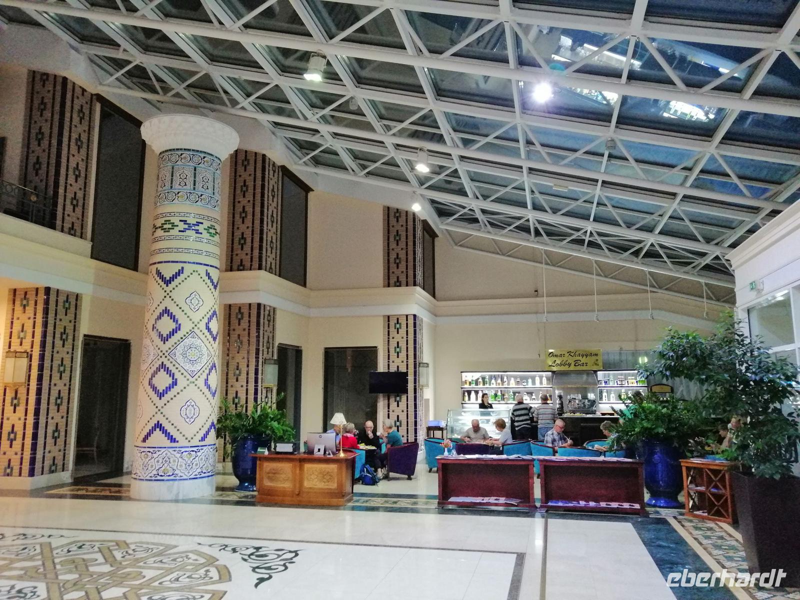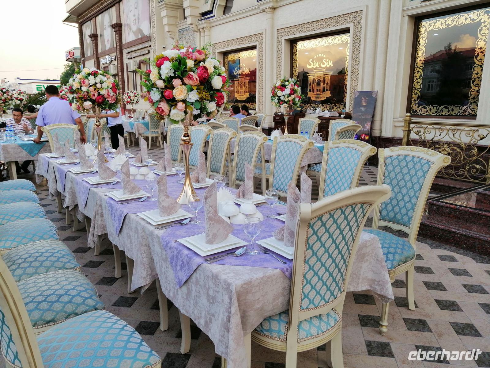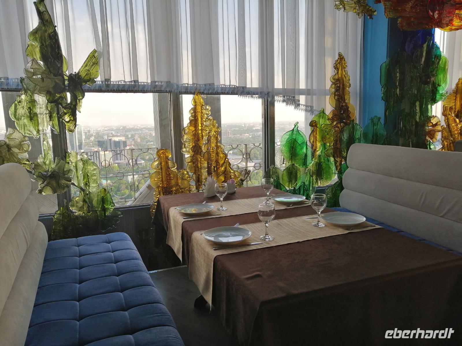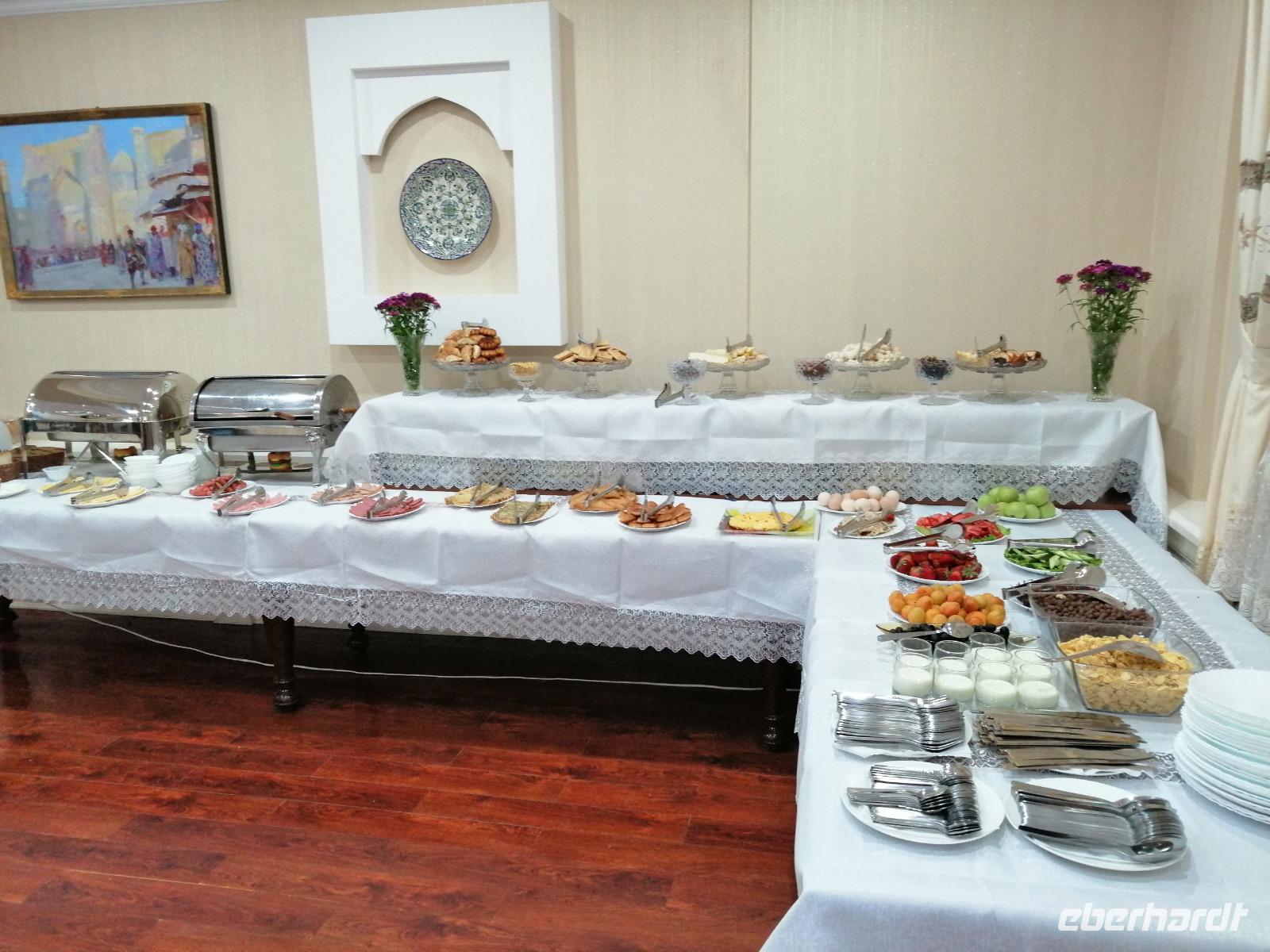 Die Hauptstadt von Usbekistan hat uns am frühen Morgen mit dem sonnigen Wetter empfangen. Am Flughafen begrüßte uns Ilhom, unser sehr erfahrener örtlicher Reiseleiter, der bereits seit 1992 sein Land ausländischen Touristen zeigt. Wir fuhren gemeinsam in einem großen Bus zum Hotel City Palace im Zentrum von Taschkent, wo auf uns noch ein reichhaltiges Frühstück wartete. Direkt im Hotel gab es ein Wechselservice der Transtbank, wo wir das usbekische Geld „Sum" bekommen haben. Nach einer guten Erholungspause im Hotel, begann gegen 14 Uhr unsere Stadtrundfahrt. Zuerst fuhren wir zum Hast-Imam-Komplex, einem des größten muslimischen Zentrums in Taschkent. Der Weg dorthin führte durch die engen Gassen der alten "Altstadt" von Taschkent, wo uns Ilhom über die lokale Bauweise der vielen Lehmhäuser erzählte. Der Hast-Imam-Komplex besteht aus vier Gebäuden: Barak-Khan-Medrese, Hasrati-Imam-Moschee, Muji-Mubarak-Medrese und Tillya-Scheich-Moschee. Zuerst haben wir uns die Barak-Khan-Medrese angeschaut: im Hof der Medrese befanden sich verschiedenen Handwerker und Händler, die ihre Waren anboten. Danach ging es zur Muji-Mubarak-Medrese, wo sich der berühmte Osman-Koran befindet. Ilhom erzählte uns über den Schwiegersohn des Propheten Mohammed, der erstmalig eine gültige Version des Korans zusammengestellt hat. Zum Schluss besichtigten wir die Hasrati-Imam-Moschee: die größte Moschee in Taschkent, die auch als Freitagsmoschee für die Gläubiger geöffnet ist. Wir schauten uns den Innenhof und die Gebetshalle an. Nach einer sehr gemütlichen Tee-Pause im AL Aziz Café, besichtigten wir den Fernsehturm von Taschkent. Nach einer sorgfältigen Sicherheitskontrolle, bewunderten wir die Hauptstadt Usbekistans in einer Höhe von 94 m. Der Fernsehturm von Taschkent ist die höchste Einrichtung mit einer Aussichtsplattform in Zentralasien und ist 375 m hoch. Eine junge nette Frau erzählte uns über die technischen Eigenschaften des Fernsehturms und die Sehenswürdigkeiten der Stadt, die man von oben wunderbar bewundern konnte. Den ersten Tag in Usbekistan beendeten wir in einem landestypischen Restaurant „Sim Sim", wo uns sehr leckere usbekische Speisen serviert wurden. Ein musikalischer Gruß mit Live-Musik von Nachbartisch verschönerte unseren Abend zusätzlich! Außerdem konnten wir die vielen Feier im Restaurant (Geburtstag einer Frau mit ihren erwachsenen Kindern und Schwiegerkindern, Betriebsfeier einer zahnärztlichen Klinik usw.) mit vielen gigantischen Blumensträuchern beobachten und ins Gespräch mit Einheimischen treten. Schon spät abends waren wir müde aber sehr glücklich im Hotel.