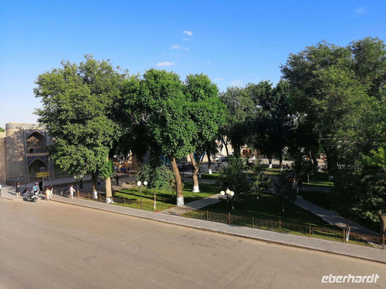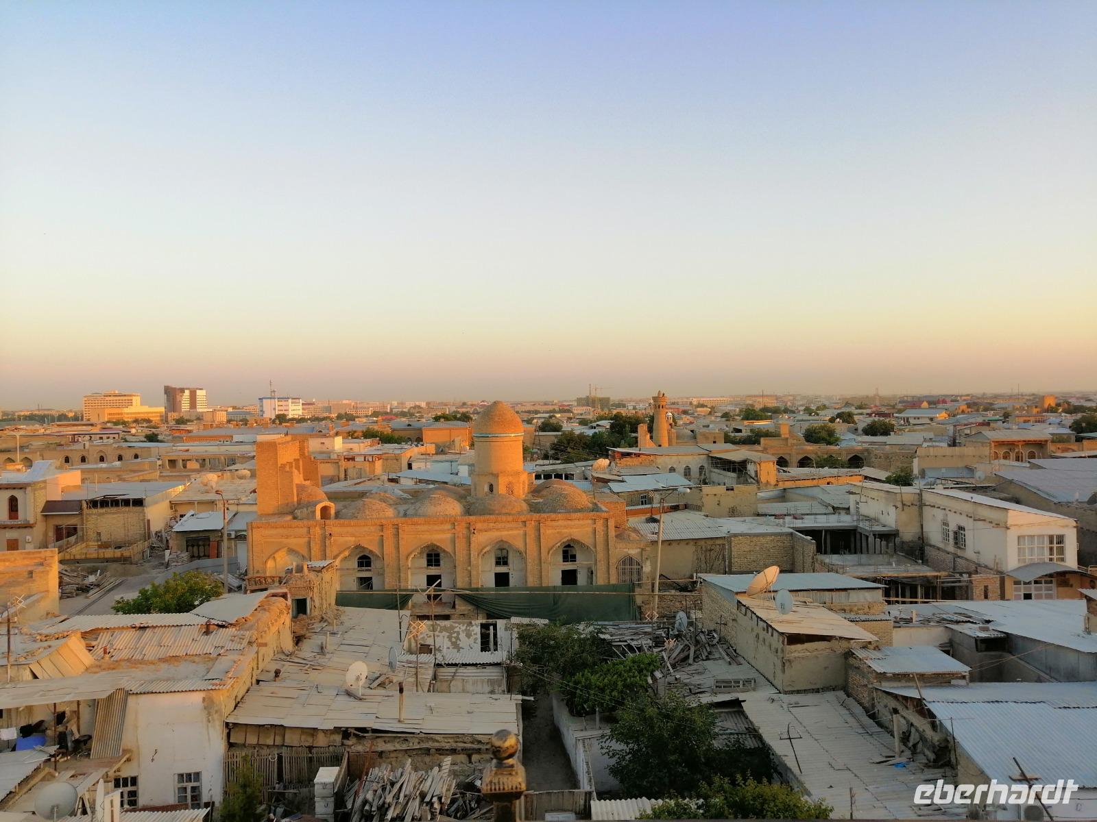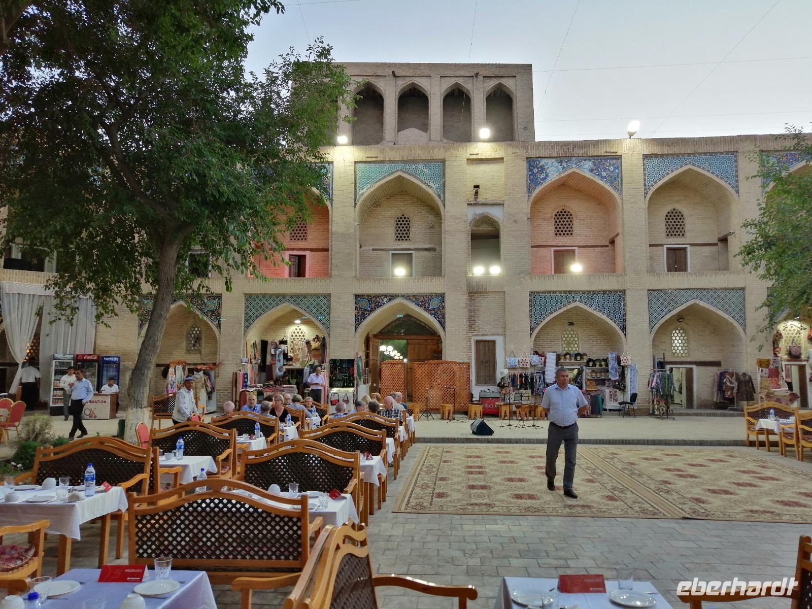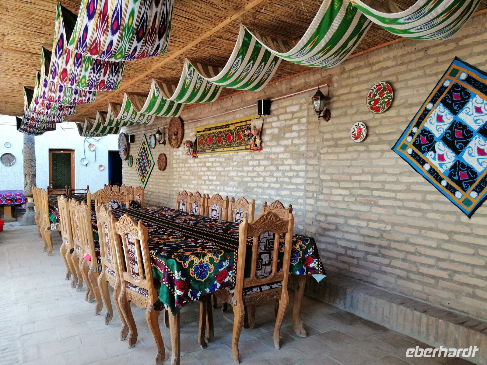 Nach einem sehr guten Frühstück starteten wir ca. eine Stunde eher als die anderen Reisegruppen unsere Fahrt durch die Kizilkum-Wüste. Heute lernten wir unseren Busfahrer Asamat und seinen Begleiter kennen, die uns bis nach Samarkand bringen werden. Unsere Busfahrt ging teilweise entlang der Amurdarja sowie durch die endlose, eindrucksvolle Halbwüsten- und Steppenlandschaft auf eine autobahnähnliche Straße. Trotz inzwischen sehr heißen Temperaturen, fuhren uns zwei Fahrrad-Touristen mit entgegen. Die Entfernung bis nach Buchara beträgt 460 km: eine stolze Leistung für Radfahrer! Unterwegs machten wir Tee- und Kaffeepausen: unsere Busfahrer kümmerten sich sehr um uns und servierten auf einem kleinen Klapptisch Nüsse, Süßigkeiten und Kekse. Unterwegs informierte uns Ilhom über den Islam und Salafismus. Außerdem erzählte er uns auch über die Flora und Fauna der Kizilkumwüste und zeigte umfangreiche Bilde der dort lebenden Pflanzen und Tiere. Am Mittag hielten wir in einem Rasthaus am Straßenrand und hatten eine kleine Mahlzeit mit Suppe, Salat, Käse, Fladenbrot und Schaschlik. Als Nachtisch gab es leicht eingefrorenen Bananen, die Ilhom für uns noch in Chiwa gekauft hat. Ein Höhepunkt der Fahrt war die spontane Idee von Ilhom seinen Freund unterwegs zu besuchen, der uns seine kleine Seiden-Raupen-Farm gezeigt hat. Wir stellten viele Fragen zum Thema Seidenproduktion und erfuhren, dass viele kleine Familie ihre Seide-Kokons zu einer zentralen Sammelstelle bringen wo die Seide dann industriell weiter verarbeitet wird. Am Abend erreichten wir Buchara. Unser Hotel Komil befand sich im jüdischen Stadtviertel, am Rande der Altstadt und wir hatte noch Zeit um uns frisch zu machen und die Umgebung zu erkunden. Das Hotel bestand aus zwei Gebäuden: einem alten jüdischen und einem muslimischen Haus, die miteinander durch einen Innenhof verbunden waren. Der Frühstücksraum des Hotels wirkte sehr geheimnisvoll und man füllte sich in dem Raum ein bisschen in die Vergangenheit versetzt. Das Abendessen hatten wir im Restaurant Dolon, auf einer ganz tollen Dachterrasse, mit einem wunderschönen Blick über die ganze Altstadt von Buchara.