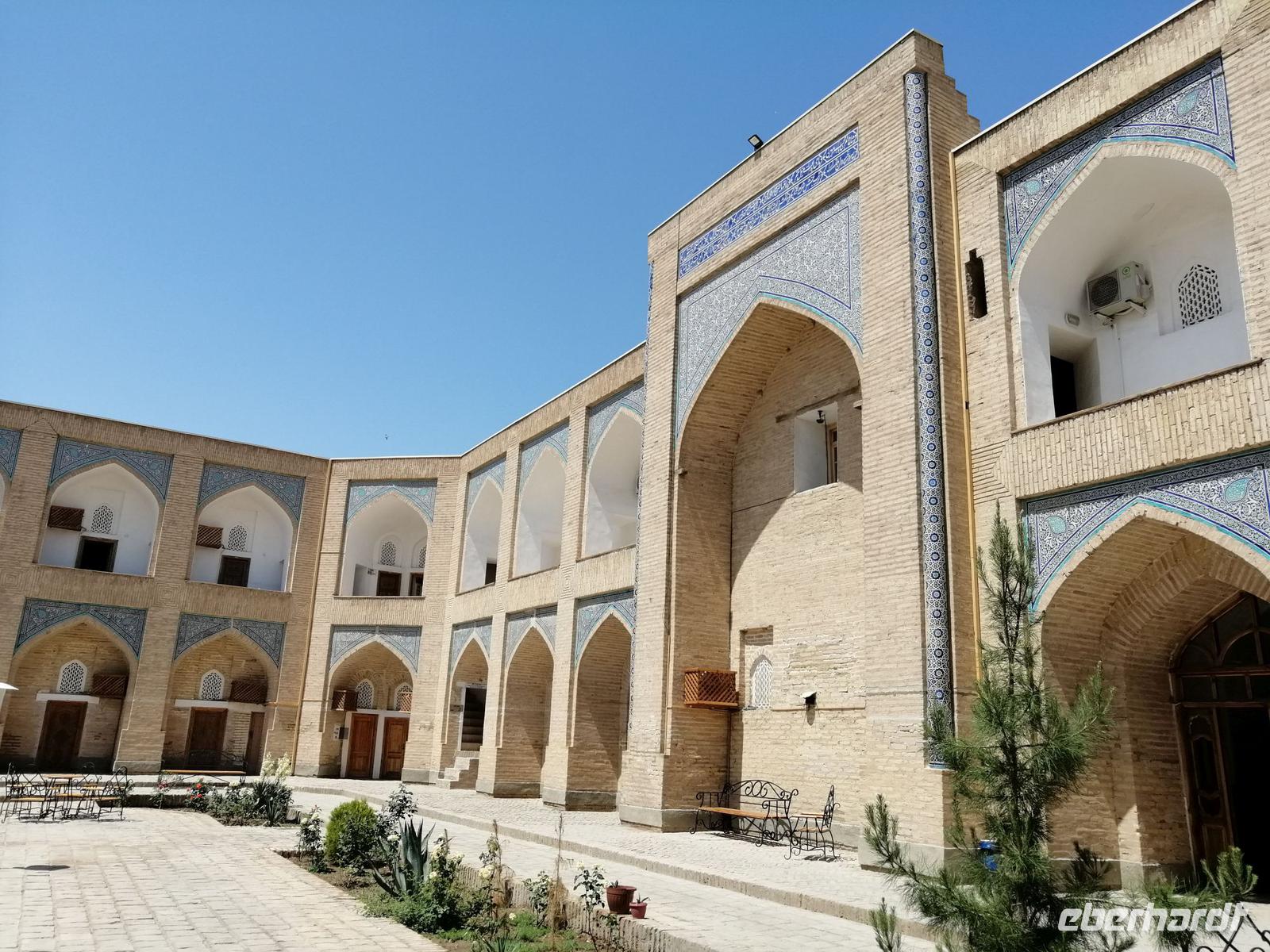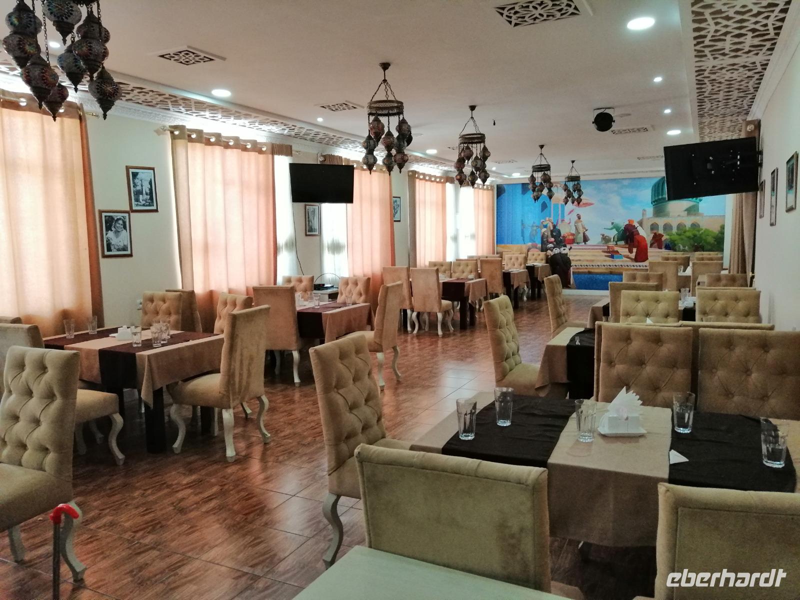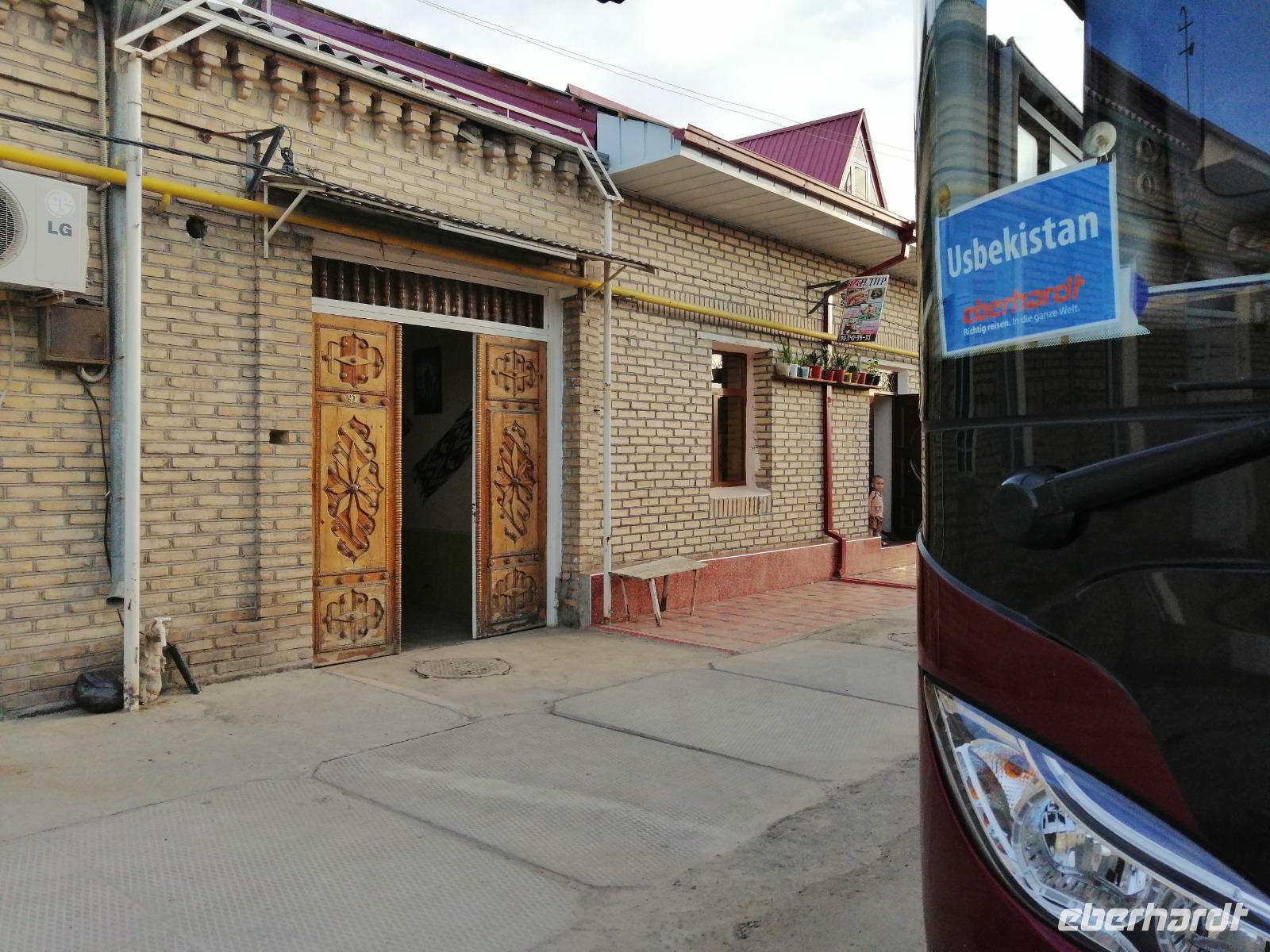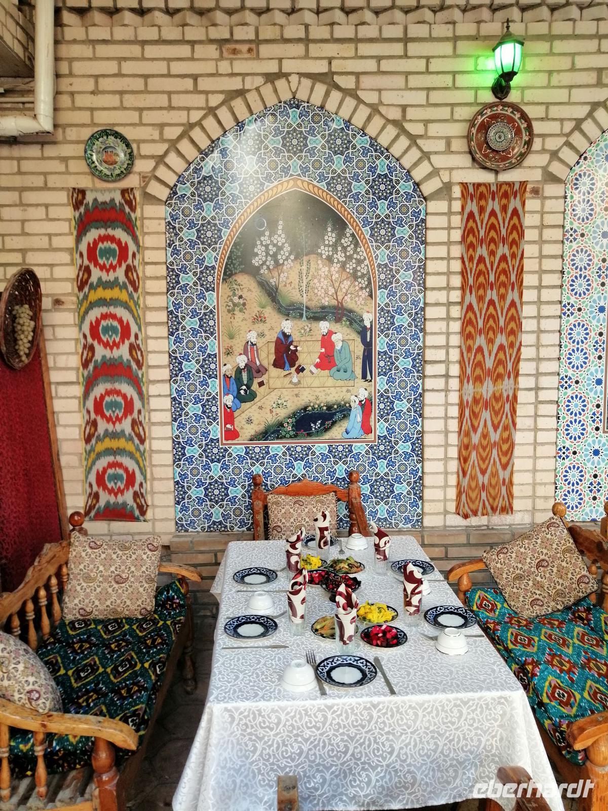 Nach einem sehr guten Frühstück starteten wir ca. eine Stunde eher als die anderen Reisegruppen unsere Fahrt durch die Kizilkum-Wüste. Heute lernten wir unseren Busfahrer Asamat und seinen Begleiter kennen, die uns bis nach Samarkand bringen werden. Unsere Busfahrt ging teilweise entlang der Amurdarja sowie durch die endlose, eindrucksvolle Halbwüsten- und Steppenlandschaft auf eine autobahnähnliche Straße. Trotz inzwischen sehr heißen Temperaturen, fuhren uns zwei Fahrrad-Touristen mit entgegen. Die Entfernung bis nach Buchara beträgt 460 km: eine stolze Leistung für Radfahrer! Unterwegs machten wir Tee- und Kaffeepausen: unsere Busfahrer kümmerten sich sehr um uns und servierten auf einem kleinen Klapptisch Nüsse, Süßigkeiten und Kekse. Unterwegs informierte uns Ilhom über den Islam und Salafismus. Außerdem erzählte er uns auch über die Flora und Fauna der Kizilkumwüste und zeigte umfangreiche Bilde der dort lebenden Pflanzen und Tiere. Am Mittag hielten wir in einem Rasthaus am Straßenrand und hatten eine kleine Mahlzeit mit Suppe, Salat, Käse, Fladenbrot und Schaschlik. Als Nachtisch gab es leicht eingefrorenen Bananen, die Ilhom für uns noch in Chiwa gekauft hat. Ein Höhepunkt der Fahrt war die spontane Idee von Ilhom seinen Freund unterwegs zu besuchen, der uns seine kleine Seiden-Raupen-Farm gezeigt hat. Wir stellten viele Fragen zum Thema Seidenproduktion und erfuhren, dass viele kleine Familie ihre Seide-Kokons zu einer zentralen Sammelstelle bringen wo die Seide dann industriell weiter verarbeitet wird. Am Abend erreichten wir Buchara. Unser Hotel Komil befand sich im jüdischen Stadtviertel, am Rande der Altstadt und wir hatte noch Zeit um uns frisch zu machen und die Umgebung zu erkunden. Das Hotel bestand aus zwei Gebäuden: einem alten jüdischen und einem muslimischen Haus, die miteinander durch einen Innenhof verbunden waren. Der Frühstücksraum des Hotels wirkte sehr geheimnisvoll und man füllte sich in dem Raum ein bisschen in die Vergangenheit versetzt. Das Abendessen hatten wir im Restaurant Dolon, auf einer ganz tollen Dachterrasse, mit einem wunderschönen Blick über die ganze Altstadt von Buchara.