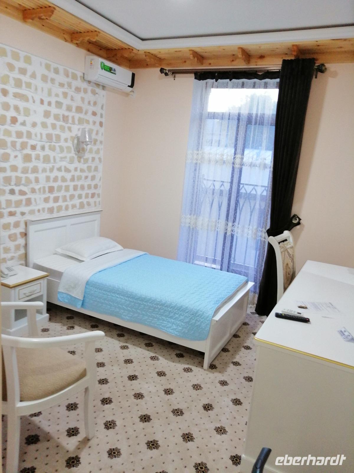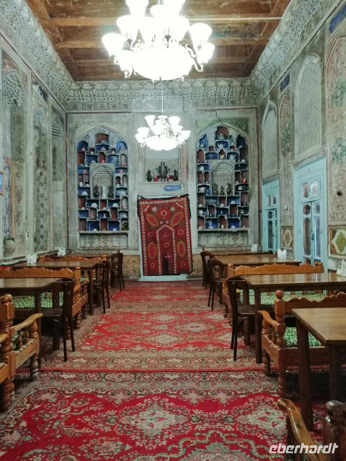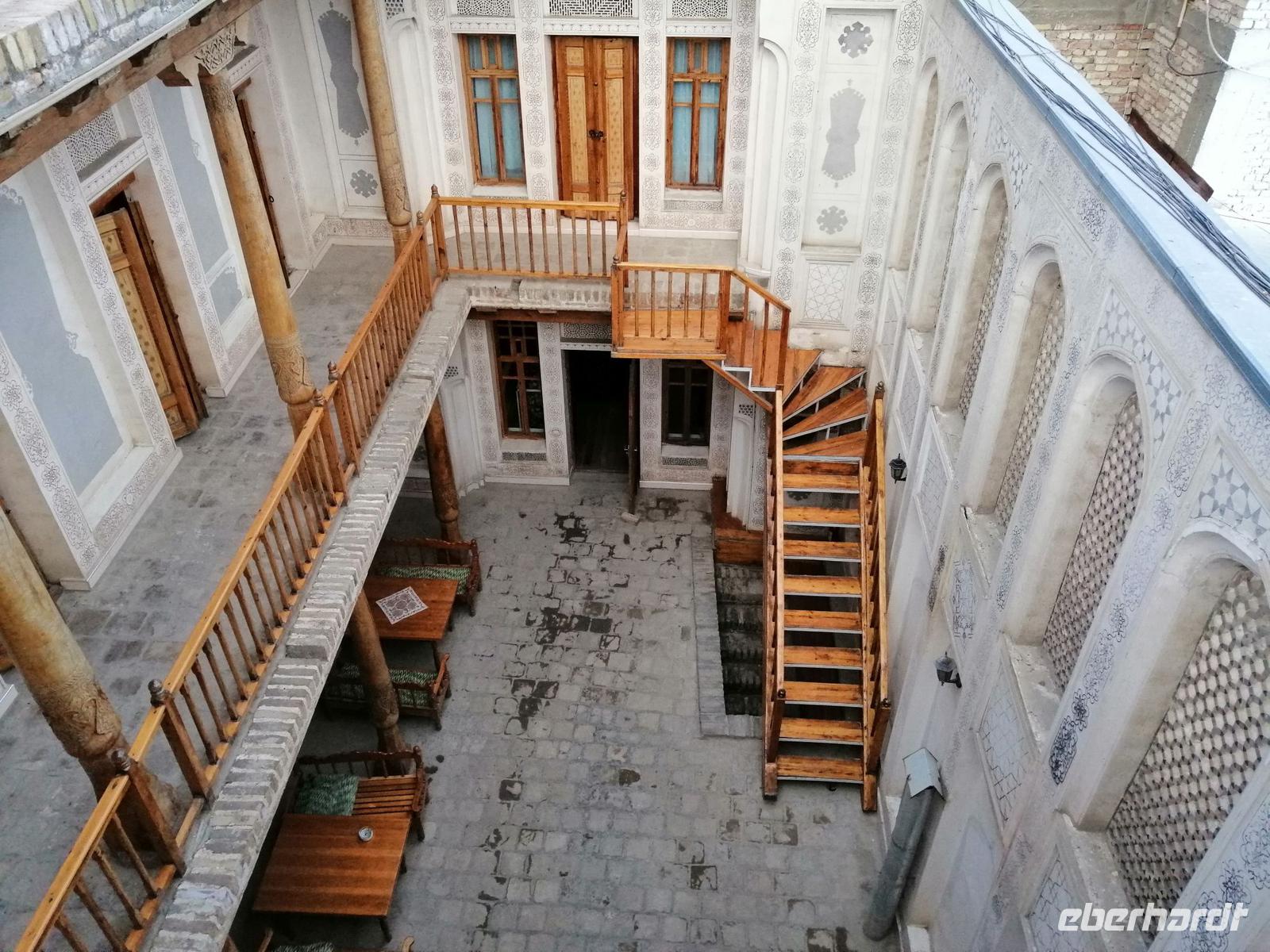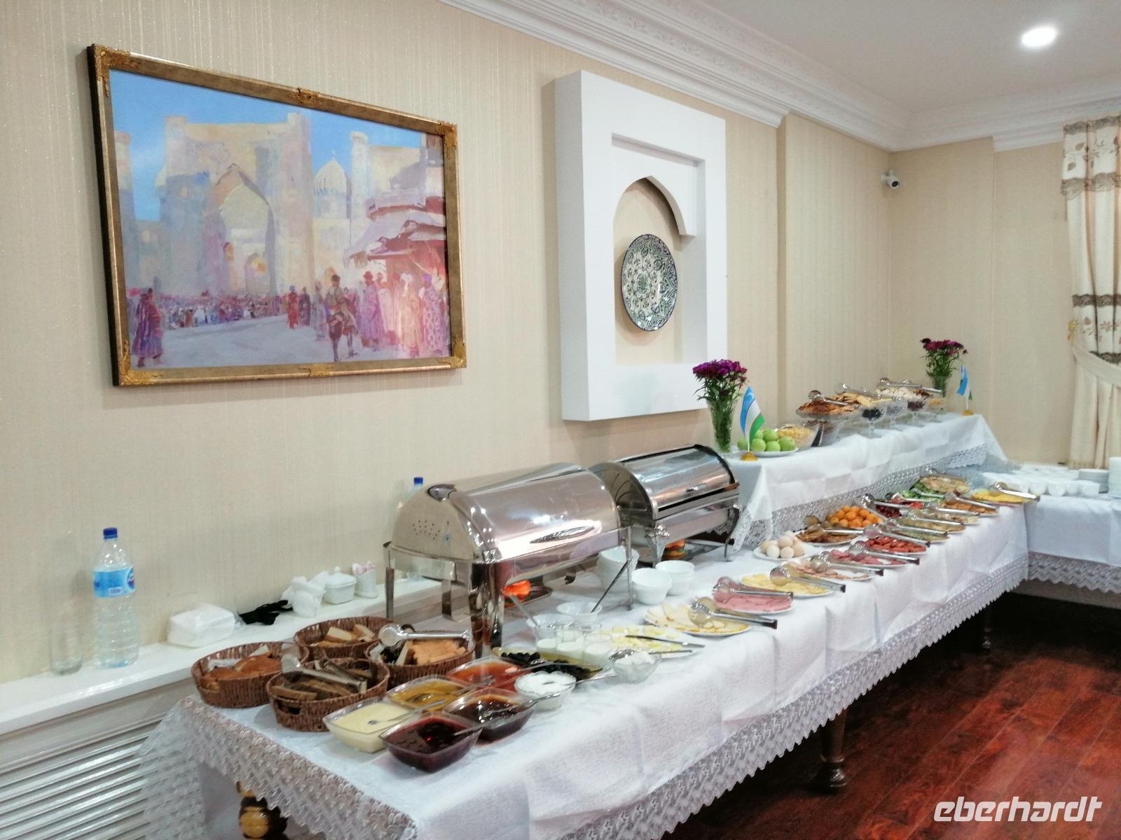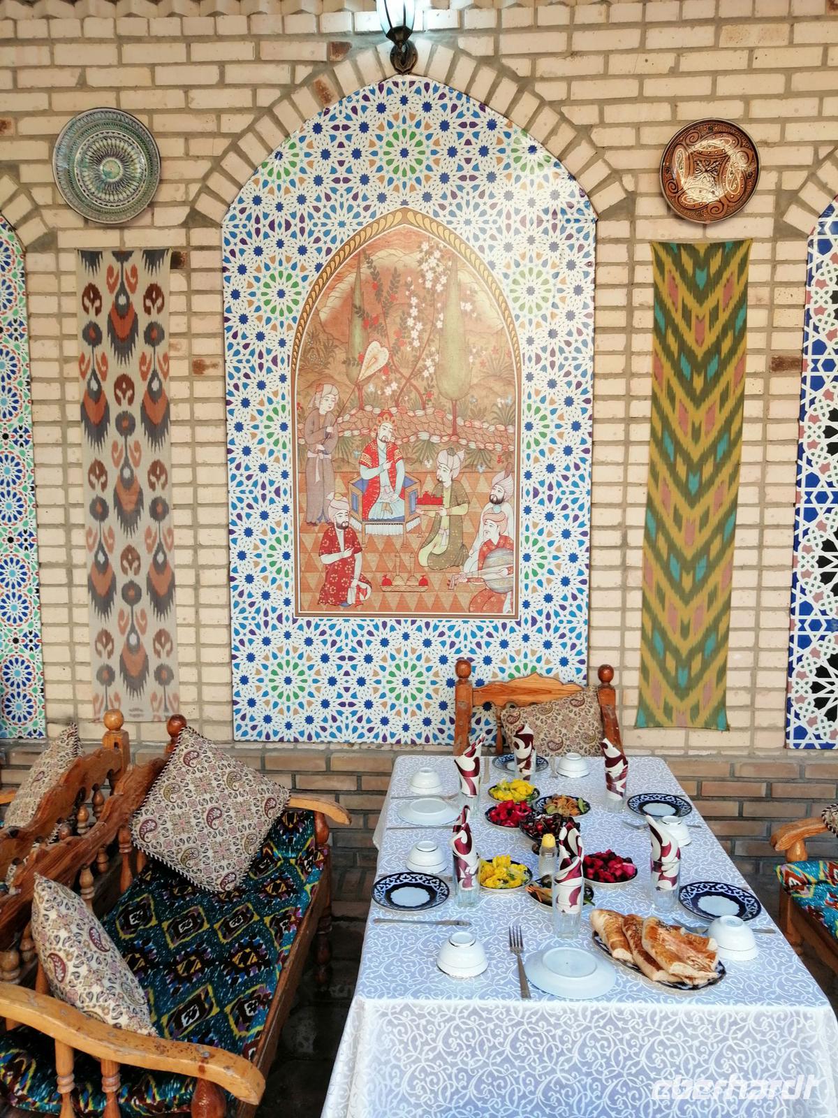 Nach einem sehr guten Frühstück starteten wir ca. eine Stunde eher als die anderen Reisegruppen unsere Fahrt durch die Kizilkum-Wüste. Heute lernten wir unseren Busfahrer Asamat und seinen Begleiter kennen, die uns bis nach Samarkand bringen werden. Unsere Busfahrt ging teilweise entlang der Amurdarja sowie durch die endlose, eindrucksvolle Halbwüsten- und Steppenlandschaft auf eine autobahnähnliche Straße. Trotz inzwischen sehr heißen Temperaturen, fuhren uns zwei Fahrrad-Touristen mit entgegen. Die Entfernung bis nach Buchara beträgt 460 km: eine stolze Leistung für Radfahrer! Unterwegs machten wir Tee- und Kaffeepausen: unsere Busfahrer kümmerten sich sehr um uns und servierten auf einem kleinen Klapptisch Nüsse, Süßigkeiten und Kekse. Unterwegs informierte uns Ilhom über den Islam und Salafismus. Außerdem erzählte er uns auch über die Flora und Fauna der Kizilkumwüste und zeigte umfangreiche Bilde der dort lebenden Pflanzen und Tiere. Am Mittag hielten wir in einem Rasthaus am Straßenrand und hatten eine kleine Mahlzeit mit Suppe, Salat, Käse, Fladenbrot und Schaschlik. Als Nachtisch gab es leicht eingefrorenen Bananen, die Ilhom für uns noch in Chiwa gekauft hat. Ein Höhepunkt der Fahrt war die spontane Idee von Ilhom seinen Freund unterwegs zu besuchen, der uns seine kleine Seiden-Raupen-Farm gezeigt hat. Wir stellten viele Fragen zum Thema Seidenproduktion und erfuhren, dass viele kleine Familie ihre Seide-Kokons zu einer zentralen Sammelstelle bringen wo die Seide dann industriell weiter verarbeitet wird. Am Abend erreichten wir Buchara. Unser Hotel Komil befand sich im jüdischen Stadtviertel, am Rande der Altstadt und wir hatte noch Zeit um uns frisch zu machen und die Umgebung zu erkunden. Das Hotel bestand aus zwei Gebäuden: einem alten jüdischen und einem muslimischen Haus, die miteinander durch einen Innenhof verbunden waren. Der Frühstücksraum des Hotels wirkte sehr geheimnisvoll und man füllte sich in dem Raum ein bisschen in die Vergangenheit versetzt. Das Abendessen hatten wir im Restaurant Dolon, auf einer ganz tollen Dachterrasse, mit einem wunderschönen Blick über die ganze Altstadt von Buchara.