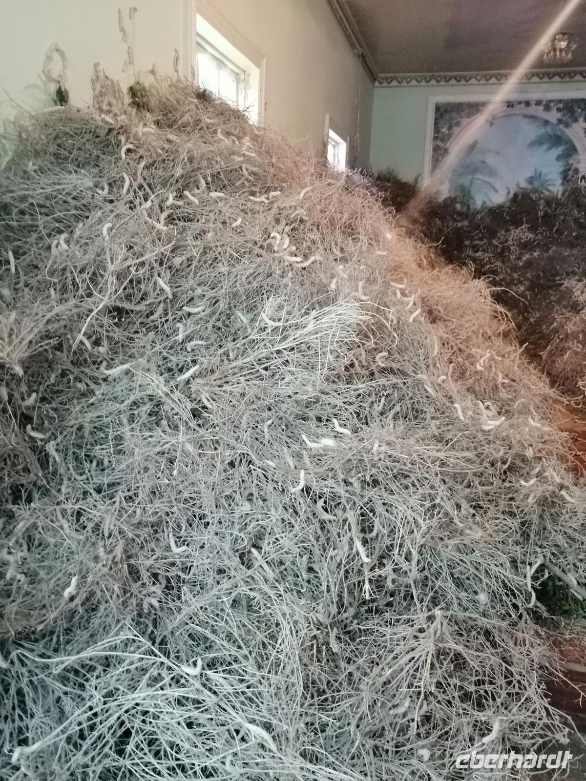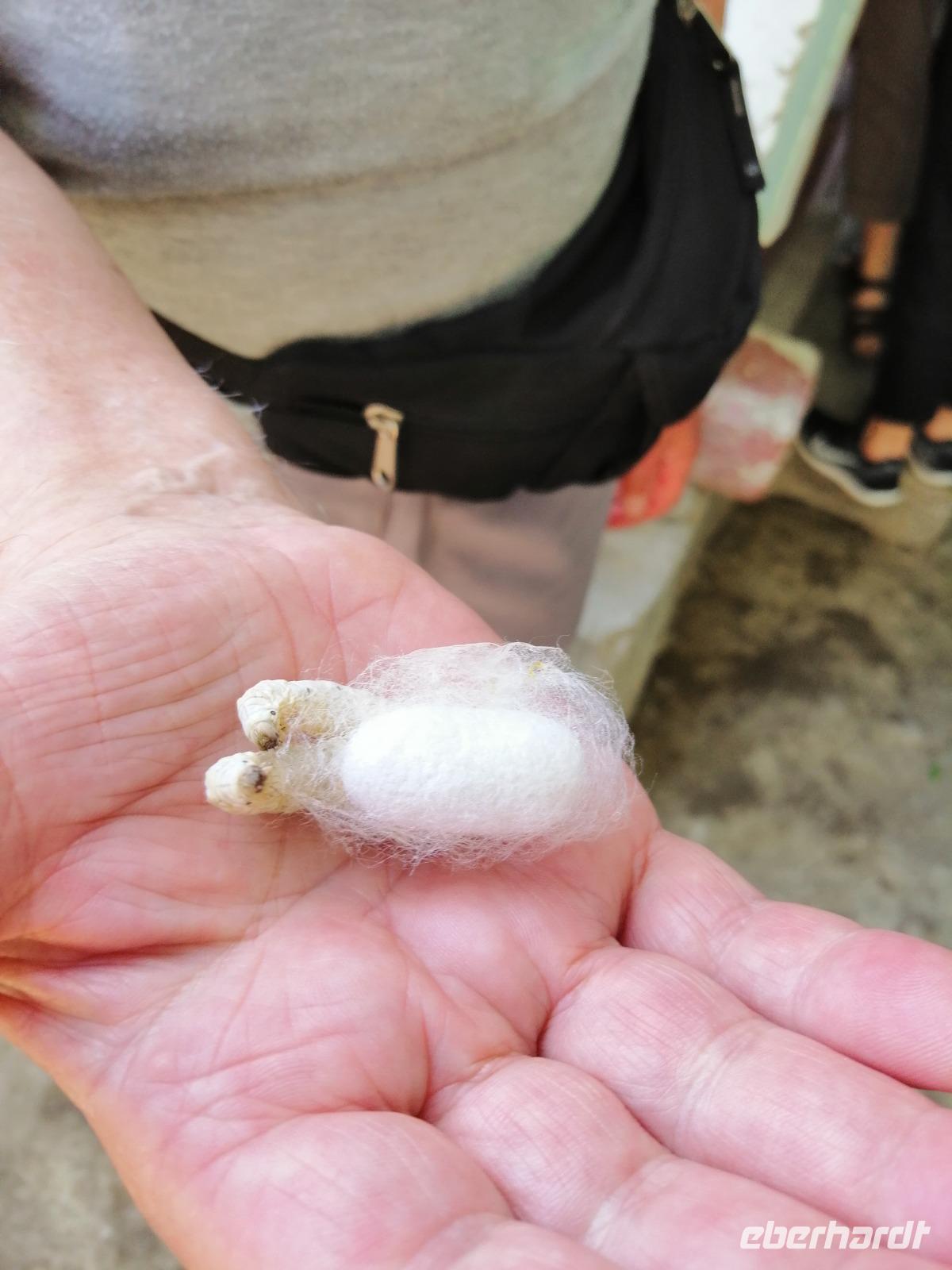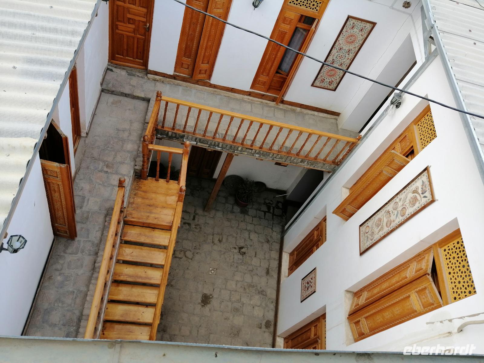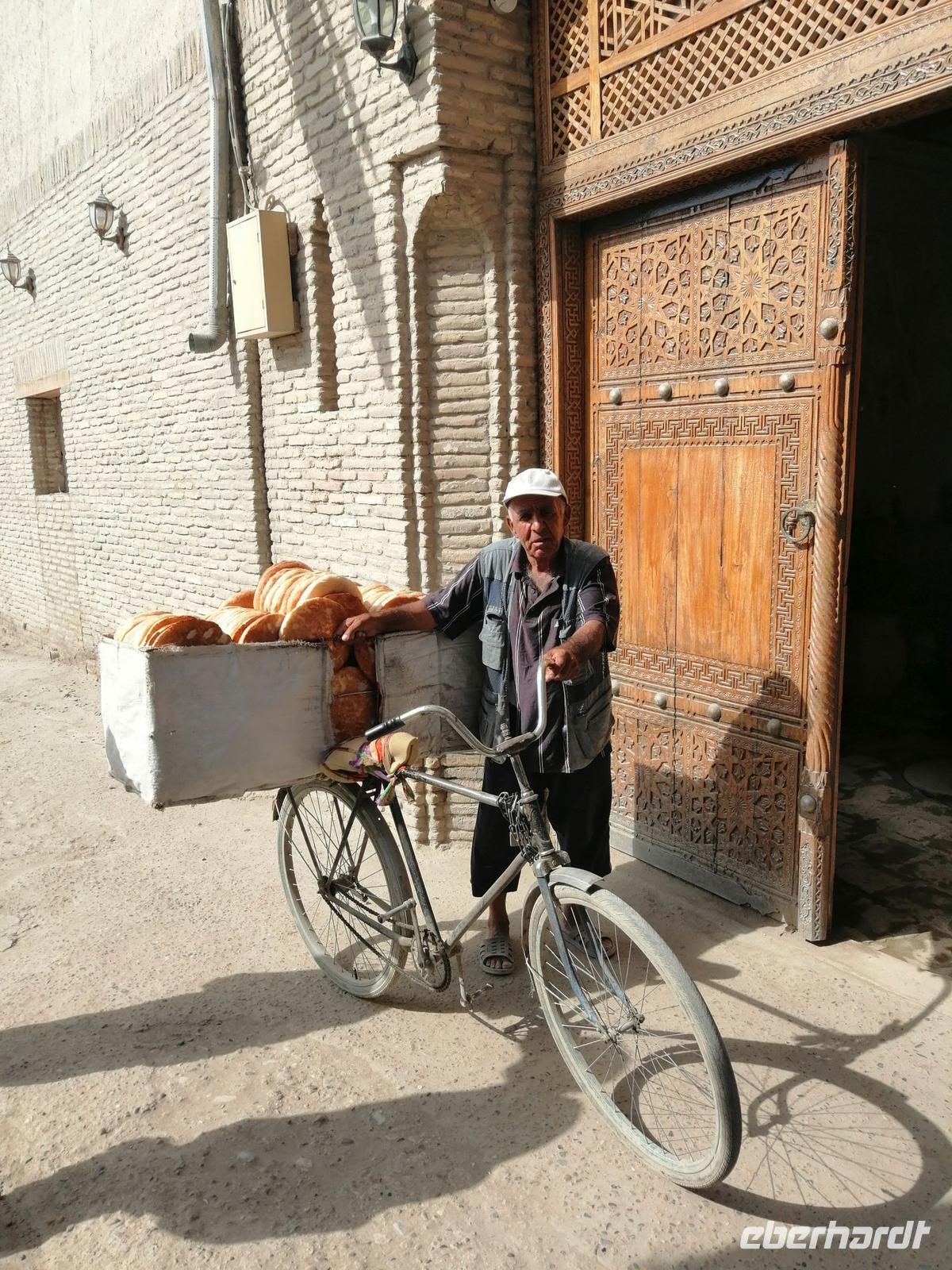 Nach einem sehr guten Frühstück starteten wir ca. eine Stunde eher als die anderen Reisegruppen unsere Fahrt durch die Kizilkum-Wüste. Heute lernten wir unseren Busfahrer Asamat und seinen Begleiter kennen, die uns bis nach Samarkand bringen werden. Unsere Busfahrt ging teilweise entlang der Amurdarja sowie durch die endlose, eindrucksvolle Halbwüsten- und Steppenlandschaft auf eine autobahnähnliche Straße. Trotz inzwischen sehr heißen Temperaturen, fuhren uns zwei Fahrrad-Touristen mit entgegen. Die Entfernung bis nach Buchara beträgt 460 km: eine stolze Leistung für Radfahrer! Unterwegs machten wir Tee- und Kaffeepausen: unsere Busfahrer kümmerten sich sehr um uns und servierten auf einem kleinen Klapptisch Nüsse, Süßigkeiten und Kekse. Unterwegs informierte uns Ilhom über den Islam und Salafismus. Außerdem erzählte er uns auch über die Flora und Fauna der Kizilkumwüste und zeigte umfangreiche Bilde der dort lebenden Pflanzen und Tiere. Am Mittag hielten wir in einem Rasthaus am Straßenrand und hatten eine kleine Mahlzeit mit Suppe, Salat, Käse, Fladenbrot und Schaschlik. Als Nachtisch gab es leicht eingefrorenen Bananen, die Ilhom für uns noch in Chiwa gekauft hat. Ein Höhepunkt der Fahrt war die spontane Idee von Ilhom seinen Freund unterwegs zu besuchen, der uns seine kleine Seiden-Raupen-Farm gezeigt hat. Wir stellten viele Fragen zum Thema Seidenproduktion und erfuhren, dass viele kleine Familie ihre Seide-Kokons zu einer zentralen Sammelstelle bringen wo die Seide dann industriell weiter verarbeitet wird. Am Abend erreichten wir Buchara. Unser Hotel Komil befand sich im jüdischen Stadtviertel, am Rande der Altstadt und wir hatte noch Zeit um uns frisch zu machen und die Umgebung zu erkunden. Das Hotel bestand aus zwei Gebäuden: einem alten jüdischen und einem muslimischen Haus, die miteinander durch einen Innenhof verbunden waren. Der Frühstücksraum des Hotels wirkte sehr geheimnisvoll und man füllte sich in dem Raum ein bisschen in die Vergangenheit versetzt. Das Abendessen hatten wir im Restaurant Dolon, auf einer ganz tollen Dachterrasse, mit einem wunderschönen Blick über die ganze Altstadt von Buchara.