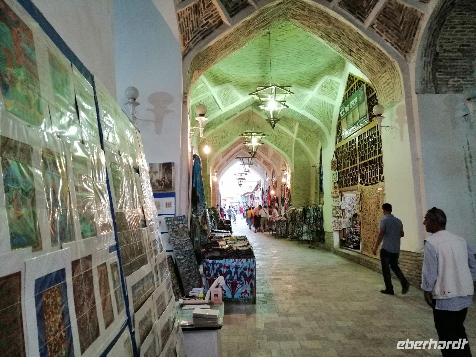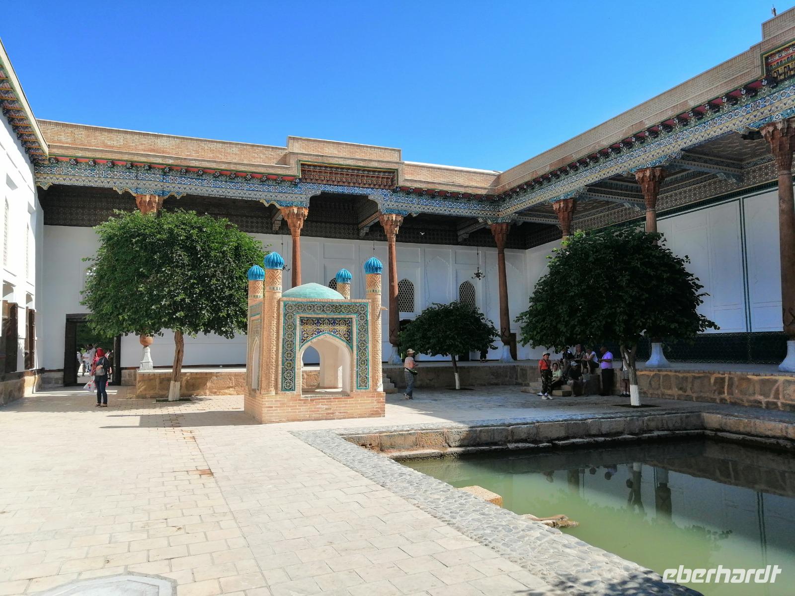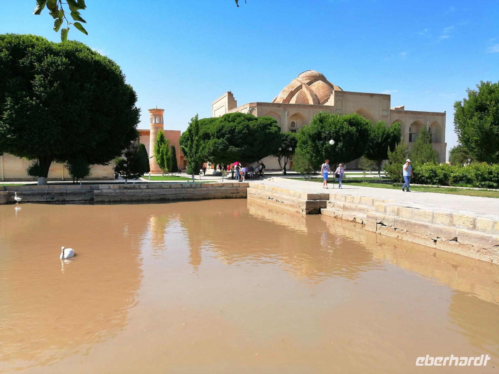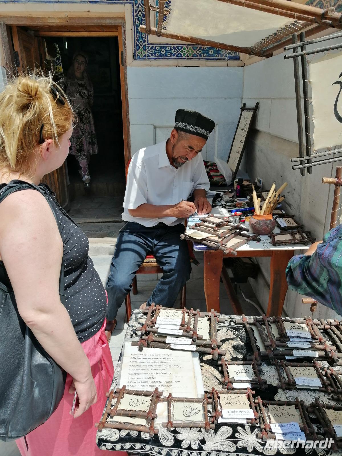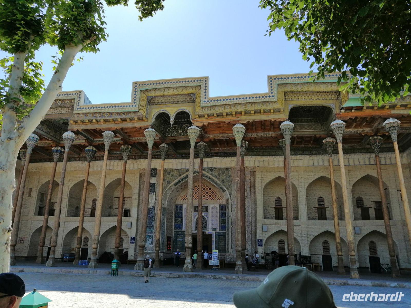 Heute nahmen wir uns vor Buchara, die Stadt der Gelehrten zu erkunden. Unser Stadtrundgang begann am Divan Begi Platz, am Stadtteich. Ilhom erzählte uns über die Maulbeerbäume, die hier in Usbekistan seit Jahrhunderten vor allem für die Produktion von Seide eine große Rolle spielen. Danach besichtigten wir die Khanaka Divan-Begi Medresse, in der sich das Keramikmuseum befand. Dort bewunderten wir nicht nur Keramikfunde, sondern auch die Kunst der Kalligraphie. Anschließend gingen wir durch eine überdachte Markthalle Karavan Sary Nugay aus dem 16. Jahrhundert, wo Schmuckhändler ihre Waren anboten. Danach besichtigten wir die Moschee Magoki Atori, die sich in einer Vertiefung mitten in der Altstadt befindet. Gleich nebenan schauten wir uns die Ausgrabungsstätte an, die als Memorial Kulturerbe ausgeschildert ist. Weiter ging es durch die weitere Makrthalle Taki-Telpak-Furushon: eine Werkstätte der Mützenmacher. Unterwegs hielten wir an einem Seidenteppichverkäufer an, wo Ilhom uns über die Seidenteppiche berichtet hatte. Gleich gegenüber befand sich ein Hamam (Dampfbad) für Männer. Wenig später besuchten wir schon eine Kunstwerkstatt von Davron Toshev: einem berühmten Maler von Buchara, der uns persönlich in seiner Werkstatt empfangen und mit grünem Tee bewirtet hat. Ilhom erzählte uns über die Besonderheiten seiner Malerei: beispielsweise Elefantenbilder, bestehend aus vielen anderen Tieren. Danach ging es in eine Markthalle, in der Frauenschmuck angeboten wurde. Ilhom stellte uns verschiedene Schmuckteile der Nomadenfrauen und Stadtfrauen direkt am Verkaufsstand eines Schmuckhändlers vor. Ein bisschen erschöpft durch die Wärme und viele neue spannende Informationen, erholten wir uns auf der Dachterrasse des Restaurants Chashmai-Mirob mit herrlichem Blick zum Pol Kaljan Komplex. Während des Mittagsessens erzählte uns Ilhom über die Geschichte des Komplexes. Wir fühlten uns sehr wohl im Schatten der Dachterrasse, wo sogar die Luft zusätzlich mit kühlem Wasserdampf besprüht wurde. Nachmittag besichtigten wir den Kaljan-Komplex, mit dem Wahrzeichen von Buchara: dem Kaljan-Minarett. Das Kaljan-Minarett ist 46 m hoch und ist das höchste Minarett in Zentralasien. Neben dem Minarett befindet sich die Kaljan-Moschee aus dem 16. Jahrhundert, in die bis 10.000 betende Gläubiger passen. Außerdem gehört auch die Miri Arab Medrese zum Koljan Komplex, in der auch heute noch Islamwissenschaften unterrichtet werden. Buchara war schon sehr früh ein bekanntes Zentrum von Wissenschaft und Kultur: denn hier lebten zahlreiche berühmte Gelehrte. Anschließend gingen wir über einen sehr großen Platz, Registan genannt zur Ark-Zitadelle. Die Zitadelle befindet sich auf einem künstlich aufgeschütteten Hügel und besteht aus verschiedenen Elementen: der Freitagsmoschee, dem Thronhof, dem Pferdehof, dem Gebäude des Premierministers und Museen. Einige Objekte besichtigten wir genauer. Abschließend besuchten wir die Bolo-Hauz Moschee. Houz bedeutet auf Usbekisch Teich: vor der Moschee befindet sich auch ein Teich, der älter als die Moschee (Bj. 1712) selbst sein soll.