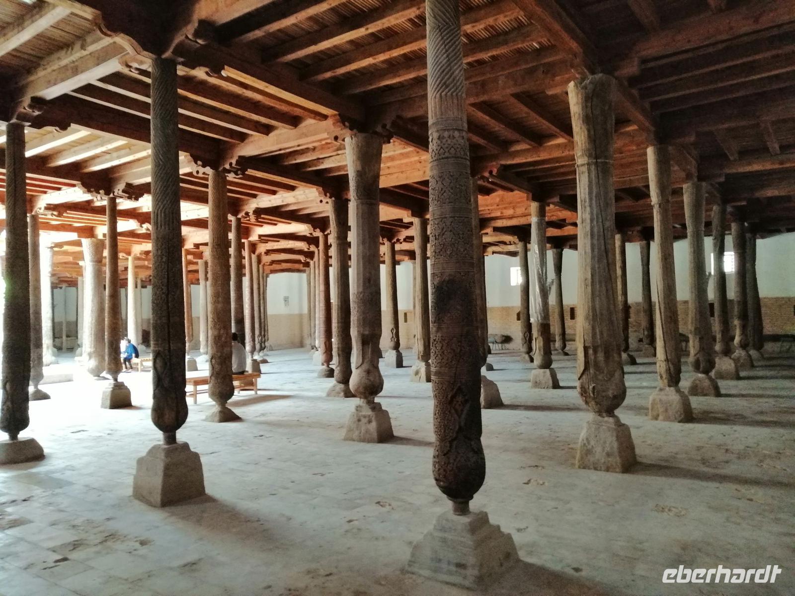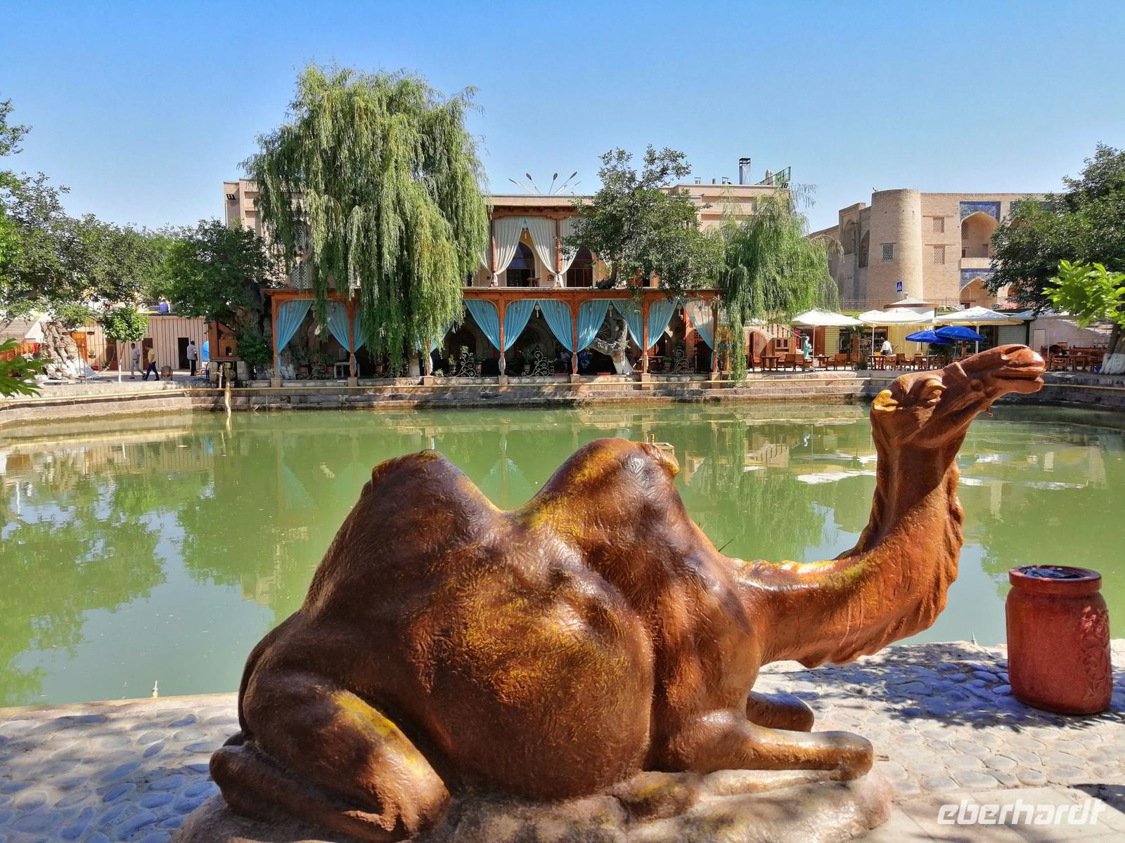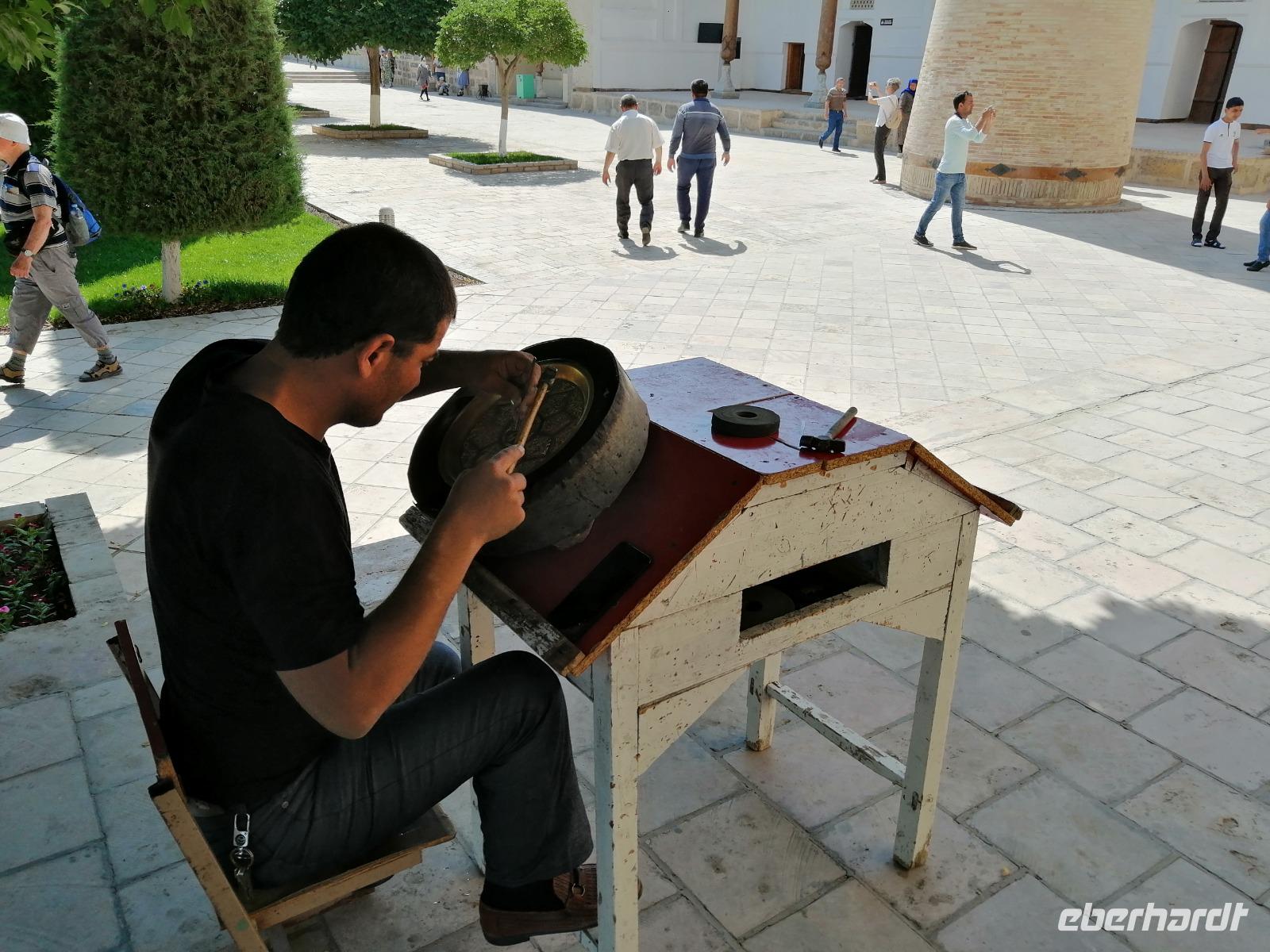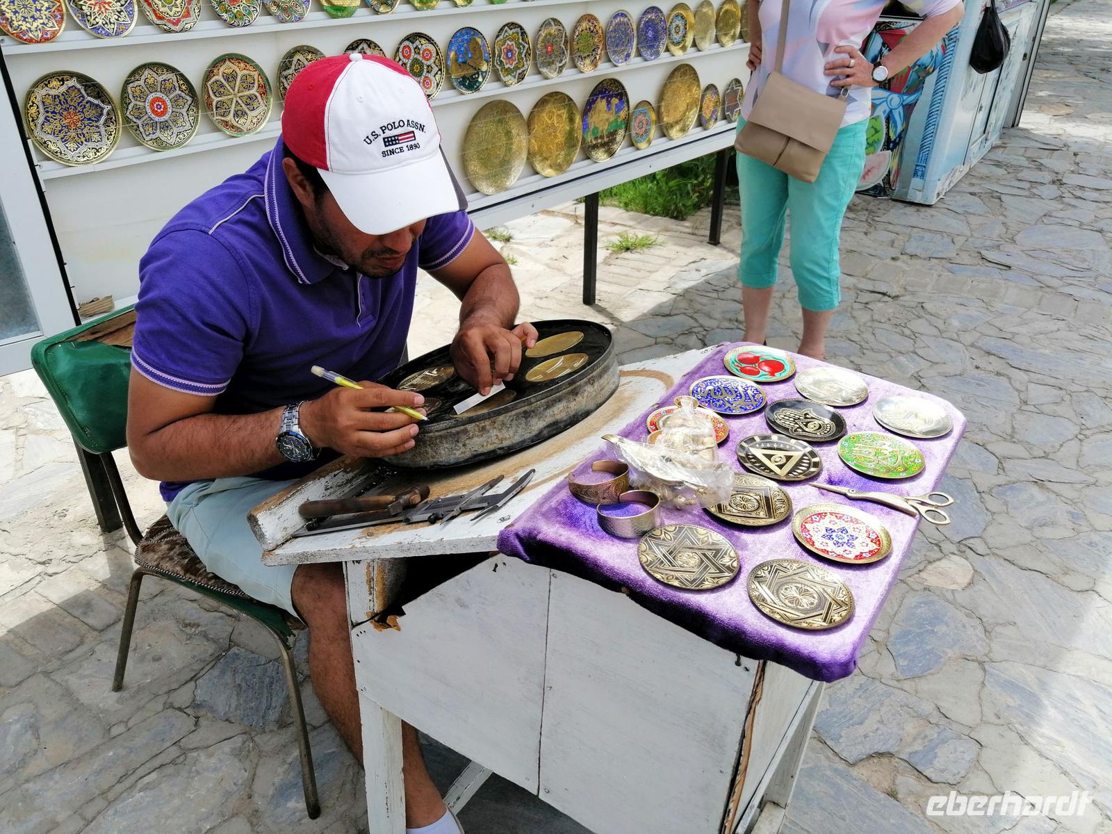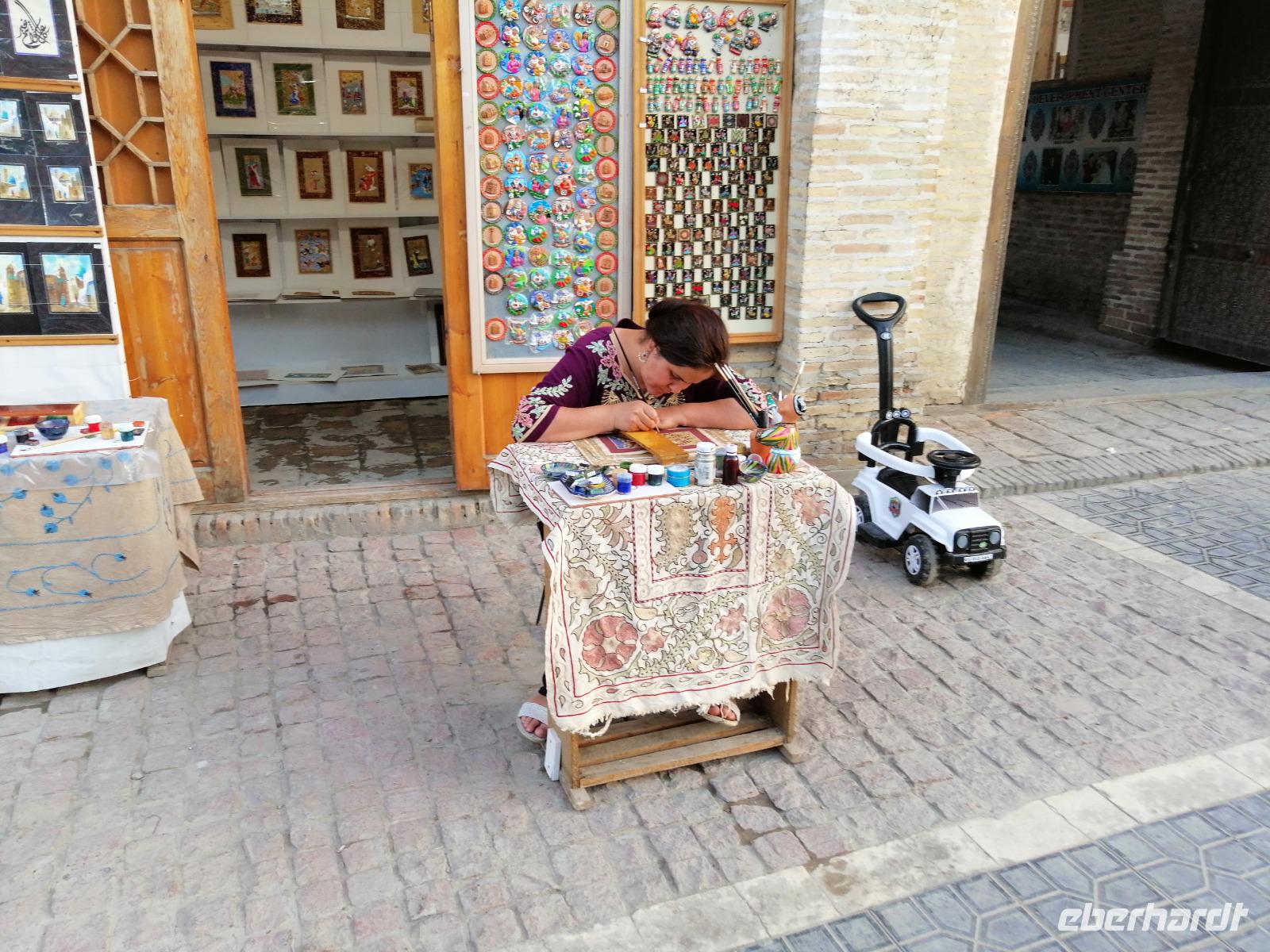 Heute nahmen wir uns vor Buchara, die Stadt der Gelehrten zu erkunden. Unser Stadtrundgang begann am Divan Begi Platz, am Stadtteich. Ilhom erzählte uns über die Maulbeerbäume, die hier in Usbekistan seit Jahrhunderten vor allem für die Produktion von Seide eine große Rolle spielen. Danach besichtigten wir die Khanaka Divan-Begi Medresse, in der sich das Keramikmuseum befand. Dort bewunderten wir nicht nur Keramikfunde, sondern auch die Kunst der Kalligraphie. Anschließend gingen wir durch eine überdachte Markthalle Karavan Sary Nugay aus dem 16. Jahrhundert, wo Schmuckhändler ihre Waren anboten. Danach besichtigten wir die Moschee Magoki Atori, die sich in einer Vertiefung mitten in der Altstadt befindet. Gleich nebenan schauten wir uns die Ausgrabungsstätte an, die als Memorial Kulturerbe ausgeschildert ist. Weiter ging es durch die weitere Makrthalle Taki-Telpak-Furushon: eine Werkstätte der Mützenmacher. Unterwegs hielten wir an einem Seidenteppichverkäufer an, wo Ilhom uns über die Seidenteppiche berichtet hatte. Gleich gegenüber befand sich ein Hamam (Dampfbad) für Männer. Wenig später besuchten wir schon eine Kunstwerkstatt von Davron Toshev: einem berühmten Maler von Buchara, der uns persönlich in seiner Werkstatt empfangen und mit grünem Tee bewirtet hat. Ilhom erzählte uns über die Besonderheiten seiner Malerei: beispielsweise Elefantenbilder, bestehend aus vielen anderen Tieren. Danach ging es in eine Markthalle, in der Frauenschmuck angeboten wurde. Ilhom stellte uns verschiedene Schmuckteile der Nomadenfrauen und Stadtfrauen direkt am Verkaufsstand eines Schmuckhändlers vor. Ein bisschen erschöpft durch die Wärme und viele neue spannende Informationen, erholten wir uns auf der Dachterrasse des Restaurants Chashmai-Mirob mit herrlichem Blick zum Pol Kaljan Komplex. Während des Mittagsessens erzählte uns Ilhom über die Geschichte des Komplexes. Wir fühlten uns sehr wohl im Schatten der Dachterrasse, wo sogar die Luft zusätzlich mit kühlem Wasserdampf besprüht wurde. Nachmittag besichtigten wir den Kaljan-Komplex, mit dem Wahrzeichen von Buchara: dem Kaljan-Minarett. Das Kaljan-Minarett ist 46 m hoch und ist das höchste Minarett in Zentralasien. Neben dem Minarett befindet sich die Kaljan-Moschee aus dem 16. Jahrhundert, in die bis 10.000 betende Gläubiger passen. Außerdem gehört auch die Miri Arab Medrese zum Koljan Komplex, in der auch heute noch Islamwissenschaften unterrichtet werden. Buchara war schon sehr früh ein bekanntes Zentrum von Wissenschaft und Kultur: denn hier lebten zahlreiche berühmte Gelehrte. Anschließend gingen wir über einen sehr großen Platz, Registan genannt zur Ark-Zitadelle. Die Zitadelle befindet sich auf einem künstlich aufgeschütteten Hügel und besteht aus verschiedenen Elementen: der Freitagsmoschee, dem Thronhof, dem Pferdehof, dem Gebäude des Premierministers und Museen. Einige Objekte besichtigten wir genauer. Abschließend besuchten wir die Bolo-Hauz Moschee. Houz bedeutet auf Usbekisch Teich: vor der Moschee befindet sich auch ein Teich, der älter als die Moschee (Bj. 1712) selbst sein soll.