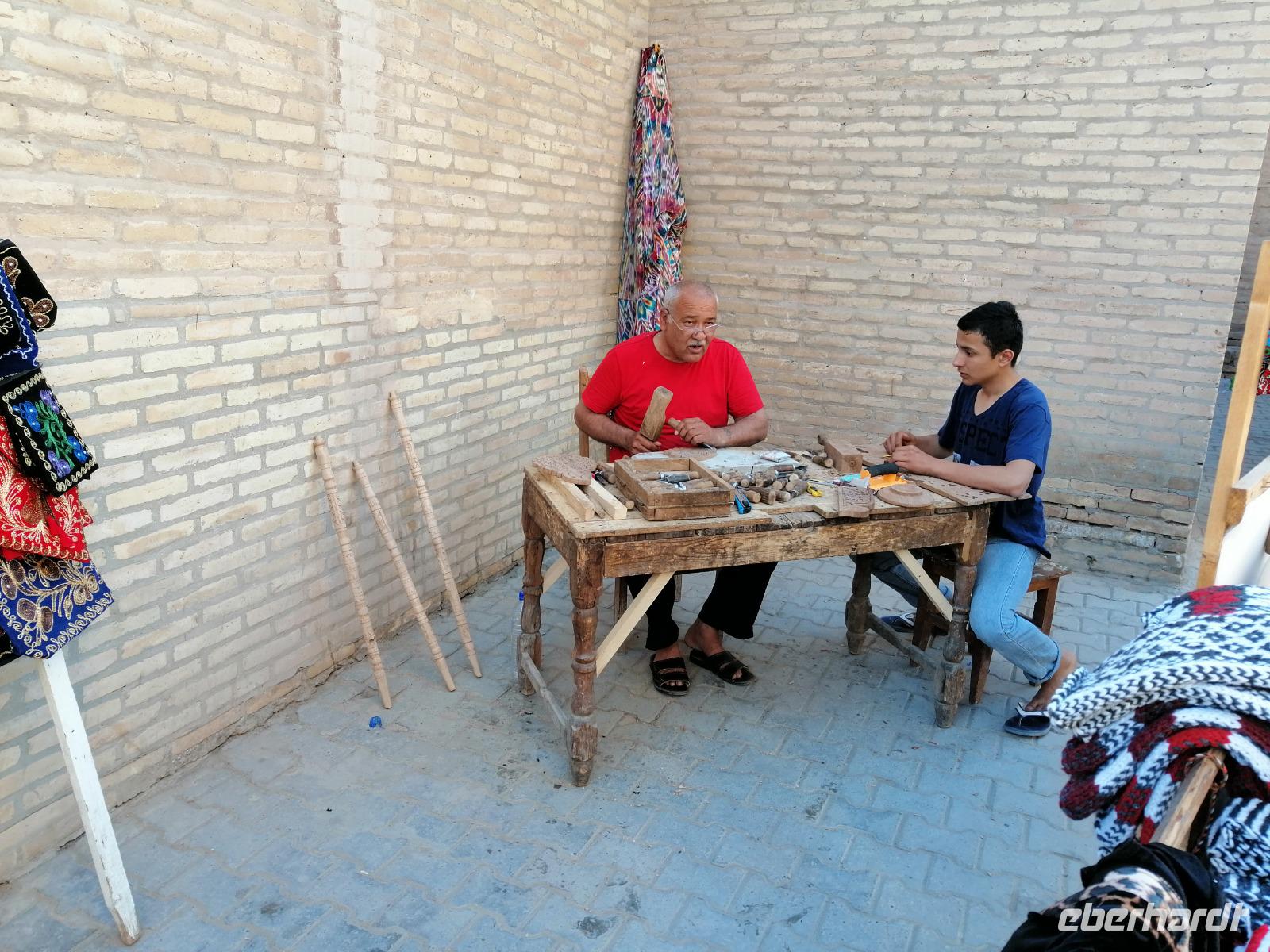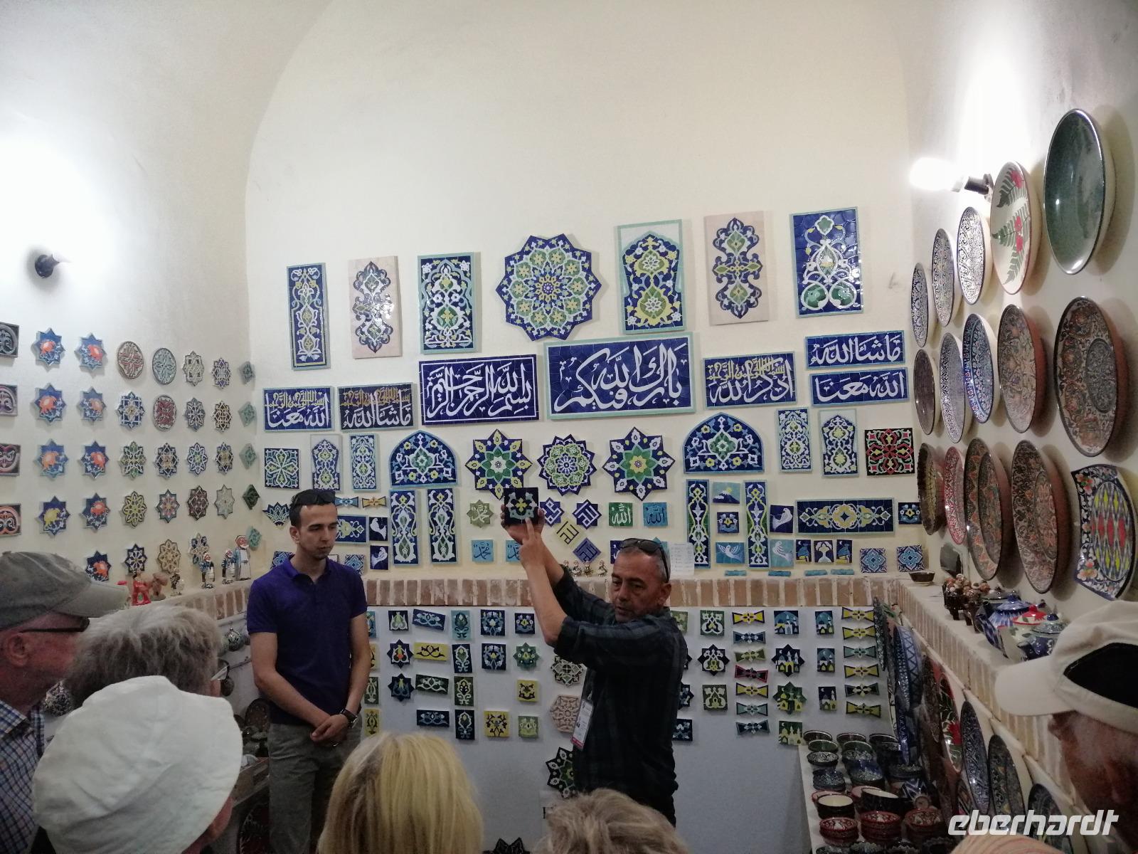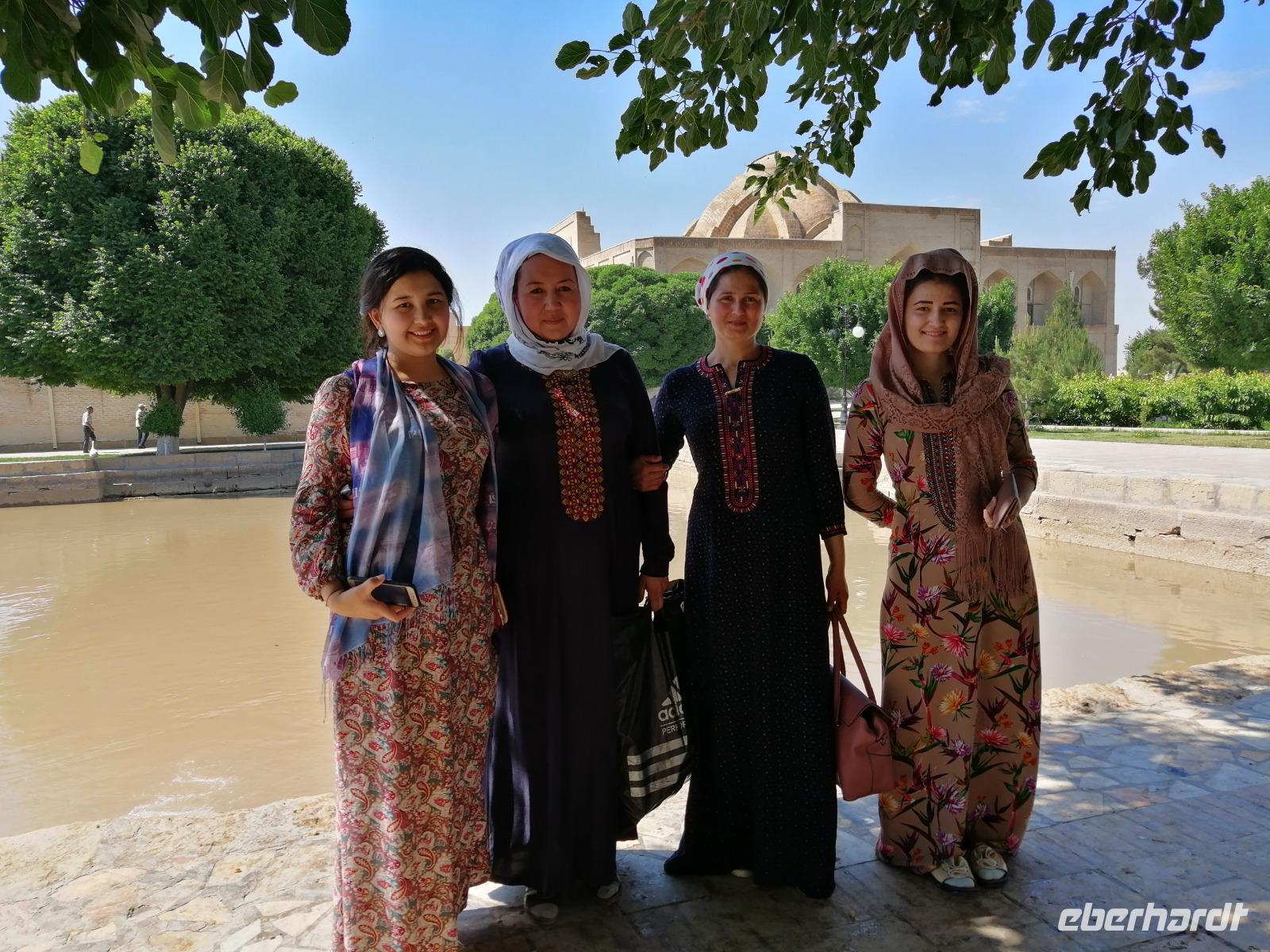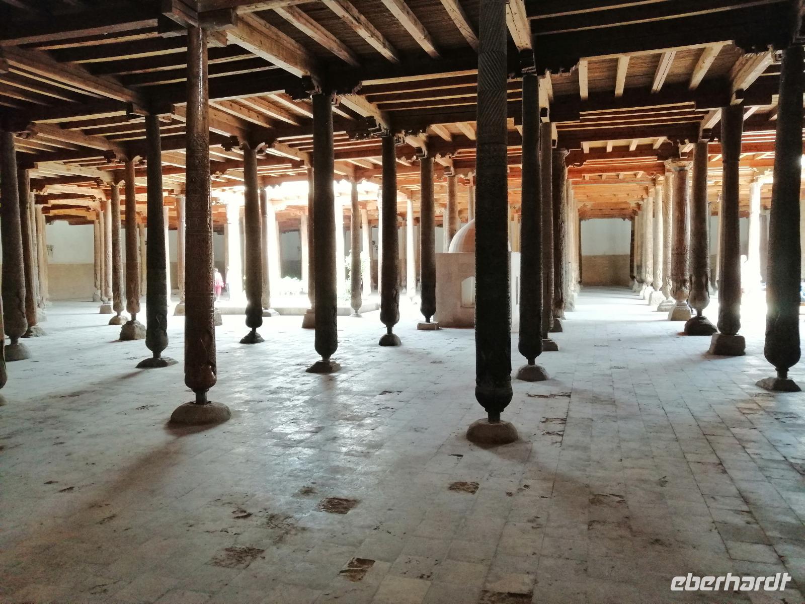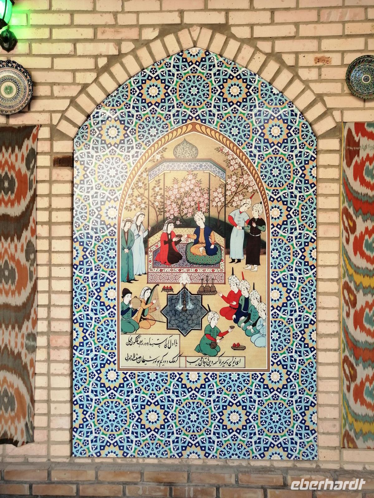 Heute nahmen wir uns vor Buchara, die Stadt der Gelehrten zu erkunden. Unser Stadtrundgang begann am Divan Begi Platz, am Stadtteich. Ilhom erzählte uns über die Maulbeerbäume, die hier in Usbekistan seit Jahrhunderten vor allem für die Produktion von Seide eine große Rolle spielen. Danach besichtigten wir die Khanaka Divan-Begi Medresse, in der sich das Keramikmuseum befand. Dort bewunderten wir nicht nur Keramikfunde, sondern auch die Kunst der Kalligraphie. Anschließend gingen wir durch eine überdachte Markthalle Karavan Sary Nugay aus dem 16. Jahrhundert, wo Schmuckhändler ihre Waren anboten. Danach besichtigten wir die Moschee Magoki Atori, die sich in einer Vertiefung mitten in der Altstadt befindet. Gleich nebenan schauten wir uns die Ausgrabungsstätte an, die als Memorial Kulturerbe ausgeschildert ist. Weiter ging es durch die weitere Makrthalle Taki-Telpak-Furushon: eine Werkstätte der Mützenmacher. Unterwegs hielten wir an einem Seidenteppichverkäufer an, wo Ilhom uns über die Seidenteppiche berichtet hatte. Gleich gegenüber befand sich ein Hamam (Dampfbad) für Männer. Wenig später besuchten wir schon eine Kunstwerkstatt von Davron Toshev: einem berühmten Maler von Buchara, der uns persönlich in seiner Werkstatt empfangen und mit grünem Tee bewirtet hat. Ilhom erzählte uns über die Besonderheiten seiner Malerei: beispielsweise Elefantenbilder, bestehend aus vielen anderen Tieren. Danach ging es in eine Markthalle, in der Frauenschmuck angeboten wurde. Ilhom stellte uns verschiedene Schmuckteile der Nomadenfrauen und Stadtfrauen direkt am Verkaufsstand eines Schmuckhändlers vor. Ein bisschen erschöpft durch die Wärme und viele neue spannende Informationen, erholten wir uns auf der Dachterrasse des Restaurants Chashmai-Mirob mit herrlichem Blick zum Pol Kaljan Komplex. Während des Mittagsessens erzählte uns Ilhom über die Geschichte des Komplexes. Wir fühlten uns sehr wohl im Schatten der Dachterrasse, wo sogar die Luft zusätzlich mit kühlem Wasserdampf besprüht wurde. Nachmittag besichtigten wir den Kaljan-Komplex, mit dem Wahrzeichen von Buchara: dem Kaljan-Minarett. Das Kaljan-Minarett ist 46 m hoch und ist das höchste Minarett in Zentralasien. Neben dem Minarett befindet sich die Kaljan-Moschee aus dem 16. Jahrhundert, in die bis 10.000 betende Gläubiger passen. Außerdem gehört auch die Miri Arab Medrese zum Koljan Komplex, in der auch heute noch Islamwissenschaften unterrichtet werden. Buchara war schon sehr früh ein bekanntes Zentrum von Wissenschaft und Kultur: denn hier lebten zahlreiche berühmte Gelehrte. Anschließend gingen wir über einen sehr großen Platz, Registan genannt zur Ark-Zitadelle. Die Zitadelle befindet sich auf einem künstlich aufgeschütteten Hügel und besteht aus verschiedenen Elementen: der Freitagsmoschee, dem Thronhof, dem Pferdehof, dem Gebäude des Premierministers und Museen. Einige Objekte besichtigten wir genauer. Abschließend besuchten wir die Bolo-Hauz Moschee. Houz bedeutet auf Usbekisch Teich: vor der Moschee befindet sich auch ein Teich, der älter als die Moschee (Bj. 1712) selbst sein soll.