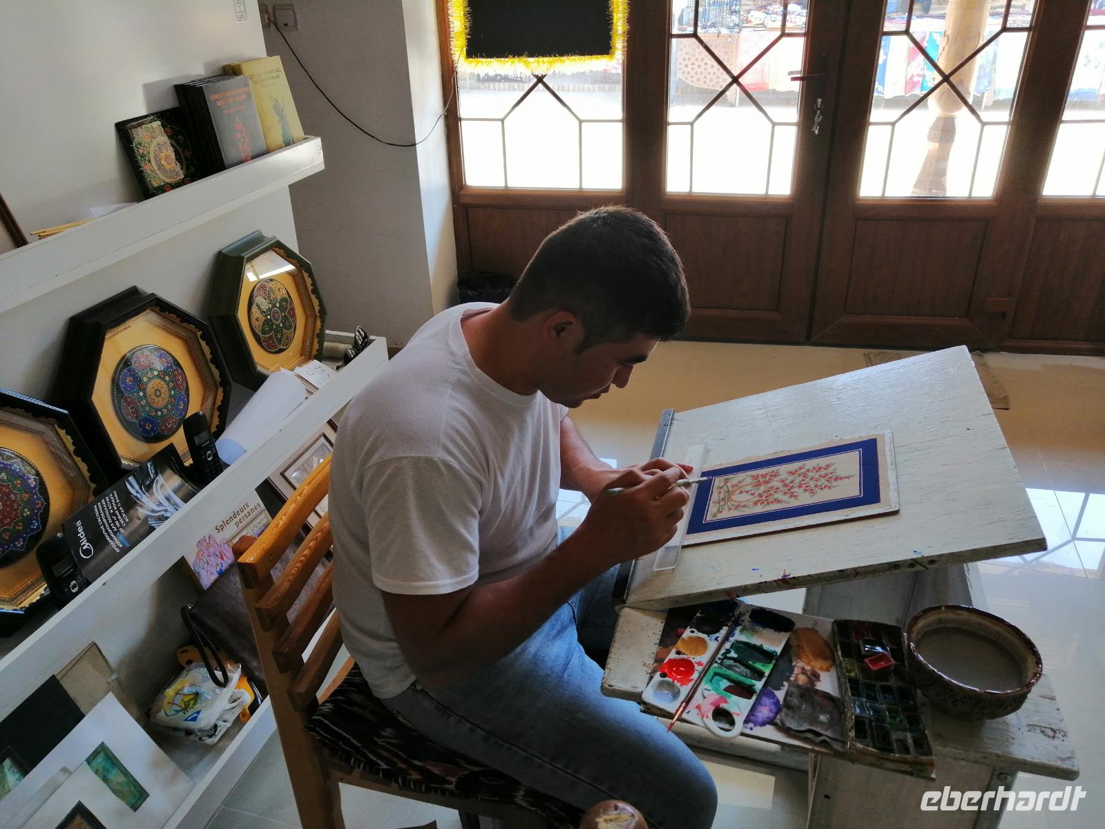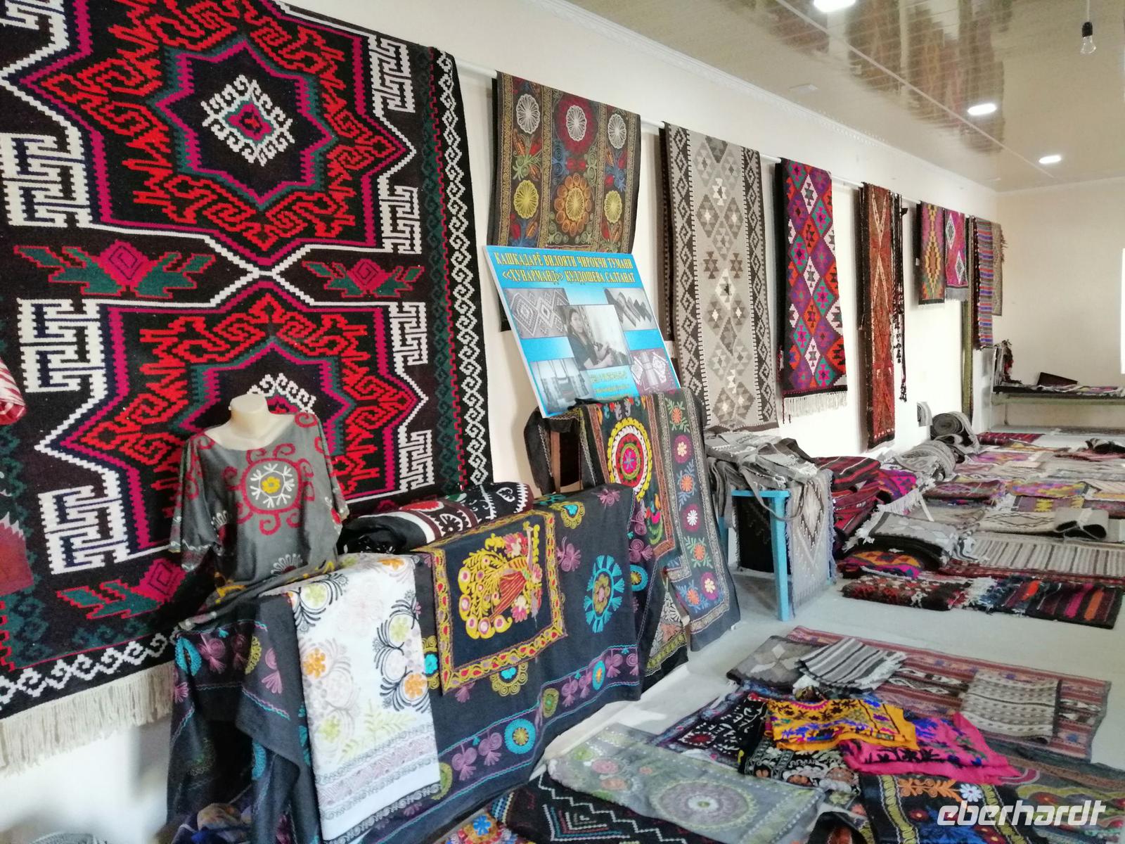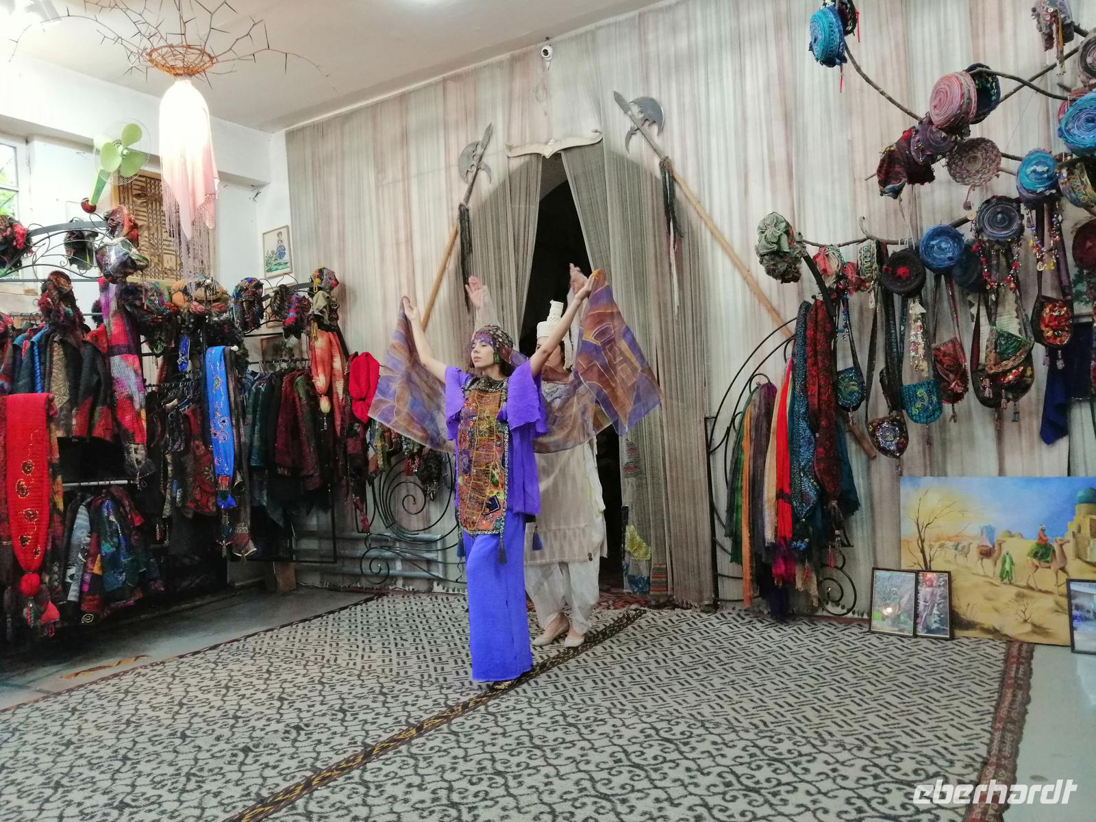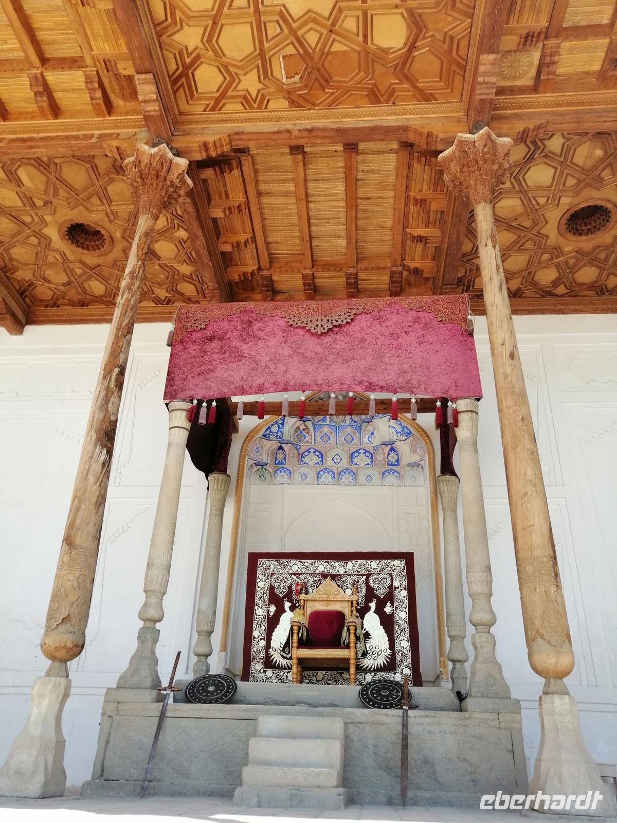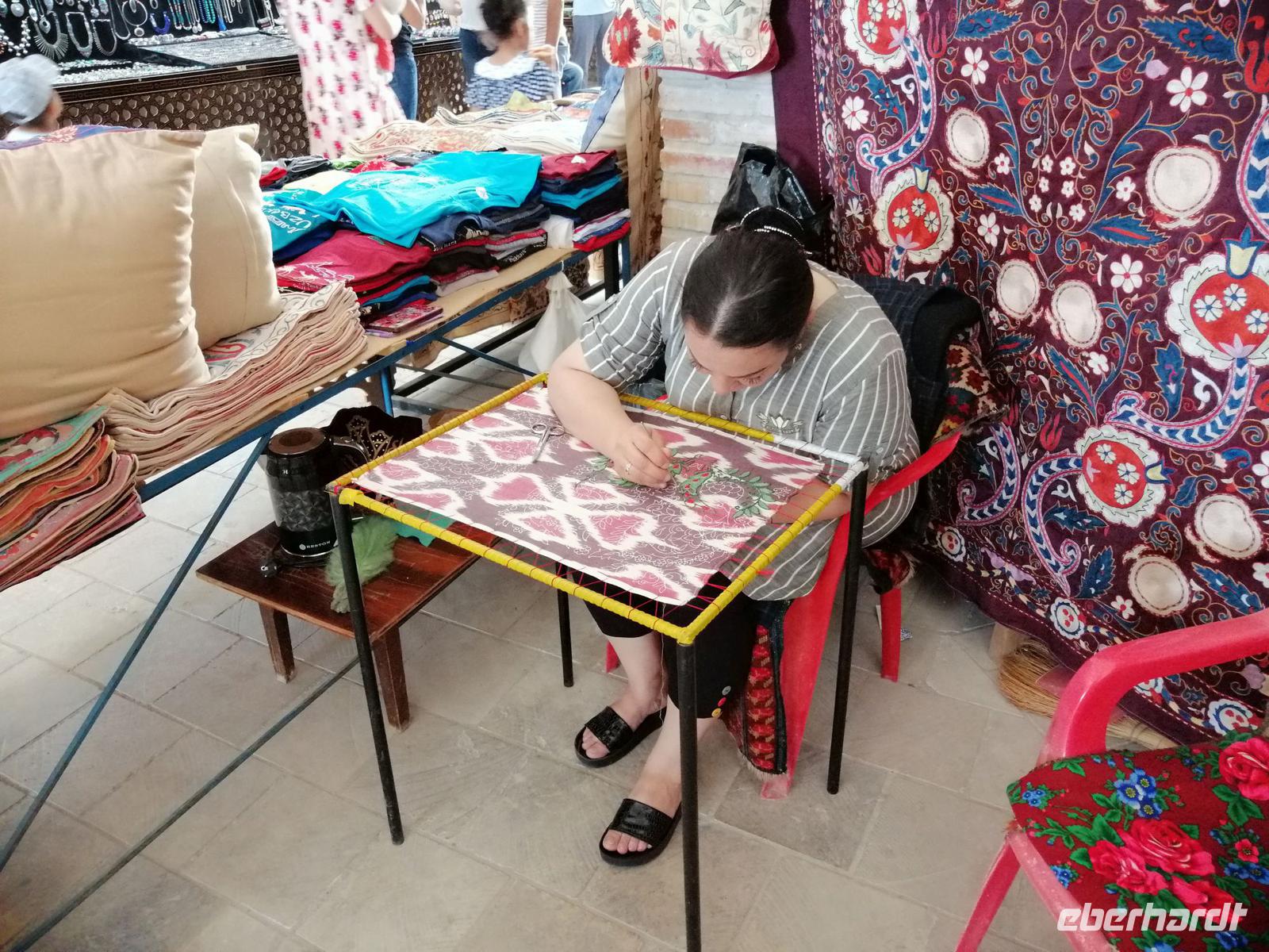 Heute nahmen wir uns vor Buchara, die Stadt der Gelehrten zu erkunden. Unser Stadtrundgang begann am Divan Begi Platz, am Stadtteich. Ilhom erzählte uns über die Maulbeerbäume, die hier in Usbekistan seit Jahrhunderten vor allem für die Produktion von Seide eine große Rolle spielen. Danach besichtigten wir die Khanaka Divan-Begi Medresse, in der sich das Keramikmuseum befand. Dort bewunderten wir nicht nur Keramikfunde, sondern auch die Kunst der Kalligraphie. Anschließend gingen wir durch eine überdachte Markthalle Karavan Sary Nugay aus dem 16. Jahrhundert, wo Schmuckhändler ihre Waren anboten. Danach besichtigten wir die Moschee Magoki Atori, die sich in einer Vertiefung mitten in der Altstadt befindet. Gleich nebenan schauten wir uns die Ausgrabungsstätte an, die als Memorial Kulturerbe ausgeschildert ist. Weiter ging es durch die weitere Makrthalle Taki-Telpak-Furushon: eine Werkstätte der Mützenmacher. Unterwegs hielten wir an einem Seidenteppichverkäufer an, wo Ilhom uns über die Seidenteppiche berichtet hatte. Gleich gegenüber befand sich ein Hamam (Dampfbad) für Männer. Wenig später besuchten wir schon eine Kunstwerkstatt von Davron Toshev: einem berühmten Maler von Buchara, der uns persönlich in seiner Werkstatt empfangen und mit grünem Tee bewirtet hat. Ilhom erzählte uns über die Besonderheiten seiner Malerei: beispielsweise Elefantenbilder, bestehend aus vielen anderen Tieren. Danach ging es in eine Markthalle, in der Frauenschmuck angeboten wurde. Ilhom stellte uns verschiedene Schmuckteile der Nomadenfrauen und Stadtfrauen direkt am Verkaufsstand eines Schmuckhändlers vor. Ein bisschen erschöpft durch die Wärme und viele neue spannende Informationen, erholten wir uns auf der Dachterrasse des Restaurants Chashmai-Mirob mit herrlichem Blick zum Pol Kaljan Komplex. Während des Mittagsessens erzählte uns Ilhom über die Geschichte des Komplexes. Wir fühlten uns sehr wohl im Schatten der Dachterrasse, wo sogar die Luft zusätzlich mit kühlem Wasserdampf besprüht wurde. Nachmittag besichtigten wir den Kaljan-Komplex, mit dem Wahrzeichen von Buchara: dem Kaljan-Minarett. Das Kaljan-Minarett ist 46 m hoch und ist das höchste Minarett in Zentralasien. Neben dem Minarett befindet sich die Kaljan-Moschee aus dem 16. Jahrhundert, in die bis 10.000 betende Gläubiger passen. Außerdem gehört auch die Miri Arab Medrese zum Koljan Komplex, in der auch heute noch Islamwissenschaften unterrichtet werden. Buchara war schon sehr früh ein bekanntes Zentrum von Wissenschaft und Kultur: denn hier lebten zahlreiche berühmte Gelehrte. Anschließend gingen wir über einen sehr großen Platz, Registan genannt zur Ark-Zitadelle. Die Zitadelle befindet sich auf einem künstlich aufgeschütteten Hügel und besteht aus verschiedenen Elementen: der Freitagsmoschee, dem Thronhof, dem Pferdehof, dem Gebäude des Premierministers und Museen. Einige Objekte besichtigten wir genauer. Abschließend besuchten wir die Bolo-Hauz Moschee. Houz bedeutet auf Usbekisch Teich: vor der Moschee befindet sich auch ein Teich, der älter als die Moschee (Bj. 1712) selbst sein soll.