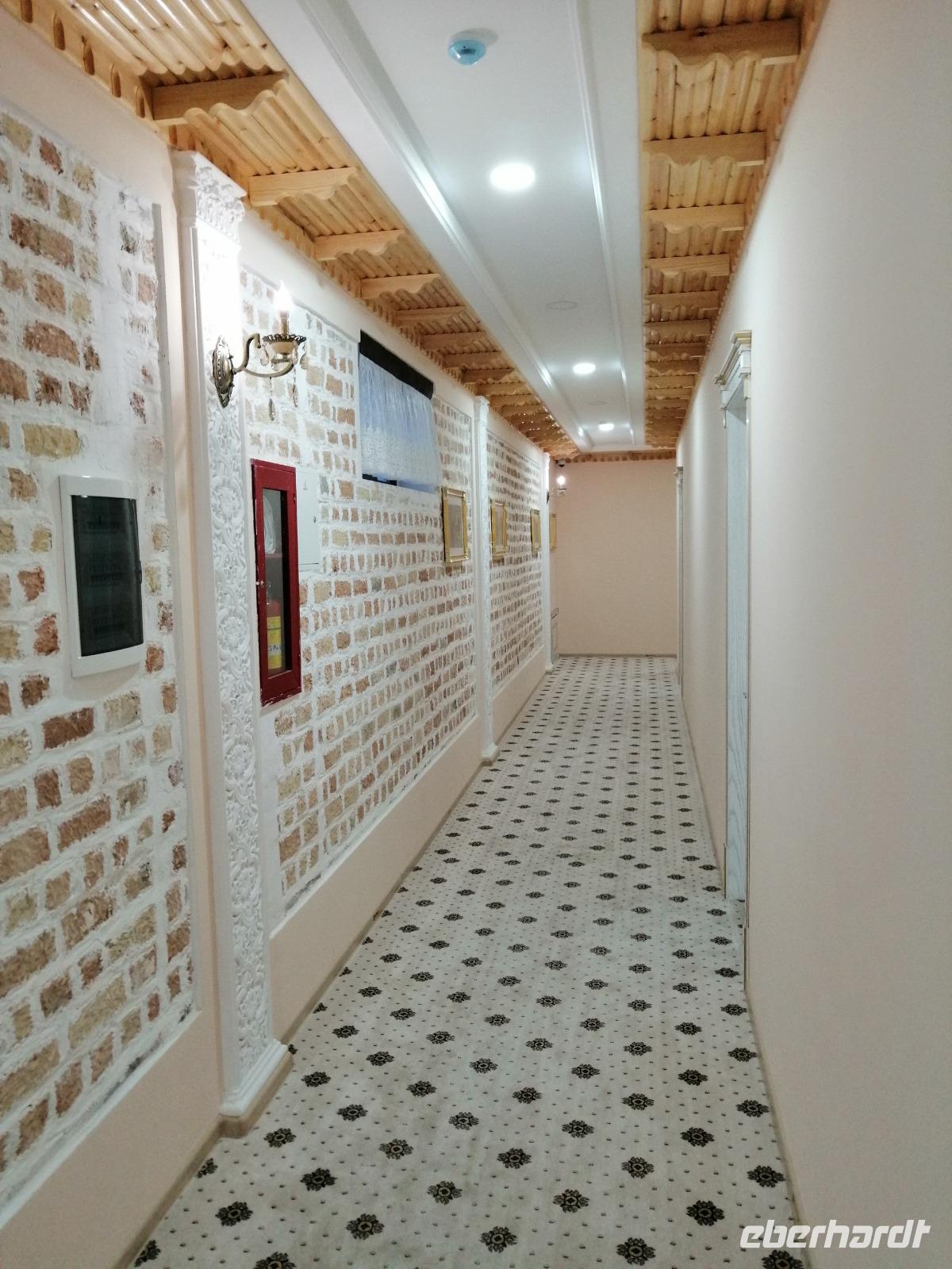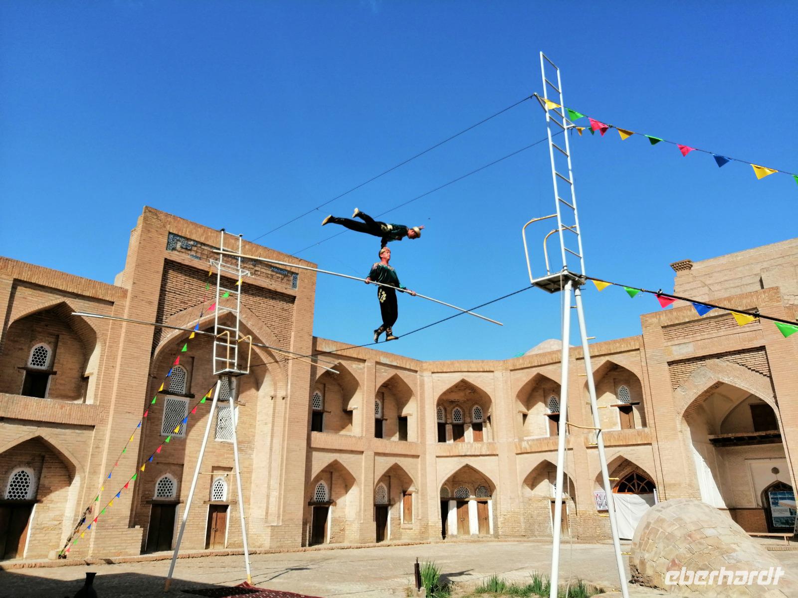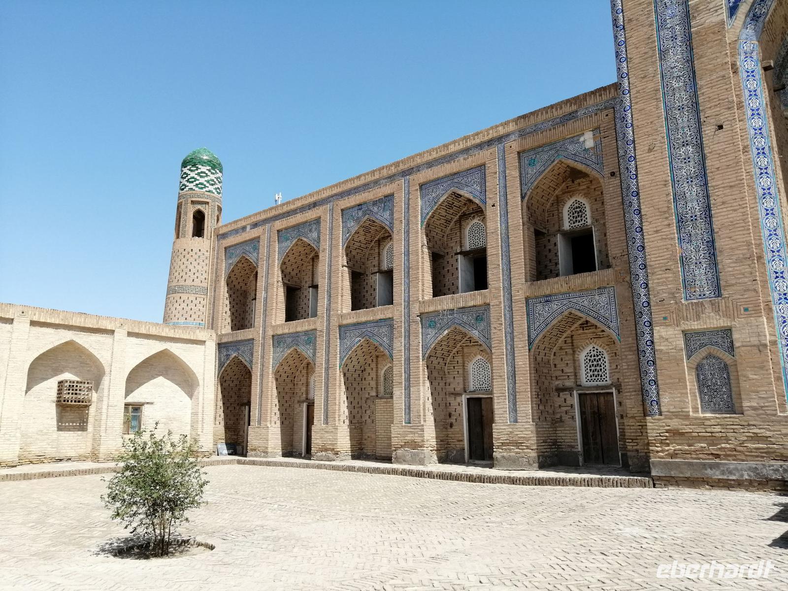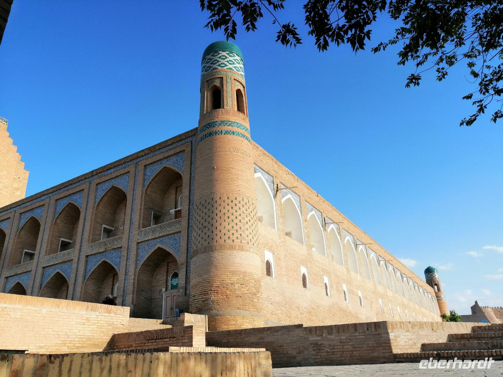Der Weckrufservice des Hotels weckte uns bereit um 4 Uhr früh morgens. Nach einem leichten Frühstück an der Hotelbar, fuhren wir mit unserem Bus zum Flughafen und flogen mit Uzbekistan Airways nach Urgentsch. Der Flug dauerte knapp eine Stunde. Das Wetter war sehr angenehm. In Chiwa kamen wir schon gegen 10 Uhr im Hotel Malika Kheivak an. Es handelte sich um ein kleines, landestypisches Hotel mitten in der Altstadt. Da wir noch zu zeitig im Hotel waren und unsere Zimmer noch nicht beziehen konnten, stellten wir unsere Koffer im Hotel ab und unternahmen einen kleinen Spaziergang durch die Altstadt von Chiwa. Nach einer kurzen Tee- und Suppenpause im gemütlichen und schattigen Restaurant Farrux besichtigten wir die berühmte Djuma Moschee, mit 213 geschnitzten Säulen aus dem 10. Jahrhundert. Das Licht kommt in die Moschee nur durch zwei Öffnungen in der Decke. Hier erzählte uns Ilhom über die Geschichte der Stadt. Die Altstadt von Chiwa ähnelt einem sehr großen Freilichtmuseum, mit vielem Medresen und Moscheen, kleinen Gassen und Märkten. Ilhom erzählte uns, dass das Alter der Stadt mit über 2.500 Jahren geschätzt wird. Bereits im 6. Jahrhundert vor Christus spielte die Stadt eine bedeutende Rolle an der Seidenstraße. Hier kamen Karawanen mit Kaufläuten und kostbaren Seidenballen aus China und anderen Ländern vorbei. Vermutlich auch die günstige Lage der Stadt, im Flussaue der Amudarja, machte sie zur Hauptstadt des Chanats Choresm: denn ohne Wasser konnte hier, mitten in der Wüste, kein Menschenleben sich so stark entwickeln. Nachdem wir unser Hotel bezogen und uns etwas erholt haben, begann gegen 13 Uhr unser Stadtrundgang. Zuerst bewunderten wir das kurze Minarett auch Kalta Minor genannt neben der Amin-Khan-Medrese, die Mitte des 19. Jahrhunderts erbaut wurde. Im Innenhof der Medrese, in der heute sich das Hotel Orient Star befindet, erzählte uns Ilhom über das damalige Leben in so einer Medrese. Gleich gegenüber besichtigten wir die Kunja Ark Zitadelle: Wohnsitz der Khane von Chiwa. Die Zitadelle bestand aus einem großen Hof, in dem sich eine Freilichtbühne befindet und einem Thronsaal. Der Thronsaal bestand aus einem kleinen Innenhof, einer kreisförmigen Plattform, auf der in der kalten Jahreszeit eine Jurte stand und einem Aiwan, wo der Khan Audienz hielt. Besonders beeindruckend waren die wunderschönen Dekorationen an den Bauwerken, mit Majolika-Fliesen in den typischen Farben Blau, Weiß und Türkis verziert. Aber auch die fein geschnitzten Holzsäulen, mit tollen Schnitzmustern ließen unsere Augen flammen. Danach besuchten wir, gleich gegenüber, die Muhammad Rahim Khana Medresse, in der sich ein sehr sehenswertes Museum über Khanat Chiwa befindet. Dann gingen wir im rettenden Wandschatten der Medrese entlang zur nächsten Sehenswürdigkeit: Tasch-Hauli-Palast, in dem sich das Handwerksmuseum befand. Der Palast bestand aus einem Repräsentationshof, dem Gerichtshof und dem Harem. Ilhom erzählte uns über das Leben der Frauen im Harem und beantwortete unseren Fragen. Die rettende Tee-Pause im kunstvoll ausgestatteten Restaurant Khorezm Art brach uns die nötige Erfrischung und Stärkung, bevor wir die Zirkusfamilie Darbozschi in der Medrese Feruz Khan gegen 16 Uhr besuchten. Die Zirkusakrobaten, die schon in der dritten Generation auftreten, begeisterten uns mit ihrem Können bei über 30 Grad Hitze. Schließlich besichtigten wir den Islam Hodja Komplex, in dem sich das sehr interessante Museum der angewandte Kunst von Choresm befand. Dort erzählte uns Ilhom über die Geschichte der verschiedenen Sprachen und vor allem Schriften der damaligen Zeit. Den wunderschönen Tag beendeten wir im orientalischen Restaurant Zerafshan unter freiem Himmel, gleich neben unserem Hotel. Die vielen Eindrücke und die märchenhafte Stadt Chiwa haben uns verzaubert und wir wären gern noch eine Nacht länger in Chiwa geblieben, um die Altstadt dann noch bewusster erkunden zu können. Aber unsere Rundreise entlang der Seidenstraße geht ja morgen schon wieder weiter!