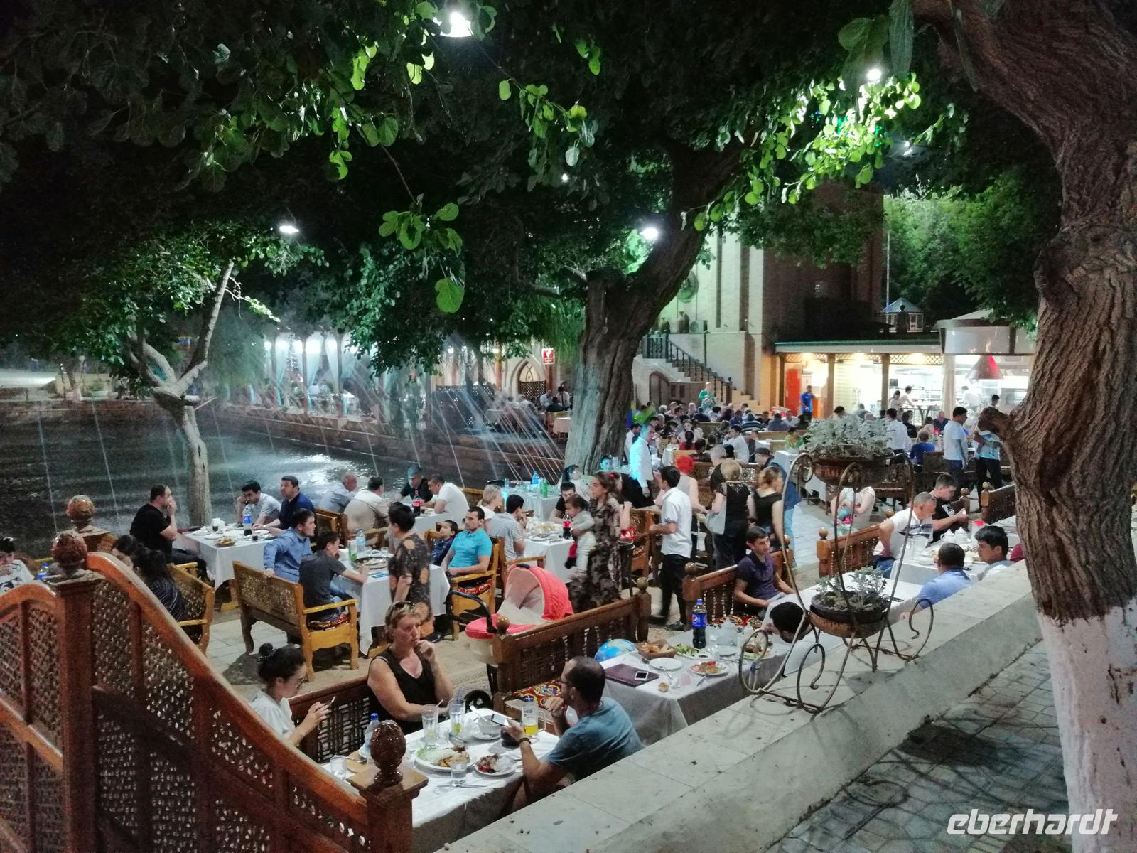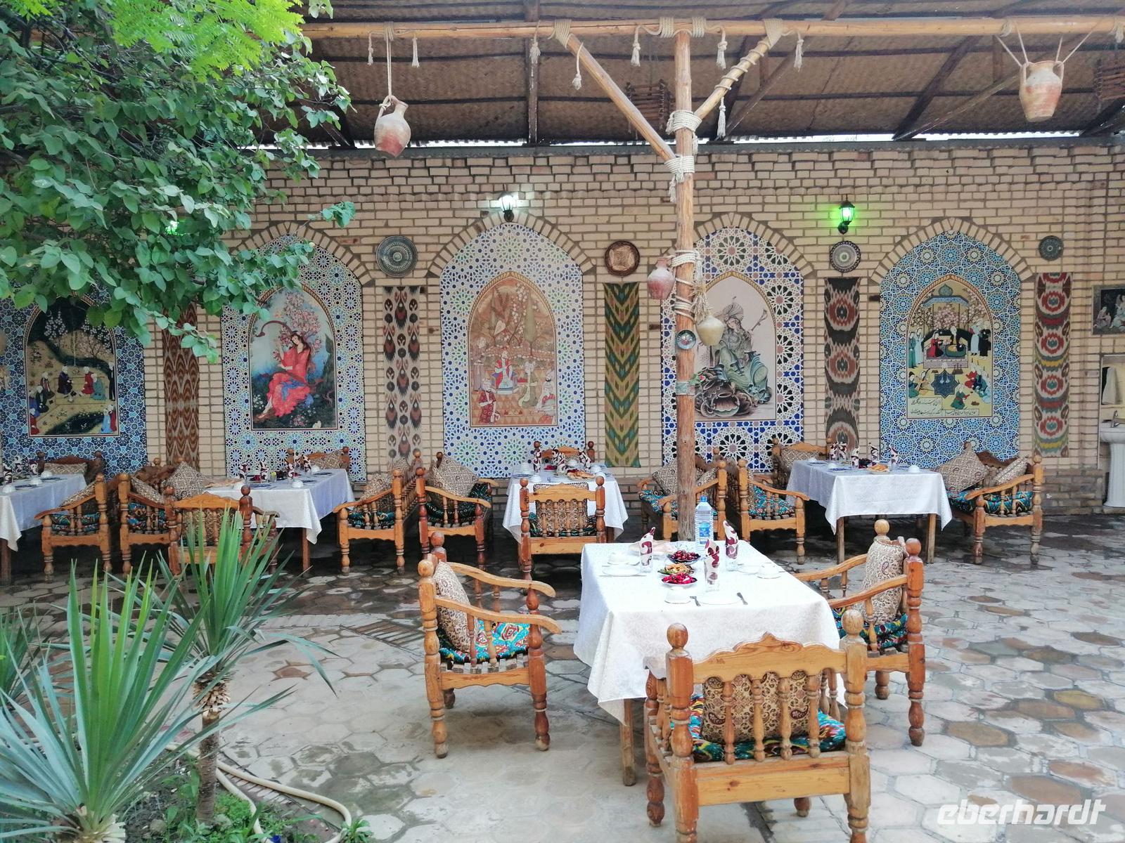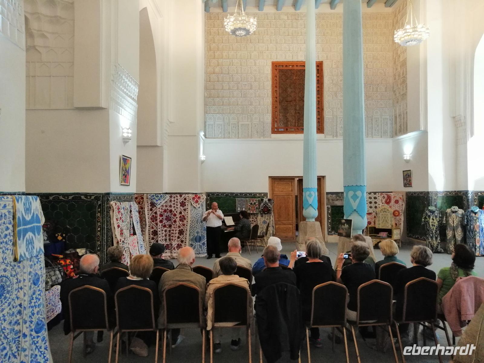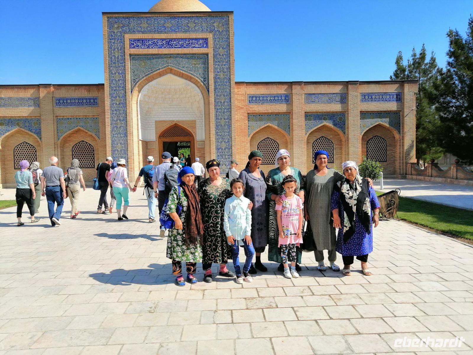 Nach dem leckeren Frühstück starteten wir unsere heutige Erkundung der Umgebung von Buchara mit der Besichtigung des Bobi-Islom-Darvozasi-Komplexes. Diese wunderschöne Anlage ist dem Stadtheiligen von Buchara, dem Bahuddin Nakschbad gewidmet, dem Gründer des muslimischen Sufi-Ordens (Sufismus) . Der Komplex besteht aus einem Mausoleum, einer Moschee, einer Medrese und vielen Teichanlagen und Gärten. Im Innenhof des Mausoleums steht ein sehr großer alter Maulbeerbaum. Auf den Bänken unter dem Baum beteten die Gläubiger und steckten dann ihre Spenden in eine Urne rein. Ilhom erklärte uns übe die Bedeutung von so genanntem Fahnenmast und Rosshaarwimpel. Anschließend besuchten wir das Museum der angewandten Kunst im Sommerpalast der letzten Emire von Buchara: Sitora Mokhi - Hossa. Kunst- und Teppichhändler im Innenhof baten ihre Waren an. Danach schauten wir uns mitten in einem grünen Vergnügungspark das Mausoleum der Samaniden-Dynastie an, das in der Regierungszeit von Ismail Samani (892-907) entstand. Die künstlichen Verfahren, auf denen das Mausoleum beruht (ungebrannter Lehmziegel, Holz) reichen vermutlich in die vorarabische Zeit zurück. Wir bewunderten den außergewöhnlichen Backsteinbau, wo die Backsteine flach, übereck, senkrecht, diagonal, im Fischgrätenmuster und hervorstechend liegen. Abschließend besichtigten wir in Kischlak (Dorf) Sumitan die große Nekropole Chor Bark. Das Ensemble besteht aus drei Teilen: Chanaka, Medrese und Moschee und vielen Grabstätten. Ilhom erzählte uns, dass immer mehr Gläubiger in der Nähe der Heiligen beerdigt werden wollen. Wir hatten etwas Zeit, um uns die gesamte Anlage in Ruhe anzuschauen und zwischen den alten Grabsteinen zu spazieren. Unser Kulturprogramm für heute endete in der jüdischen Synagoge, nicht weit von unserem Hotel. Zum Abendessen waren wir bei der Familie Rustam eingeladen: in einem dekorativ gestalteten Innenhof und mit einer landestypischen sehr leckeren Küche.