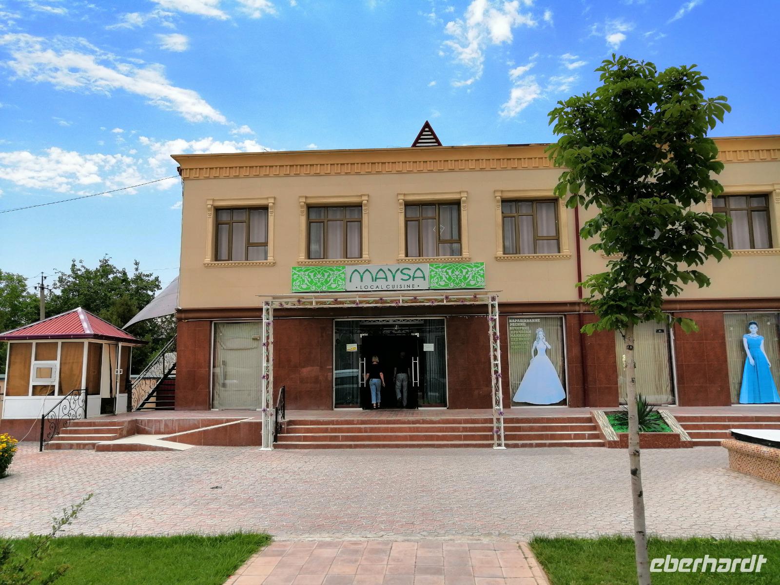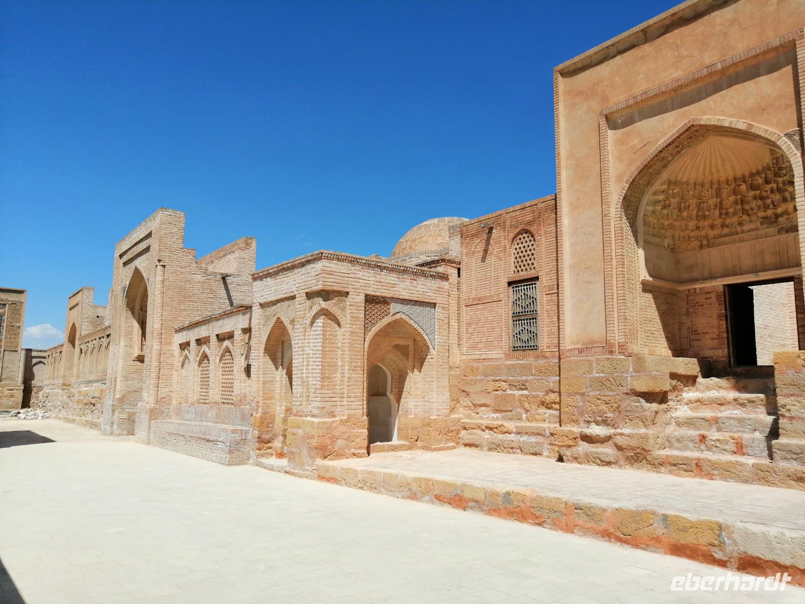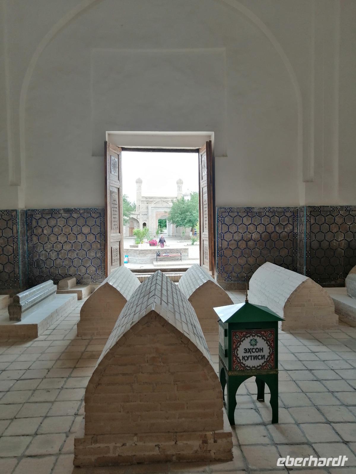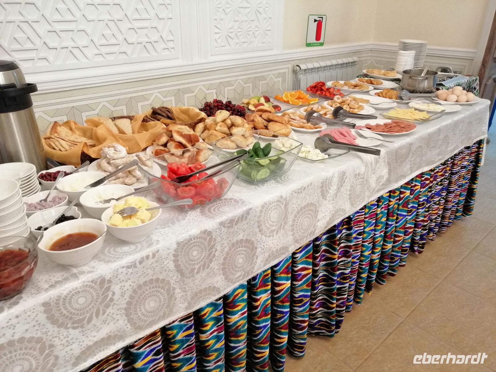 Nach dem leckeren Frühstück starteten wir unsere heutige Erkundung der Umgebung von Buchara mit der Besichtigung des Bobi-Islom-Darvozasi-Komplexes. Diese wunderschöne Anlage ist dem Stadtheiligen von Buchara, dem Bahuddin Nakschbad gewidmet, dem Gründer des muslimischen Sufi-Ordens (Sufismus) . Der Komplex besteht aus einem Mausoleum, einer Moschee, einer Medrese und vielen Teichanlagen und Gärten. Im Innenhof des Mausoleums steht ein sehr großer alter Maulbeerbaum. Auf den Bänken unter dem Baum beteten die Gläubiger und steckten dann ihre Spenden in eine Urne rein. Ilhom erklärte uns übe die Bedeutung von so genanntem Fahnenmast und Rosshaarwimpel. Anschließend besuchten wir das Museum der angewandten Kunst im Sommerpalast der letzten Emire von Buchara: Sitora Mokhi - Hossa. Kunst- und Teppichhändler im Innenhof baten ihre Waren an. Danach schauten wir uns mitten in einem grünen Vergnügungspark das Mausoleum der Samaniden-Dynastie an, das in der Regierungszeit von Ismail Samani (892-907) entstand. Die künstlichen Verfahren, auf denen das Mausoleum beruht (ungebrannter Lehmziegel, Holz) reichen vermutlich in die vorarabische Zeit zurück. Wir bewunderten den außergewöhnlichen Backsteinbau, wo die Backsteine flach, übereck, senkrecht, diagonal, im Fischgrätenmuster und hervorstechend liegen. Abschließend besichtigten wir in Kischlak (Dorf) Sumitan die große Nekropole Chor Bark. Das Ensemble besteht aus drei Teilen: Chanaka, Medrese und Moschee und vielen Grabstätten. Ilhom erzählte uns, dass immer mehr Gläubiger in der Nähe der Heiligen beerdigt werden wollen. Wir hatten etwas Zeit, um uns die gesamte Anlage in Ruhe anzuschauen und zwischen den alten Grabsteinen zu spazieren. Unser Kulturprogramm für heute endete in der jüdischen Synagoge, nicht weit von unserem Hotel. Zum Abendessen waren wir bei der Familie Rustam eingeladen: in einem dekorativ gestalteten Innenhof und mit einer landestypischen sehr leckeren Küche.
