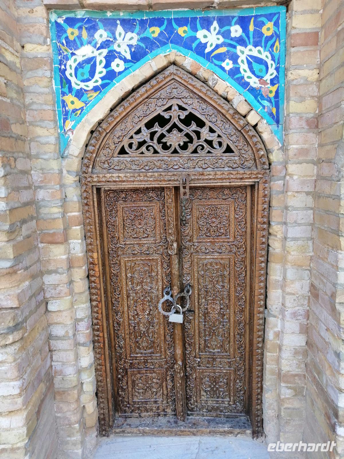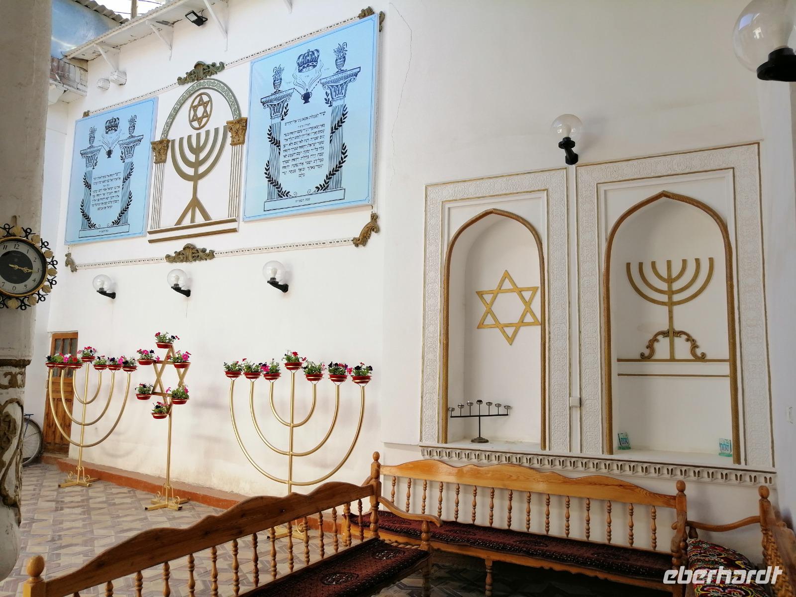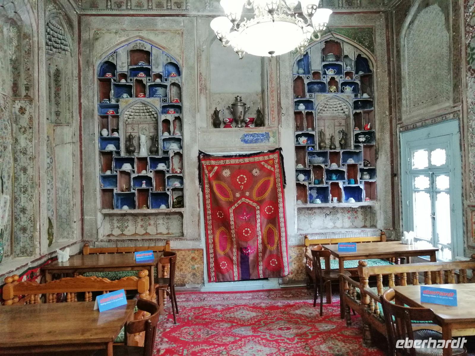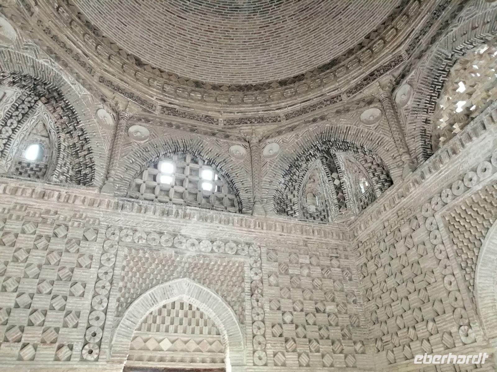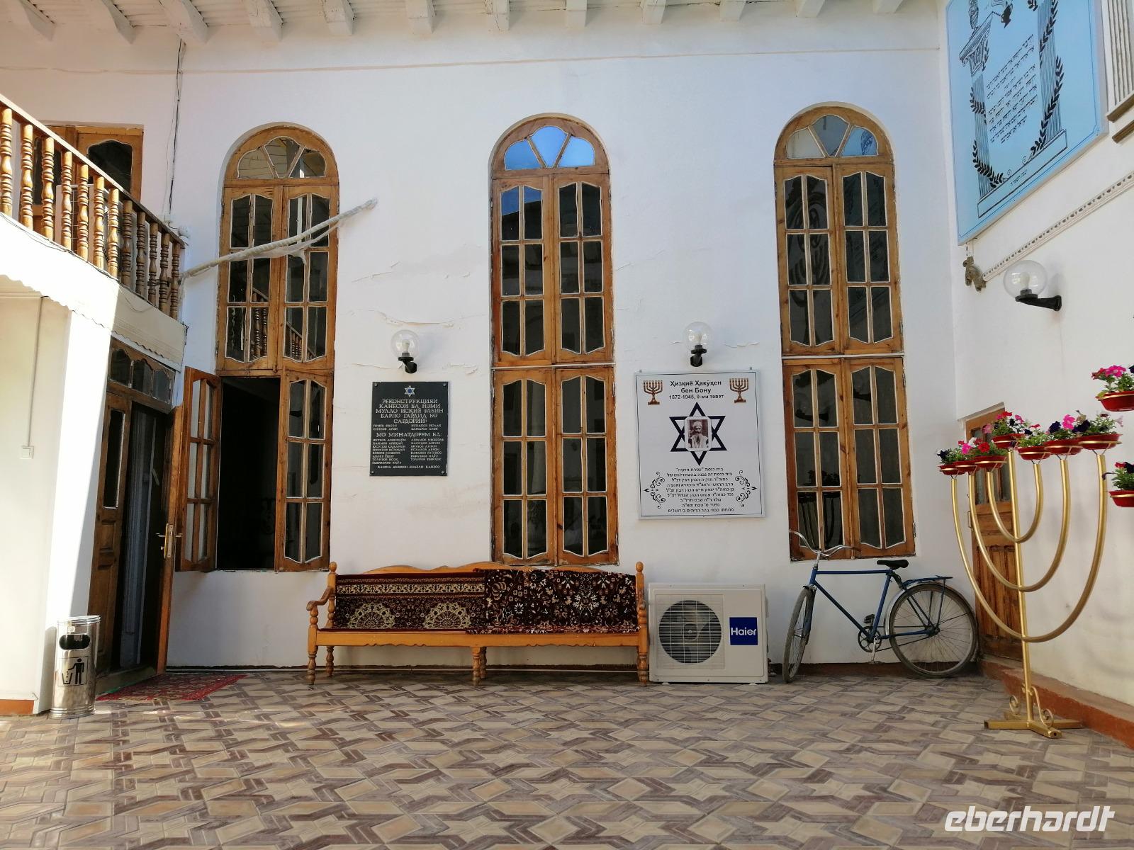 Nach dem leckeren Frühstück starteten wir unsere heutige Erkundung der Umgebung von Buchara mit der Besichtigung des Bobi-Islom-Darvozasi-Komplexes. Diese wunderschöne Anlage ist dem Stadtheiligen von Buchara, dem Bahuddin Nakschbad gewidmet, dem Gründer des muslimischen Sufi-Ordens (Sufismus) . Der Komplex besteht aus einem Mausoleum, einer Moschee, einer Medrese und vielen Teichanlagen und Gärten. Im Innenhof des Mausoleums steht ein sehr großer alter Maulbeerbaum. Auf den Bänken unter dem Baum beteten die Gläubiger und steckten dann ihre Spenden in eine Urne rein. Ilhom erklärte uns übe die Bedeutung von so genanntem Fahnenmast und Rosshaarwimpel. Anschließend besuchten wir das Museum der angewandten Kunst im Sommerpalast der letzten Emire von Buchara: Sitora Mokhi - Hossa. Kunst- und Teppichhändler im Innenhof baten ihre Waren an. Danach schauten wir uns mitten in einem grünen Vergnügungspark das Mausoleum der Samaniden-Dynastie an, das in der Regierungszeit von Ismail Samani (892-907) entstand. Die künstlichen Verfahren, auf denen das Mausoleum beruht (ungebrannter Lehmziegel, Holz) reichen vermutlich in die vorarabische Zeit zurück. Wir bewunderten den außergewöhnlichen Backsteinbau, wo die Backsteine flach, übereck, senkrecht, diagonal, im Fischgrätenmuster und hervorstechend liegen. Abschließend besichtigten wir in Kischlak (Dorf) Sumitan die große Nekropole Chor Bark. Das Ensemble besteht aus drei Teilen: Chanaka, Medrese und Moschee und vielen Grabstätten. Ilhom erzählte uns, dass immer mehr Gläubiger in der Nähe der Heiligen beerdigt werden wollen. Wir hatten etwas Zeit, um uns die gesamte Anlage in Ruhe anzuschauen und zwischen den alten Grabsteinen zu spazieren. Unser Kulturprogramm für heute endete in der jüdischen Synagoge, nicht weit von unserem Hotel. Zum Abendessen waren wir bei der Familie Rustam eingeladen: in einem dekorativ gestalteten Innenhof und mit einer landestypischen sehr leckeren Küche.