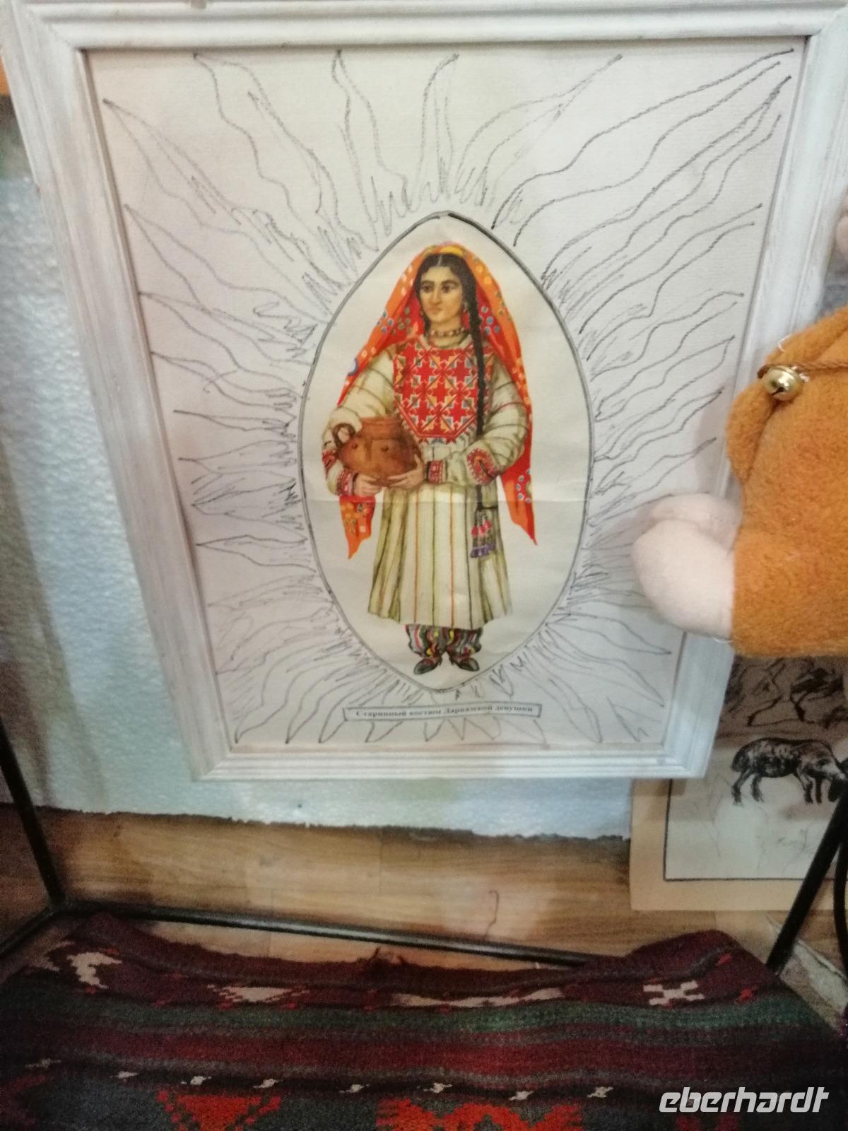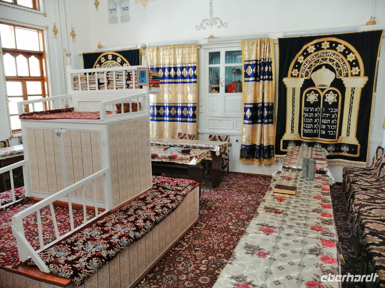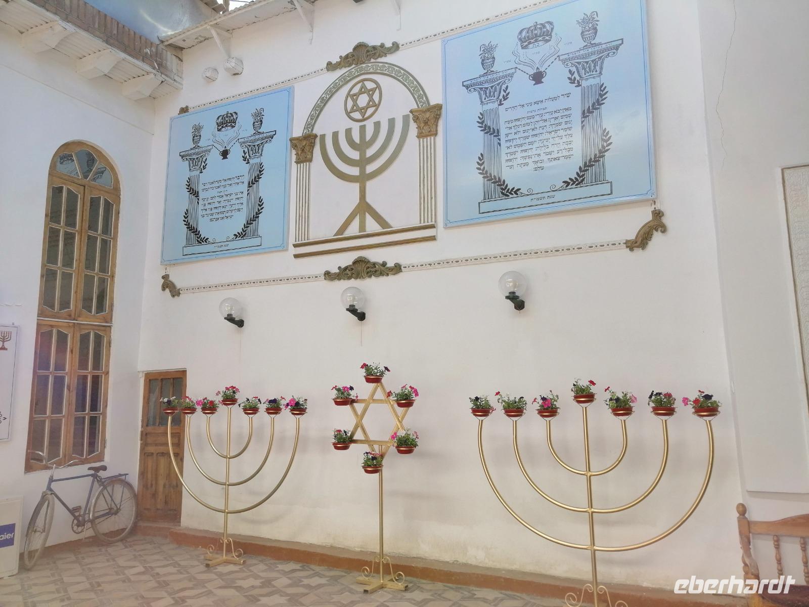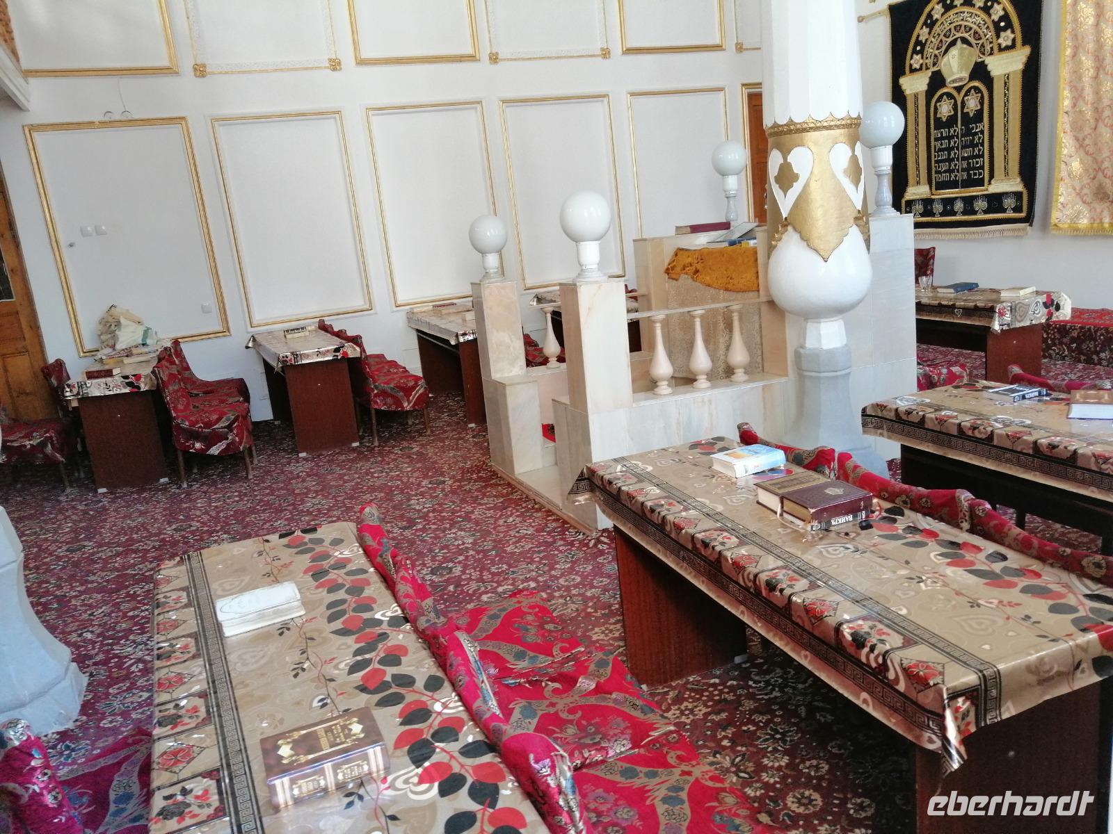 Nach dem leckeren Frühstück starteten wir unsere heutige Erkundung der Umgebung von Buchara mit der Besichtigung des Bobi-Islom-Darvozasi-Komplexes. Diese wunderschöne Anlage ist dem Stadtheiligen von Buchara, dem Bahuddin Nakschbad gewidmet, dem Gründer des muslimischen Sufi-Ordens (Sufismus) . Der Komplex besteht aus einem Mausoleum, einer Moschee, einer Medrese und vielen Teichanlagen und Gärten. Im Innenhof des Mausoleums steht ein sehr großer alter Maulbeerbaum. Auf den Bänken unter dem Baum beteten die Gläubiger und steckten dann ihre Spenden in eine Urne rein. Ilhom erklärte uns übe die Bedeutung von so genanntem Fahnenmast und Rosshaarwimpel. Anschließend besuchten wir das Museum der angewandten Kunst im Sommerpalast der letzten Emire von Buchara: Sitora Mokhi - Hossa. Kunst- und Teppichhändler im Innenhof baten ihre Waren an. Danach schauten wir uns mitten in einem grünen Vergnügungspark das Mausoleum der Samaniden-Dynastie an, das in der Regierungszeit von Ismail Samani (892-907) entstand. Die künstlichen Verfahren, auf denen das Mausoleum beruht (ungebrannter Lehmziegel, Holz) reichen vermutlich in die vorarabische Zeit zurück. Wir bewunderten den außergewöhnlichen Backsteinbau, wo die Backsteine flach, übereck, senkrecht, diagonal, im Fischgrätenmuster und hervorstechend liegen. Abschließend besichtigten wir in Kischlak (Dorf) Sumitan die große Nekropole Chor Bark. Das Ensemble besteht aus drei Teilen: Chanaka, Medrese und Moschee und vielen Grabstätten. Ilhom erzählte uns, dass immer mehr Gläubiger in der Nähe der Heiligen beerdigt werden wollen. Wir hatten etwas Zeit, um uns die gesamte Anlage in Ruhe anzuschauen und zwischen den alten Grabsteinen zu spazieren. Unser Kulturprogramm für heute endete in der jüdischen Synagoge, nicht weit von unserem Hotel. Zum Abendessen waren wir bei der Familie Rustam eingeladen: in einem dekorativ gestalteten Innenhof und mit einer landestypischen sehr leckeren Küche.