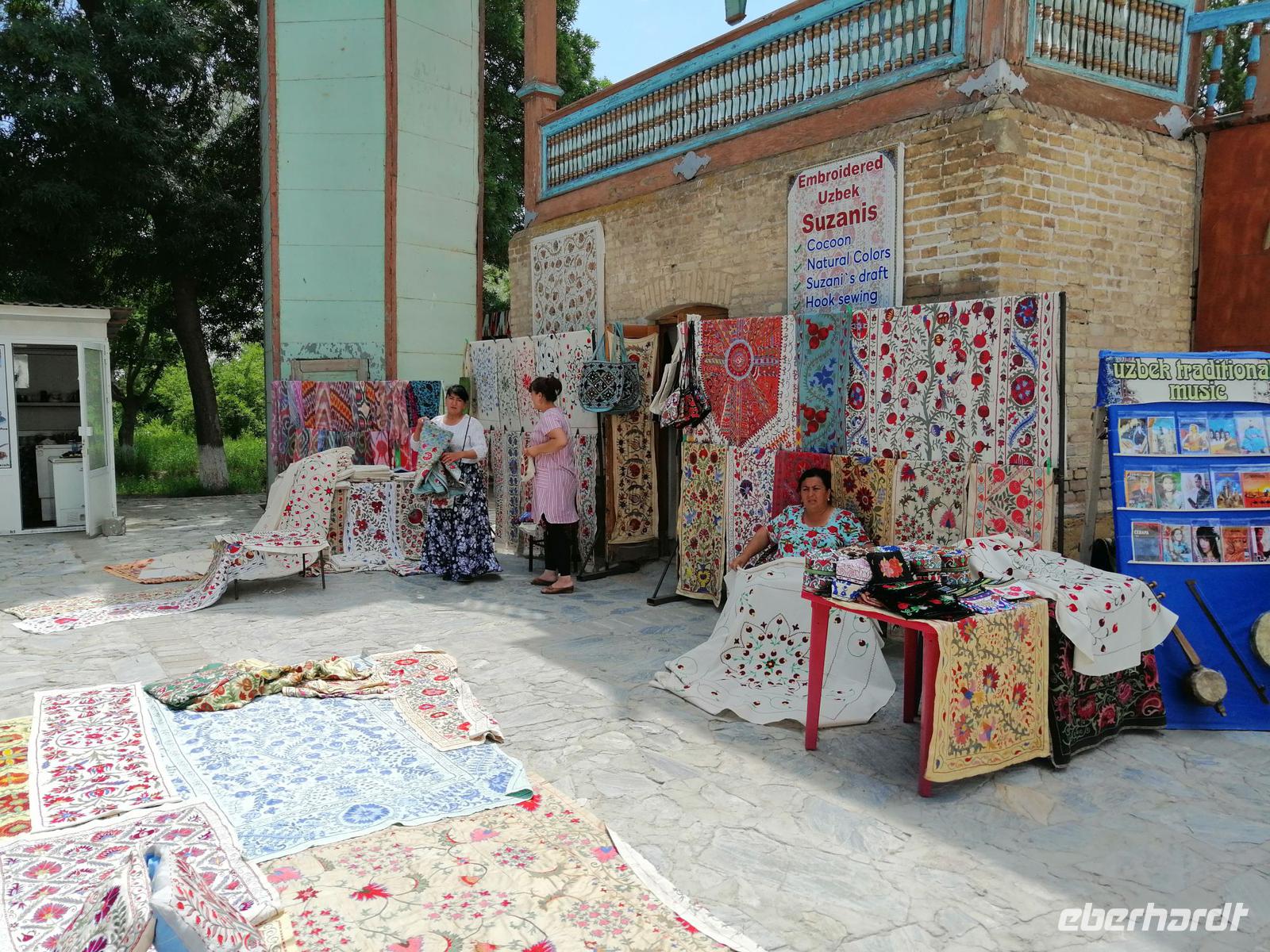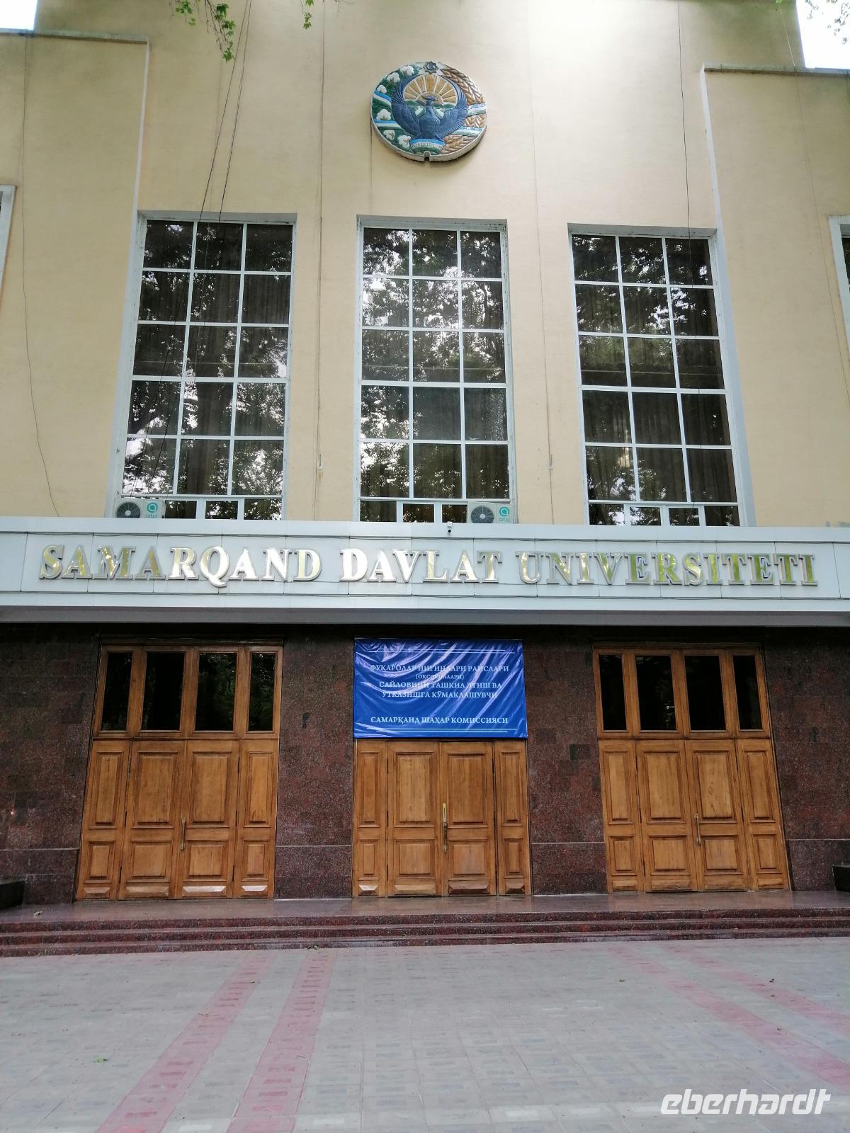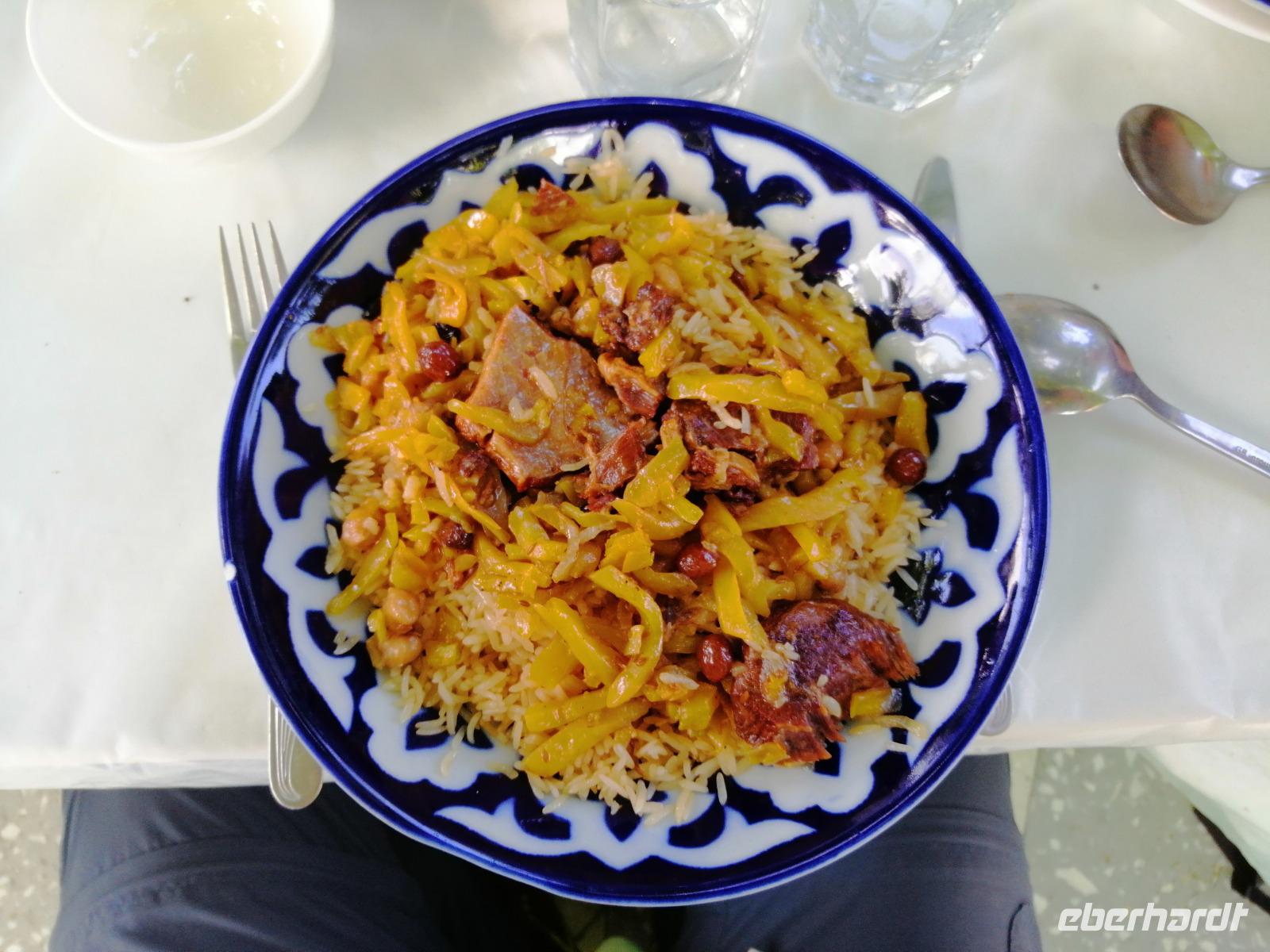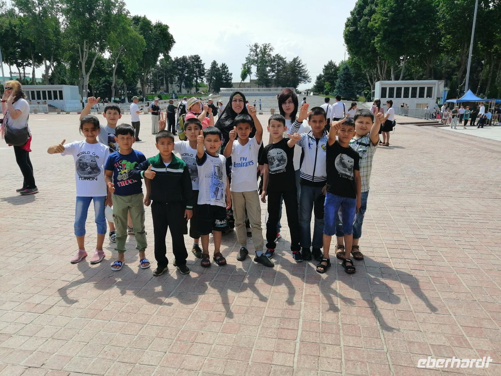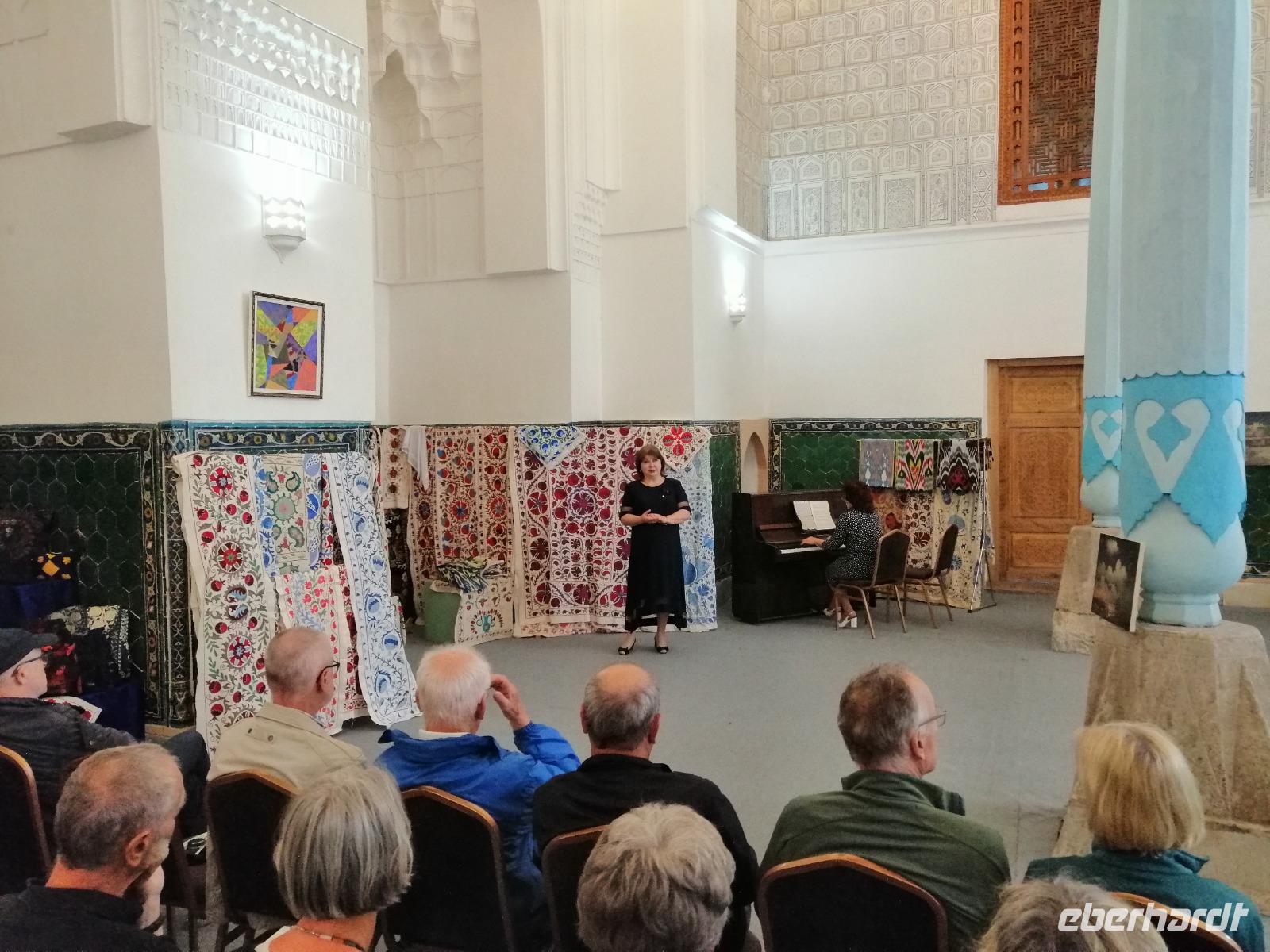 Unsere Erkundung der wunderschönen und sehr grünen Stadt Samarkand begann mit der Besichtigung des Gur-Emir-Mausoleums. Der Komplex ist sehr beeindruckend. Im Mausoleum befindet sich der Grab des berühmten Timur Lenk aber auch Gräber von seinem geistigen Lehrer (Scheich Baraka) und einem weiterem Verwandten von ihm. Besonders interessant fanden wir die Gespräche mit den Jugendlichen im Innenhof: die Schüler hatten Life-Unterricht: Geschichte und Fremdsprachen. Dabei sprachen sie vorbei laufenden Touristen direkt an und übten ihr Können. An einem Informationsstand stellte uns Ilhom die damalige große Königreich von Timur Lenk und seine militärischen Aktivitäten vor. Danach ging es zum Registan (übersetzt: Sandplatz) von Samarkand: dem bekanntesten Symbol Usbekistans (UNESCO Weltkulturerbe). Der Platz war im mittelalterlichen Orient der Platz, auf dem die Emire ihre Erlasse verkündeten, wo Gericht gehalten wurde, wo aber auch ein reges Markttreiben stattfand. Der Registan-Komplex besteht aus Tillakori-Medrese, Sherdor-Medrese und Ulug´bek-Medrese. Also auf drei seiner vier Seiten ist der Platz von gotischen Kathedralen (drei o.g. Medresen) umgeben. Uns scheint es so, ob die Wände aber auch vor allen die Minarette schief stehen: Ilhom erklärte uns, dass die Ursache im sandigen Baugrund des Platzes liegt. Auch auf Registan trafen wir viele Schüler und Jugendliche und kamen ins Gespräch. Danach gingen wir zu Fuß durch eine wunderschöne Fußgängerpassage und besichtigten Bibi-Khanym-Moschee, die für viele als größte und schönste Moschee Mittelasiens gilt. Timur Lenk lies diese Moschee nach seinem Feldzug durch Indien bauen und widmete sie seiner Hauptfrau Saray Mulk Chanum, die eine direkte Nachfahrin von Dschingis Khan war. Diese Frau ermöglichte Timur Lenk die Verbindung zum mongolischen Adel. Anschließend hatten wir freie Zeit, die viele von uns für den Besuch des berühmten Samarkander Siab-Basars nutzten. Vor dem Abendbrot besuchten wir das Museum der bekannten Weinkellerei von Samarkand, die den Namen von Professor Chovrenko trägt. Nach der kurzen aber sehr informativen Führung durch das Museum wurden wir in einem prächtigen Saal mit zehn verschiedenen Weinen, Brandys und Schnapse verwöhnt. Den wunderbaren Tag beendeten wir in einem sehr großen aber gemütlichen Restaurant Samarkand mit sehr gutem Essen und Tanzmusik.