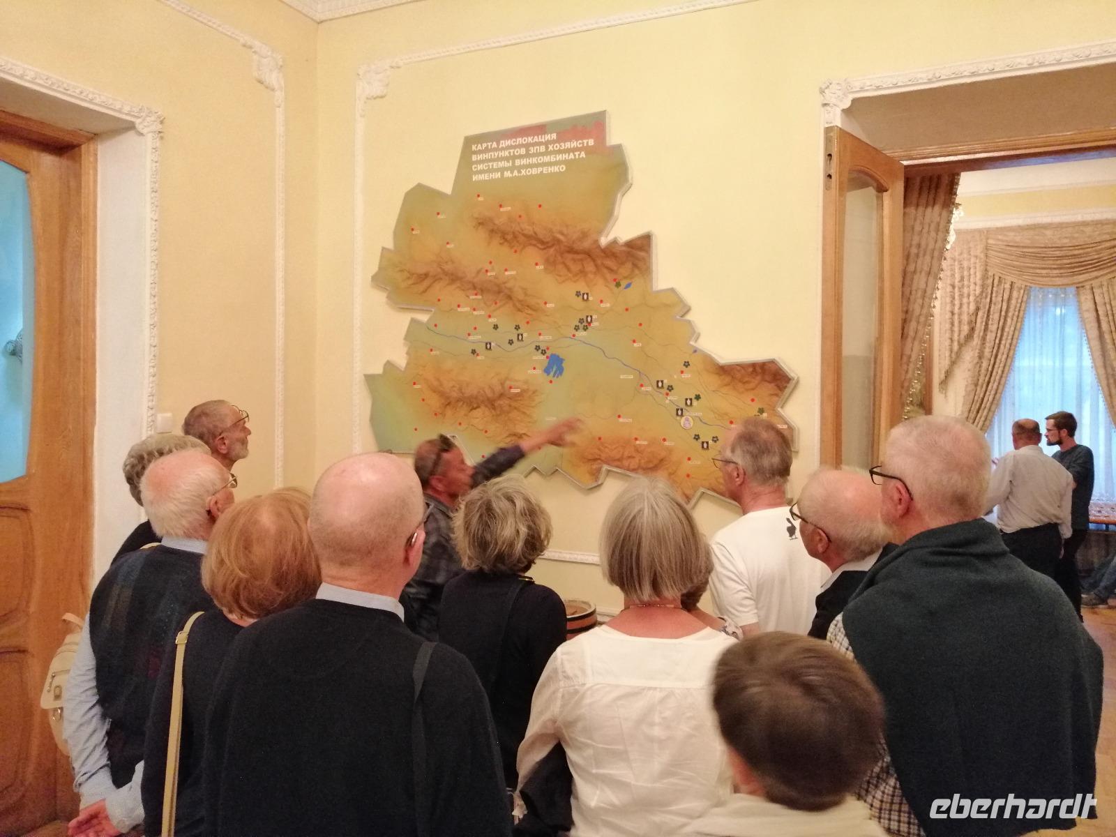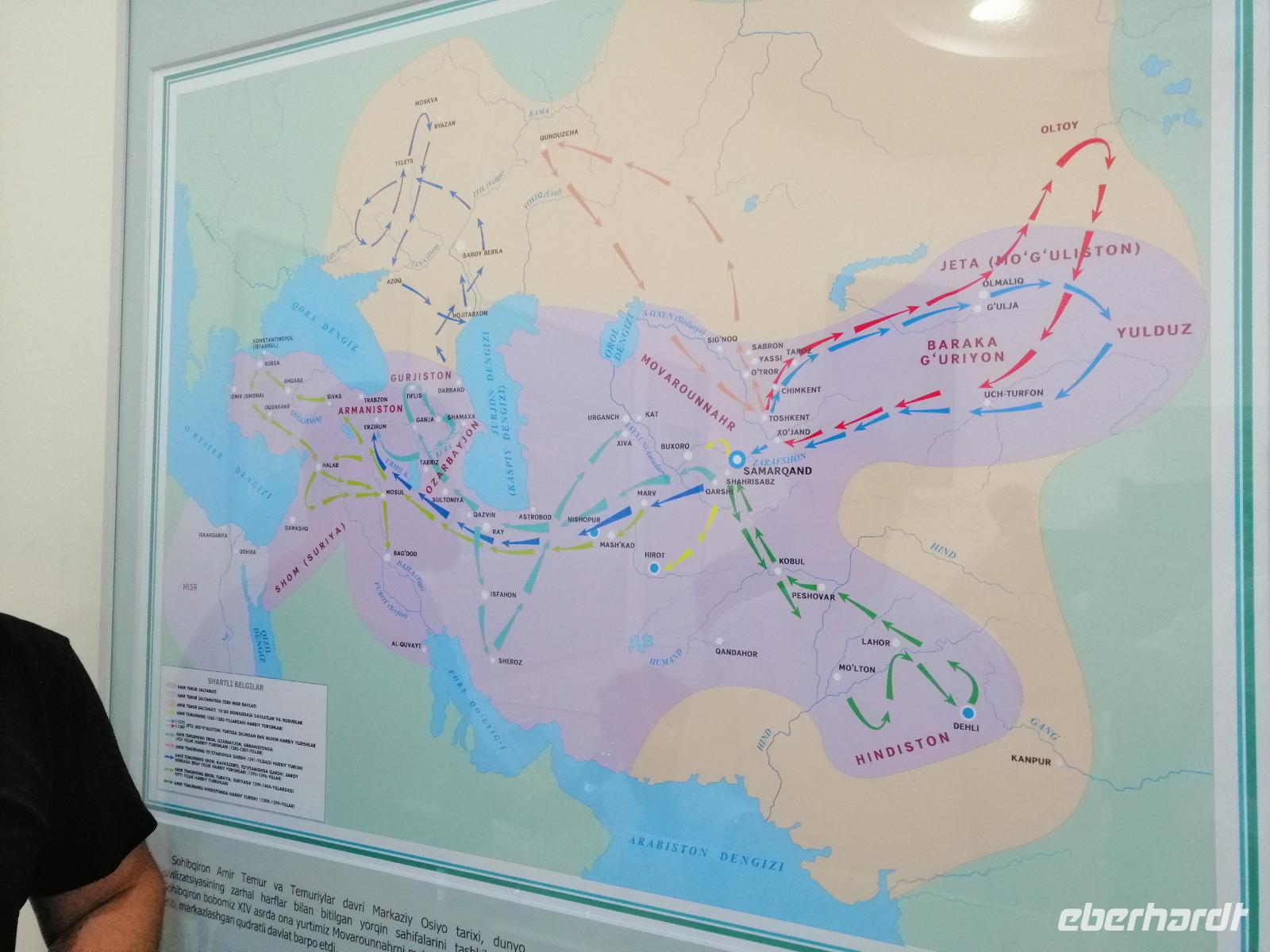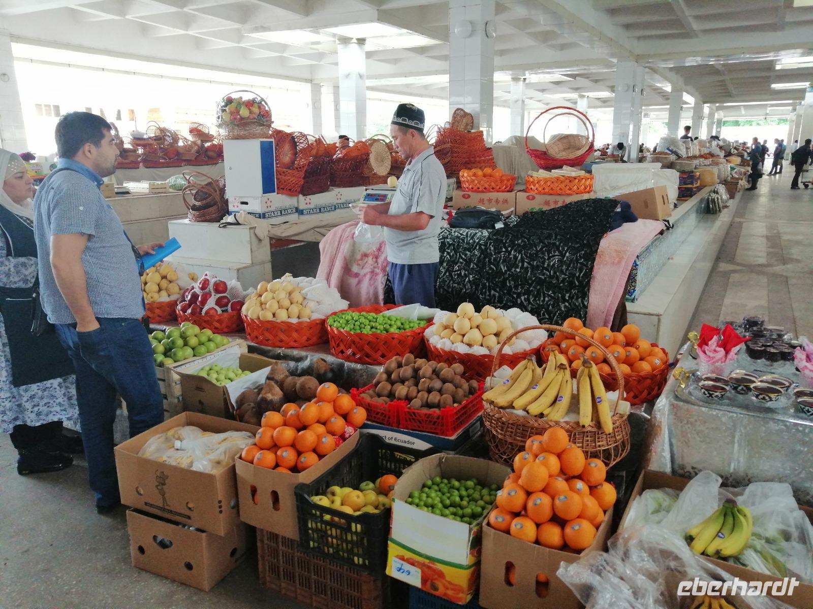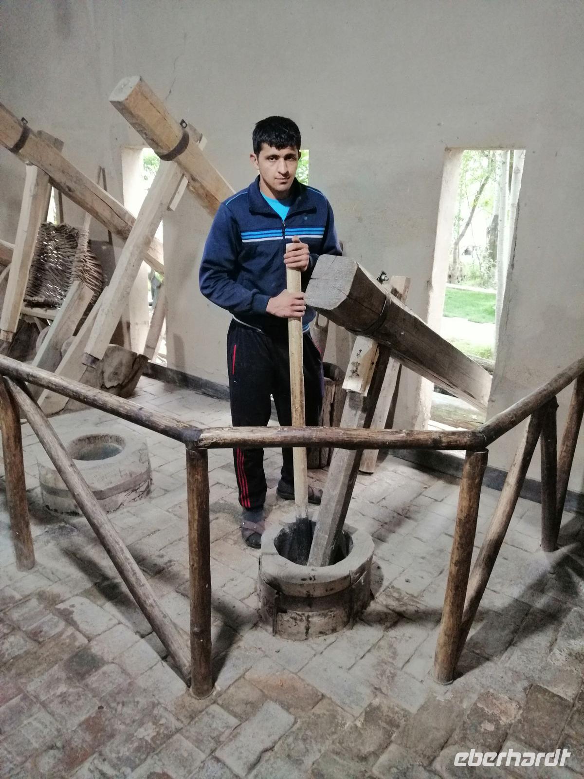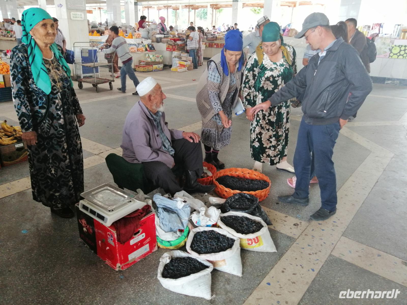 Unsere Erkundung der wunderschönen und sehr grünen Stadt Samarkand begann mit der Besichtigung des Gur-Emir-Mausoleums. Der Komplex ist sehr beeindruckend. Im Mausoleum befindet sich der Grab des berühmten Timur Lenk aber auch Gräber von seinem geistigen Lehrer (Scheich Baraka) und einem weiterem Verwandten von ihm. Besonders interessant fanden wir die Gespräche mit den Jugendlichen im Innenhof: die Schüler hatten Life-Unterricht: Geschichte und Fremdsprachen. Dabei sprachen sie vorbei laufenden Touristen direkt an und übten ihr Können. An einem Informationsstand stellte uns Ilhom die damalige große Königreich von Timur Lenk und seine militärischen Aktivitäten vor. Danach ging es zum Registan (übersetzt: Sandplatz) von Samarkand: dem bekanntesten Symbol Usbekistans (UNESCO Weltkulturerbe). Der Platz war im mittelalterlichen Orient der Platz, auf dem die Emire ihre Erlasse verkündeten, wo Gericht gehalten wurde, wo aber auch ein reges Markttreiben stattfand. Der Registan-Komplex besteht aus Tillakori-Medrese, Sherdor-Medrese und Ulug´bek-Medrese. Also auf drei seiner vier Seiten ist der Platz von gotischen Kathedralen (drei o.g. Medresen) umgeben. Uns scheint es so, ob die Wände aber auch vor allen die Minarette schief stehen: Ilhom erklärte uns, dass die Ursache im sandigen Baugrund des Platzes liegt. Auch auf Registan trafen wir viele Schüler und Jugendliche und kamen ins Gespräch. Danach gingen wir zu Fuß durch eine wunderschöne Fußgängerpassage und besichtigten Bibi-Khanym-Moschee, die für viele als größte und schönste Moschee Mittelasiens gilt. Timur Lenk lies diese Moschee nach seinem Feldzug durch Indien bauen und widmete sie seiner Hauptfrau Saray Mulk Chanum, die eine direkte Nachfahrin von Dschingis Khan war. Diese Frau ermöglichte Timur Lenk die Verbindung zum mongolischen Adel. Anschließend hatten wir freie Zeit, die viele von uns für den Besuch des berühmten Samarkander Siab-Basars nutzten. Vor dem Abendbrot besuchten wir das Museum der bekannten Weinkellerei von Samarkand, die den Namen von Professor Chovrenko trägt. Nach der kurzen aber sehr informativen Führung durch das Museum wurden wir in einem prächtigen Saal mit zehn verschiedenen Weinen, Brandys und Schnapse verwöhnt. Den wunderbaren Tag beendeten wir in einem sehr großen aber gemütlichen Restaurant Samarkand mit sehr gutem Essen und Tanzmusik.