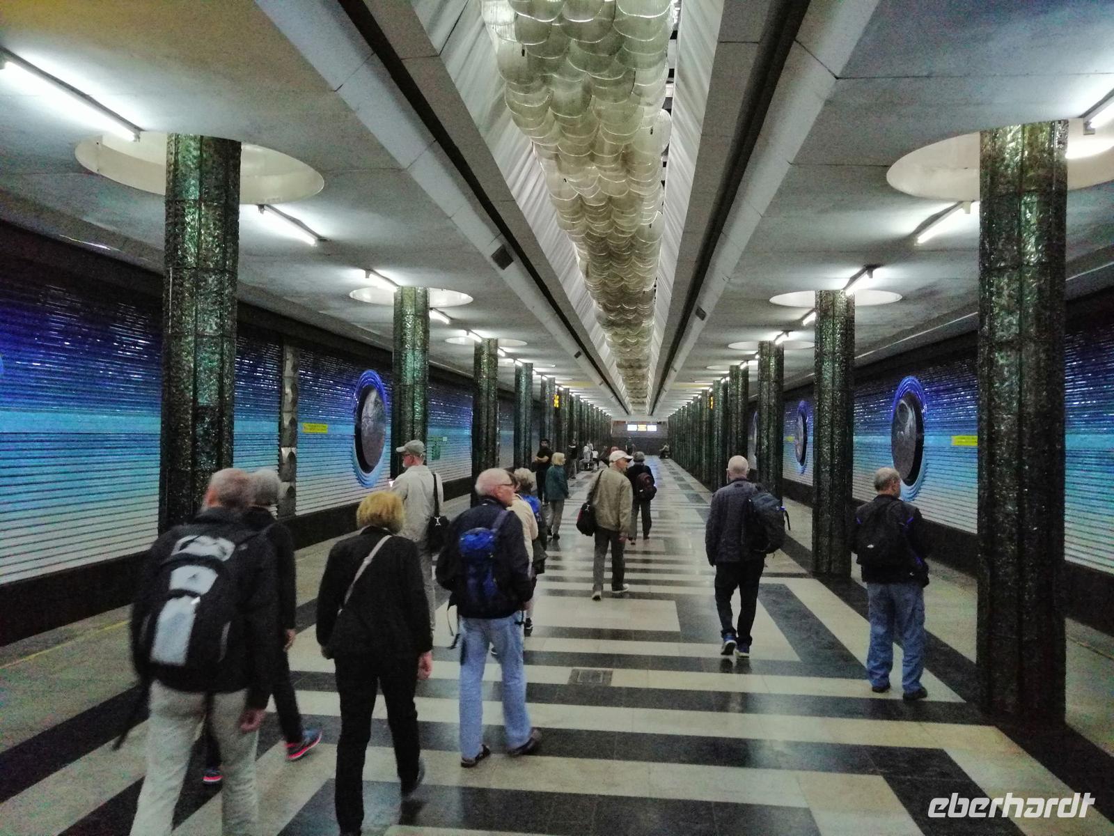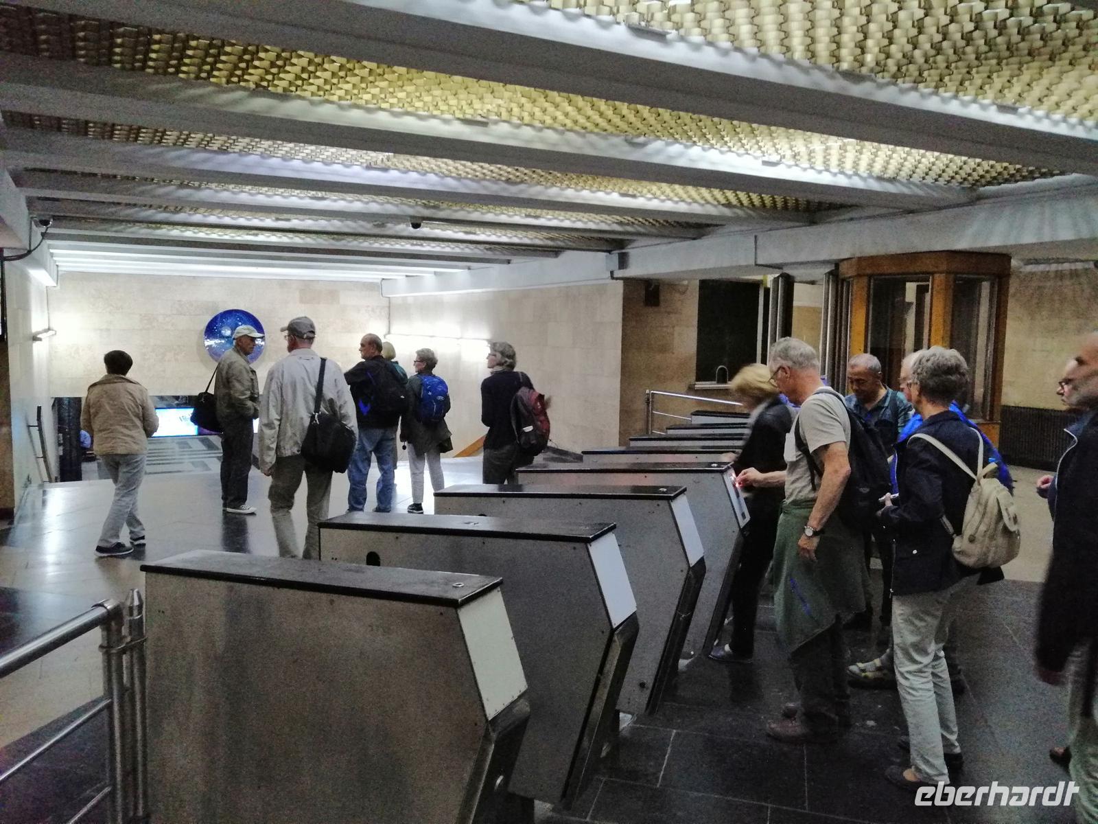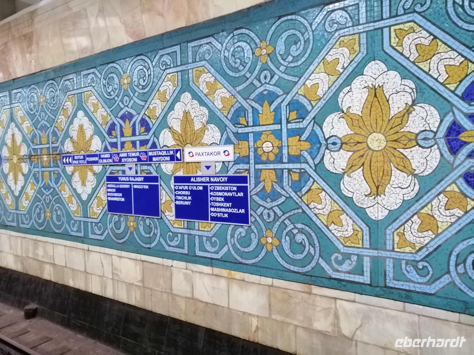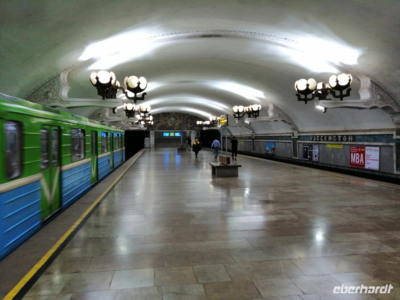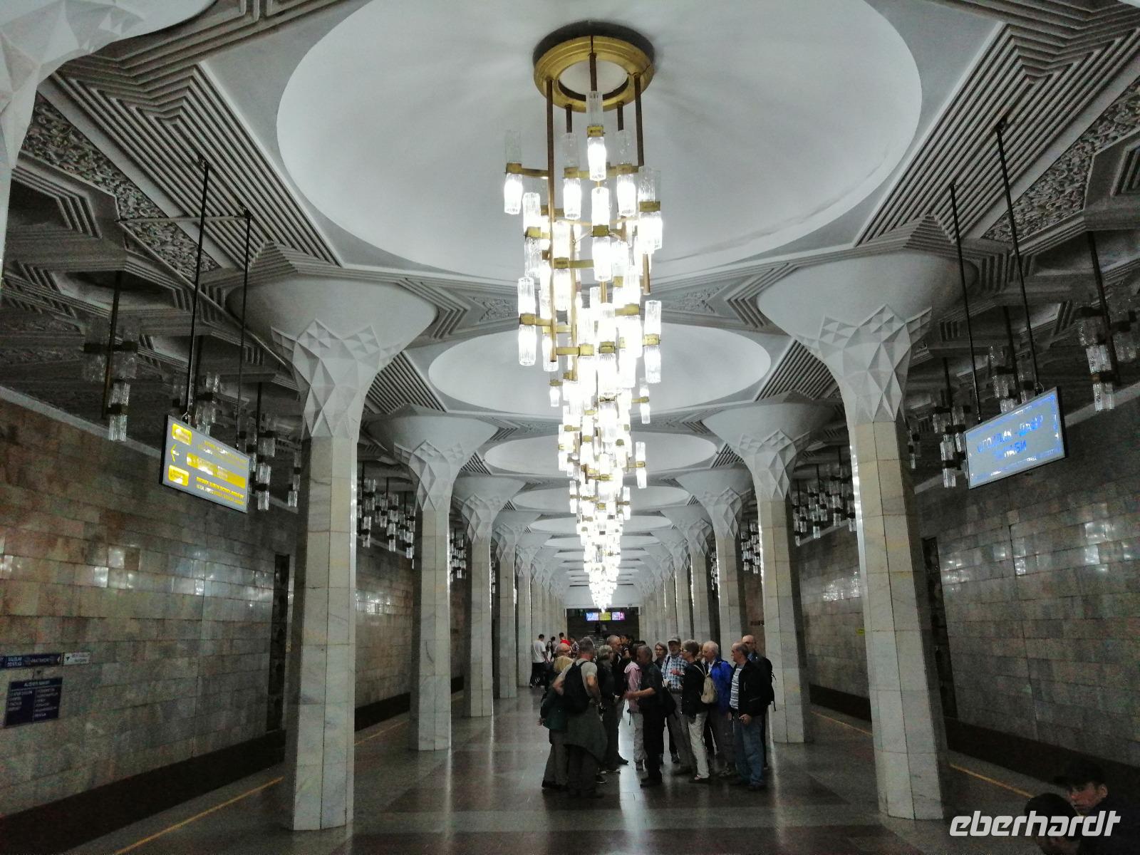 Unsere Rundreise entlang der märchenhaften Seidenstraße geht langsam zu Ende und heute ist unser letzter Tag in Samarkand. Spät Nachmittag fahren wir mit dem Schnellzug AFROSIOB zurück nach Taschkent. Aber der Tag ist noch lang und wir nutzen ihn, um noch viele Sehenswürdigkeiten von Samarkand zu erleben. Zuerst besichtigen wir die Seiden-Papierfabrik und schauerten uns an, wie aus der Rinde des Maulbeerbaums in mühevoller Handarbeit wunderschöne Sachen: Taschen, Kleider, Teppiche hergestellt wurden. Danach besuchten wir das Atelier von Valentina Romanenko. Hier wurden uns in toller Choreographie eine kleine Modeschau vorgeführt. Danach hatten wir ein bisschen Zeit und die selbst hergestellte Bekleidung (aus Baumwolle und Seide, mit Naturfarben bemalt) anzuschauen und zu kaufen. Anschließend fuhren wir zum Mirzo-Ulugbek-Komplex und besichtigten dort ein kleines Museum, in dem das ehemalige Observatorium von berühmten Astronomen Ulugbek sehr informativ erklärt wurde. Besonders beeindruckend fanden wir die Reste des unterirdischen Sextanten, mit einem ursprünglichen Durchmesser von ca. 40 Meter. In einem Restaurant unterhalb des Mirzo-Ulugbek-Komplexes probierten wir zum Mittagessen Samarkander Plov: eine typisch usbekische Reis-Spezialität. Nachmittag besichtigten wir noch eine der bekanntesten Nekropolen Zentralasiens: Shakhi-Zinda. Es handelt sich dabei um eine Gräber-Straße, die von Ulugbek im Auftrag von seinem Sohn Abdulaziz im 15. Jahrhundert erbaut worden ist. Bis zur ersten Plattform steigt man 40 Stufen hoch: so viele Tage hat auch Ramadan (in Usbekistan Ramasan genannt). Mit einem Konzert der klassischen Musik in der Ulug´bek-Medrese auf dem Registan mit Werken von Brams und Schubert bis "Kalinka" und "Moskauer Abende" ging unsere Aufnethalt in Samarkand mit vielen tollen Eindrücken dem Ende zu. Abschließend fuhren wir zum Bahnhof von Samarkand. Jetzt hieß es Abschied von unserem Busfahrer Asamat und seinem Begleiter nehmen. Die beiden haben uns sehr gut betreut! Die Fahr mit dem Schnellzug AFROSIAB nach Taschkent dauerte ca. 2 Stunden. Der Zug ist sehr komfortabel und sauber. Wir bekamen sogar einen kleinen Snack, Kaffee und Tee: im Preis inbegriffen. Die höchste von uns gemessene Geschwindigkeit des Zuges betrug 231 km/h. In Taschkent wurden wir von unserem Taschkenter Bus schon erwarten und fuhren gleich mit unseren Koffern zum Abendessen ins Restaurant Piligrim. Nach dem letzten Abendbrot in Usbekistan fuhr uns unser Busfahrer zu einer U-Bahnstation: denn eine wenn auch nur kurze Fahrt mit der einzigen U-Bahn Mittelasiens, dürfte uns nicht fehlen. Die wunderschöne U-Bahn kann sich wirklich sehen lassen. Aber auch die Begegnungen mit den jungen Menschen, die uns sofort beim Reingehen in Wagon ihre Plätze frei machten und das nette Gespräch mit dem Polizisten, der unbedingt mit uns ein Foto für die Wandzeitung machen wollte, begeisterten uns sehr. Das Fotografieren in der Taschkenter U-Bahn ist seit Februar 2018 erlaubt. Nach einem kurzen Spaziergang kamen wir dann müde aber sehr zufrieden in unserem Hotel City Palace an.