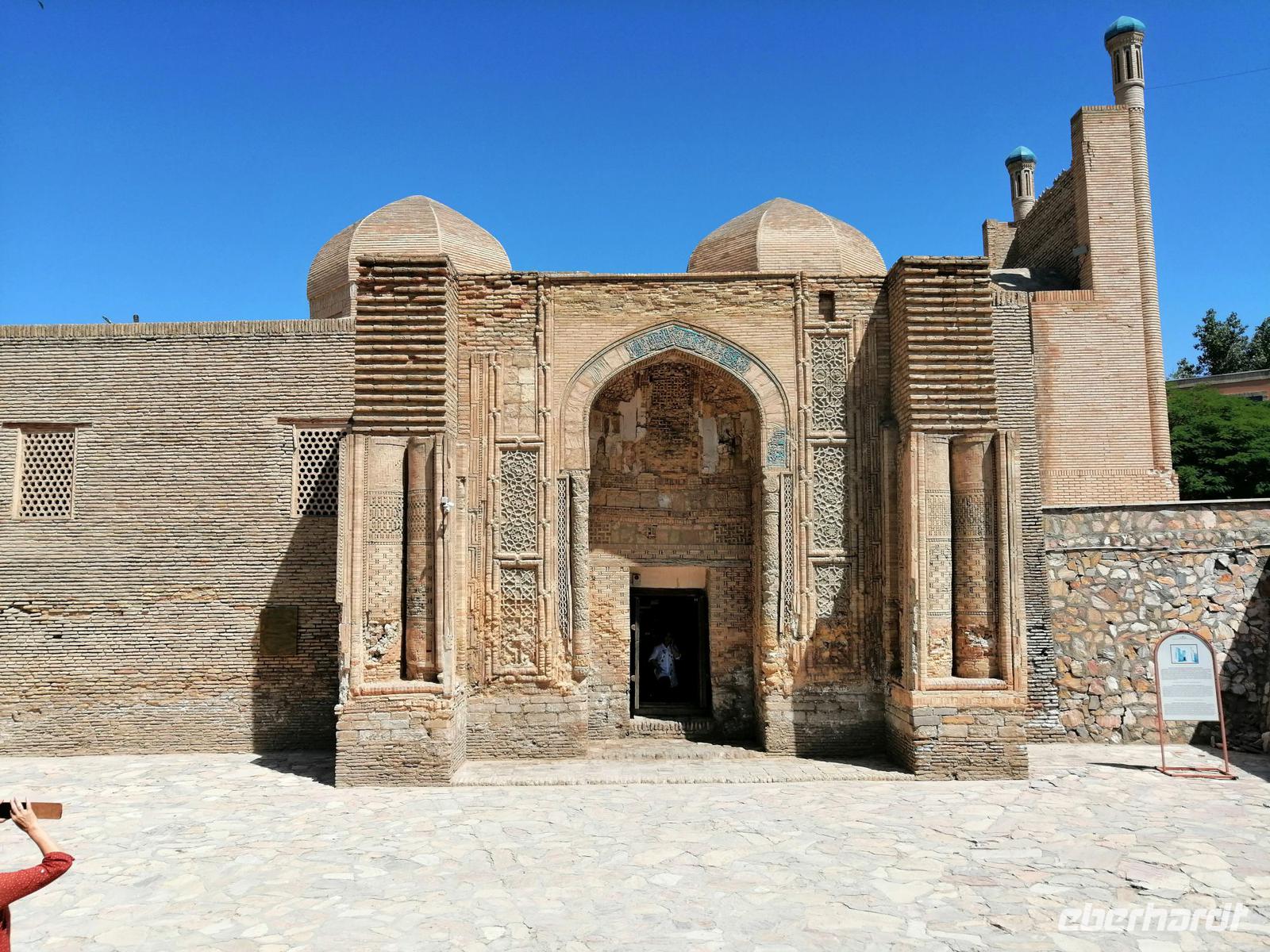 Heute zieht unsere „Karawane" weiter und wir verlassen Buchara und fahren nach Schahrisabs: Geburtsstadt von berühmten Amir Timur, der vielen auch als Tamerlan bekannt ist. Unterwegs hielten wir in der Nähe des Ortes Bozachi an und schauten uns die Felder an, wo Wassermelonen und Weißkraut angepflanzt wurden. Ilhom erzählte uns über die Besonderheiten der usbekischen Landwirtschaft. Highlight der Fahrt war sicherlich die Fotopause, wo wir Fotos von einem kleinen Dromedar geschossen haben. In Schahrisabs angekommen, besichtigten wir zuerst den Darat-Tilawat-Komplex mit der Kok-Gumbas-Moschee. Danach schauten wir uns den Daras-Saodat Komplex an, wo sich auch die Mausoleen für Amir Timurs Vatter, seinen Sohn Dschahangir und Amit Timur selbst befinden. Abschließend fuhren wir mit einem offenen elektro-Taxi durch die große Parkanlage mit Springbrunnen und Fußgängerpromenaden und besichtigten die Portal-Reste von Ak Sari: ein Prachtbau aus der Timur-Epoche, der seinen Größenwahn belegt. Die Weiterfahrt nach Samarkand ging durch hügelartiges Gelände. Auf der Strecke nach Samarkand besuchten wir eine usbekische Großfamilie und erlebten den Alltag und das Familienleben hautnah. Wir konnten unseren Gastgeber, der als Lehrer arbeitet, beim Tee trinken alles was uns interessiert hat bezüglich der Schulbildung und Kindererziehung ausfragen. Außerdem zeigte er uns die Webstühle und die vielen schönen Teppiche, die die Frauen in mühsame Handarbeit weben. Erst abends kamen wir schon müde in Samarkand an. Nach dem Check In im Hotel City, fuhren wir mit unserem Bus zum Restaurant Platan, wo wir noch ein sehr leckeres Abendbrot bekommen haben.