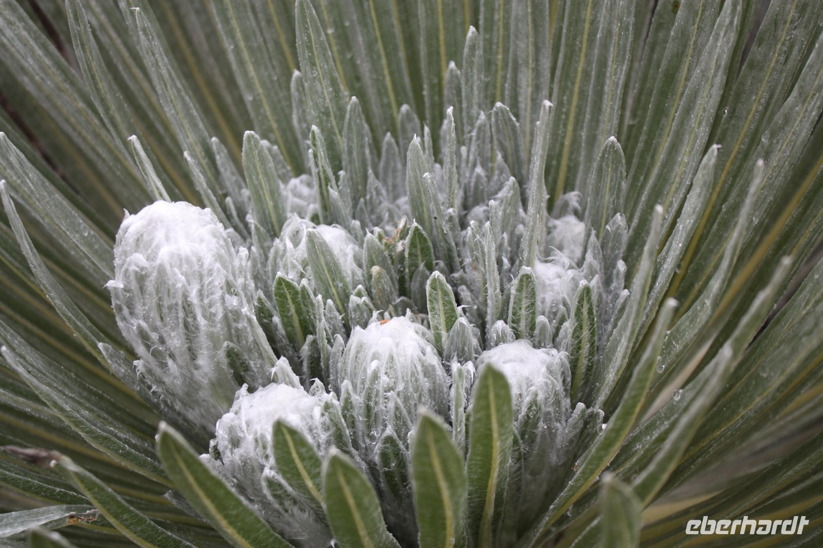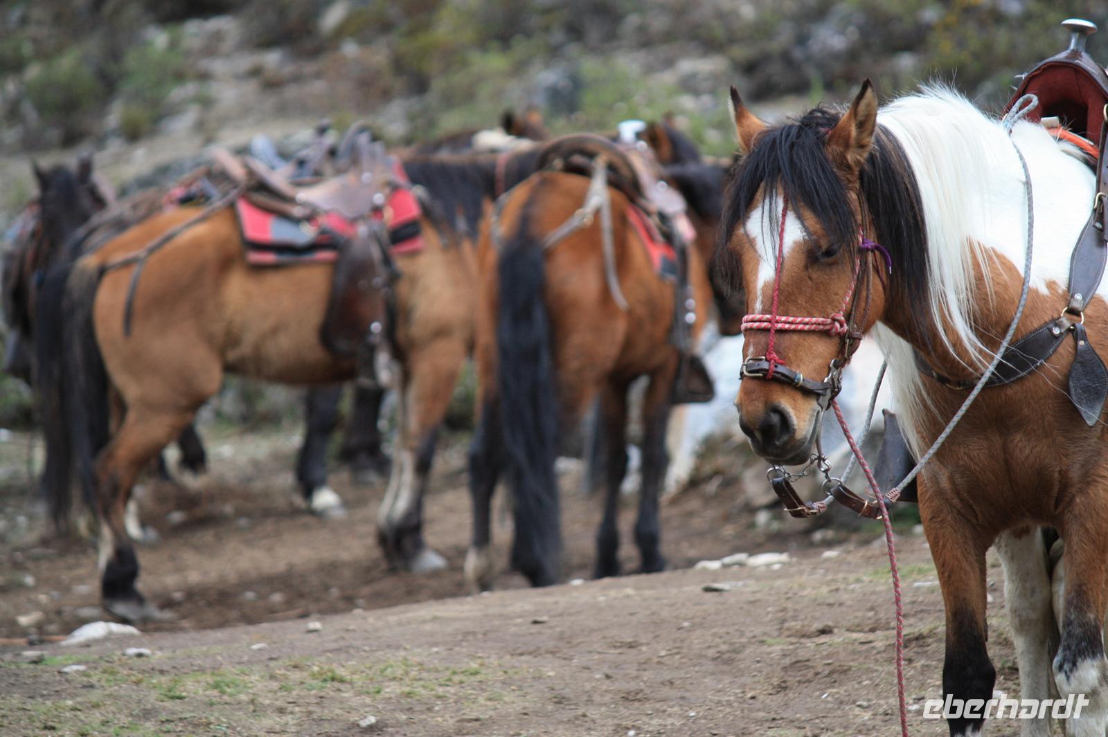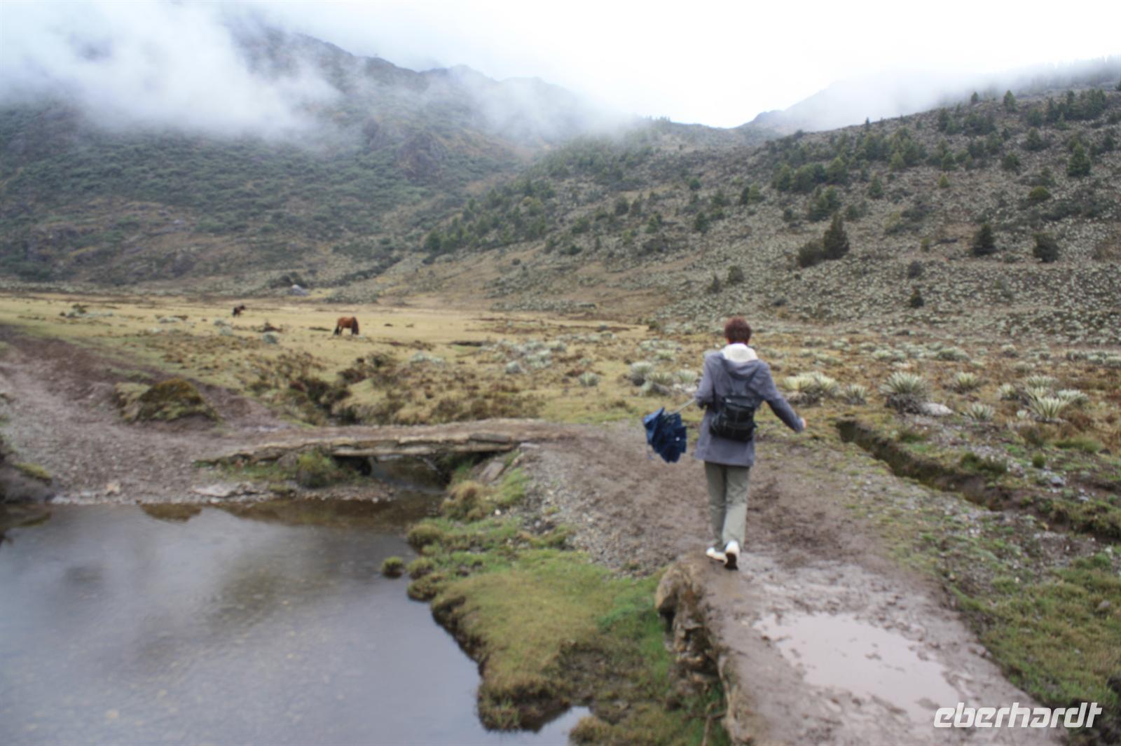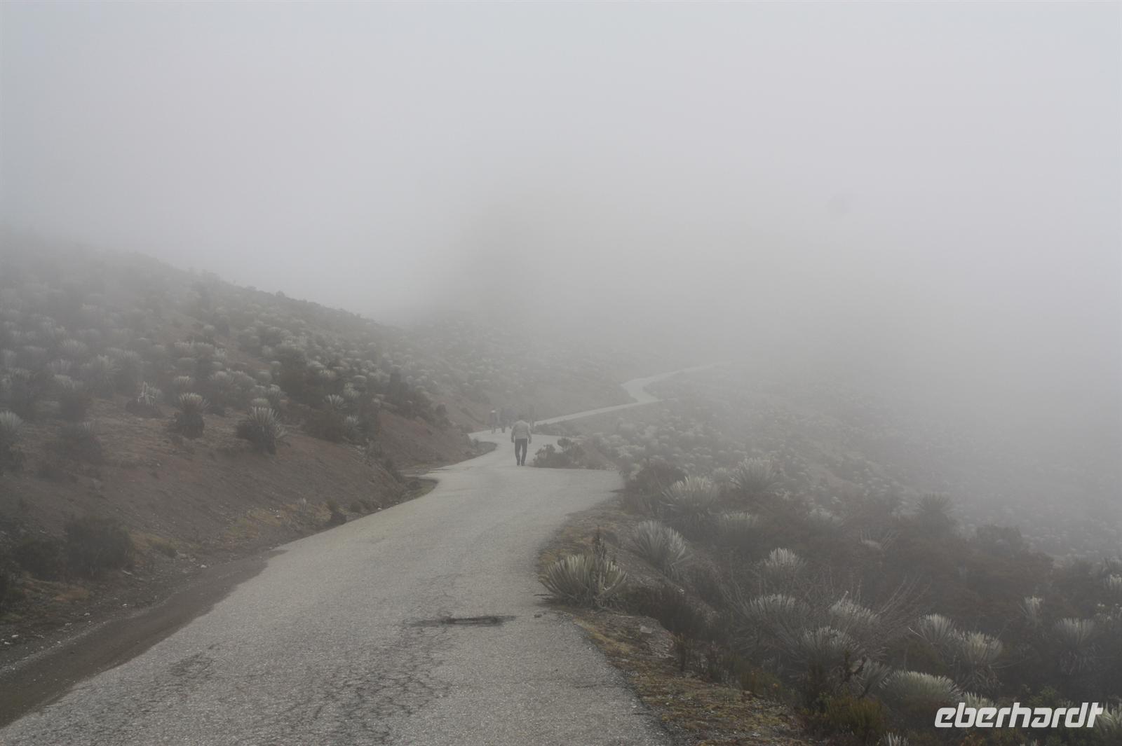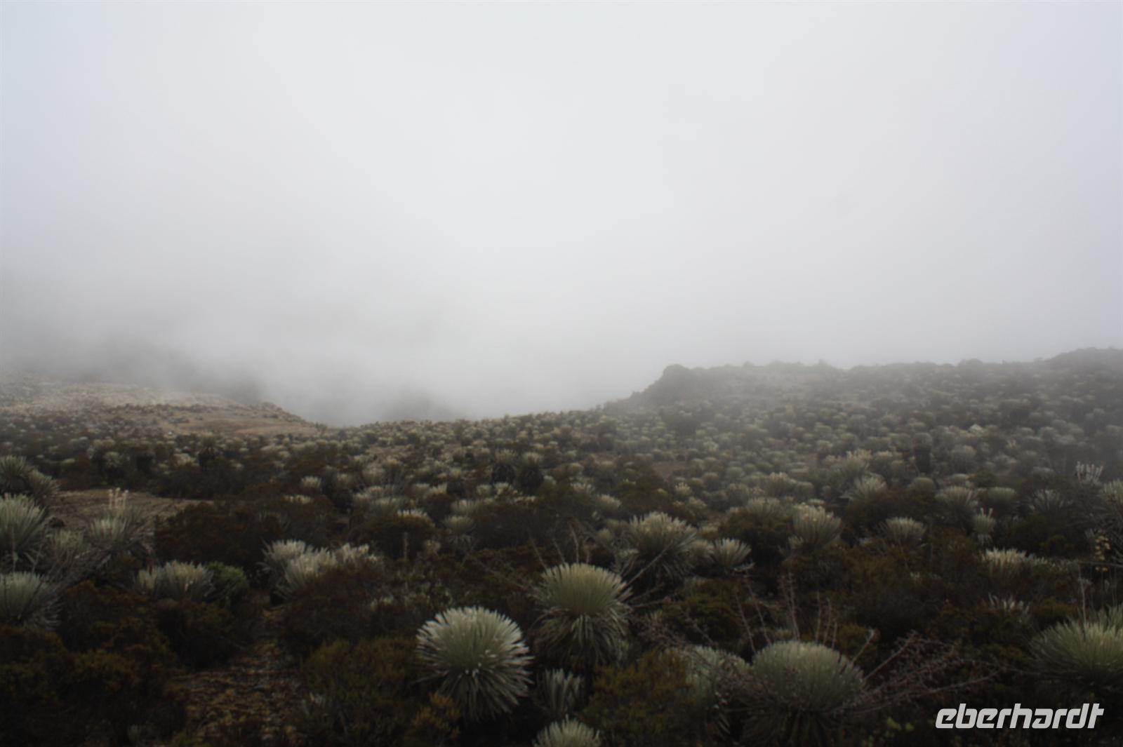 Am Morgen des Ostersamstages, den 07.04.2012 bekamen wir Besuch vom Osterhasen. Wir frühstückten urig in der Posada "Llanos de Trigo". Nur zaghaft kämpfte sich die Sonne durch die Nebelschwaden. Dieser Tag war ganz auf das mit all seinen Facetten ausgerichtet: Sichtweiten unter 50 m am Pico del Aquila, mannshohe Frailejones und Condor-Männchen Compatiente zogen uns in Ihren Bann. An der Laguna Mucubaji konnten wir nun endlich unsere müden Knochen bewegen und alternativ zwischen einem "ReitABENTEUER" wählen oder einer kleinen ca. 6km langen Wanderung. Nur versteckte sich unser Etappenziel, die Laguna negra in dichtem Nebel. Gut in der Zeit wurden wir wiedereinmal eines besseren belehrt und standen über 2 Stunden im Stau auf dem Rückweg nach Mérida.
