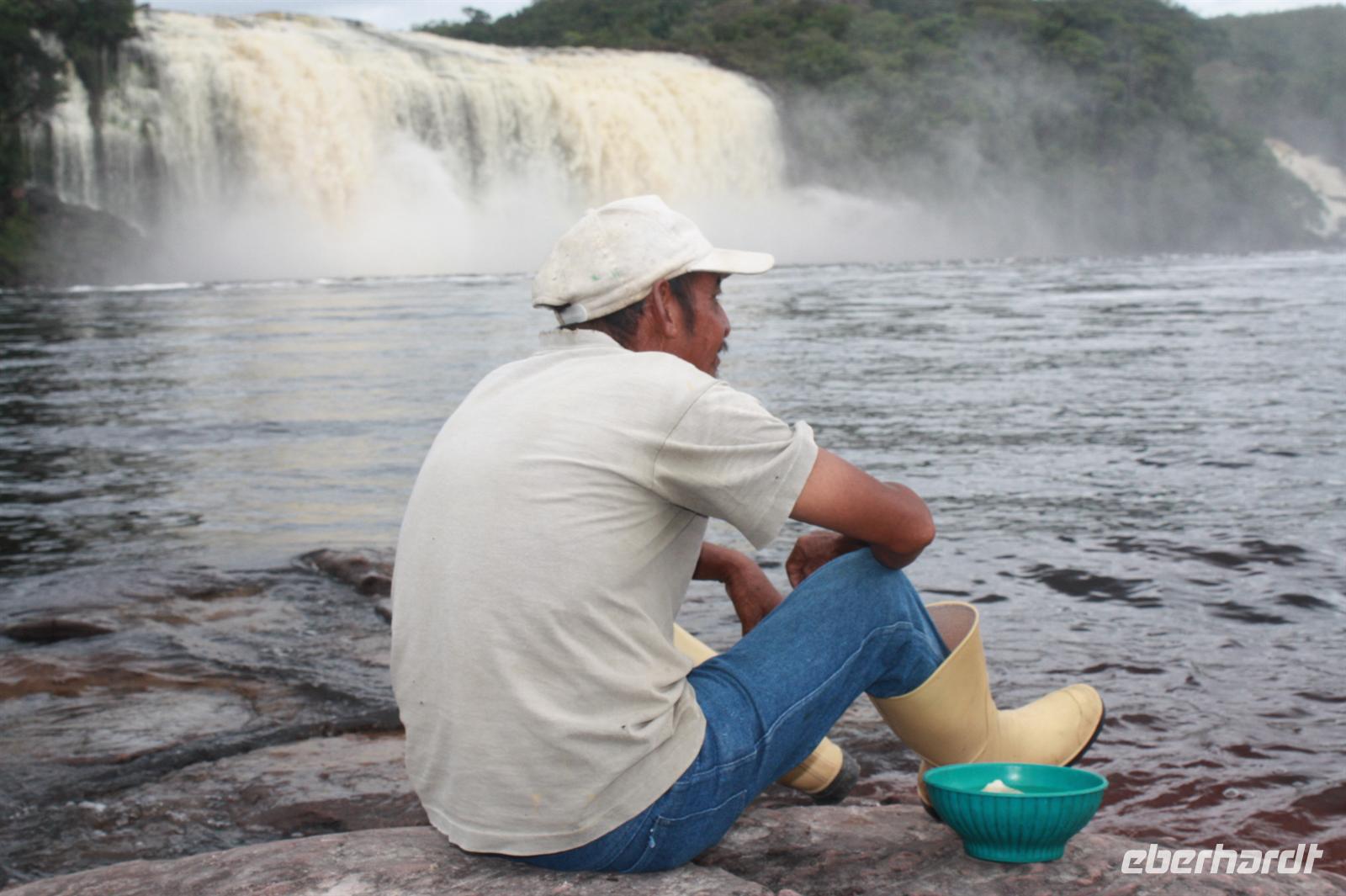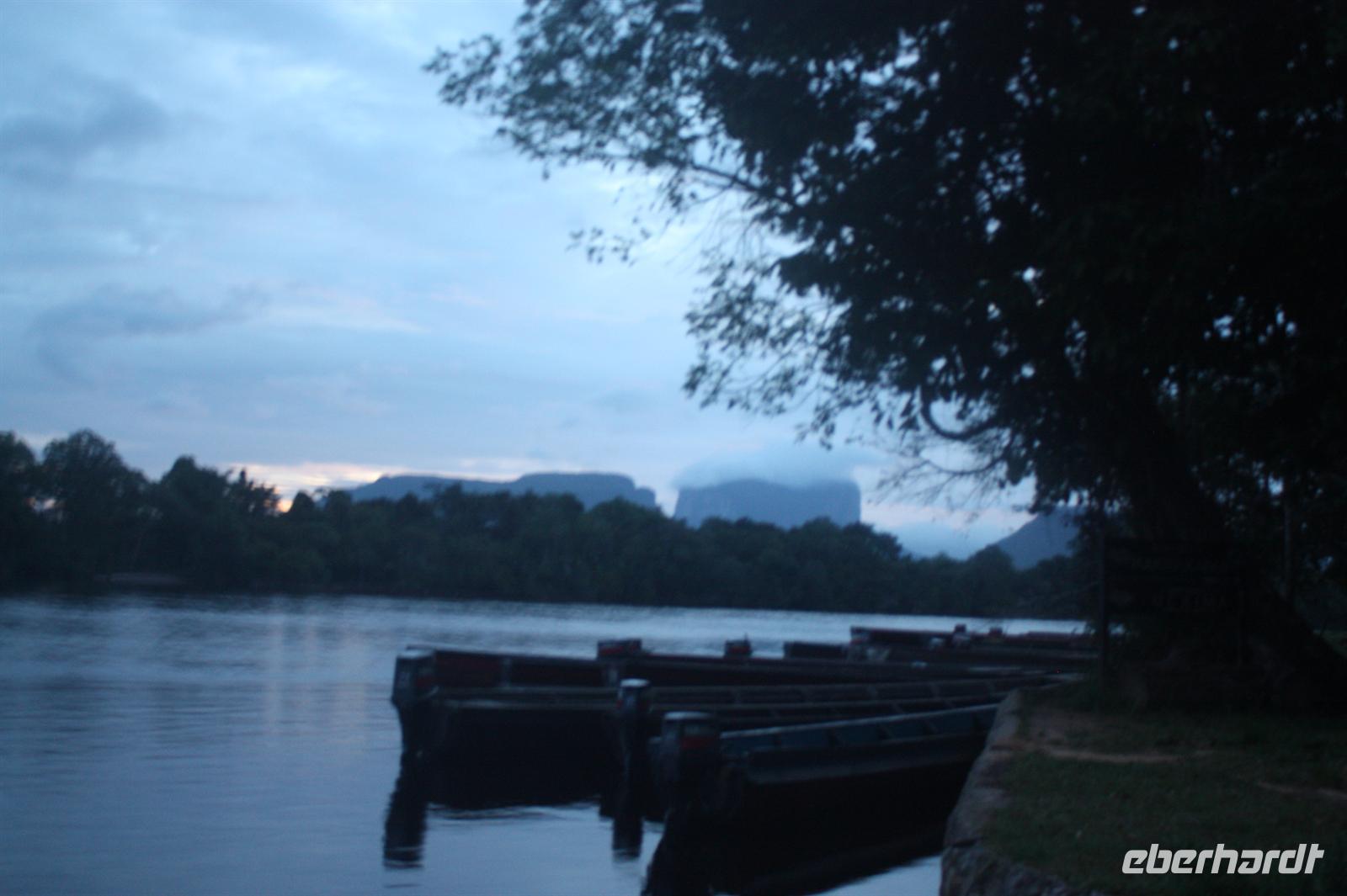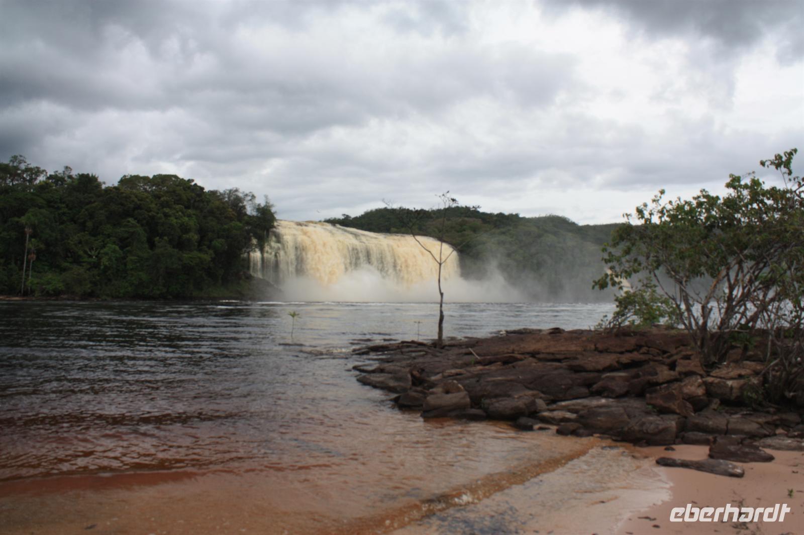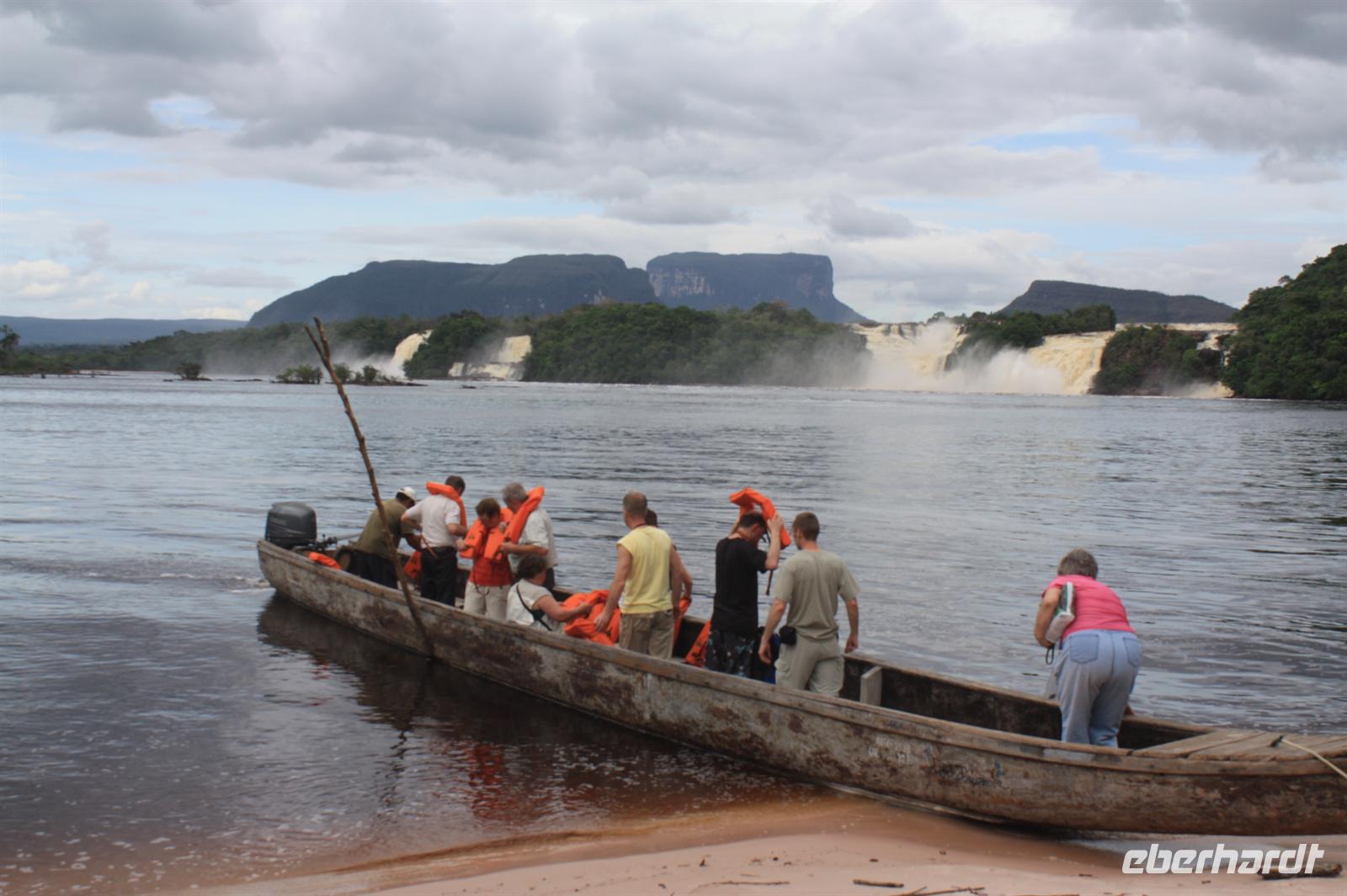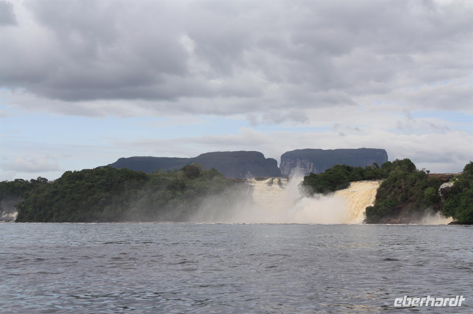Aufgrund der frühzeitig einsetzenden Regenzeit führten die Flüsse Carao und Churún ausreichend Wasser. Somit war uns das "Glück" vergönnt den höchsten, frei fallenden Wasserfall leibhaftig zu sehen. Am 10.04.2012 machten wir uns in aller Herrgotts frühe auf dem Weg zum Schiff. Auf Holzbänken sitzend fuhren wir insgesamt 4 Stunden Flussaufwärts mit diversen Stopps. Starkregen setzte ein. Pudelnass kamen wir an der Isla Ratón an. Schlagartig hörte es auf zu regnen und wir konnten trockenen Fußes die ca. 1,5 Stunden bergauf über Stock und Stein zum Mirador wandern. Inmitten von Regenwald eröffnete sich schließlich der freie Blick auf den Salto Angel. Erschöpft aber glücklich saugten wir die Augenblicke förmlich in uns auf. Beim Mittagessen lassen wir die Eindrücke wirken ehe der Regen wieder einsetzt und wir flussabwärts nach Canaima unzählige Stromschnellen passierten. Ein abenteuerlicher Tag neigt sich dem Ende.