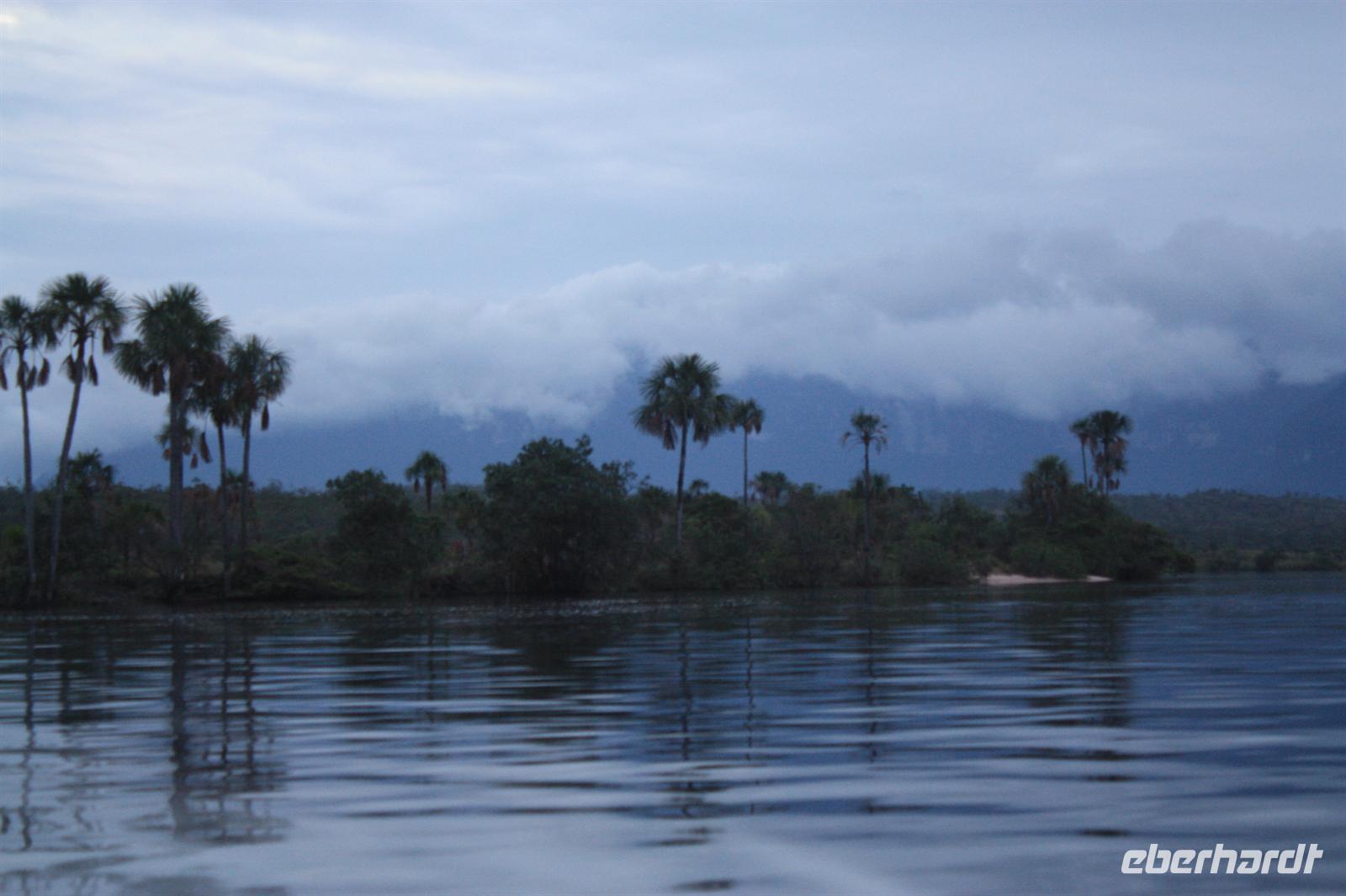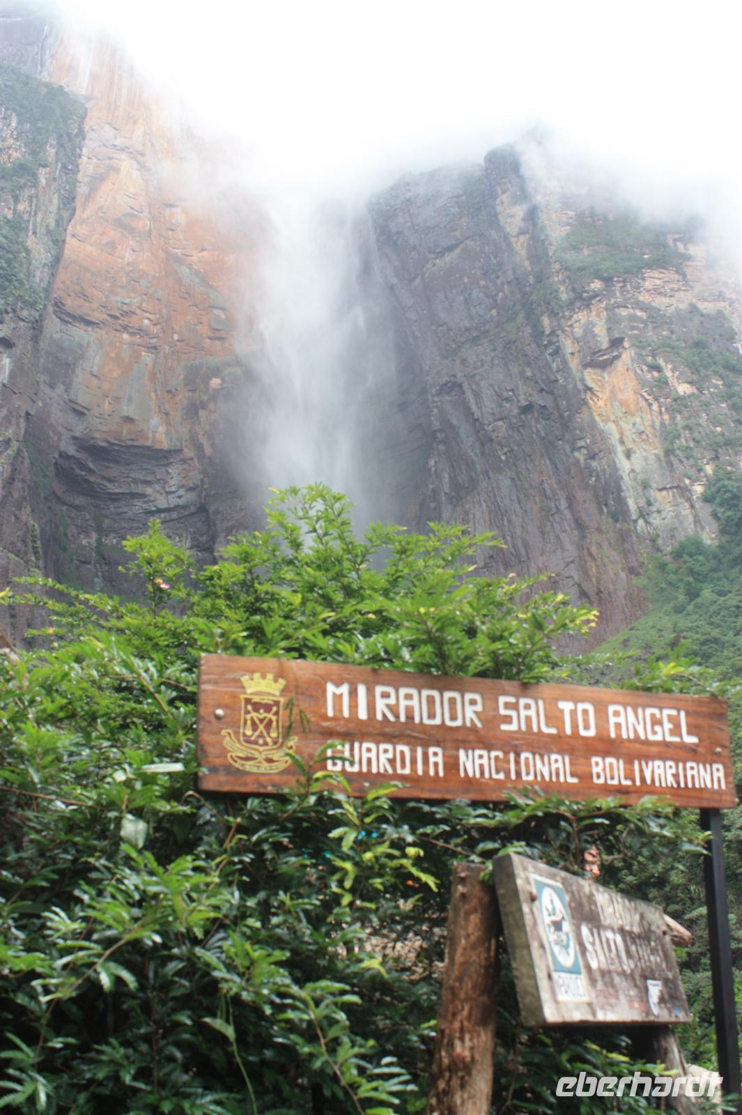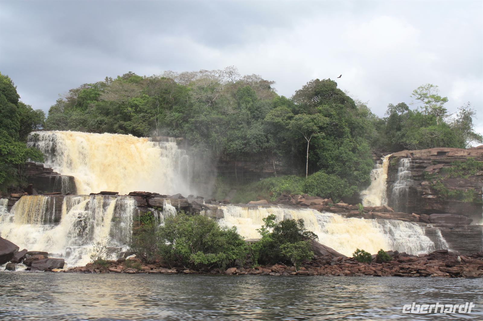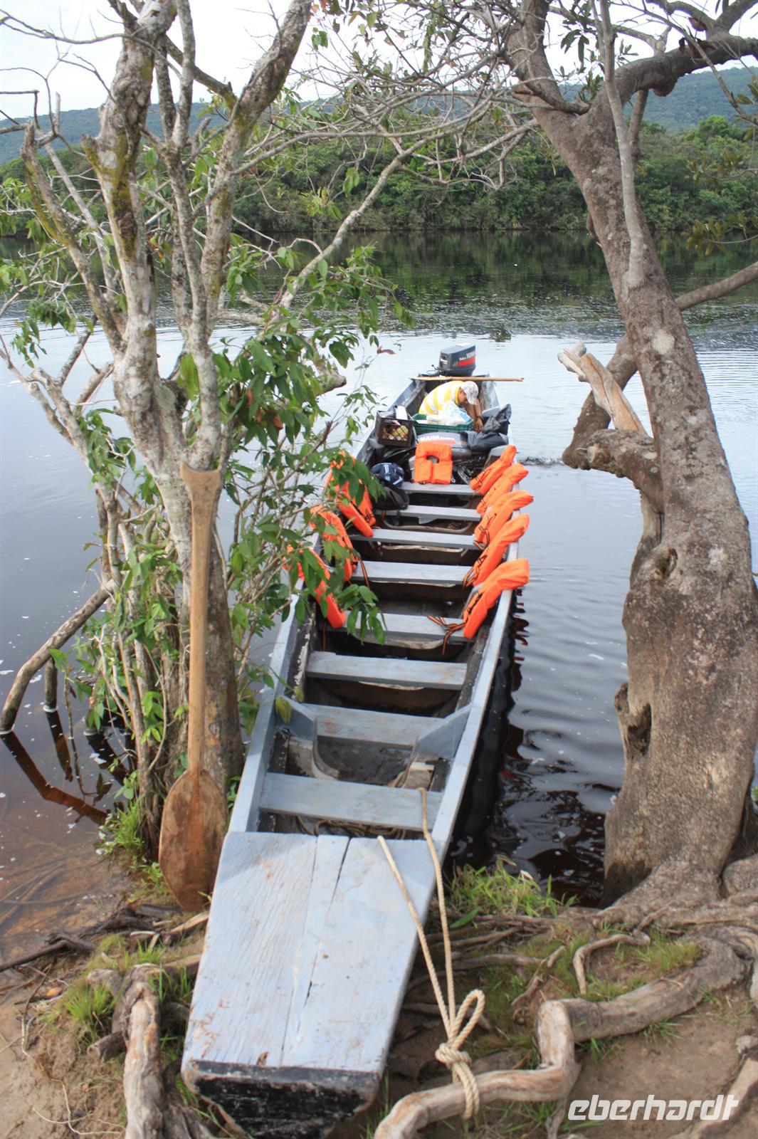 Aufgrund der frühzeitig einsetzenden Regenzeit führten die Flüsse Carao und Churún ausreichend Wasser. Somit war uns das "Glück" vergönnt den höchsten, frei fallenden Wasserfall leibhaftig zu sehen. Am 10.04.2012 machten wir uns in aller Herrgotts frühe auf dem Weg zum Schiff. Auf Holzbänken sitzend fuhren wir insgesamt 4 Stunden Flussaufwärts mit diversen Stopps. Starkregen setzte ein. Pudelnass kamen wir an der Isla Ratón an. Schlagartig hörte es auf zu regnen und wir konnten trockenen Fußes die ca. 1,5 Stunden bergauf über Stock und Stein zum Mirador wandern. Inmitten von Regenwald eröffnete sich schließlich der freie Blick auf den Salto Angel. Erschöpft aber glücklich saugten wir die Augenblicke förmlich in uns auf. Beim Mittagessen lassen wir die Eindrücke wirken ehe der Regen wieder einsetzt und wir flussabwärts nach Canaima unzählige Stromschnellen passierten. Ein abenteuerlicher Tag neigt sich dem Ende.