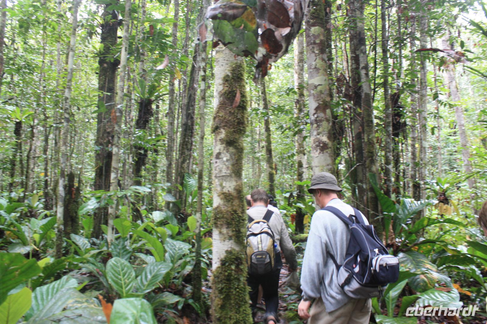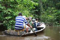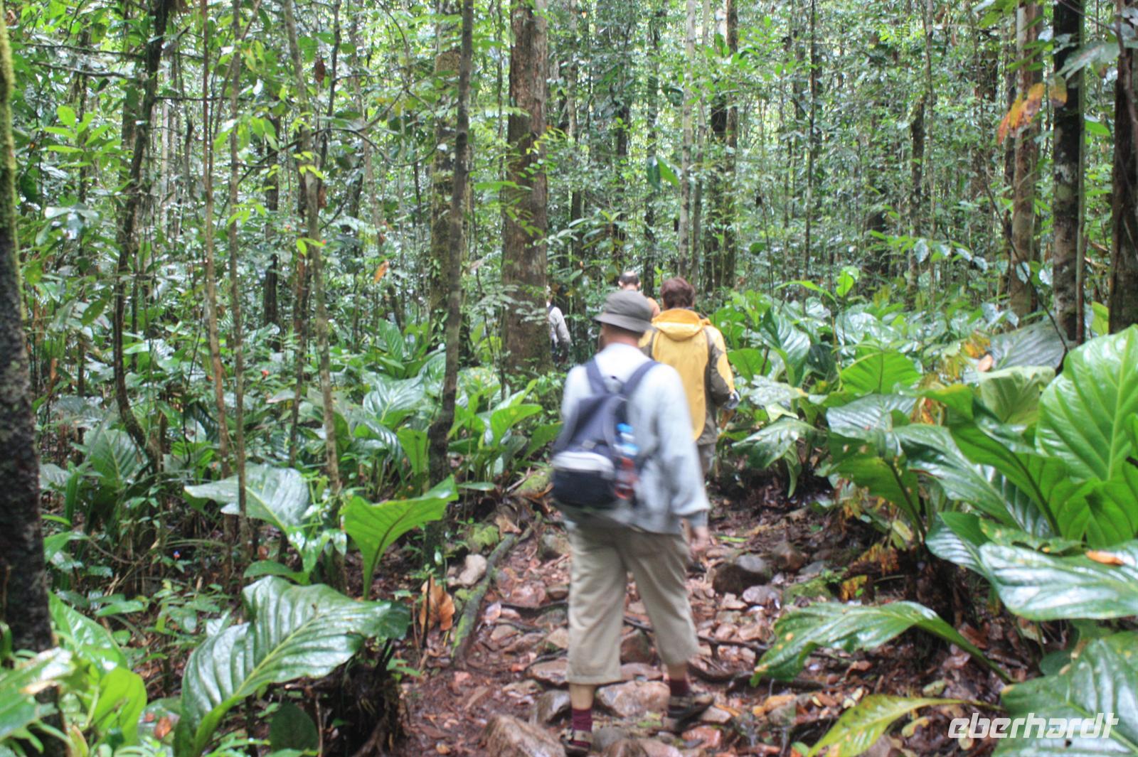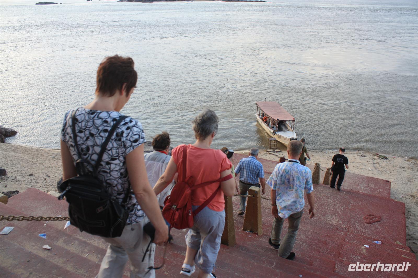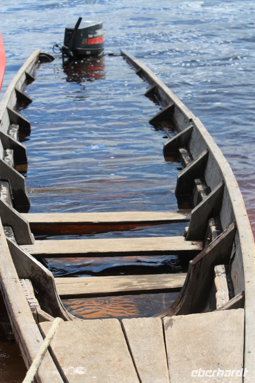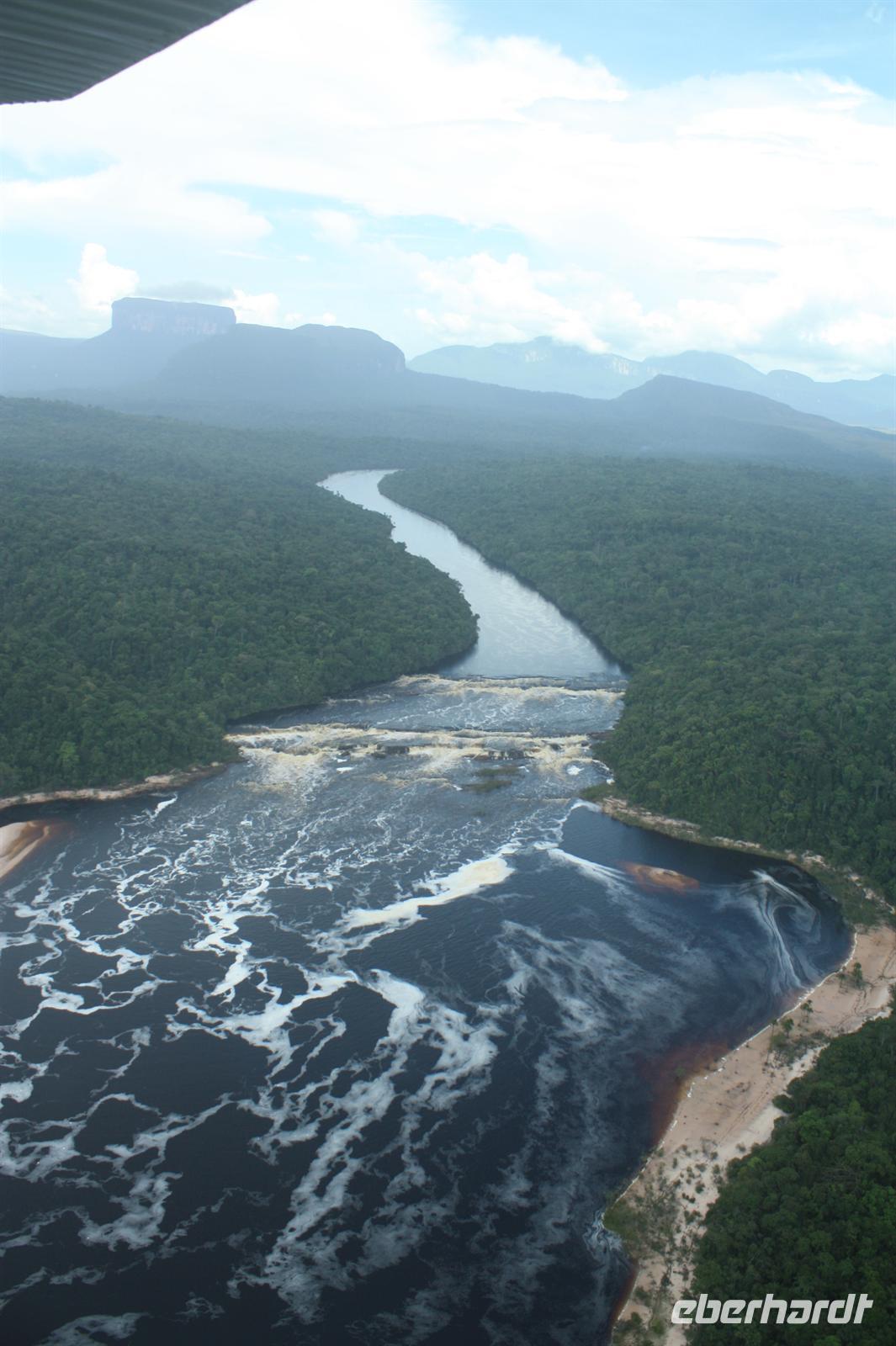 Aufgrund der frühzeitig einsetzenden Regenzeit führten die Flüsse Carao und Churún ausreichend Wasser. Somit war uns das "Glück" vergönnt den höchsten, frei fallenden Wasserfall leibhaftig zu sehen. Am 10.04.2012 machten wir uns in aller Herrgotts frühe auf dem Weg zum Schiff. Auf Holzbänken sitzend fuhren wir insgesamt 4 Stunden Flussaufwärts mit diversen Stopps. Starkregen setzte ein. Pudelnass kamen wir an der Isla Ratón an. Schlagartig hörte es auf zu regnen und wir konnten trockenen Fußes die ca. 1,5 Stunden bergauf über Stock und Stein zum Mirador wandern. Inmitten von Regenwald eröffnete sich schließlich der freie Blick auf den Salto Angel. Erschöpft aber glücklich saugten wir die Augenblicke förmlich in uns auf. Beim Mittagessen lassen wir die Eindrücke wirken ehe der Regen wieder einsetzt und wir flussabwärts nach Canaima unzählige Stromschnellen passierten. Ein abenteuerlicher Tag neigt sich dem Ende.
