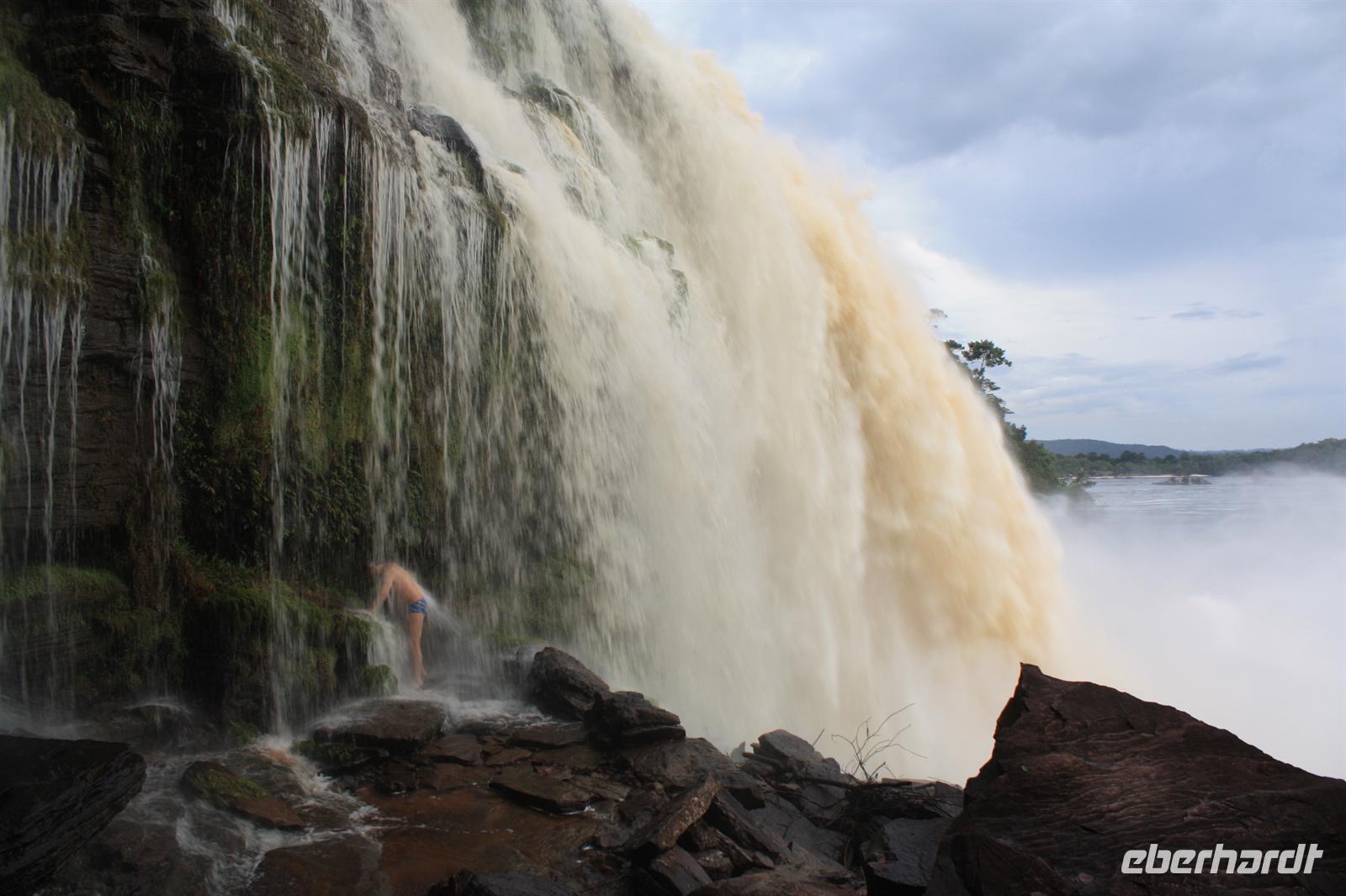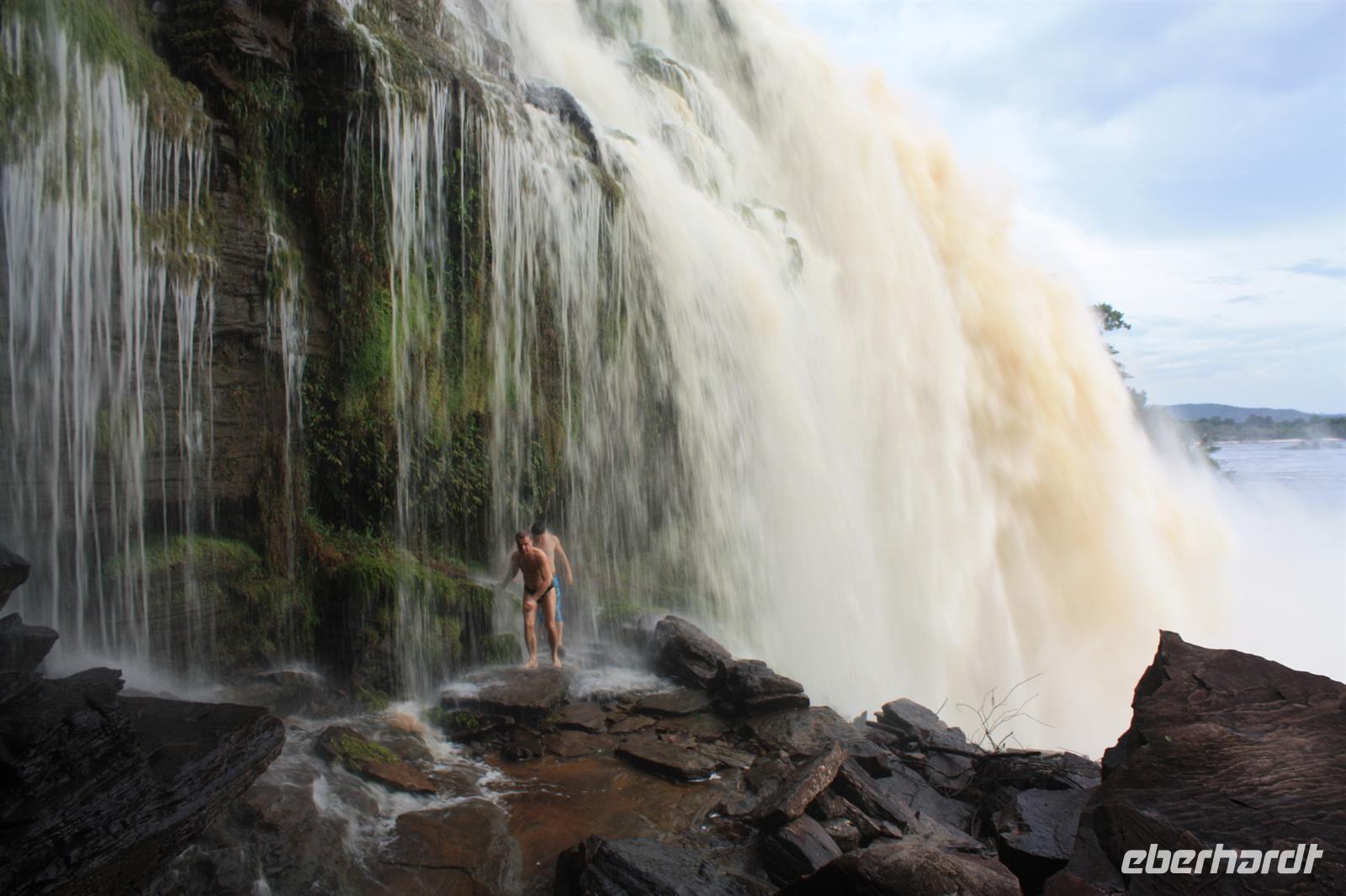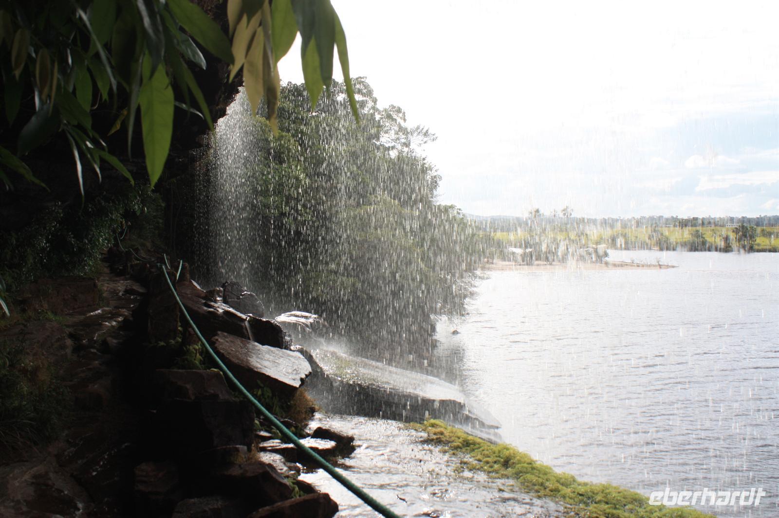 Da wir in den ersten Tagen sooooo... selten ein Flughafengebäude von innen gesehen habe, statteten wir am 09.04.2012, einem sonnigen Dienstag, dem Flughafen in Ciudad Bolivar einen Besuch ab. Hier wurde unsere Geduld auf eine hart Probe gestellt. Schlussendlich flogen wir in allen uns zur Verfügung stehenden Maschinen in den Nationalpark Canaima. Per Jet Stream direkt nach Canaima, per Cesna inkl. Rundflug zum Salto Angel zum Bestimmungsort und per Sonderflug flog Siegfried als Co-Pilot exklusiv in den Nationalpark, natürlich auch mit Rundflug. Per Cesna holte schließlich die 4-köpfige "Jet Stream"-Gruppe auch Ihren Flug über den Salto Angel nach. Nachmittags ging die gesamte Gruppe buchstäblich baden. Per motorisierten Einbaum überquerten wir die Lagune von Canaima vorbei an den 4 Saltos Hacha, Wadaima, Golondrina und Ucaima. Ziel war der Salto Sappo. Ganz genau betrachteten wir diesen Wasserfall: zuerst von oben, danach von der Seite und schließlich mitten durch. Allesamt nahmen wir ein natürliches Vollbad inkl. Rückenmassage. Wir wiederholten das Erlebnis gleich darauf am Salto Hacha. In den kommenden Tagen lernten wir allerdings die Nässe zu schätzen aber auch zu verfluchen.
