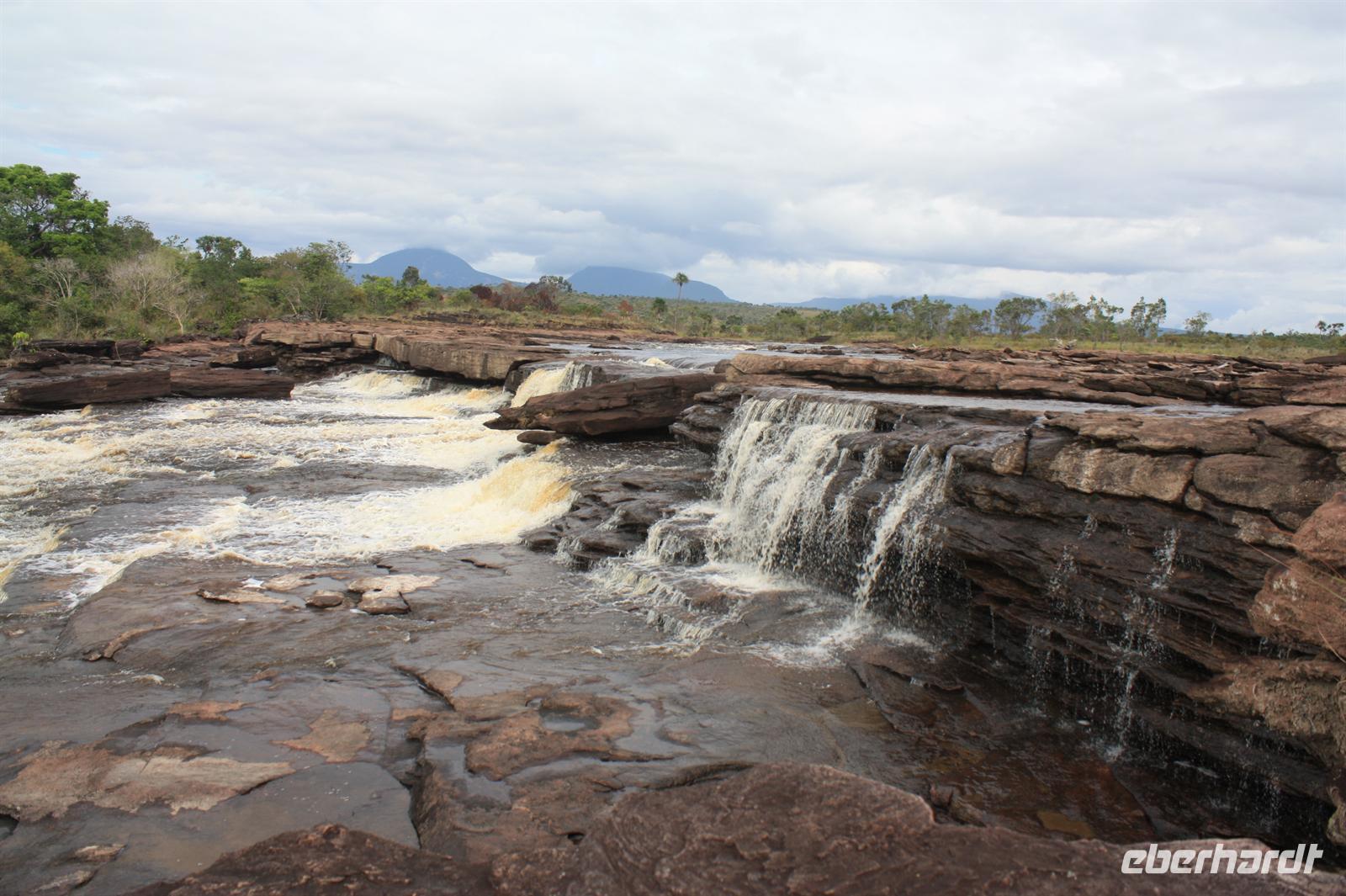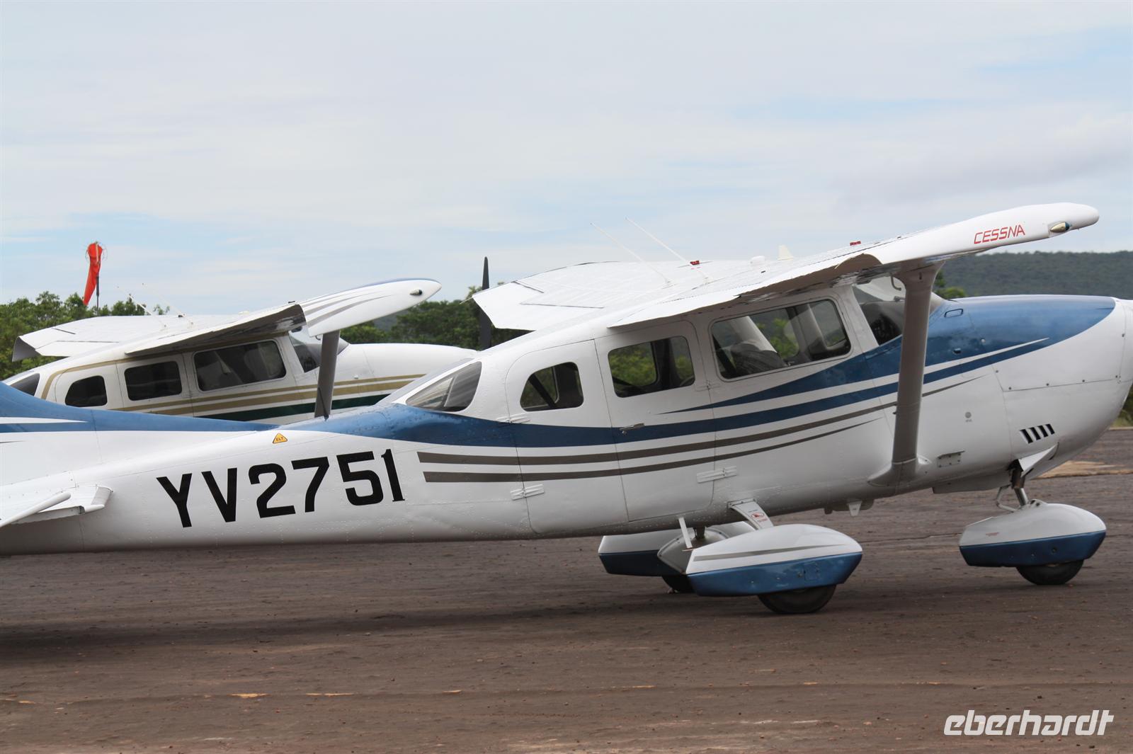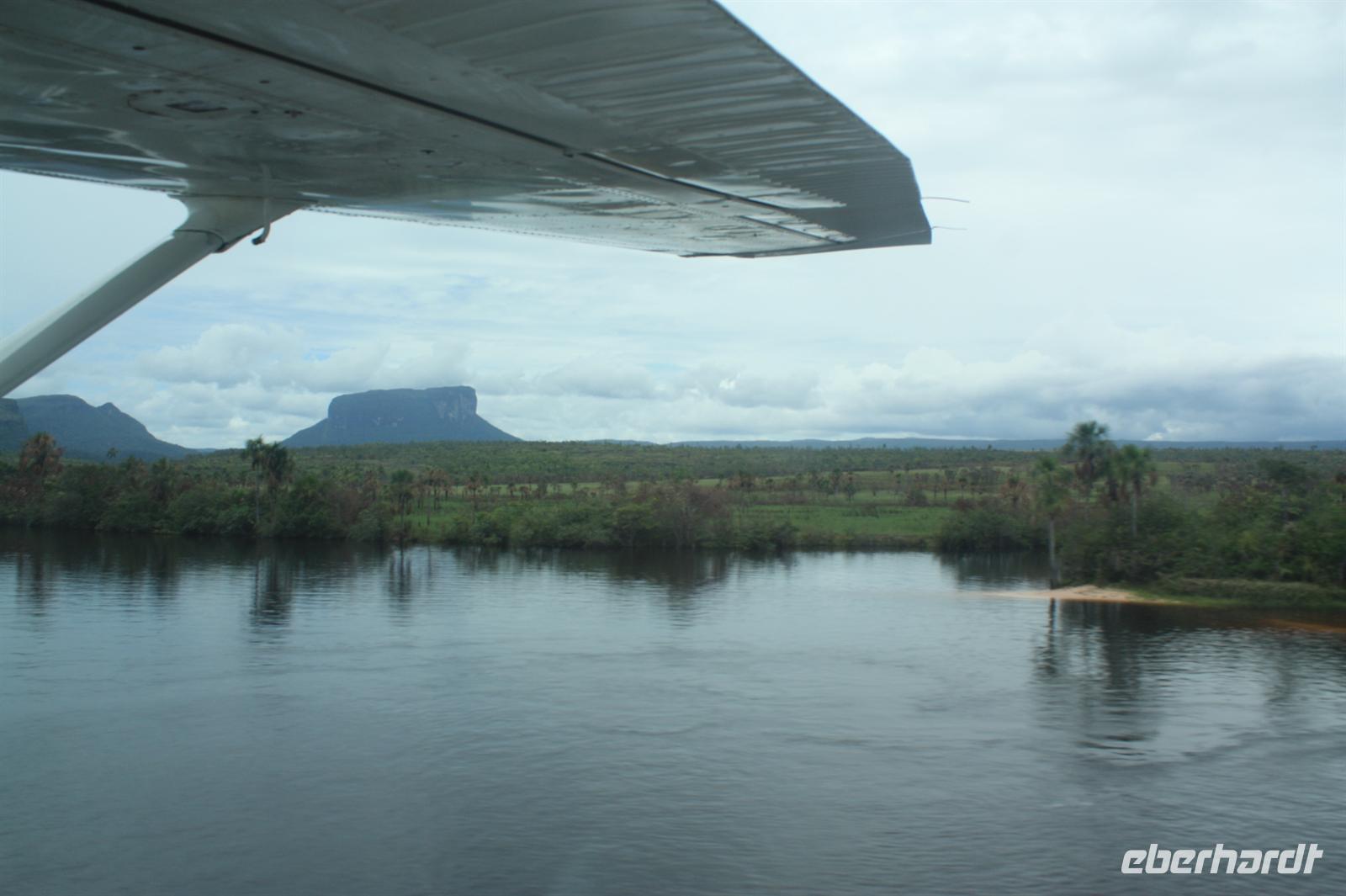 Da wir in den ersten Tagen sooooo... selten ein Flughafengebäude von innen gesehen habe, statteten wir am 09.04.2012, einem sonnigen Dienstag, dem Flughafen in Ciudad Bolivar einen Besuch ab. Hier wurde unsere Geduld auf eine hart Probe gestellt. Schlussendlich flogen wir in allen uns zur Verfügung stehenden Maschinen in den Nationalpark Canaima. Per Jet Stream direkt nach Canaima, per Cesna inkl. Rundflug zum Salto Angel zum Bestimmungsort und per Sonderflug flog Siegfried als Co-Pilot exklusiv in den Nationalpark, natürlich auch mit Rundflug. Per Cesna holte schließlich die 4-köpfige "Jet Stream"-Gruppe auch Ihren Flug über den Salto Angel nach. Nachmittags ging die gesamte Gruppe buchstäblich baden. Per motorisierten Einbaum überquerten wir die Lagune von Canaima vorbei an den 4 Saltos Hacha, Wadaima, Golondrina und Ucaima. Ziel war der Salto Sappo. Ganz genau betrachteten wir diesen Wasserfall: zuerst von oben, danach von der Seite und schließlich mitten durch. Allesamt nahmen wir ein natürliches Vollbad inkl. Rückenmassage. Wir wiederholten das Erlebnis gleich darauf am Salto Hacha. In den kommenden Tagen lernten wir allerdings die Nässe zu schätzen aber auch zu verfluchen.