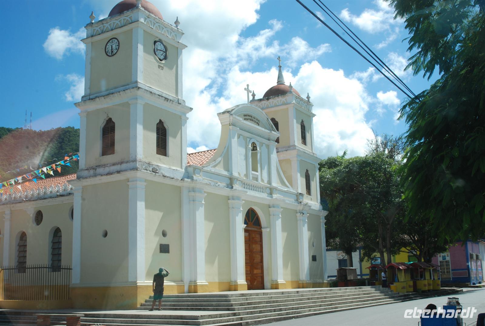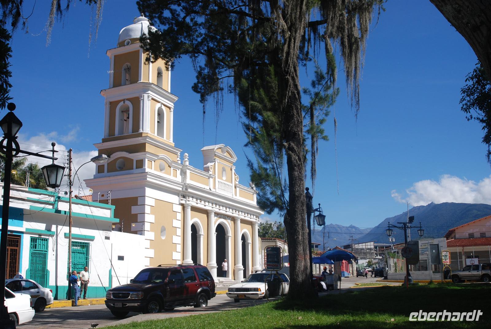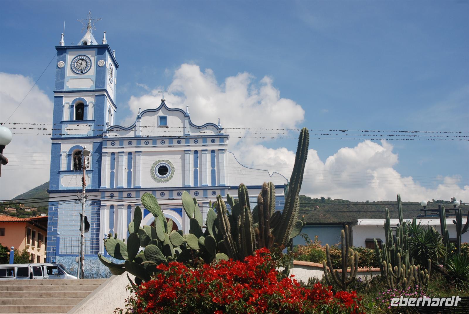 Heute stehen wir noch vor Tagesanbruch auf und stärken uns mit dem frisch zubereiteten Frühstück: frisch gepresster Saft, Rührei, Toast und Schinken. Am Flughafen erwartet uns anschließend eine lange Schlange am Check-In, eine lange Schlange an der Flughafensteuer und eine lange Schlange an der Sicherheitskontrolle. Die Zeit wird immer knapper, aber Nelson versichert uns, dass das normal ist und die Maschine nicht ohne uns startet. Und tatsächlich, schließt der Gate erst nachdem wir im Flugzeug Platz genommen haben. In El Vigia werden wir von zwei Autos abgeholt und starten unsere Fahrt in die Anden. Unterwegs halten wir an einer „Zuckerrohrfabrik“, eine kleine Manufaktur wo Zuckerrohr gepresst, der gewonnene Saft aufgekocht und dann mit Zucker zu einer Art Bonbonmasse in Würfel gegossen wird. Von hier führt uns die Fahrt hinauf in den kleinen Ort San Juan, wo wir die farbenfrohe Kirchenfassade am Hauptplatz sehen.