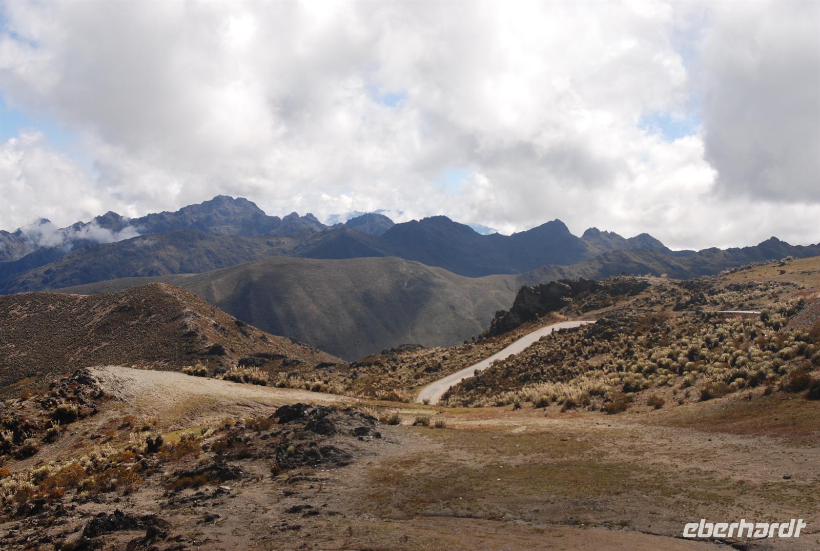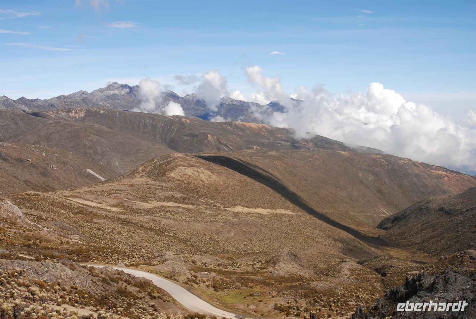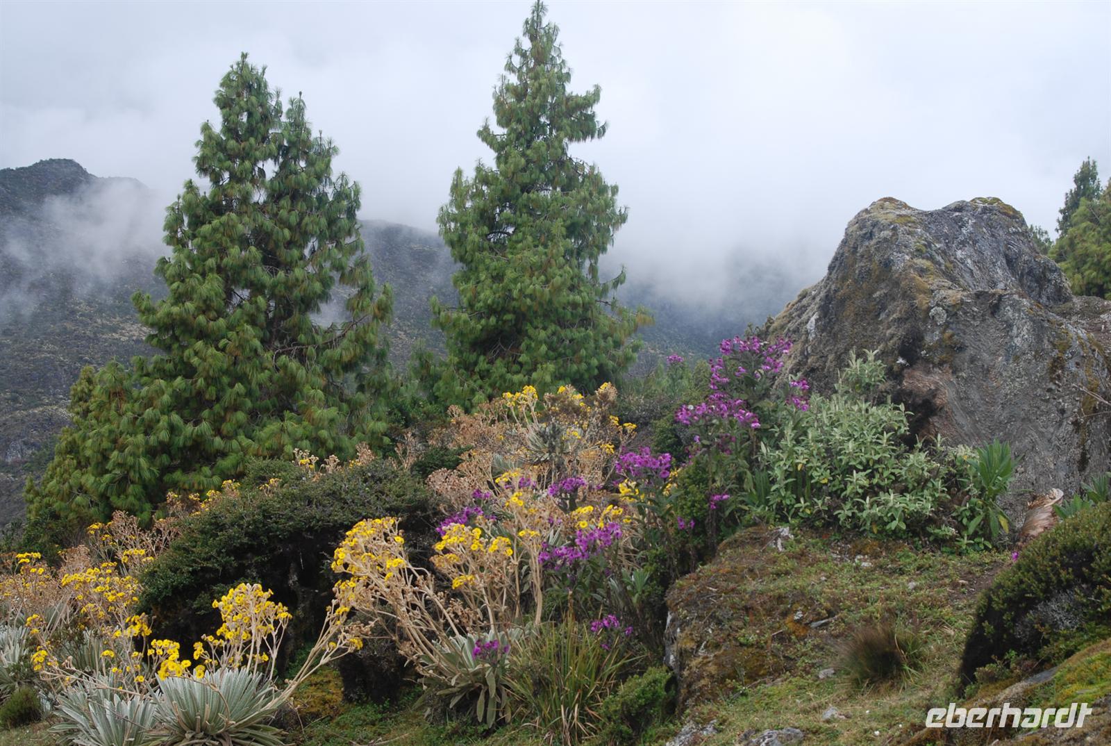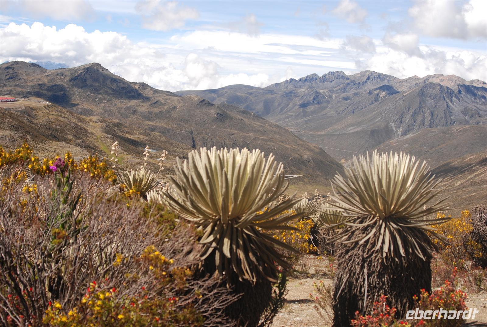 Unser erster Stopp heute ist am Paso del Aguila, dem höchsten Bergpass Venezuelas. Hier haben wir eine fantastische Aussicht auf die umliegenden Berge und sehen die bis zu drei Meter hohen frailejones, Mönchsgewächse.