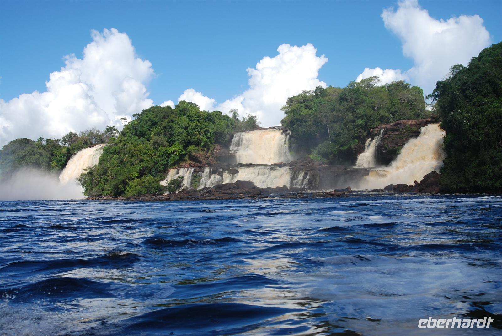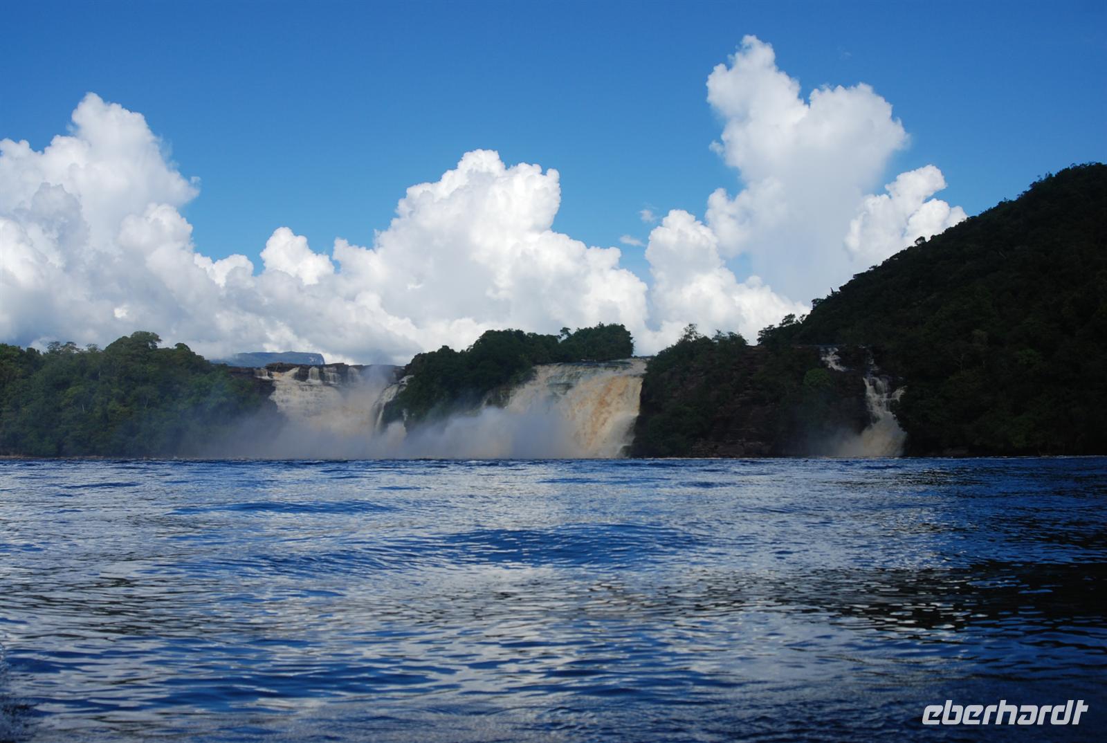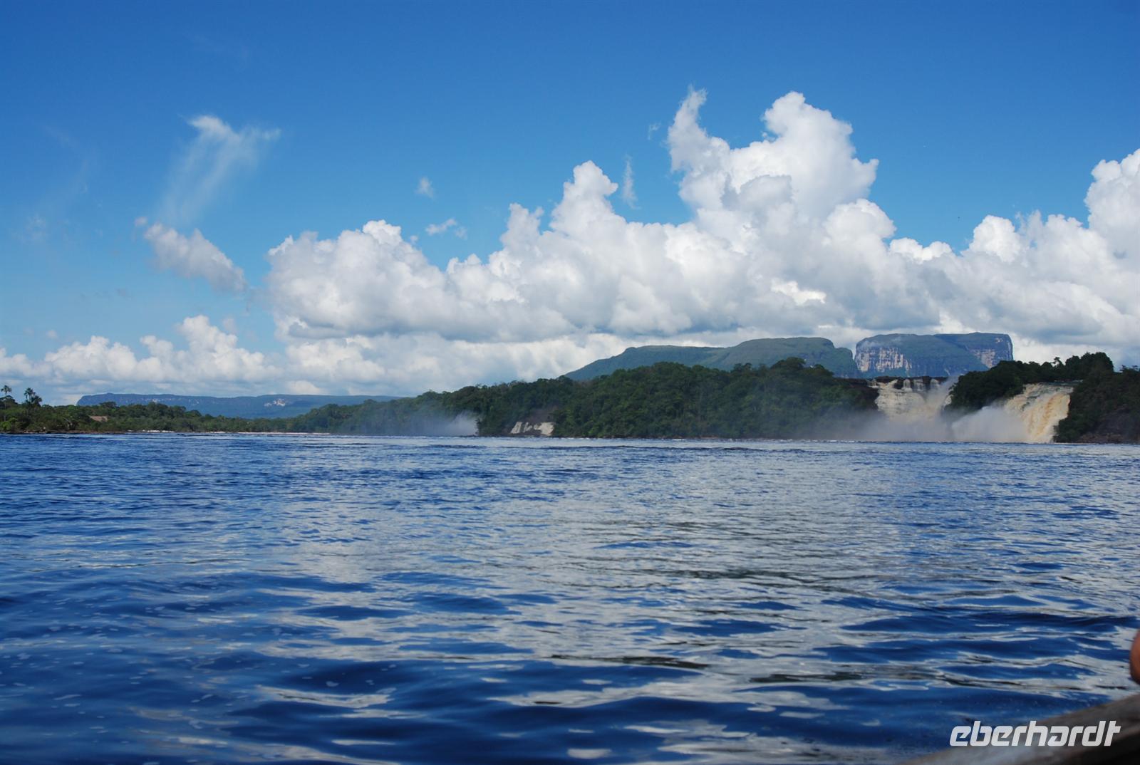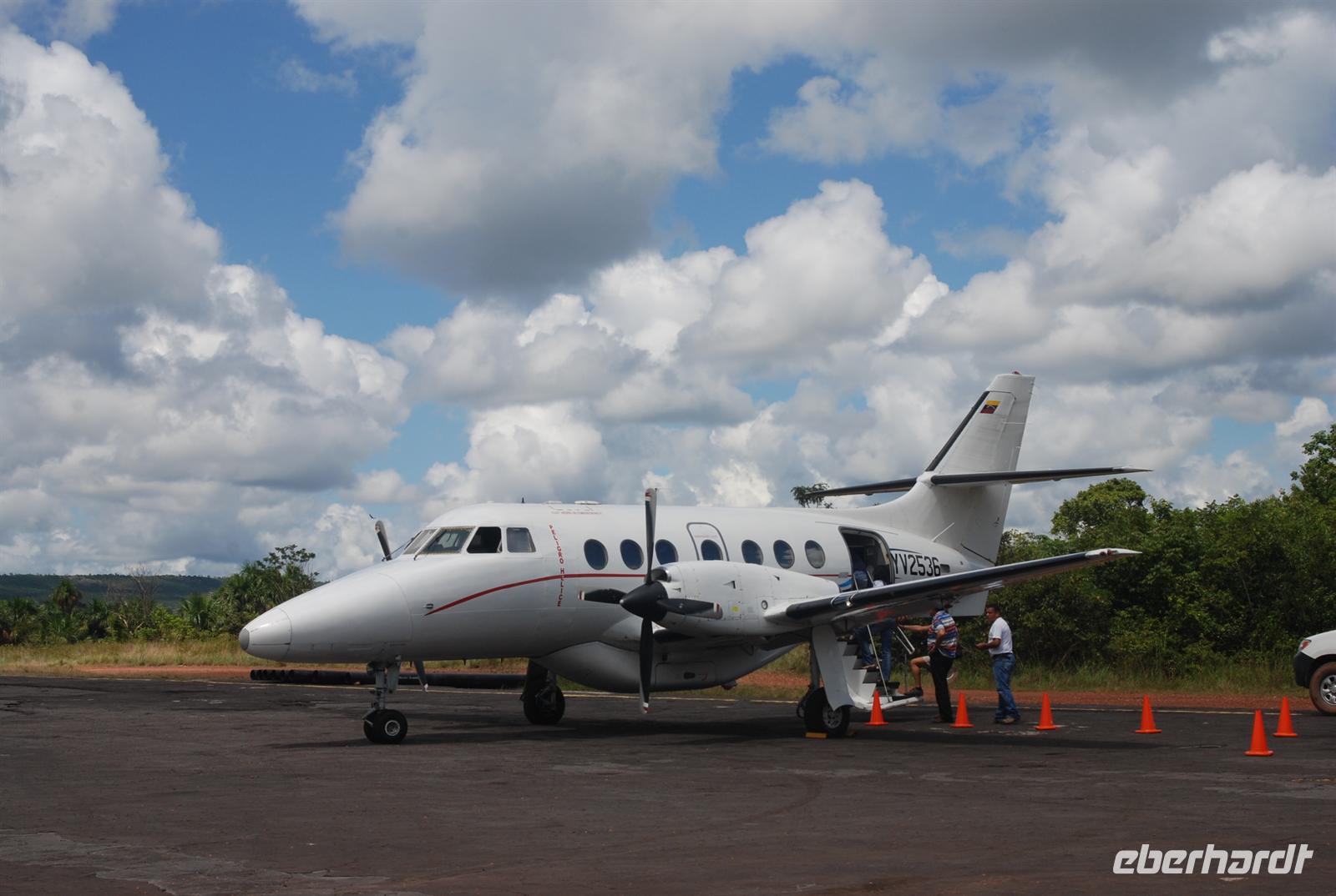 Nach wenigen Stunden Schlaf fliegen wir von Caracas über Puerto Ordaz nach Canaima. In einem kleinen Flugzeug überfliegen wir nach ca. einer halben Stunde Flugzeit den Canaima-Nationalpark und die beeindruckenden Tafelberge. Bald zeigt sich uns der Wasserfall „Salto Angel“, etwas in Wolken aber dennoch einmalig. Nach unserer Landung in Canaima werden wir durch einen umgebauten LKW mit Sitzplätzen zum Camp Parakaupa gebracht. Die Anlage ist sehr grün und die Zimmer sind hübsch. Von einer Terrasse hat man den Blick bis zur Lagune Canaima.