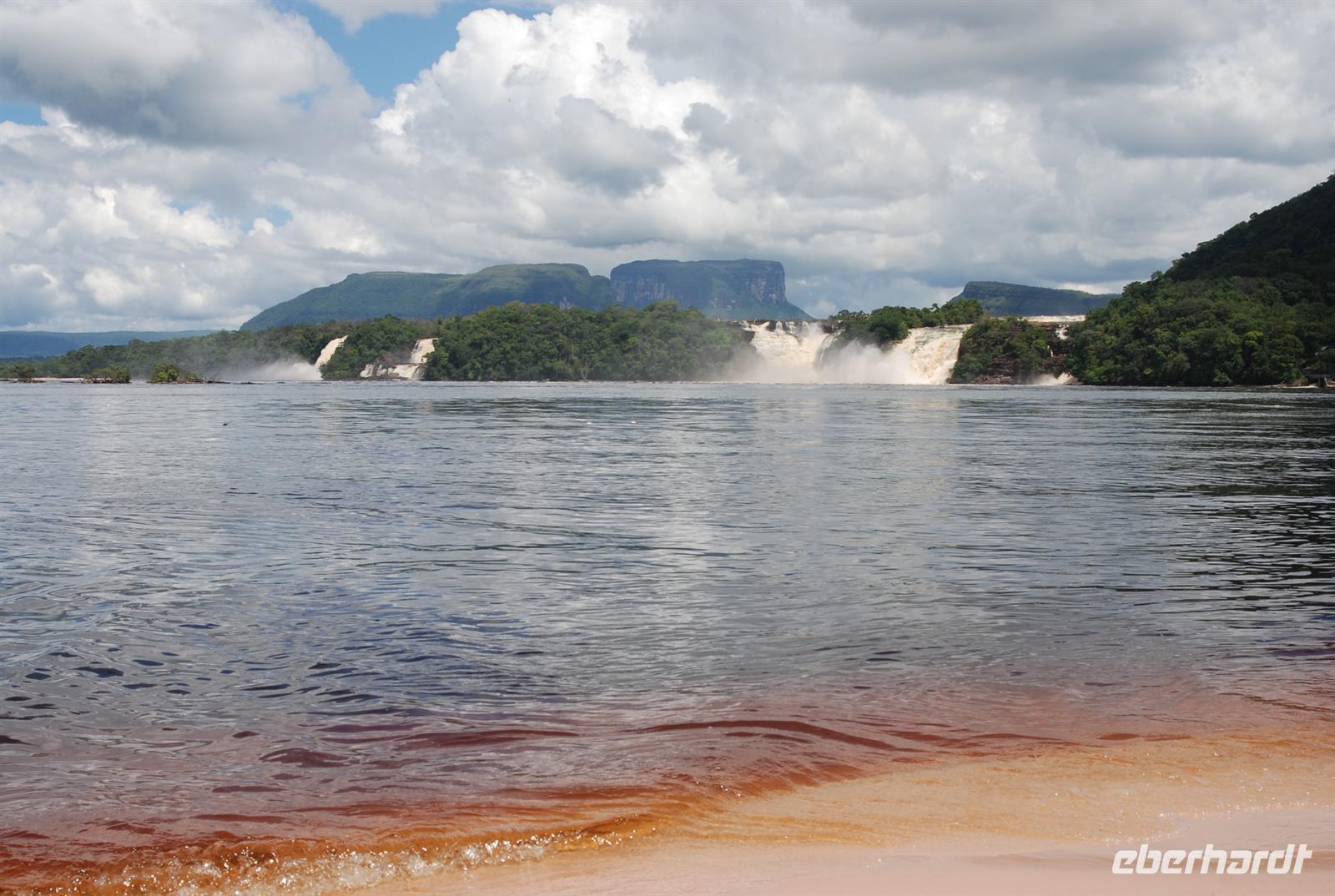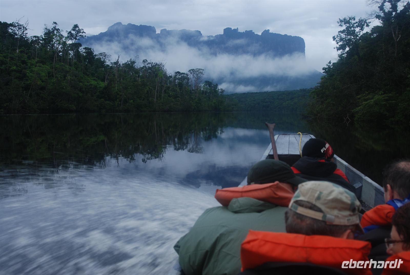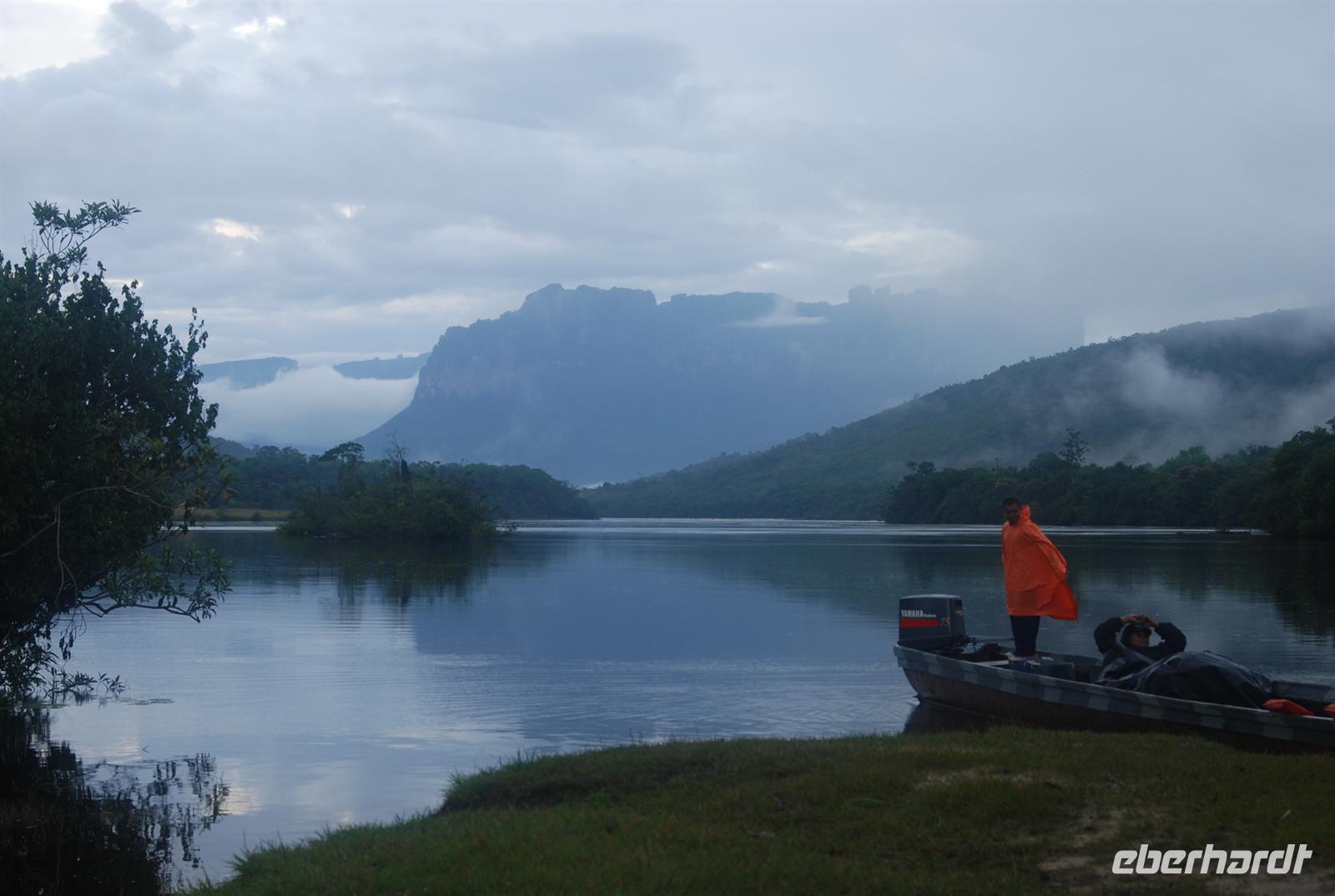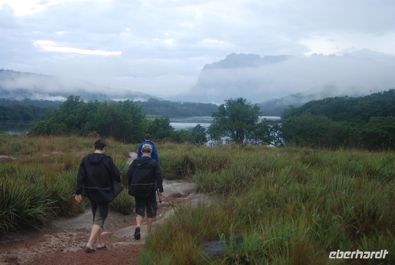Heute hat sich ein großer Teil der Gruppe für den fakultativen Ausflug zum Salto Angel entschieden. Die anderen Gäste relaxen heute im Camp und unternehmen am Nachmittag einen Spaziergang mit Nelson zur großen Lagune. Wir werden kurz vor 4 Uhr geweckt und starten 5 Uhr unseren Ganztages-Ausflug zum Angel Fall. Dazu reisen wir für 10 Minuten im LKW zum Carrao-Fluss oberhalb der Lagune und steigen hier ins motorisierte Kanu um. Hier werden wir leider erst einmal dazu gezwungen unsere Regensachen anzuziehen, denn die ersten 20 Minuten werden wir von einem starken Regenguss begleitet. Das ändert sich jedoch schnell wieder und bald können wir den Blick auf die tolle Natur um uns herum schweifen lassen. An einer Stelle wandern wir 20 Minuten, da diese zu gefährlich ist, um sie mit dem Boot zu passieren.