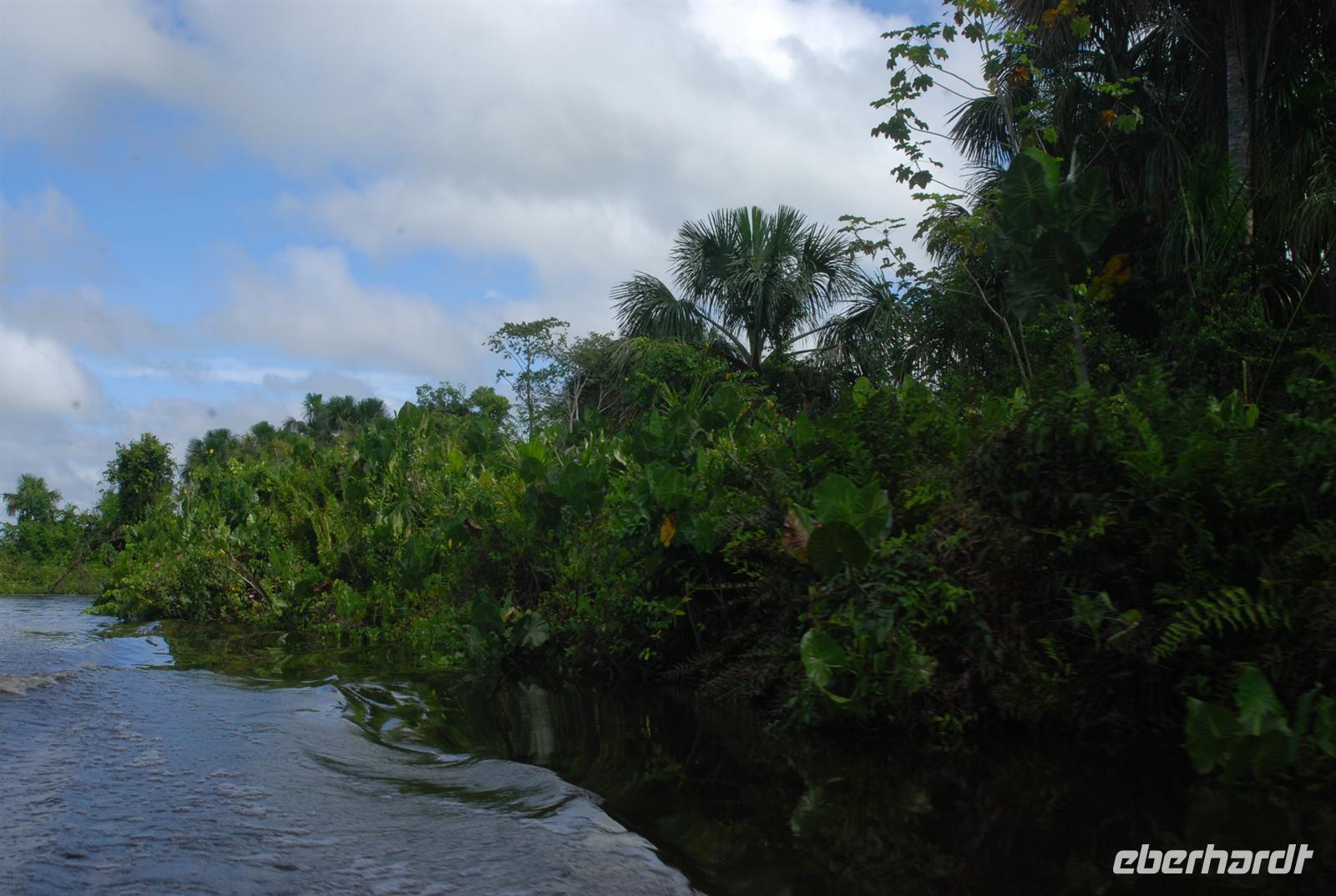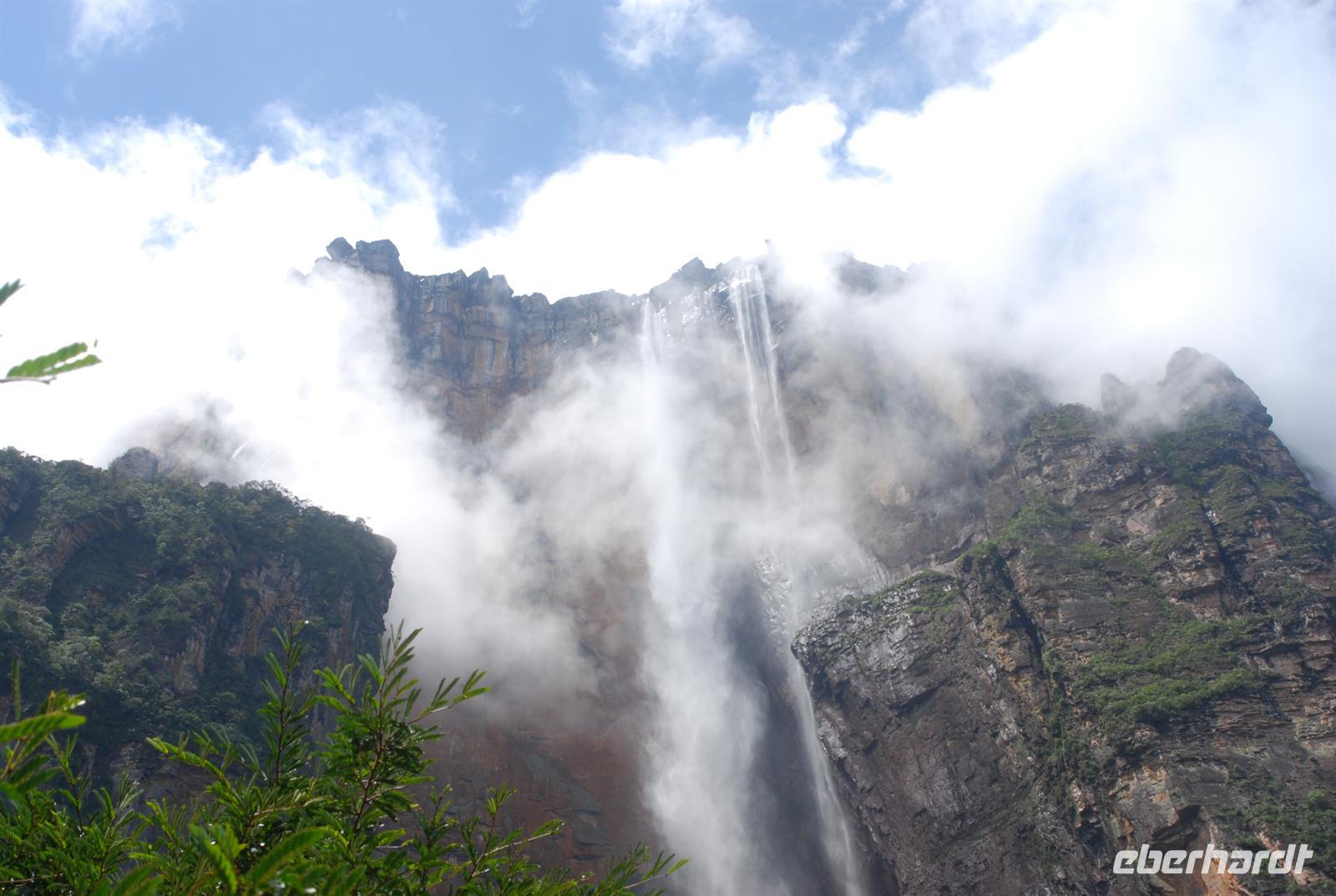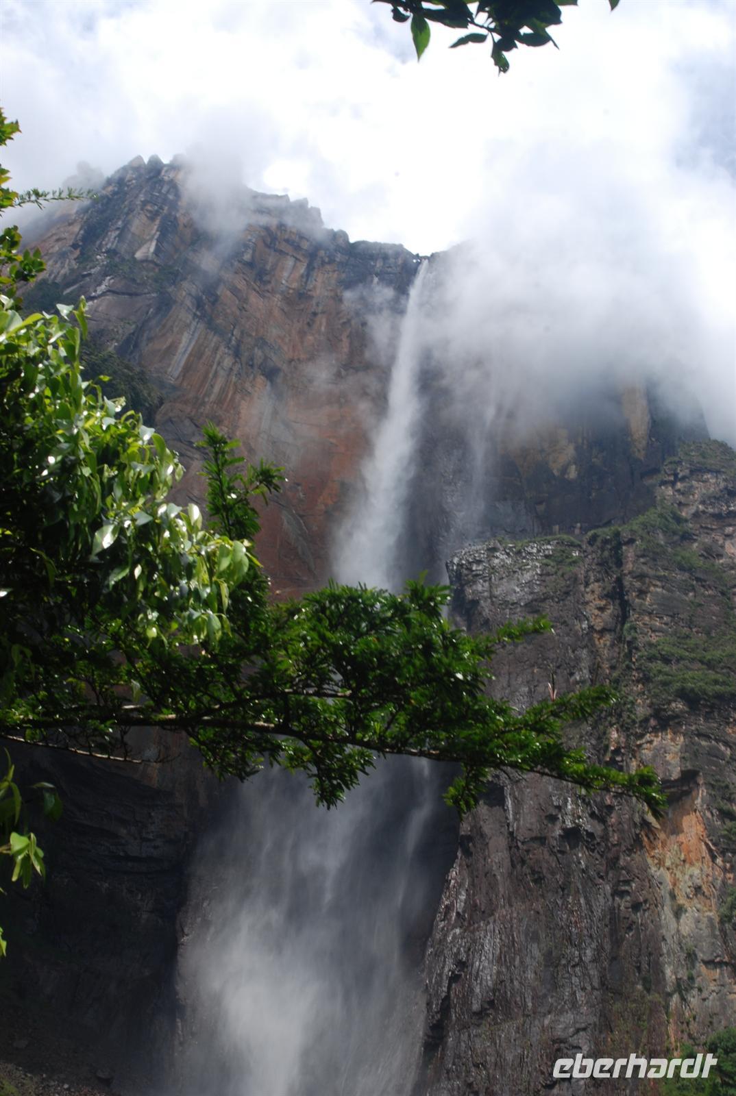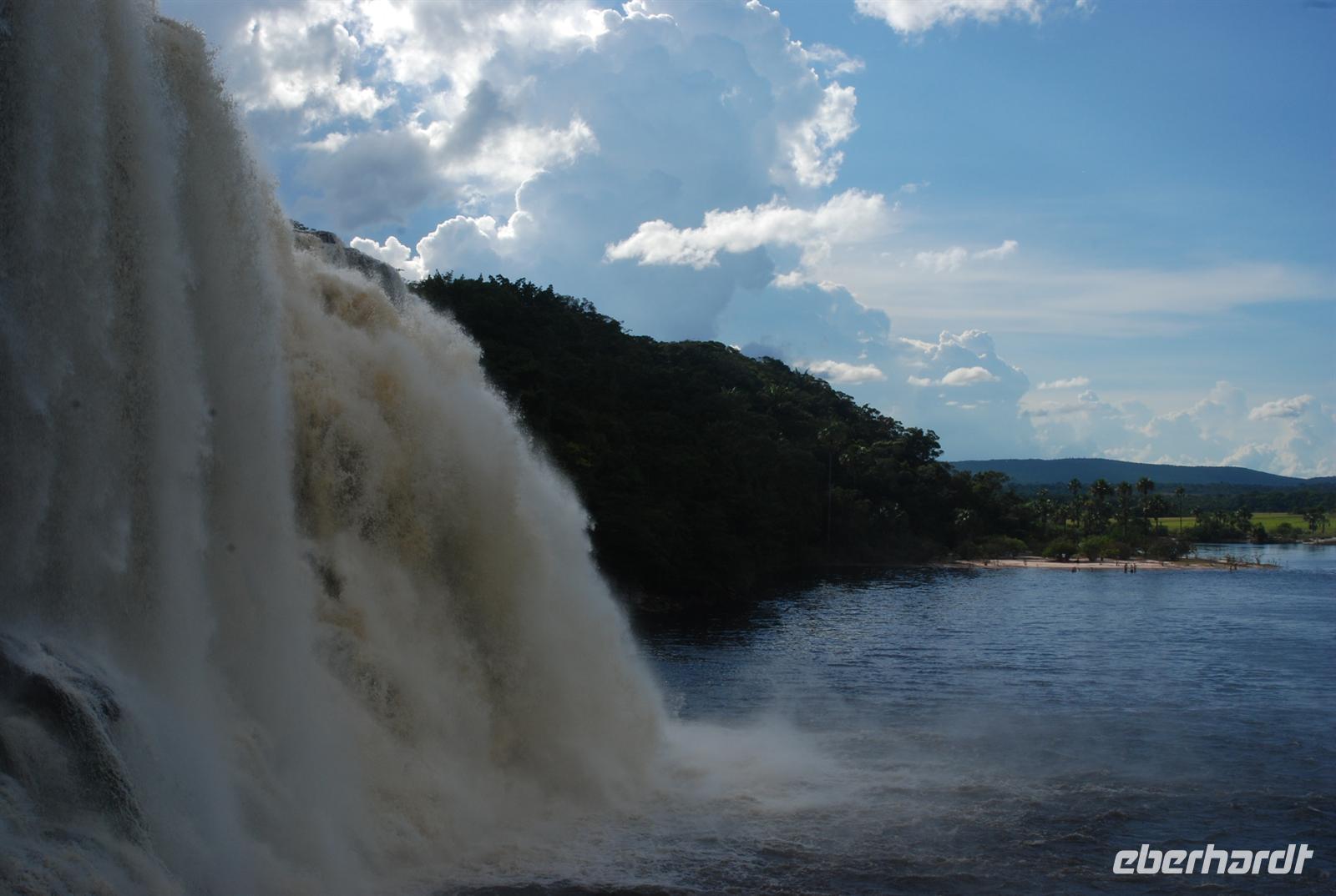 Heute hat sich ein großer Teil der Gruppe für den fakultativen Ausflug zum Salto Angel entschieden. Die anderen Gäste relaxen heute im Camp und unternehmen am Nachmittag einen Spaziergang mit Nelson zur großen Lagune. Wir werden kurz vor 4 Uhr geweckt und starten 5 Uhr unseren Ganztages-Ausflug zum Angel Fall. Dazu reisen wir für 10 Minuten im LKW zum Carrao-Fluss oberhalb der Lagune und steigen hier ins motorisierte Kanu um. Hier werden wir leider erst einmal dazu gezwungen unsere Regensachen anzuziehen, denn die ersten 20 Minuten werden wir von einem starken Regenguss begleitet. Das ändert sich jedoch schnell wieder und bald können wir den Blick auf die tolle Natur um uns herum schweifen lassen. An einer Stelle wandern wir 20 Minuten, da diese zu gefährlich ist, um sie mit dem Boot zu passieren.