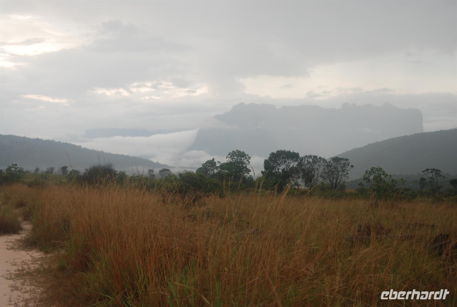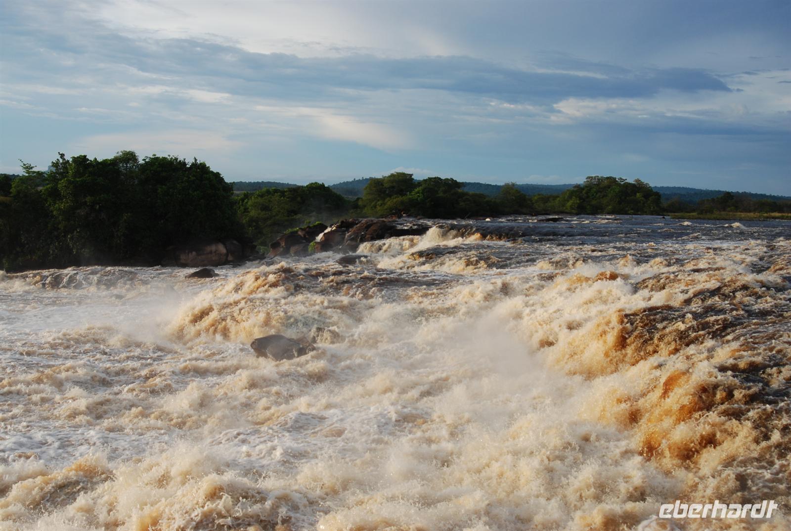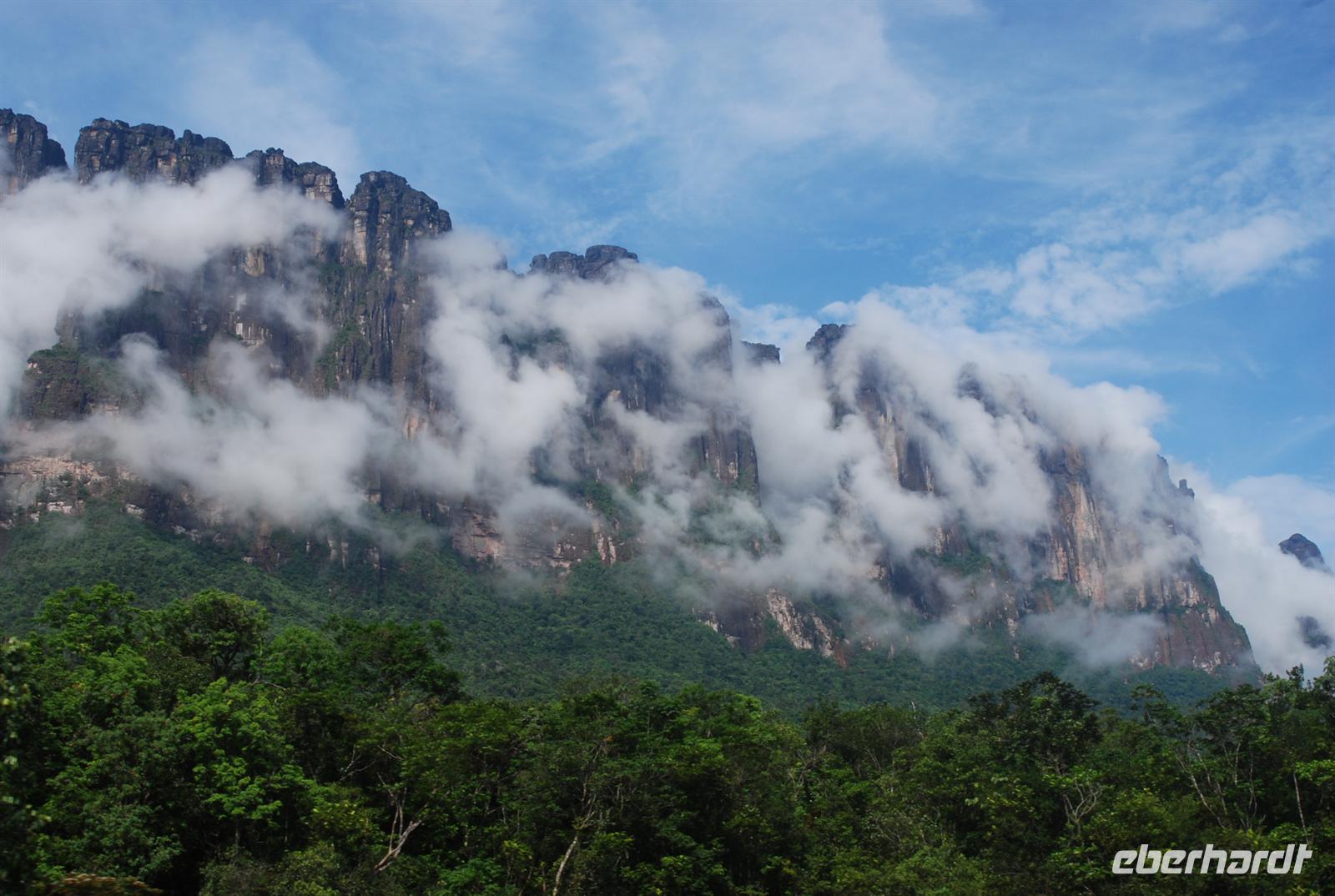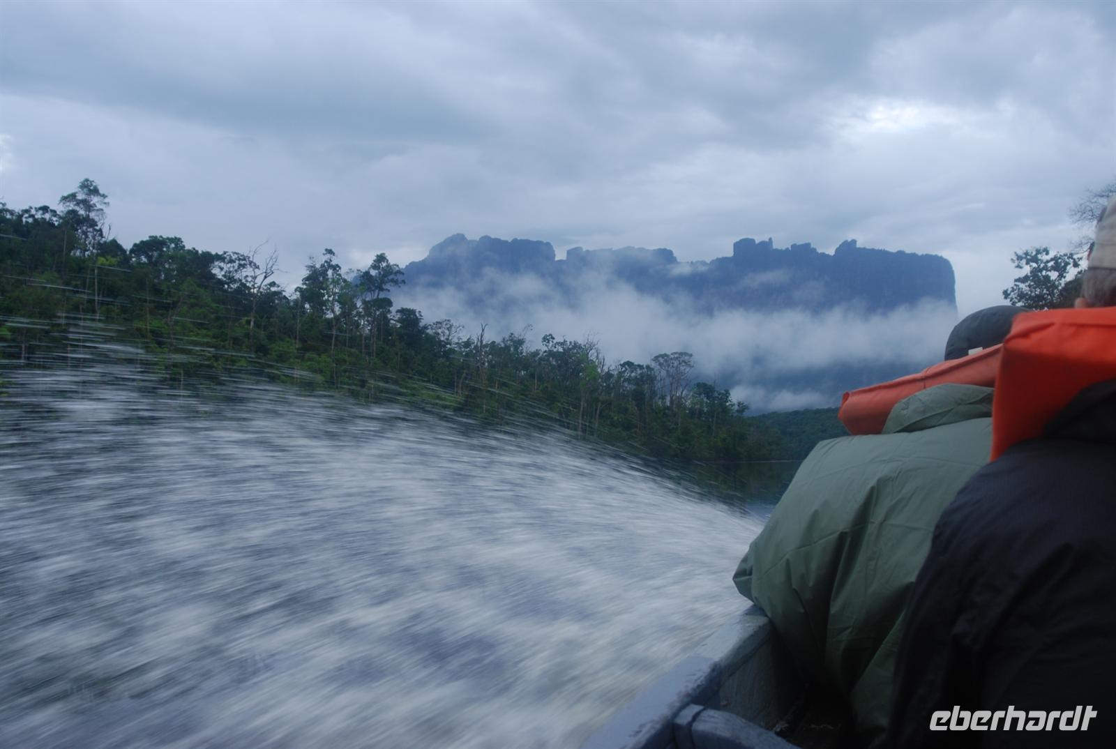 Die Tafelberge sind früh am Morgen noch leicht von Wolken verhüllt, aber trotzdem faszinierend anzusehen. Nach einem kleinen Frühstück an Land geht es noch einmal ca. zwei Stunden flussaufwärts. Gegen 9 Uhr haben wir dann unseren Startpunkt für die 1,5stündige Wanderung zum Wasserfall erreicht. Durch den Regenwald laufen wir bei 90 Prozent Luftfeuchtigkeit über große Wurzeln und Steine. Bald zahlt sich jedoch unsere Mühe aus und wir werden mit einem atemberaubenden Blick auf den fast 1000 Meter hohen Wasserfall belohnt. Hier genießen wir erst einmal in aller Ruhe. Gegen Mittag treten wir den Rückweg zum Fluss an und werden unten schon mit einem Mittagessen erwartet - gegrilltes Hühnchen. Nach einem erlebnisreichen und unvergesslichen Erlebnis erreichen wir gegen 17 Uhr wieder das Camp.