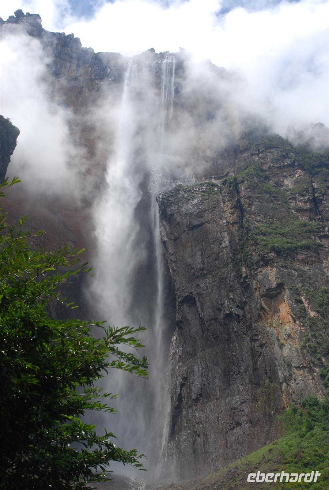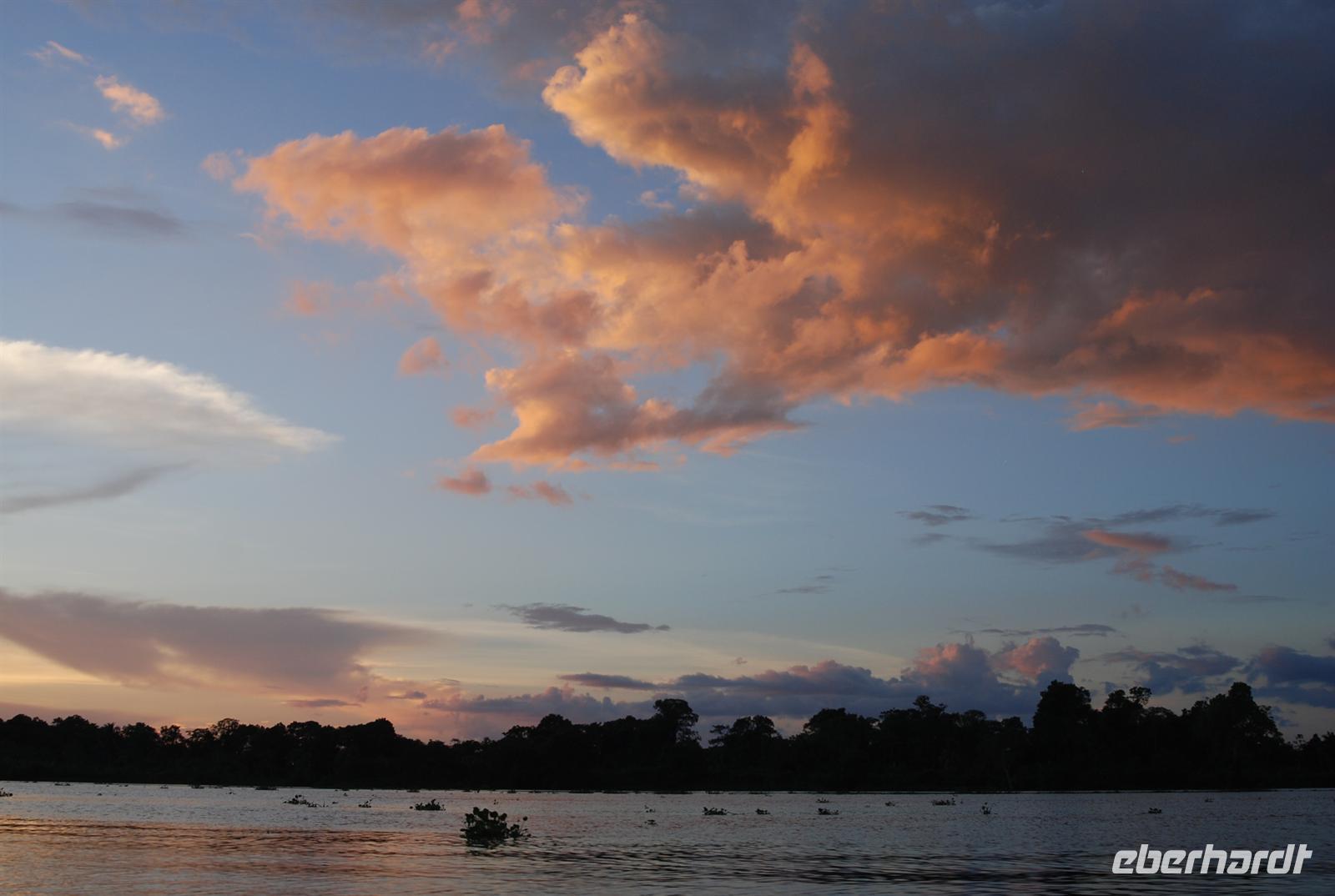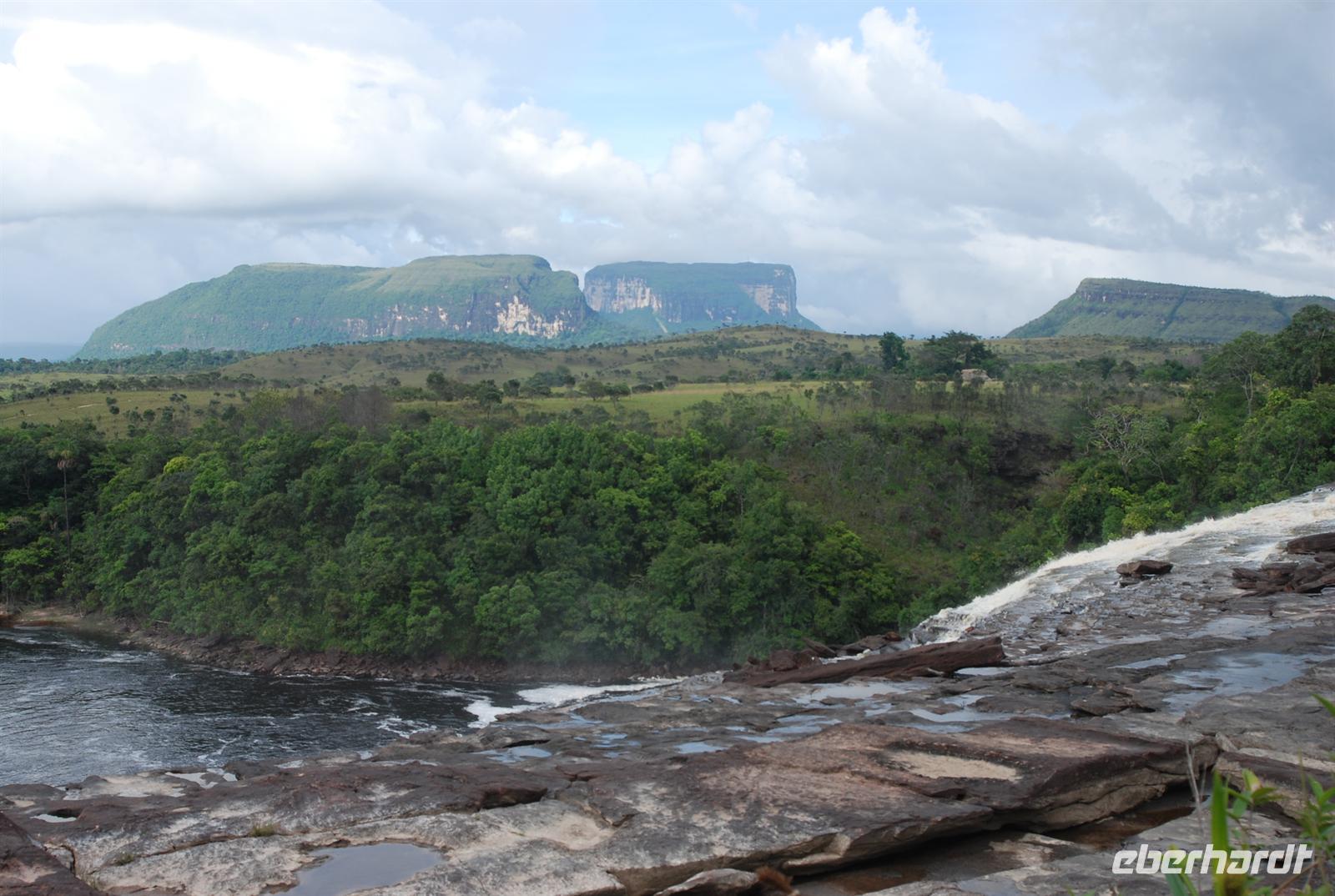 Die Tafelberge sind früh am Morgen noch leicht von Wolken verhüllt, aber trotzdem faszinierend anzusehen. Nach einem kleinen Frühstück an Land geht es noch einmal ca. zwei Stunden flussaufwärts. Gegen 9 Uhr haben wir dann unseren Startpunkt für die 1,5stündige Wanderung zum Wasserfall erreicht. Durch den Regenwald laufen wir bei 90 Prozent Luftfeuchtigkeit über große Wurzeln und Steine. Bald zahlt sich jedoch unsere Mühe aus und wir werden mit einem atemberaubenden Blick auf den fast 1000 Meter hohen Wasserfall belohnt. Hier genießen wir erst einmal in aller Ruhe. Gegen Mittag treten wir den Rückweg zum Fluss an und werden unten schon mit einem Mittagessen erwartet - gegrilltes Hühnchen. Nach einem erlebnisreichen und unvergesslichen Erlebnis erreichen wir gegen 17 Uhr wieder das Camp.