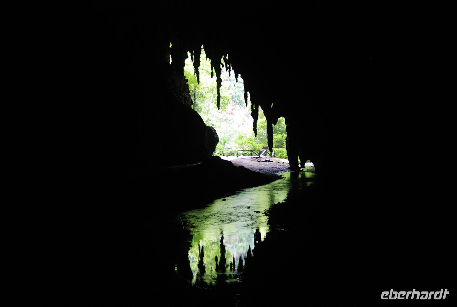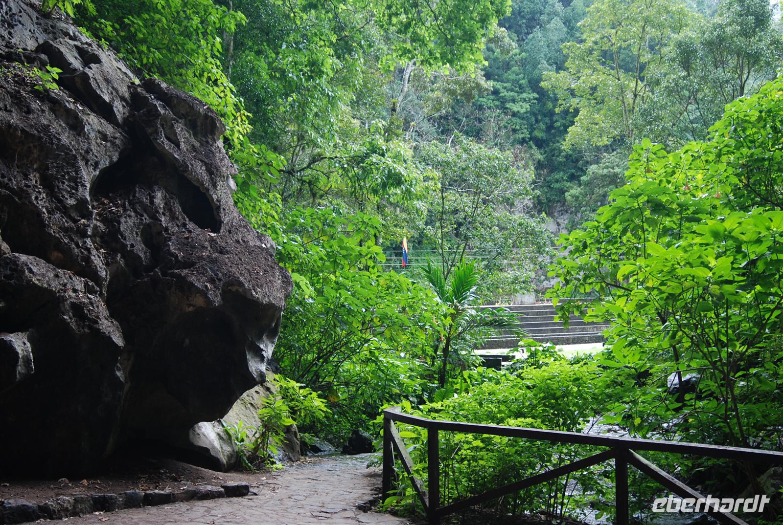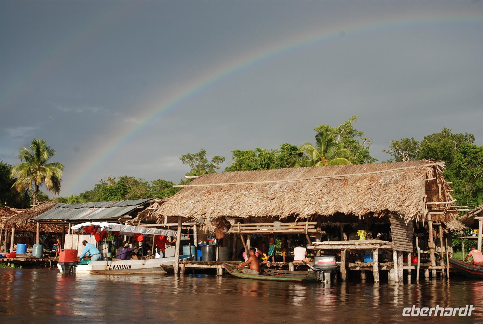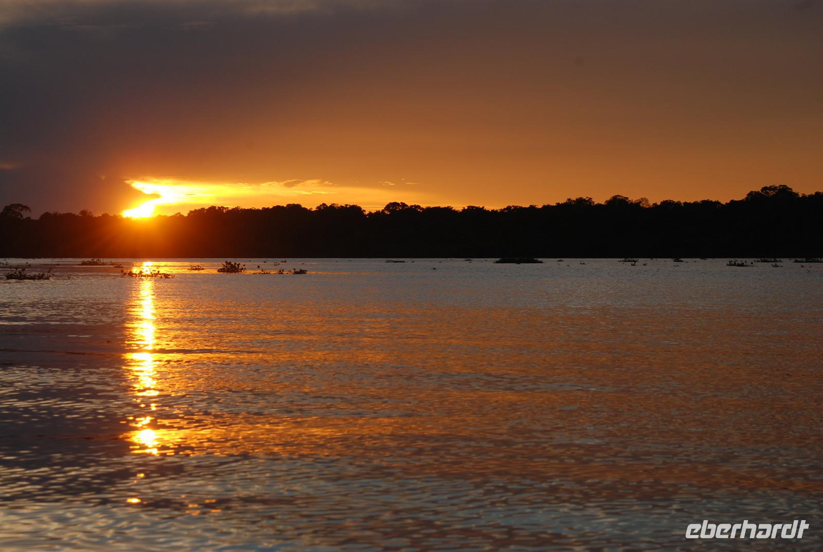 Die Tafelberge sind früh am Morgen noch leicht von Wolken verhüllt, aber trotzdem faszinierend anzusehen. Nach einem kleinen Frühstück an Land geht es noch einmal ca. zwei Stunden flussaufwärts. Gegen 9 Uhr haben wir dann unseren Startpunkt für die 1,5stündige Wanderung zum Wasserfall erreicht. Durch den Regenwald laufen wir bei 90 Prozent Luftfeuchtigkeit über große Wurzeln und Steine. Bald zahlt sich jedoch unsere Mühe aus und wir werden mit einem atemberaubenden Blick auf den fast 1000 Meter hohen Wasserfall belohnt. Hier genießen wir erst einmal in aller Ruhe. Gegen Mittag treten wir den Rückweg zum Fluss an und werden unten schon mit einem Mittagessen erwartet - gegrilltes Hühnchen. Nach einem erlebnisreichen und unvergesslichen Erlebnis erreichen wir gegen 17 Uhr wieder das Camp.