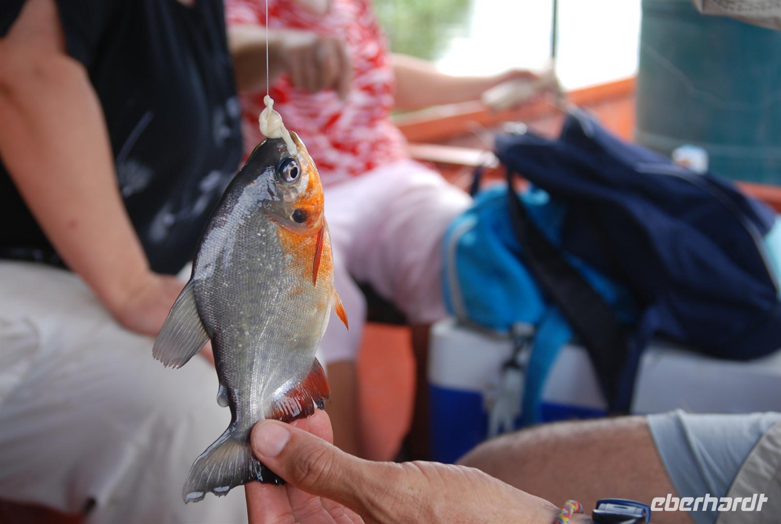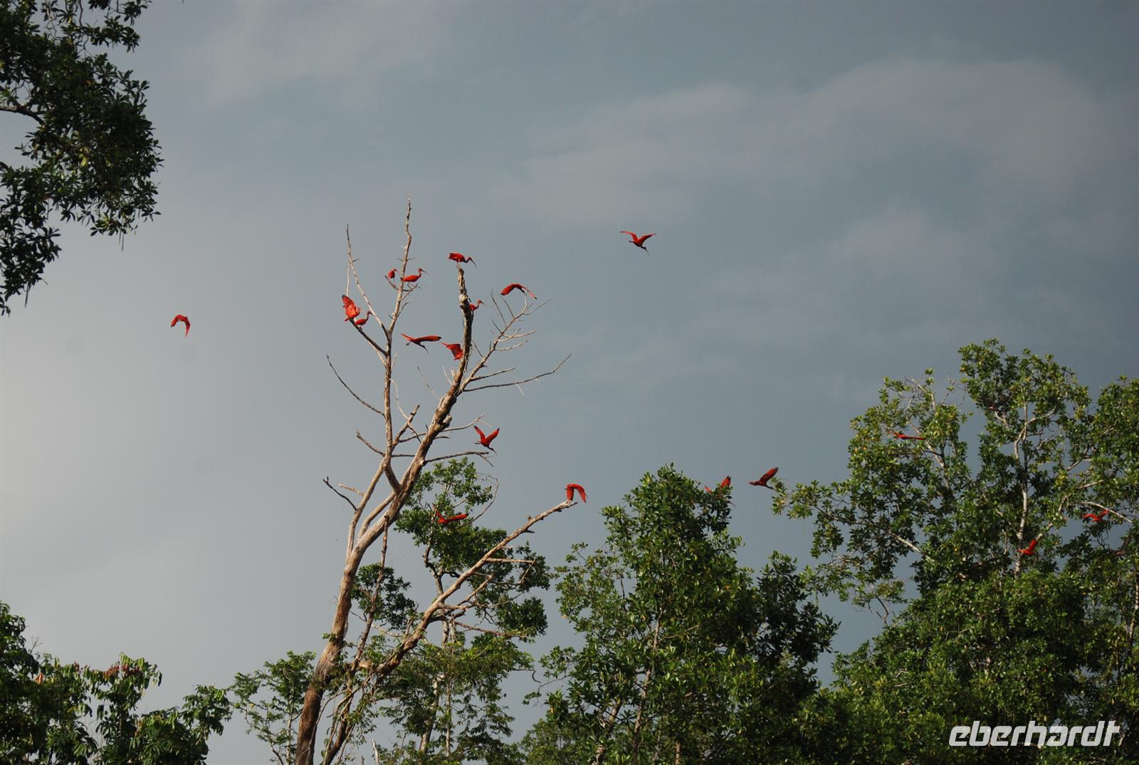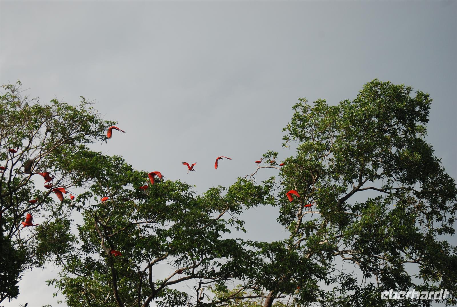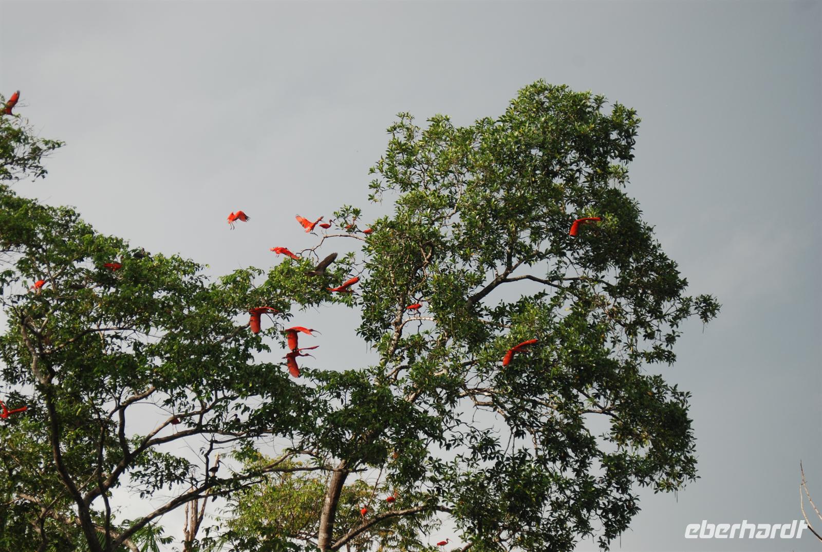 Nach dem Frühstück und der Anprobe der Gummistiefel steigen wir wieder ins Motorboot und erkunden das Delta mit seinen unzähligen Flüssen. Auf einem kleineren Seitenarm sehen wir Kapuzineräffchen und die Moriche-Palme. Nach einem kurzen Stopp an einer Delta-Raststelle holen wir unseren Warao-Wanderguide ab und fahren zur nächsten Anlegestelle. Leider hat der Fluss so starkes Hochwasser, dass ein großer Teil überflutet ist und dadurch schwer passierbar. Ein Teil der Gruppe schlägt sich trotzdem durch den kniehohen Morast. Der Guide zeigt uns wie die Einheimischen die Pflanzen zum Überleben und zur Wundheilung nutzen. Aber die Mücken fallen über uns her, so dass wir zum Teil sehr stark gezeichnet zum Ausgangspunkt zurückkehren. Dabei erwischte es einige mehr als andere :-). Anschließend fahren wir zum Mittagessen an einem anderen Rastplatz und verspeisen Hühnchen mit Kartoffel-Rote Beete Salat. Wir passieren eine Warao Siedlung, wo uns ein Mädchen zeigt wie mühsam die Herstellung einer Hängematte ist. Nachdem wir die beeindruckend roten Scharlach-Ibisse und Tukane beim Fliegen beobachtet haben kehren wir zum Camp zurück.