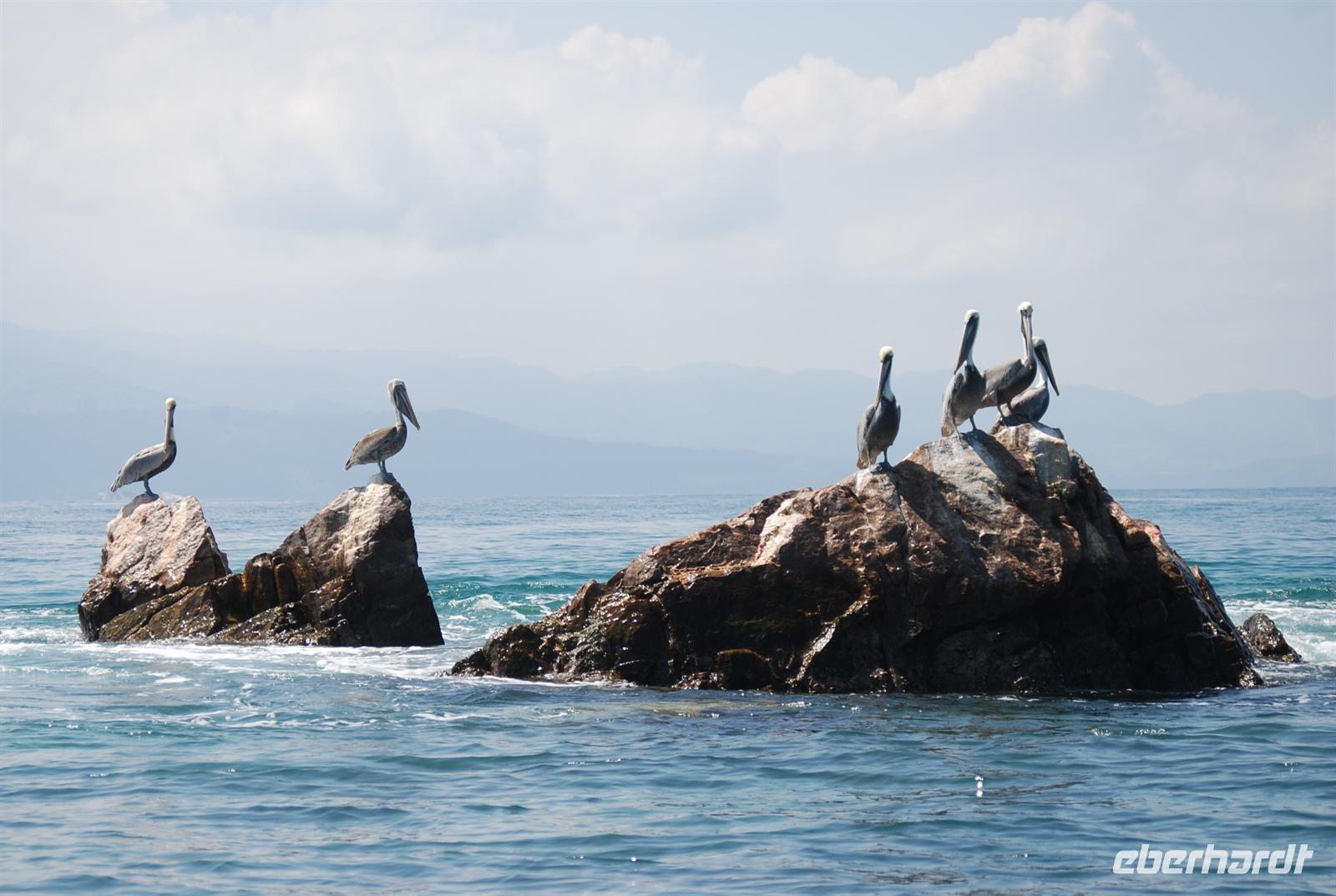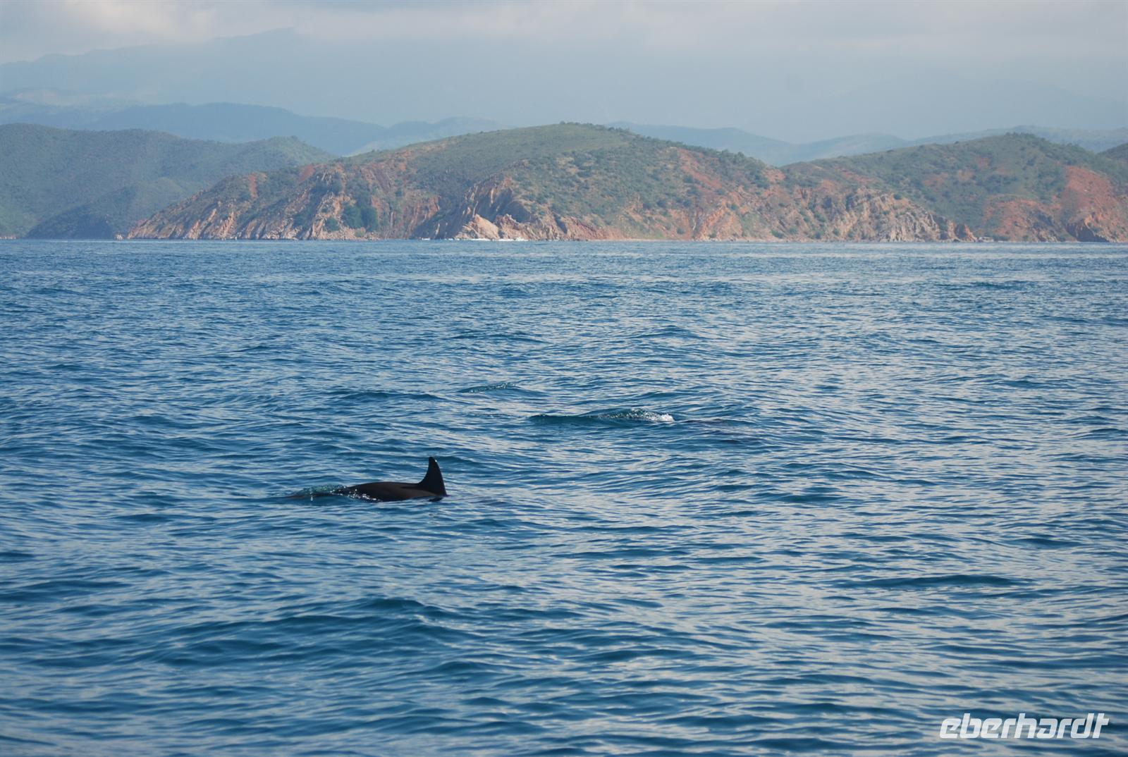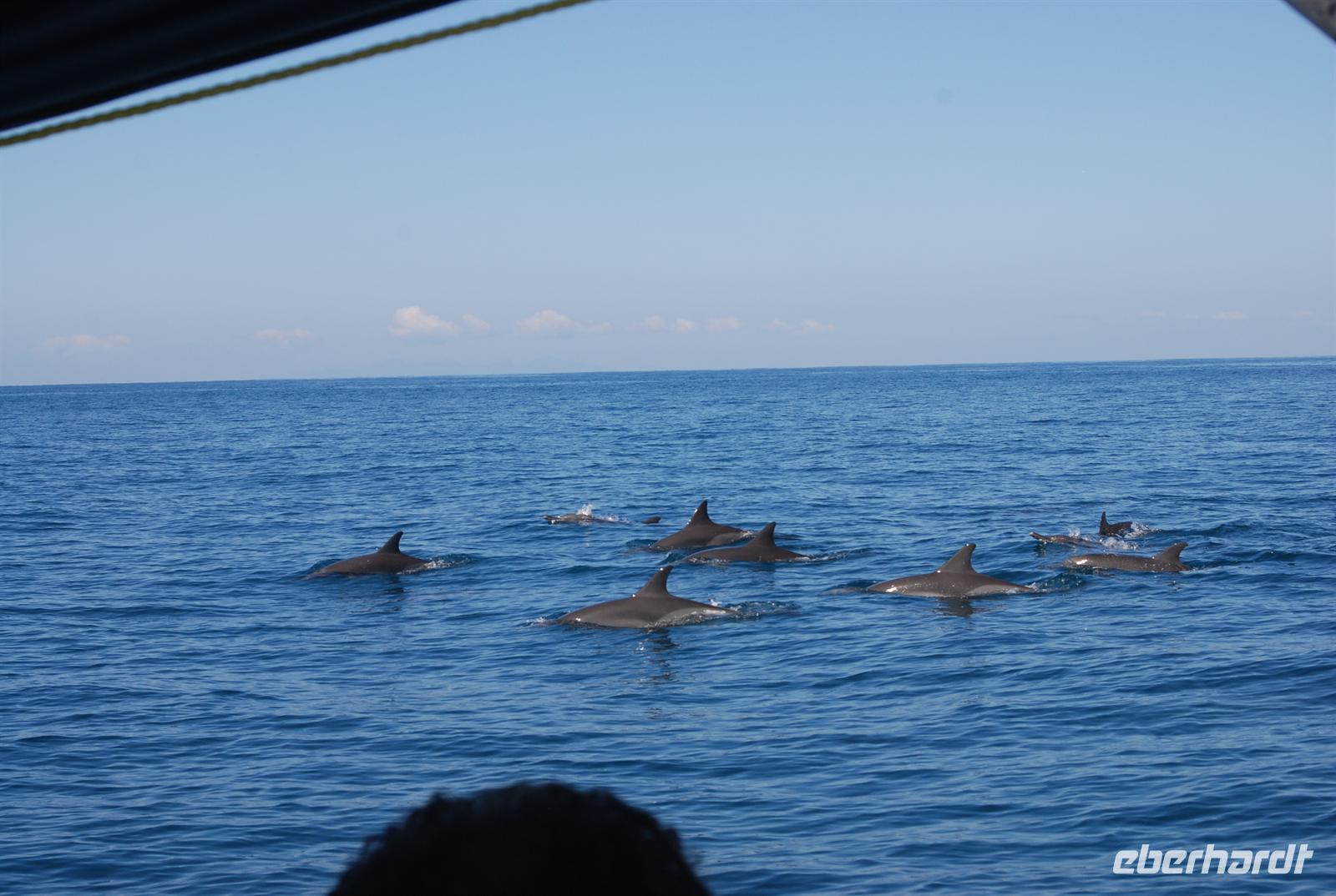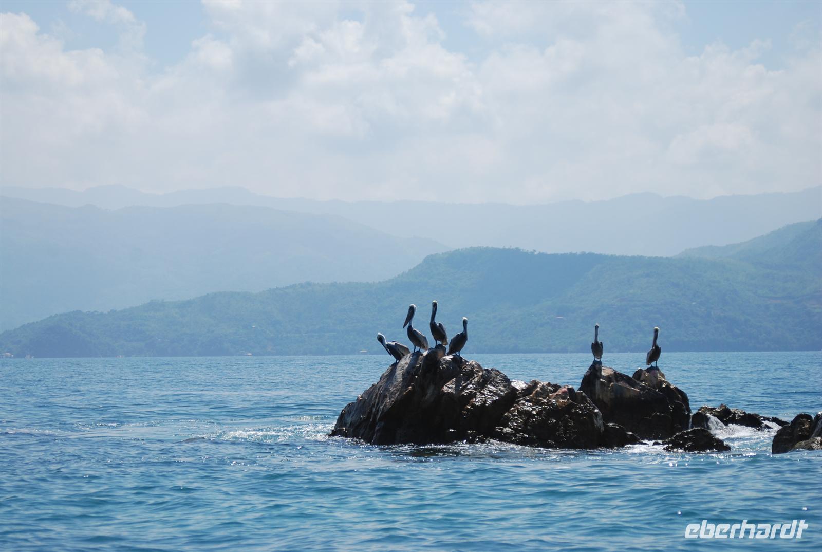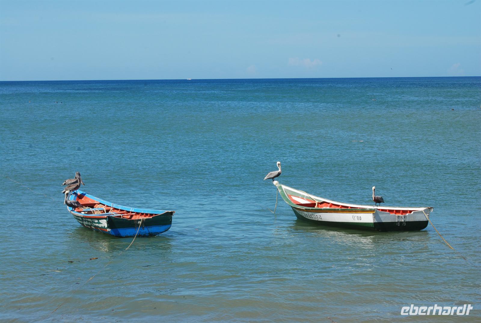 Anschließend ankern wir mit dem Boot in einer Bucht und Nelson überrascht uns mit einem hausgemachten Salat - Ensalada Ruso - und frischem Brot. Auch hier haben wir wieder Zeit zum Baden und Schnorcheln. Etwas weiter draußen treffen wir dann auf die Delfine, die lange unser Boot begleiten. Auf kleinen Steilfelsen beobachten wir Pelikane, Tölpel und Fregattvögel. Nach einem letzten schönen Schnorcheln mit Korallen treten wir die Rückfahrt nach Santa Fé und ins Hotel an. Zu Abend essen wir auf der hübschen Terrasse des Hotels Neptuno und fallen anschließend erschöpft in die Federn.