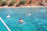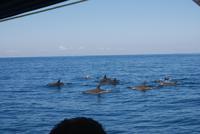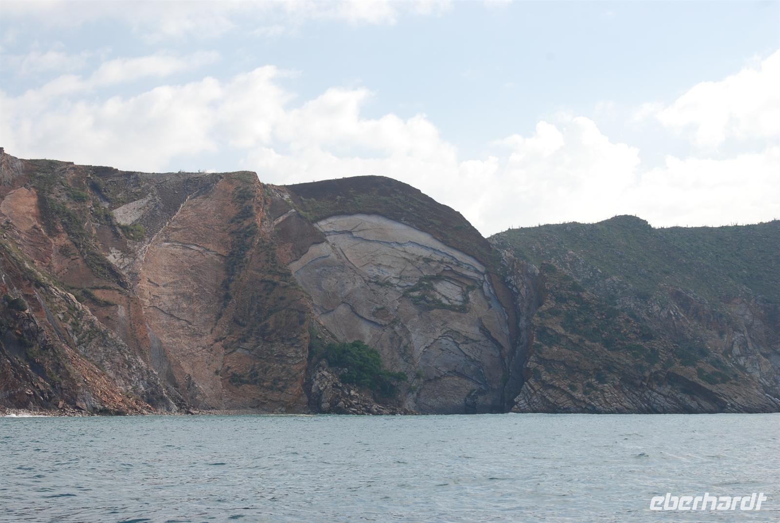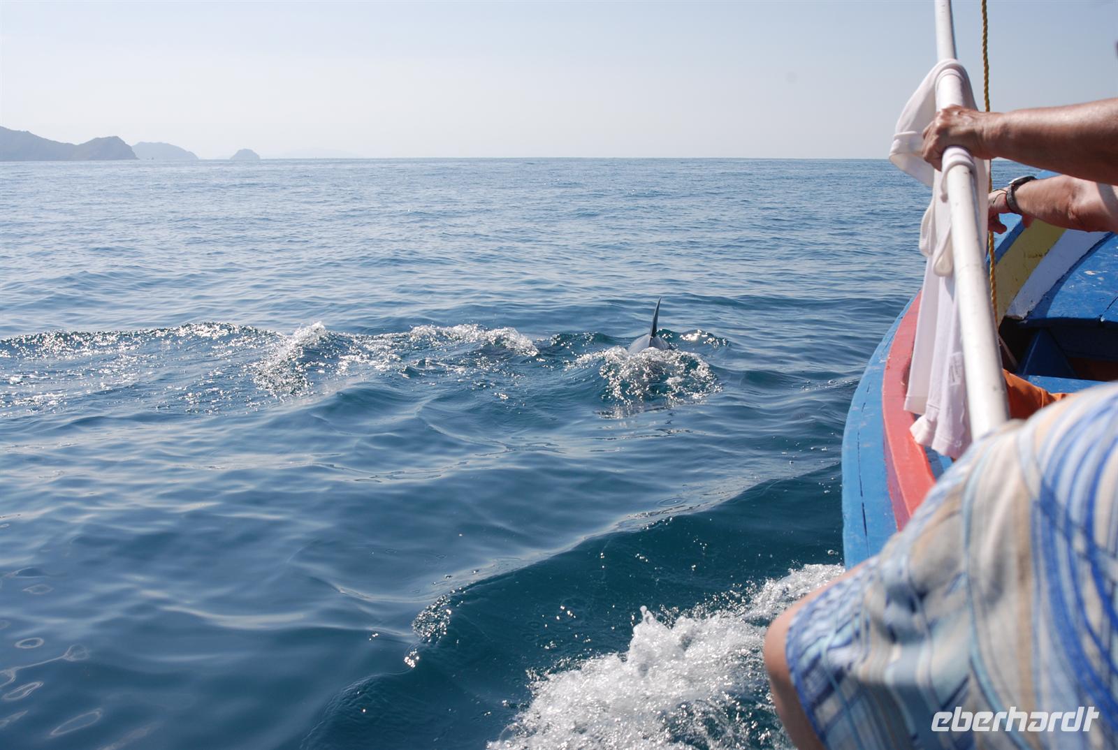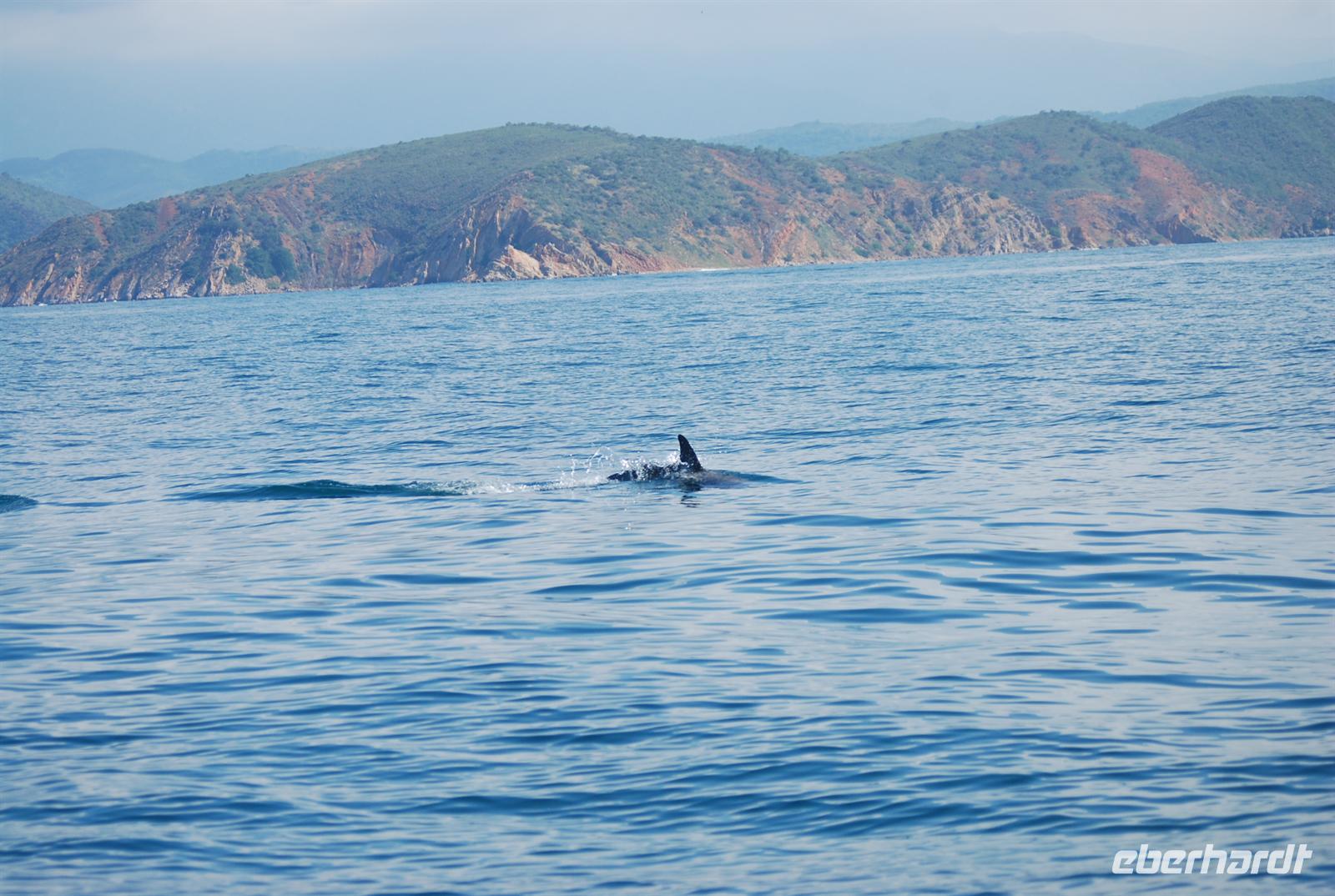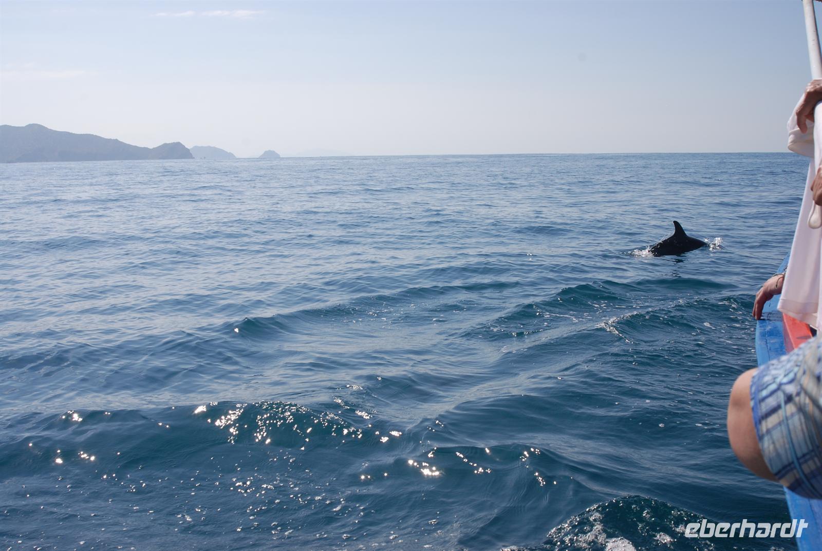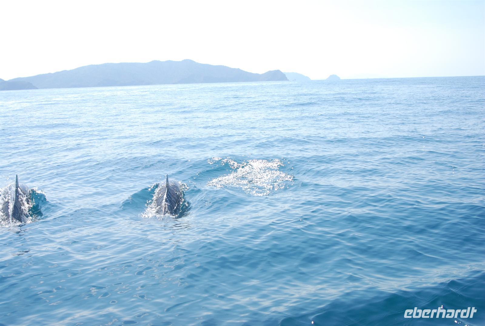 Anschließend ankern wir mit dem Boot in einer Bucht und Nelson überrascht uns mit einem hausgemachten Salat - Ensalada Ruso - und frischem Brot. Auch hier haben wir wieder Zeit zum Baden und Schnorcheln. Etwas weiter draußen treffen wir dann auf die Delfine, die lange unser Boot begleiten. Auf kleinen Steilfelsen beobachten wir Pelikane, Tölpel und Fregattvögel. Nach einem letzten schönen Schnorcheln mit Korallen treten wir die Rückfahrt nach Santa Fé und ins Hotel an. Zu Abend essen wir auf der hübschen Terrasse des Hotels Neptuno und fallen anschließend erschöpft in die Federn.