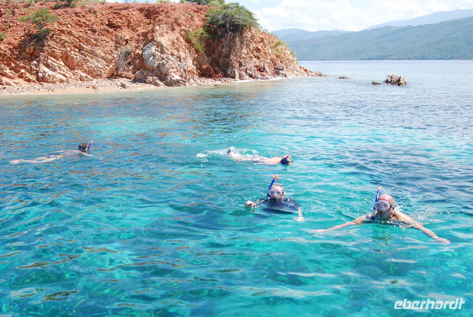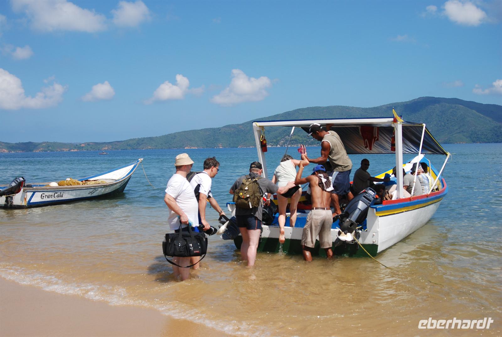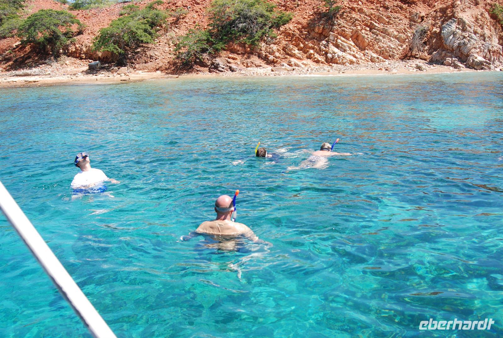 Nach dem Frühstück fahren wir wieder nach Santa Fé, um eine Bootsexkursion zu den Inseln des Mochima-Nationalparks zu unternehmen. Die Sonne begleitet uns und so leuchten uns die Korallen schon bei unserem ersten Schorchelversuch bunt entgegen.