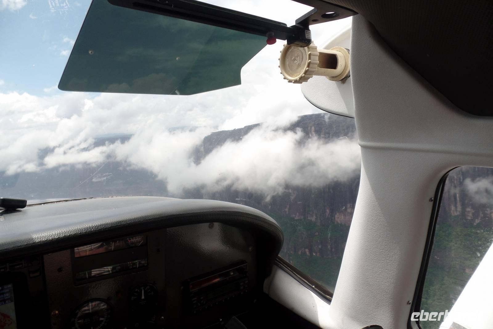 Am spät vormittags fliegten wir ab Puerto Ordaz noch weiter nach Süden (ca. 1 Stunde) in den weltberühmten Nationalpark Canaima. Wir fliegen nur mit Handgepäck in einer kleinen CESNA Maschine für nur 5 Personen nach Canaima. Da wir mit Nelson 15 sind, teilten wir uns in 3 „Skuadronen". Nach ca. 1 Stunden Flug in eine andere Welt und bevor wir in Canaima landeten, werden wir einer des bestens Überflugs unseres Lebens erfahren. Wir überfliegen mehr als einen halben Stunde Flugzeit den Canaima-Nationalpark und die beeindruckenden Tafelberge. Bald zeigt sich uns der Wasserfall „Salto Angel", mit fast keinen Wolken. Einmalig. Der Pilot hatte Zeit für uns und keine Eile und überflog 3 Mal über verschiedene Perspektive den grössten Wasserfall der Welt extra für uns! Die Natur auf den Tafelberge da oben war total anders. Es war wie eine andere Welt oder „The Lost World". Die weite Prärie der Gran Sabana mit den malerischen Tafelbergen und den wasserreichen Flussläufen steht dazu im schönen Kontrast. Ein Höhepunkt unserer Rundreise, der Flug über den Tafelberg "Auyantepuy" und den höchsten Wasserfall der Welt - Salto Angel ist in Erfüllung gegangen! Wir überfliegten die imposanten Tafelberge Tepuys im Tiefflug und sehen den 978 Meter hohen Wasserfall Salto Angel in seiner vollen Pracht aus nächster Nähe!!!