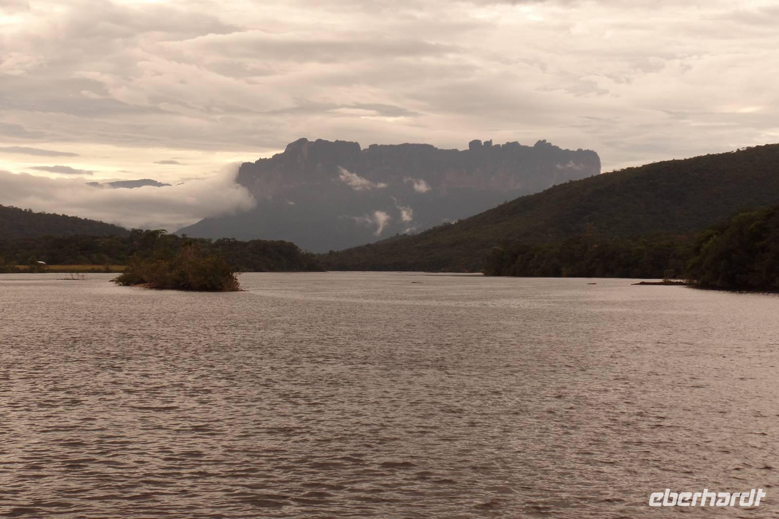 Die andere 6 mit Benjamin wurdern um 4 Uhr geweckt und starten 4:45 Uhr unseren Ganztages-Ausflug zum Angel Fall. Dazu reisten wir für 10 Minuten im LKW zum Carrao-Fluss oberhalb der Lagune und steigen hier ins motorisierte Kanu um. Mit den ersten Sonnenstrahlen können wir den Blick auf die tolle Natur um uns herum schweifen lassen. An einer Stelle wandern wir 20 Minuten, da diese zu gefährlich ist, um sie mit dem Boot zu passieren. Die herrliche Tafelberge sind früh am Morgen noch leicht von Wolken verhüllt, aber trotzdem faszinierend anzusehen. Nach einem kleinen Frühstück an Land geht es noch einmal ca. zwei Stunden flussaufwärts. Gegen 9 Uhr haben wir dann unseren Startpunkt für die 1,5stündige Wanderung zum Wasserfall erreicht. Für die Wanderung zum Salto Angel sollte man ein Mindestmaß an körperlicher Fitness haben, da die Temperaturen recht hoch und alle Pfade unbefestigt sind! Durch den Regenwald laufen wir bei 90 Prozent Luftfeuchtigkeit über große Wurzeln und Steine. Bald zahlt sich jedoch unsere Mühe aus und wir werden mit einem atemberaubenden Blick auf den fast 1000 Meter hohen Wasserfall belohnt! Hier genießen wir erst einmal in aller Ruhe.